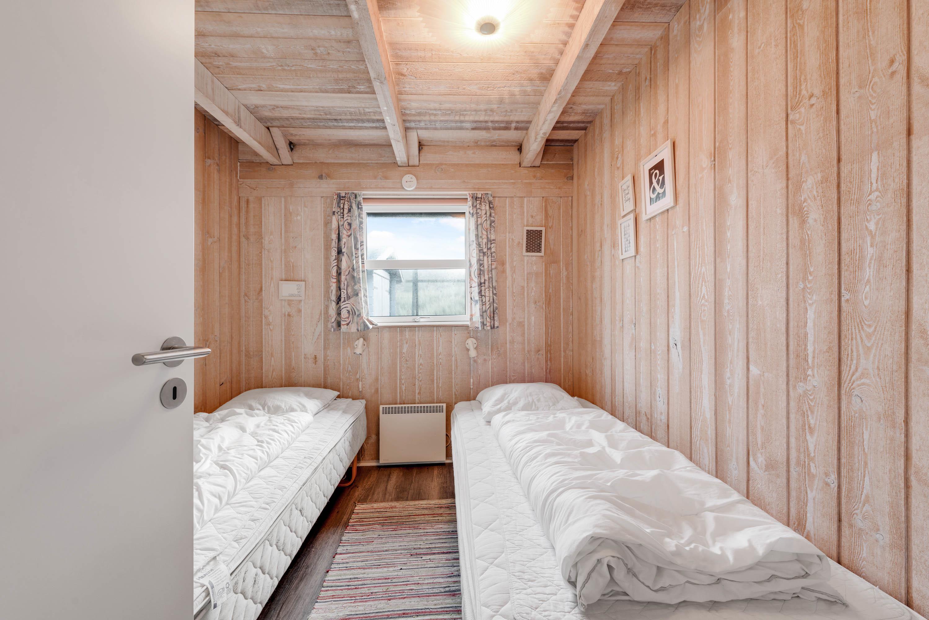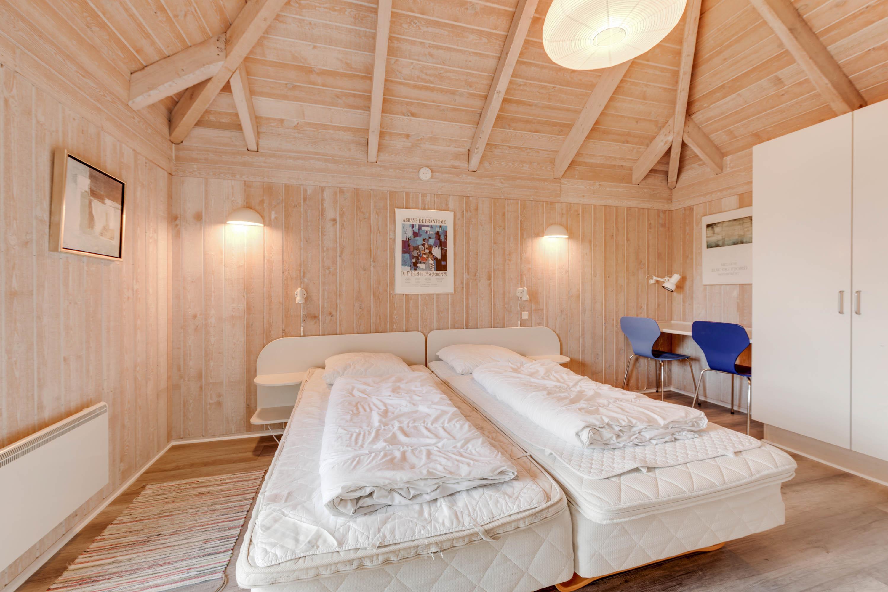 Sommerhuset er velindrettet med 4 fine soverum fordelt i 2 soveafdelinger, som hver har sit badeværelse, hvilket gør huset særdeles velegnet til 2 familier, der gerne vil holde ferie sammen. Derudover er der to store hemse, hver med soveplads til to personer og med plads til leg.