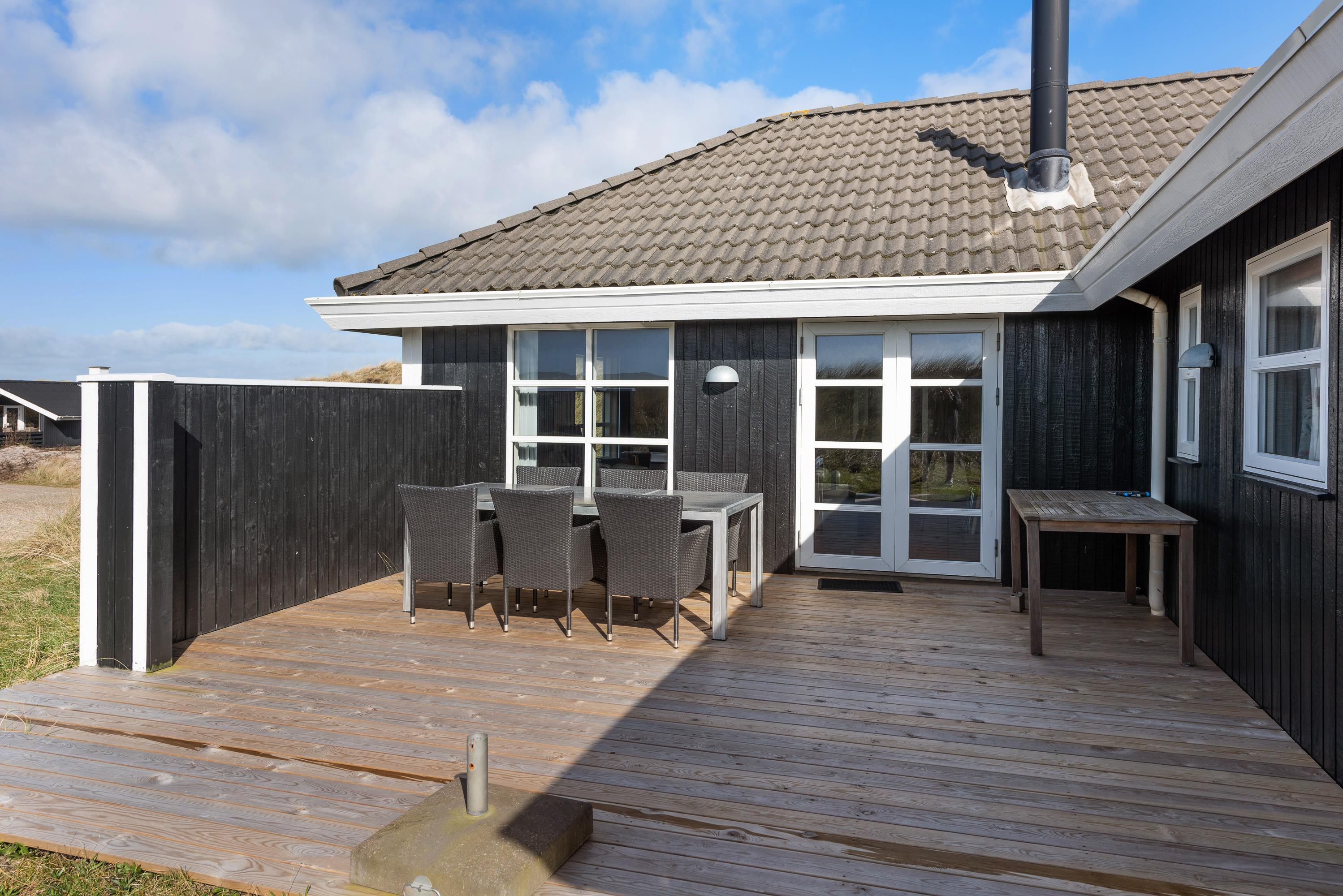 Rundt om sommerhuset er der flere skønne terrasser med læhjørner. Nyd morgensolen over fjorden, og følg med solen dagen lang, så I om aftenen kan runde dagen af med en god grillmiddag på den sydvestvendte terrasse.