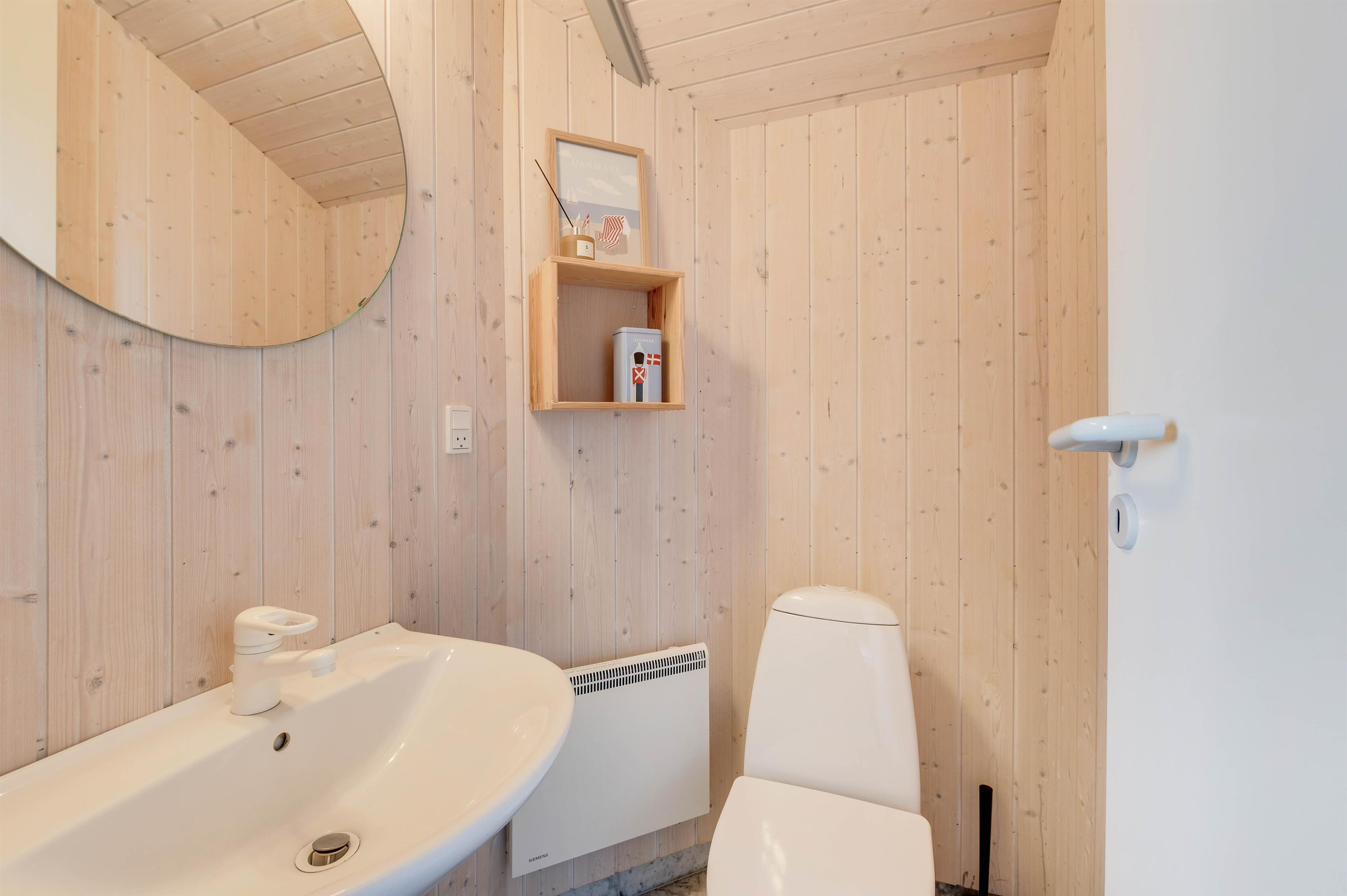 Sommerhusets badeværelse er med spabad og sauna, og derudover er der også et gæstetoilet. I sommerhuset er der desuden gratis, trådløst internet, så du kan gå på nettet, når det passer dig.