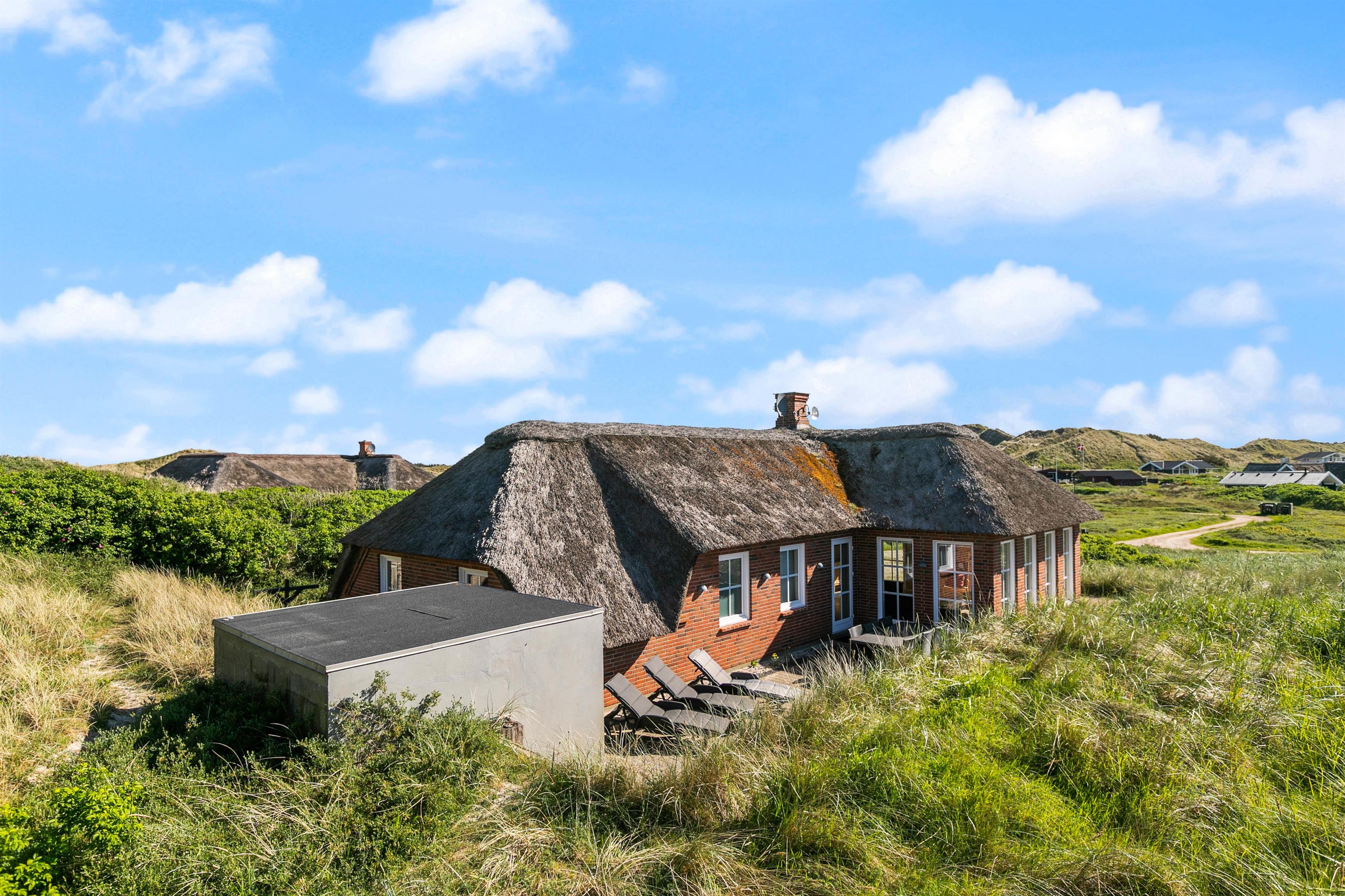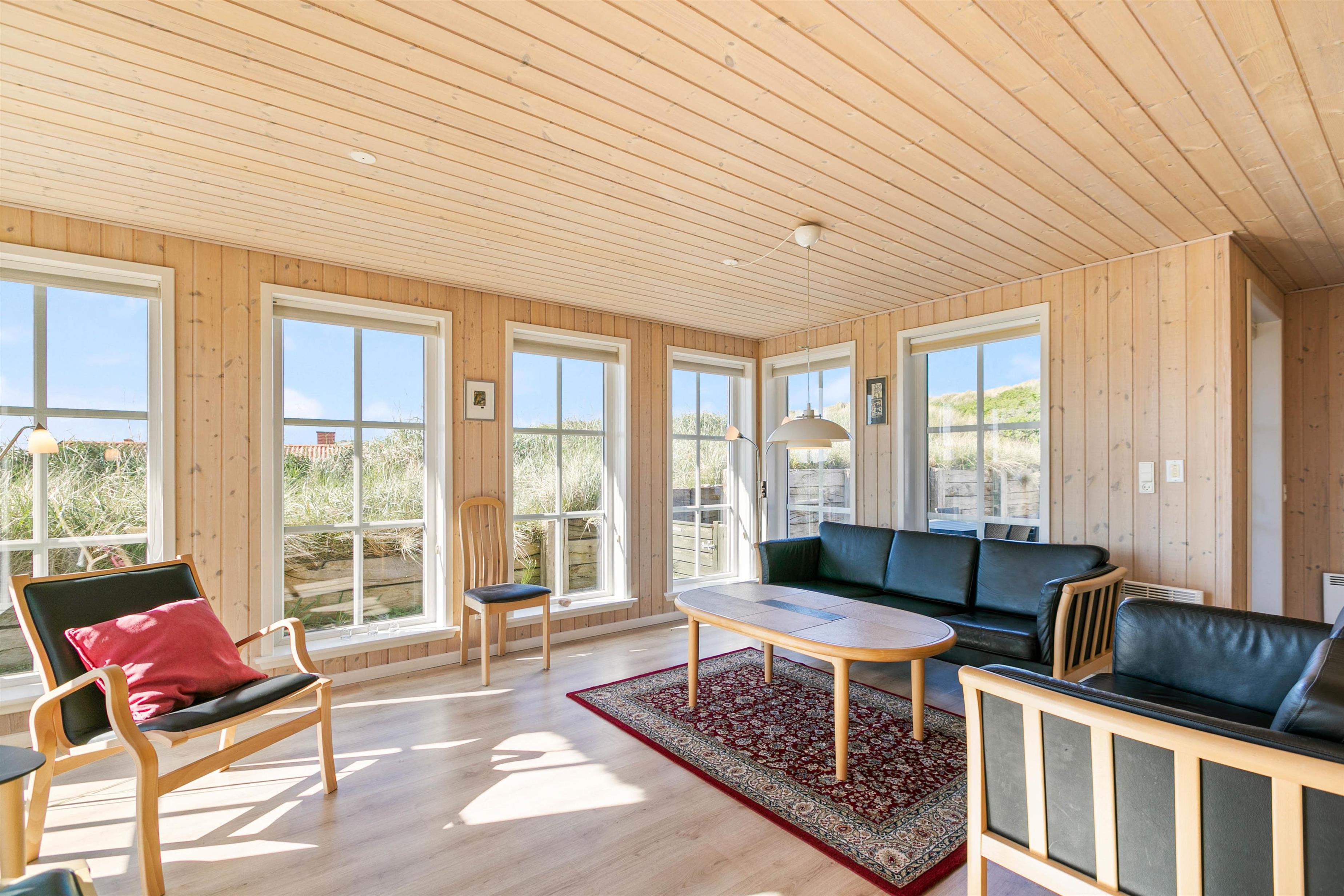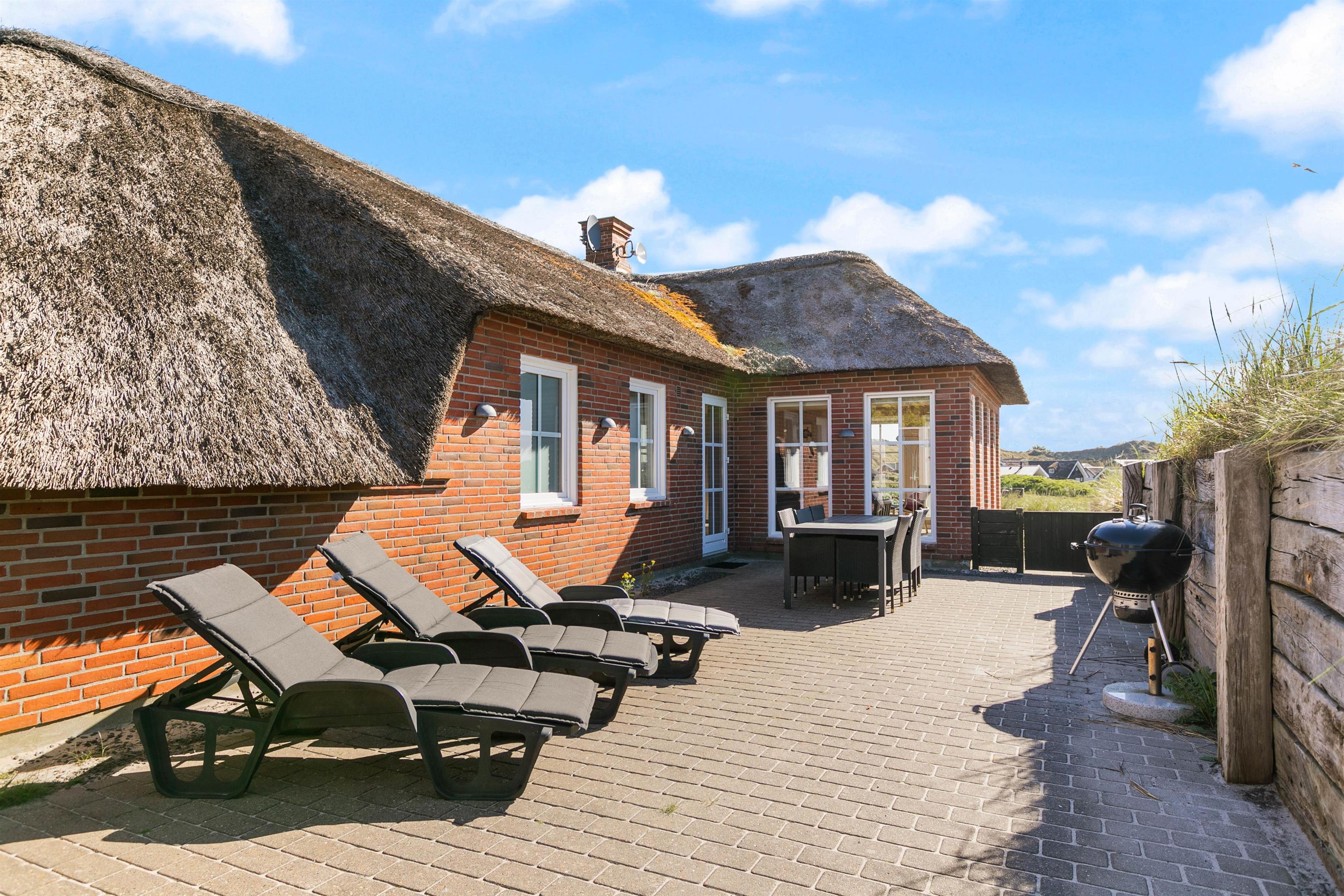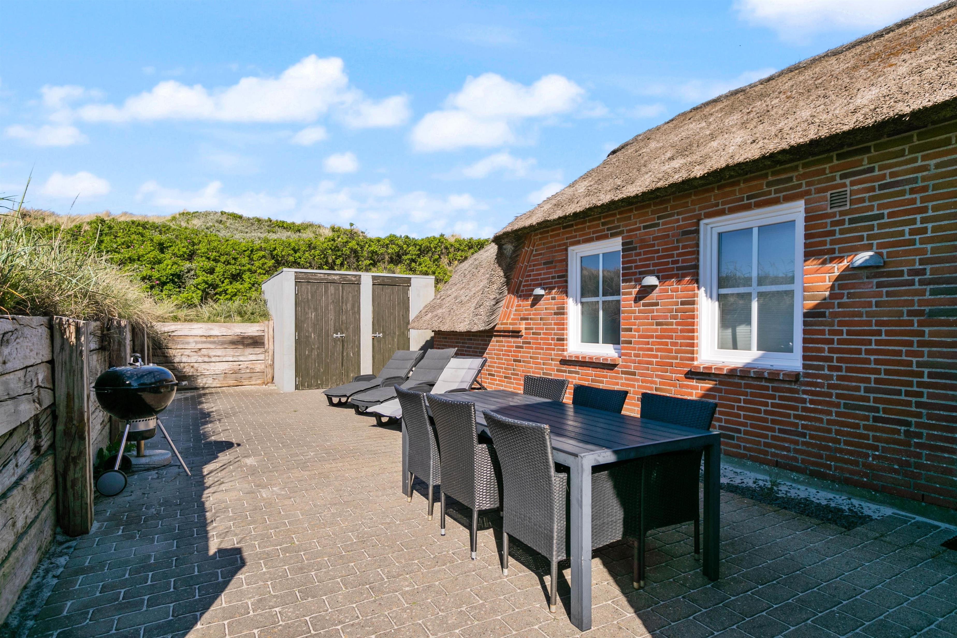 Dette flotte sommerhus kan imødegå de fleste krav, man måtte have på ferien. Sommerhuset ligger ganske enkelt pragtfuldt, bygget helt ind i den yderste klit. Det har en stor skøn terrasse, og du kan som regel finde en læfyldt plet, hvor du kan nyde den friske luft i ro og mag. Terrassen er helt lukket, hvilket gør den perfekt, hvis du har småbørn eller din hund med på ferie. Nyd en god eftermiddag på liggestolen eller en dejlig aften med bøf på grillen og vin i glasset.