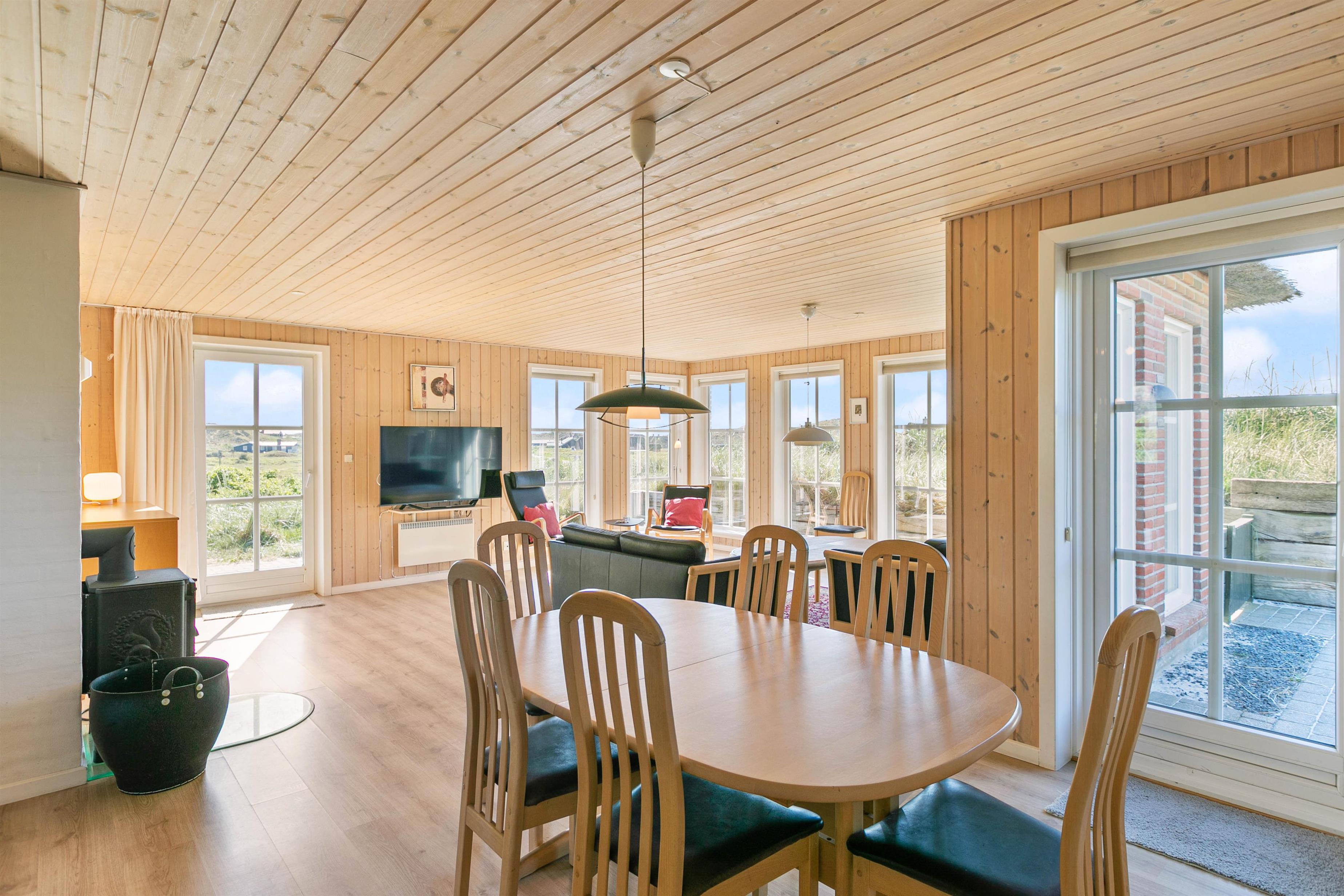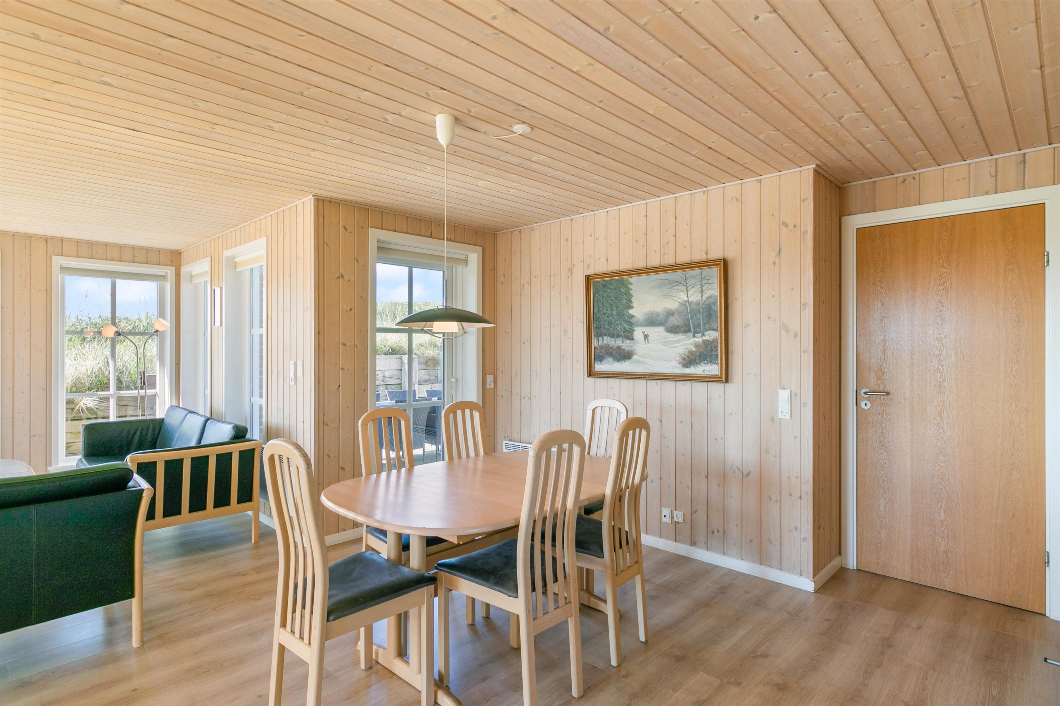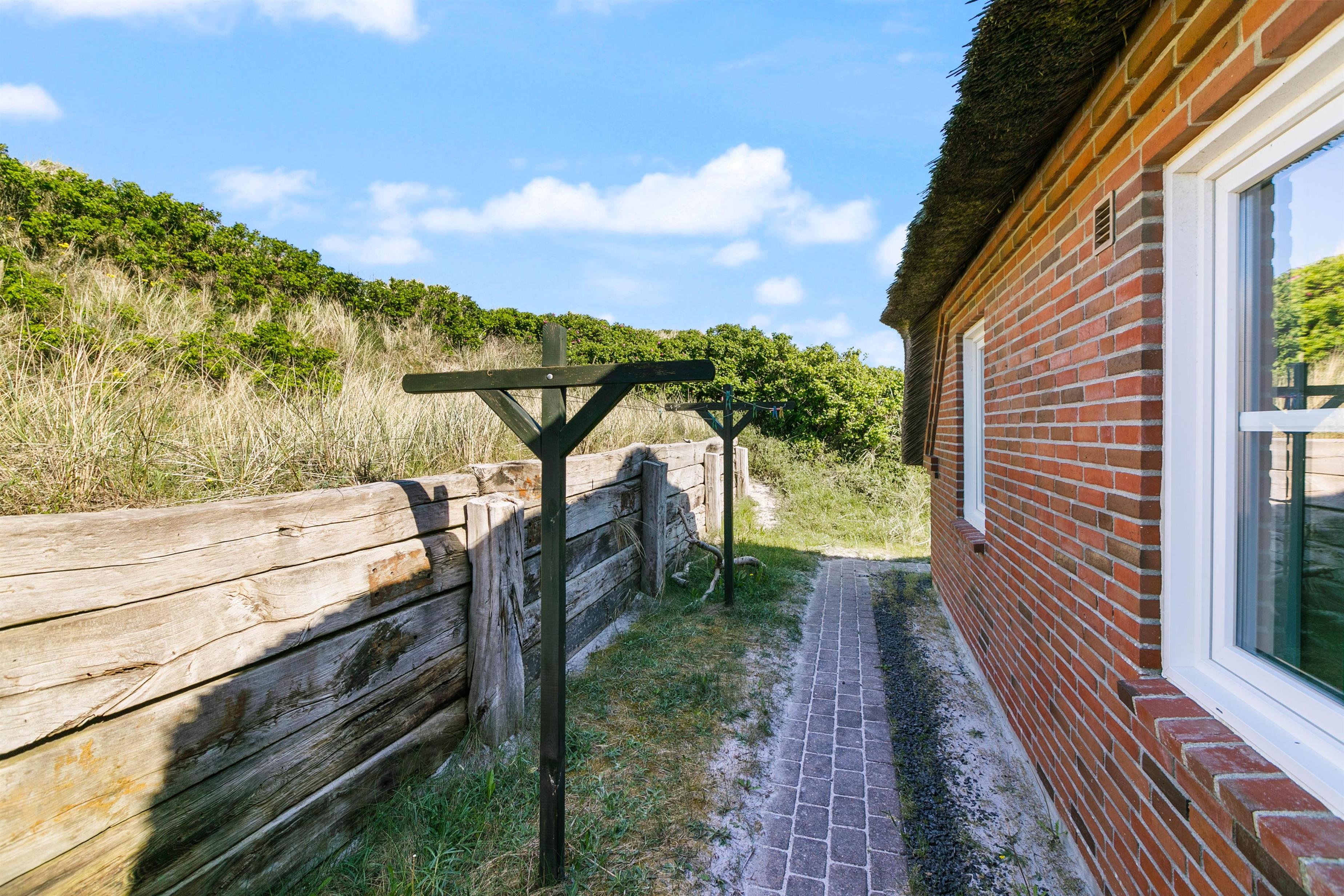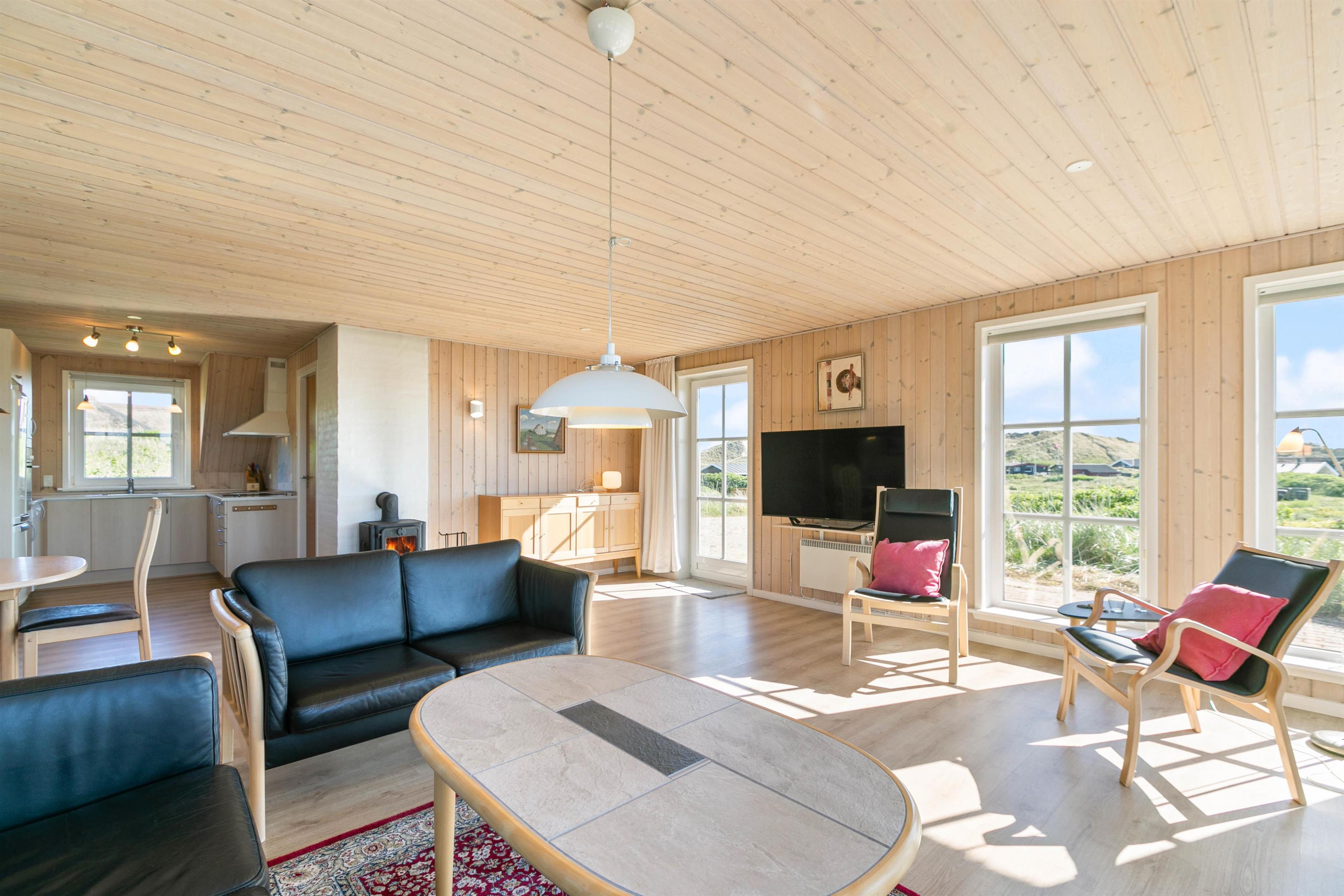 Dette flotte sommerhus kan imødegå de fleste krav, man måtte have på ferien. Sommerhuset ligger ganske enkelt pragtfuldt, bygget helt ind i den yderste klit. Det har en stor skøn terrasse, og du kan som regel finde en læfyldt plet, hvor du kan nyde den friske luft i ro og mag. Terrassen er helt lukket, hvilket gør den perfekt, hvis du har småbørn eller din hund med på ferie. Nyd en god eftermiddag på liggestolen eller en dejlig aften med bøf på grillen og vin i glasset.