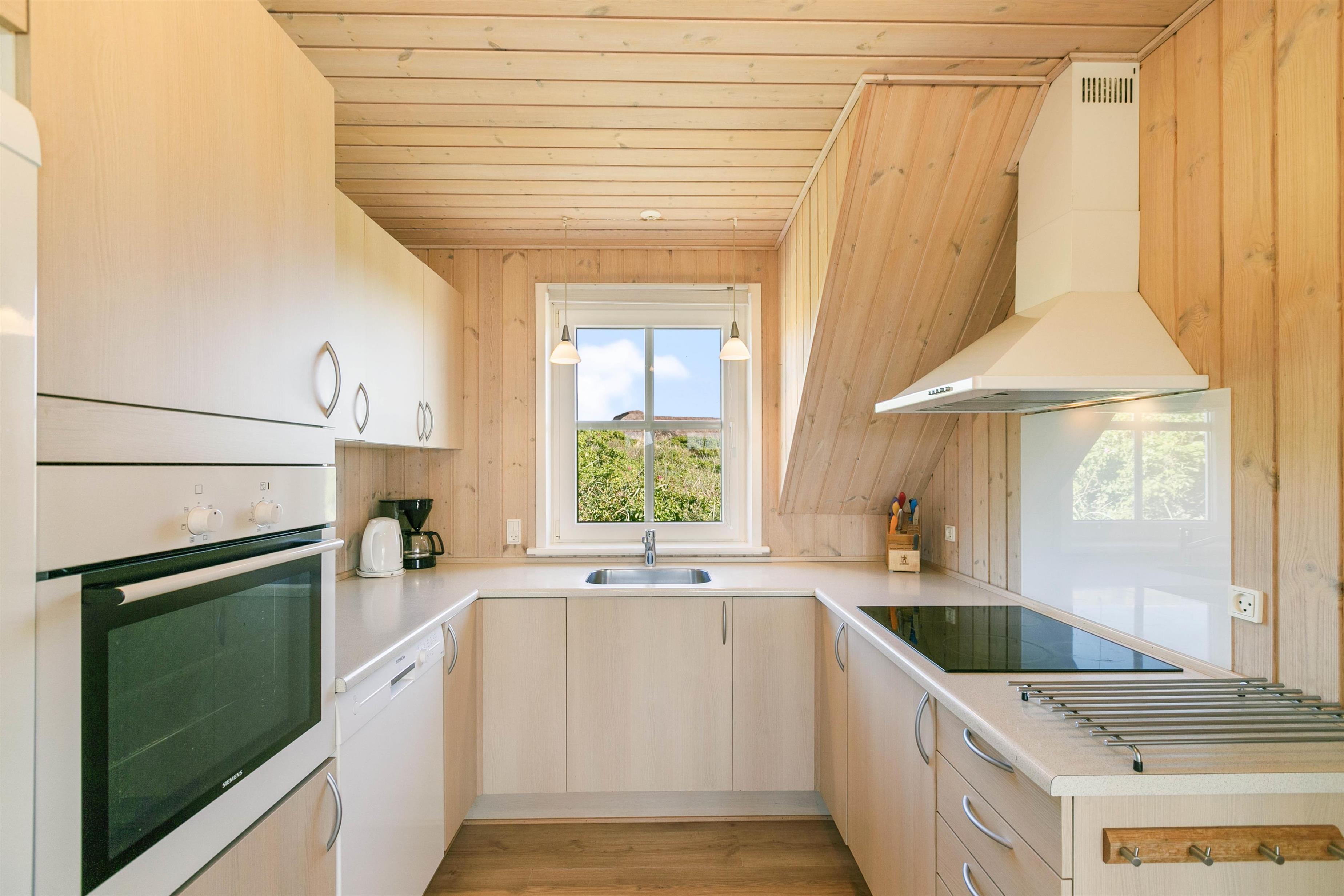 Køkkenet er nydeligt indrettet og meget veludstyret. Her er også opvaskemaskine og mikroovn. Stuen, som står i åben forbindelse med køkkenet, har trægulv og er pænt indrettet med spiseplads til 6 personer, hyggeligt sofahjørne, fladskærm og brændeovn. Her er masser af lysindfald og god udsigt gennem de mange store vinduer.