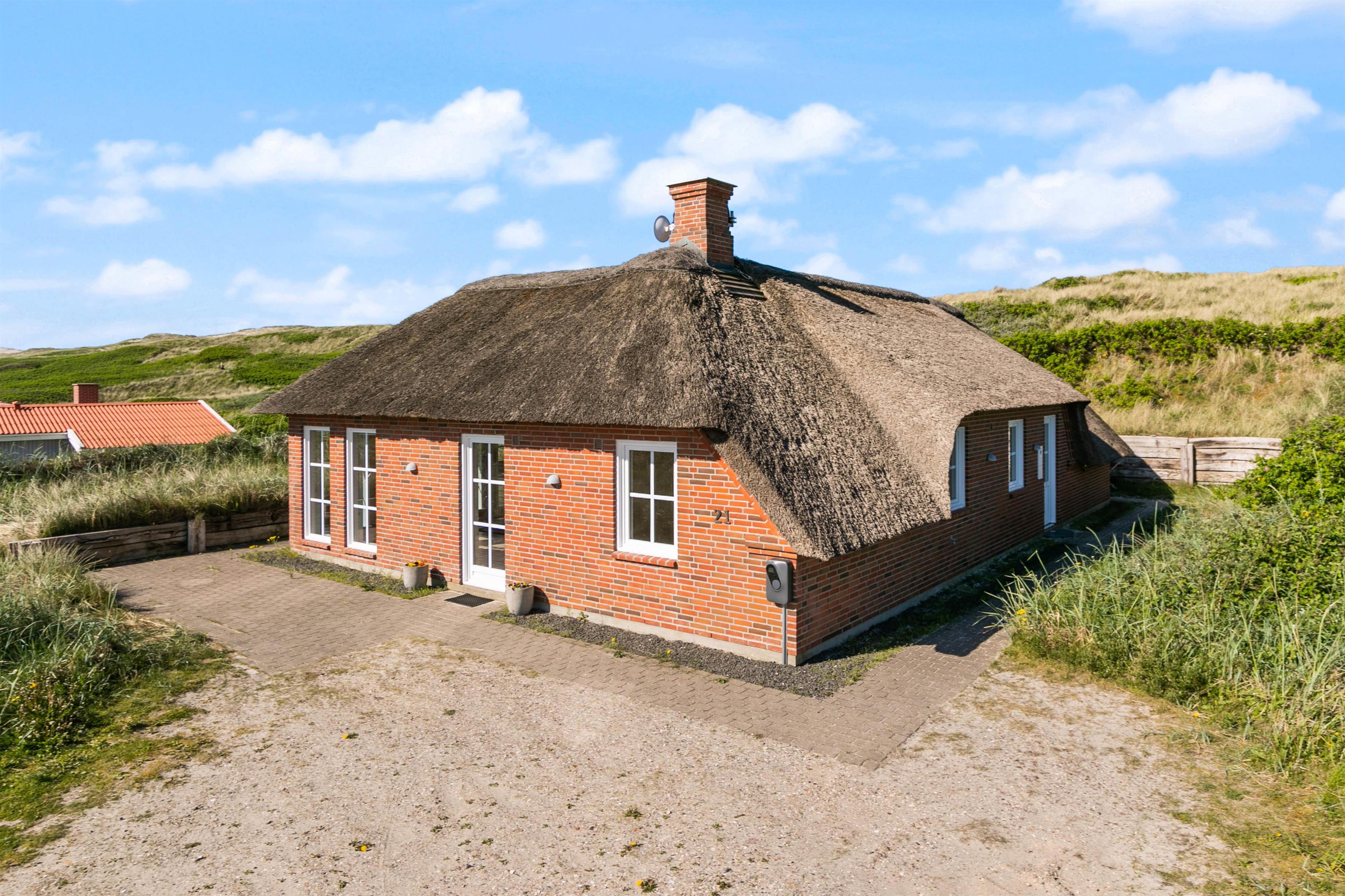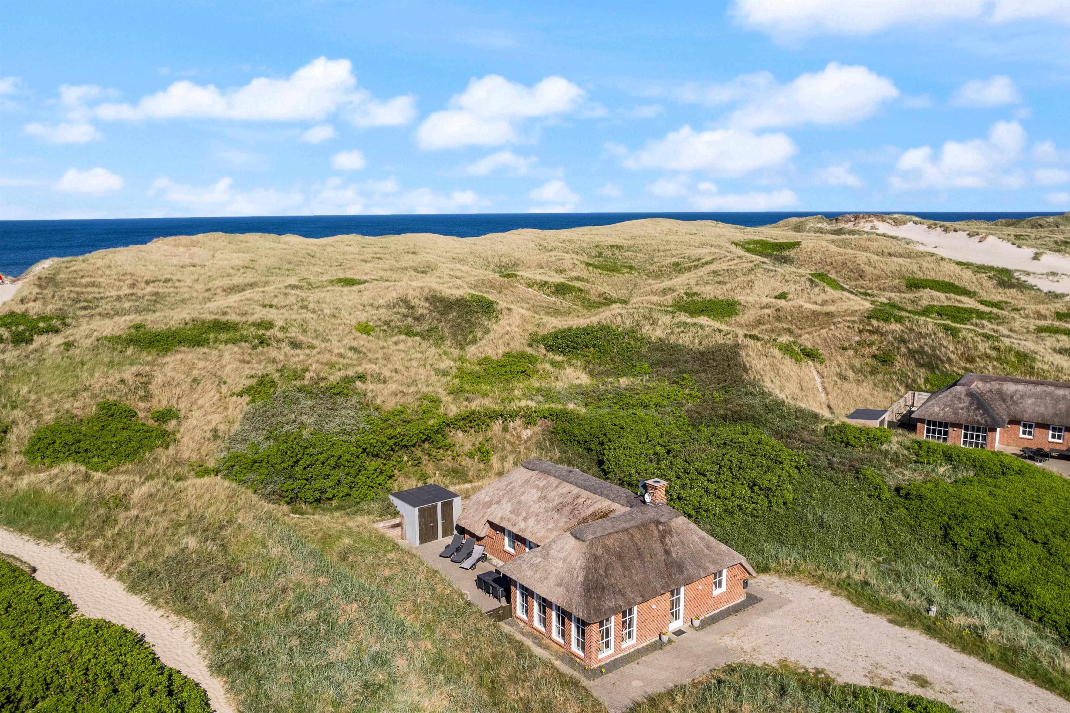 Med ferieadresse på Havbjergevej 21 får I et dejligt muret sommerhus med stråtag opført i førsteklasses materialer og naturligvis fuldt isoleret for vinterbrug. Feriehuset har en enestående beliggenhed i allerførste række mod havet. Det ligger total ugeneret og med en afskærmet terrasse bygget ind i klitten.