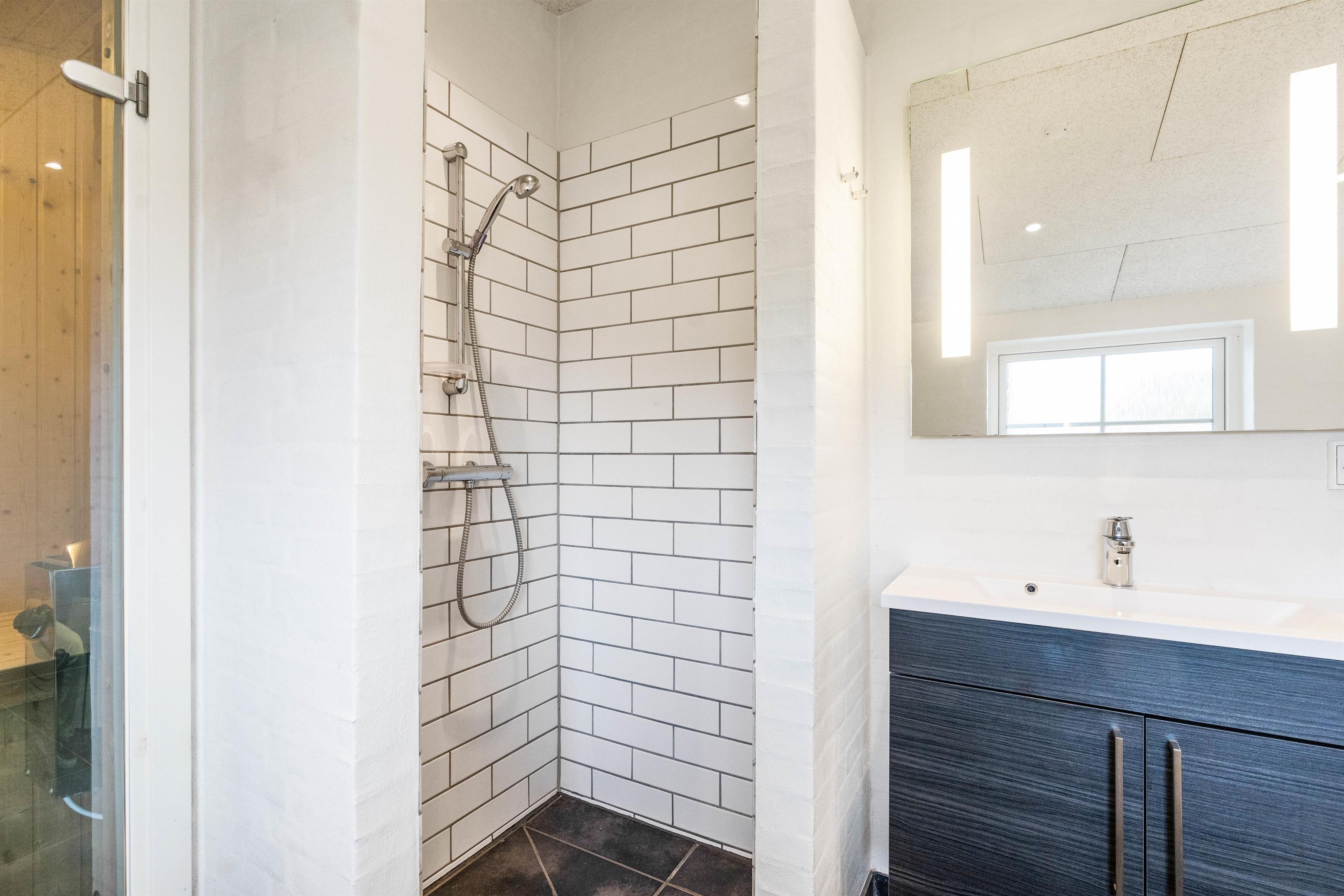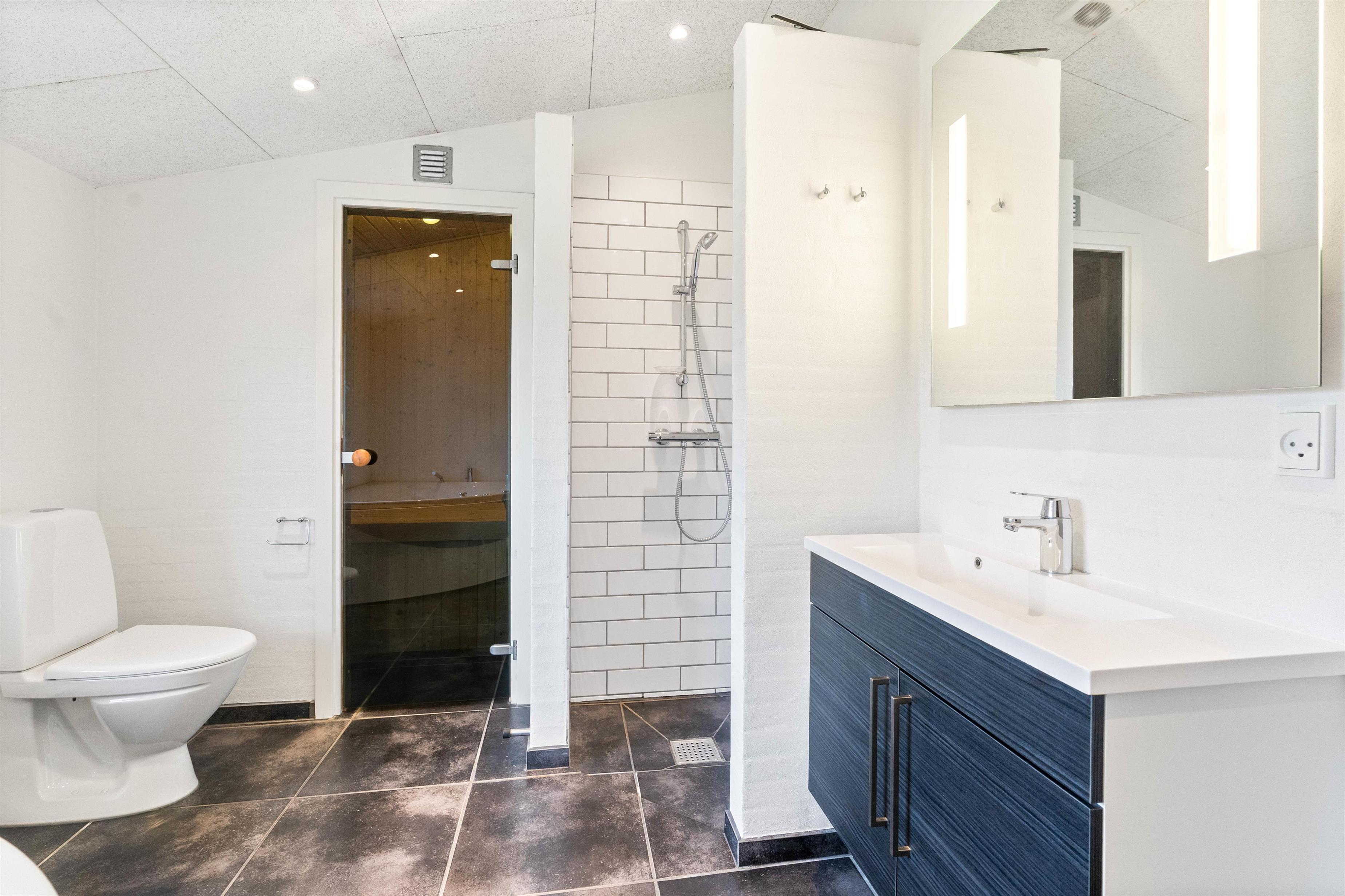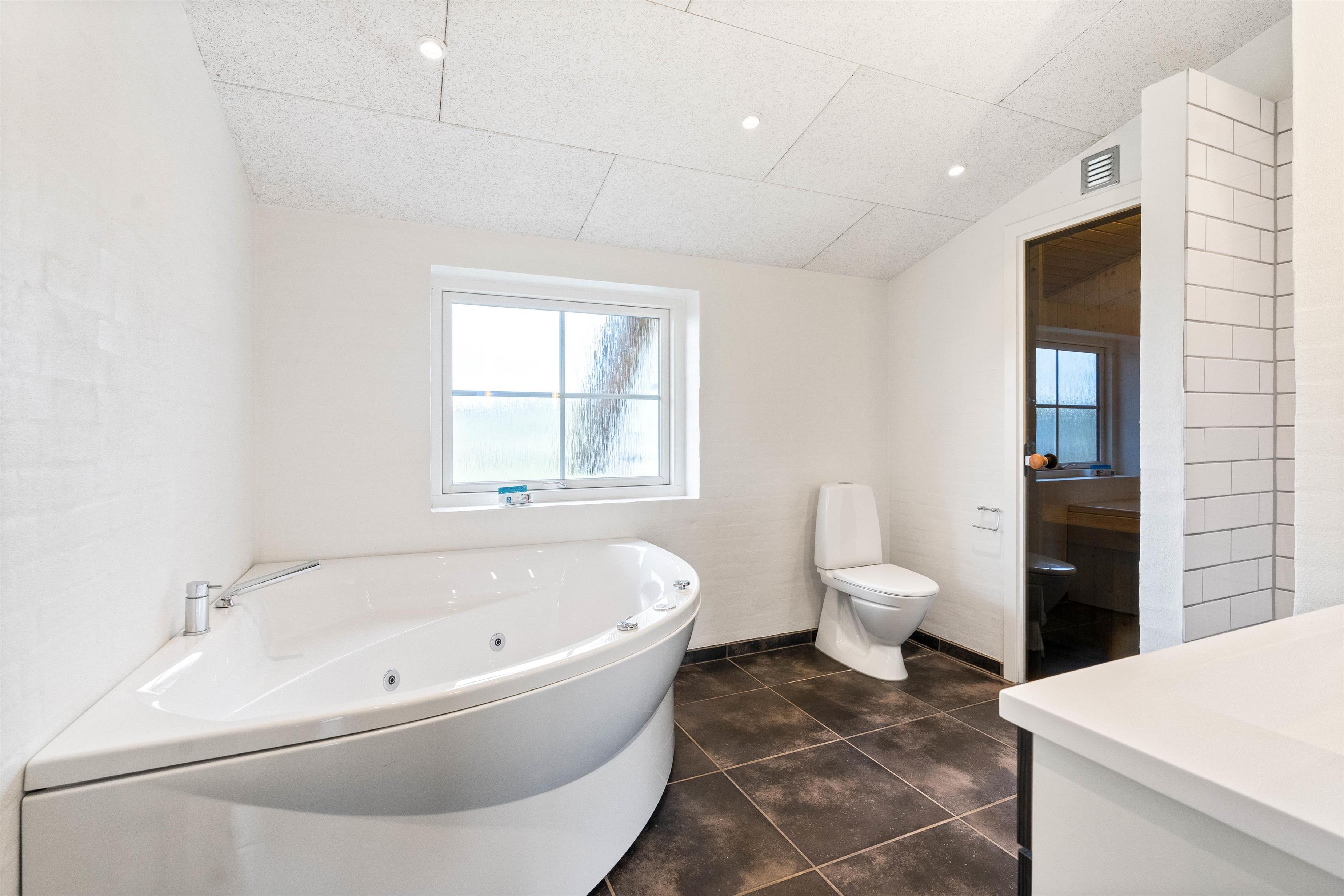 Når I bliver trætte, kan I fordele jer på de to soveværelser. Begge er rummelige, indrettet med dobbeltsenge og med god mulighed for opbevaring. Giv jer selv lov til at sove længe og nyde ferien! Skal I forkæles lidt ekstra på ferien, finder I heldigvis både sauna og spa på det store af feriehusets to badeværelser.