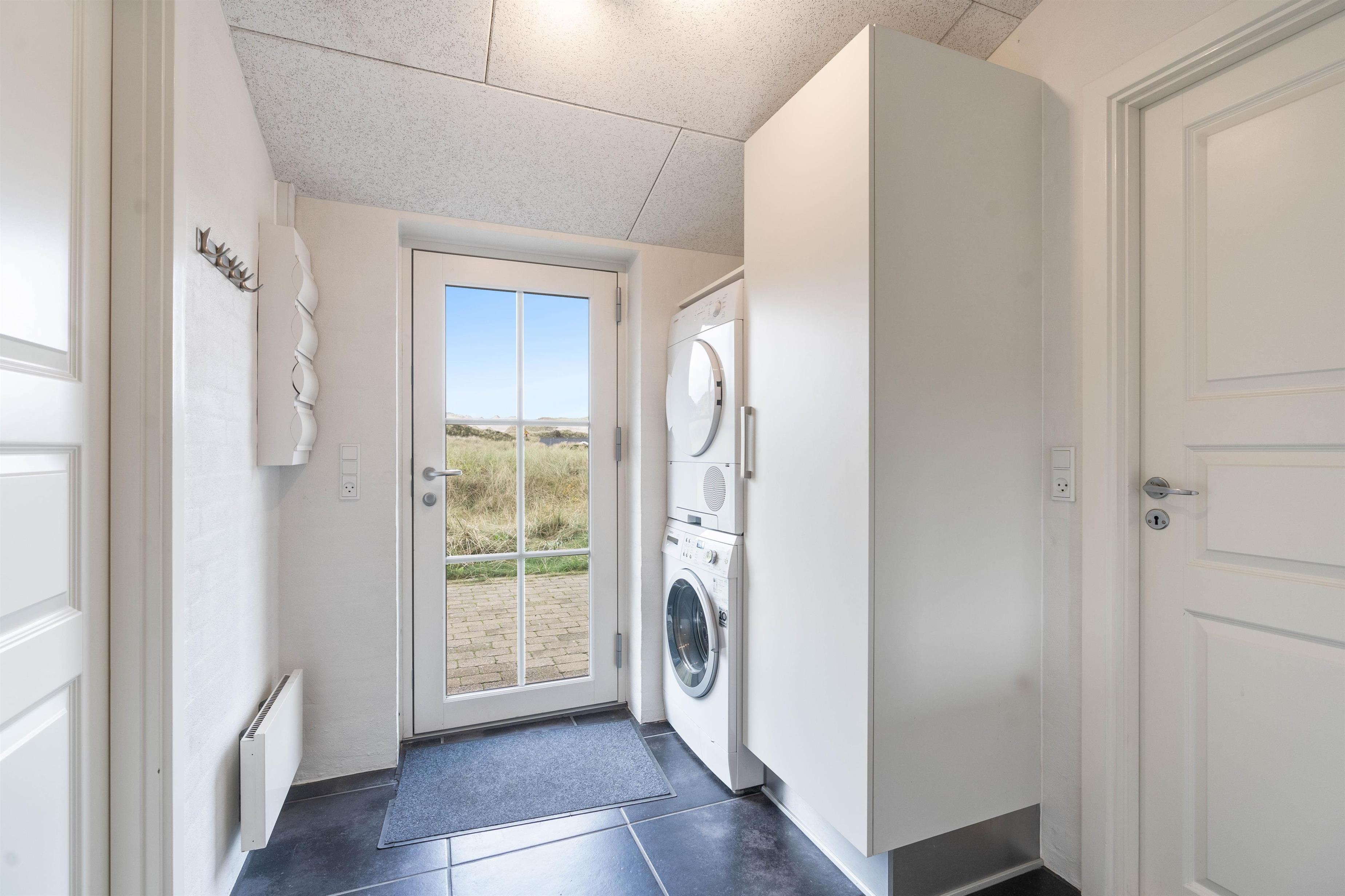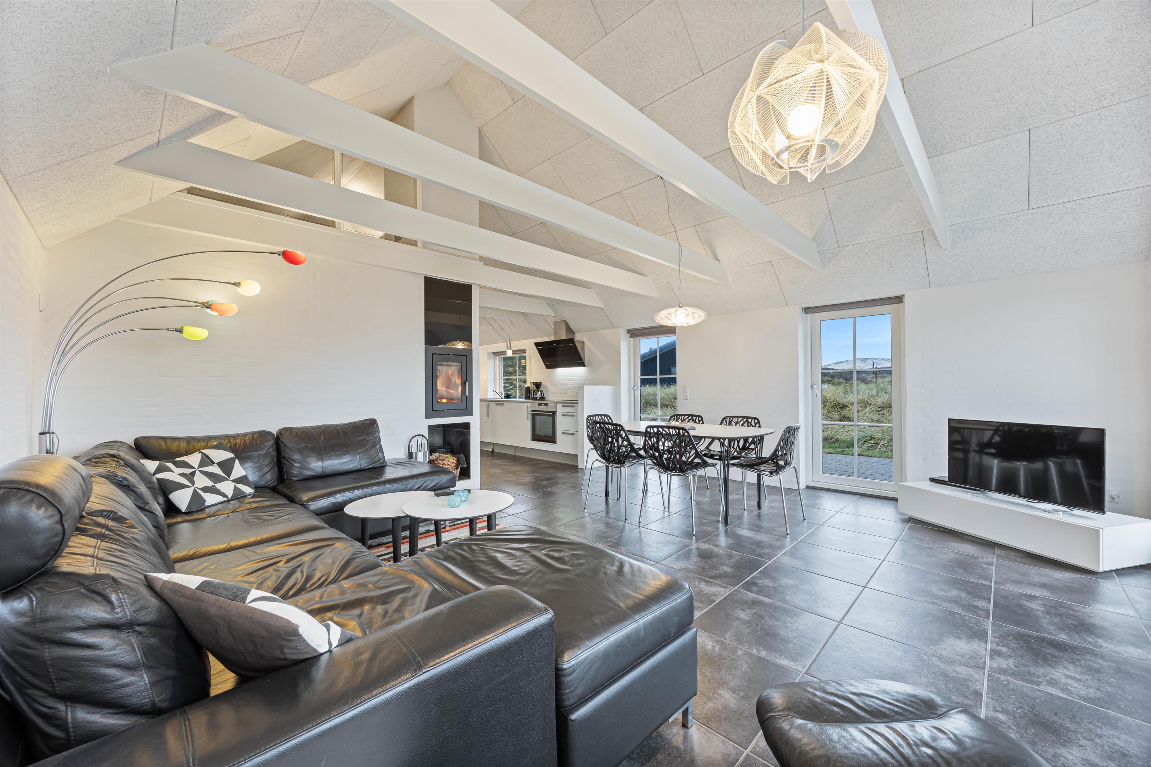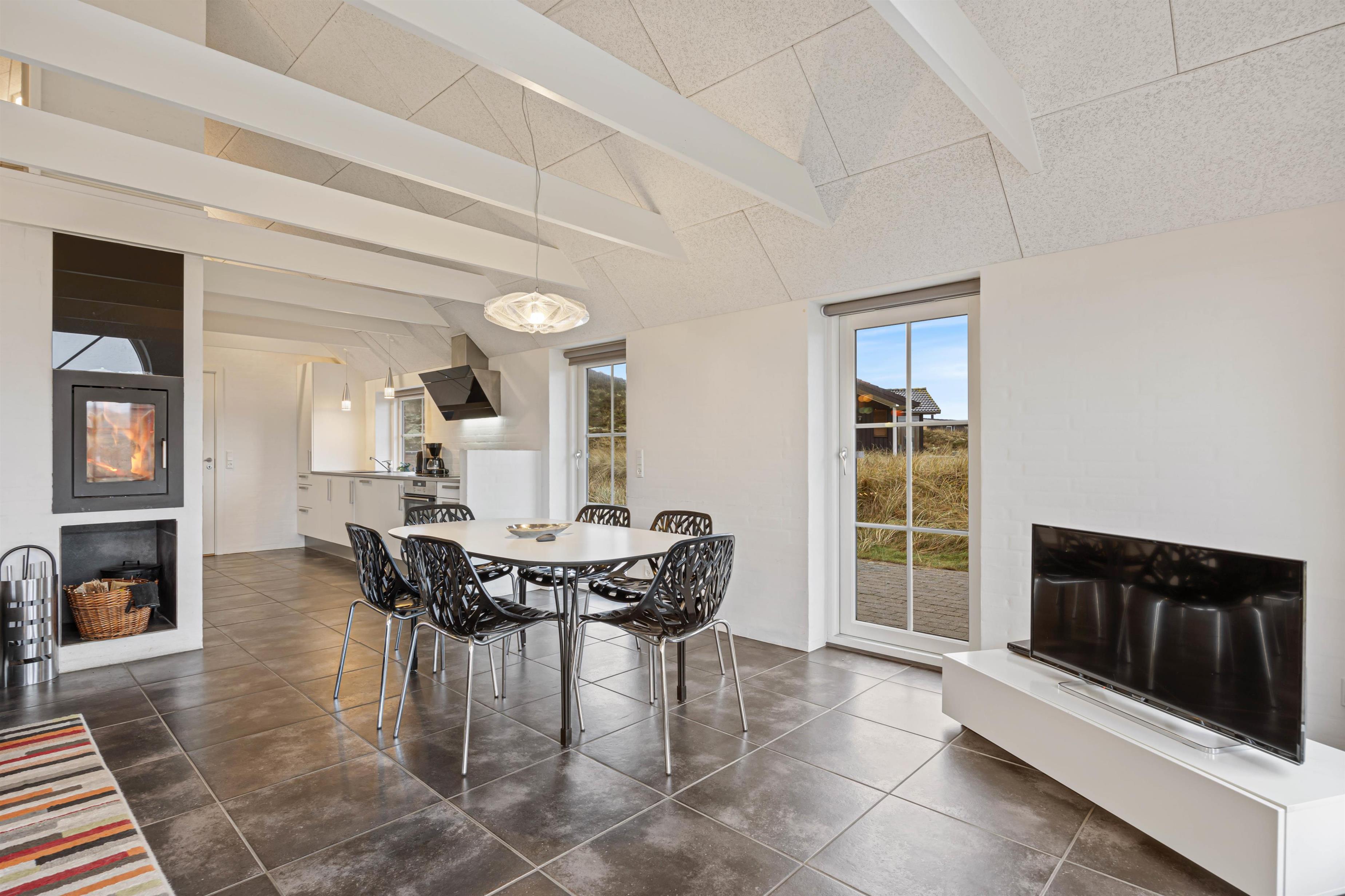 Når I kommer indenfor, vil I først komme ind i et fint bryggers, hvor der er plads til overtøj samt en vaskesøjle med vaskemaskine og tørretumbler – superpraktisk for børnefamilien og giver mulighed for at friske håndklæderne op undervejs. fra bryggerset fører en dør jer videre til feriehusets hjerte; det store opholdsrum. Her kombineres stue og køkken i ét rum, hvor der er plads til nærvær, hyggelige stunder og afslapning. Saml familien omkring spisebordet til en lækker middag eller spilleaften, mens brændeovnens varme breder sig.