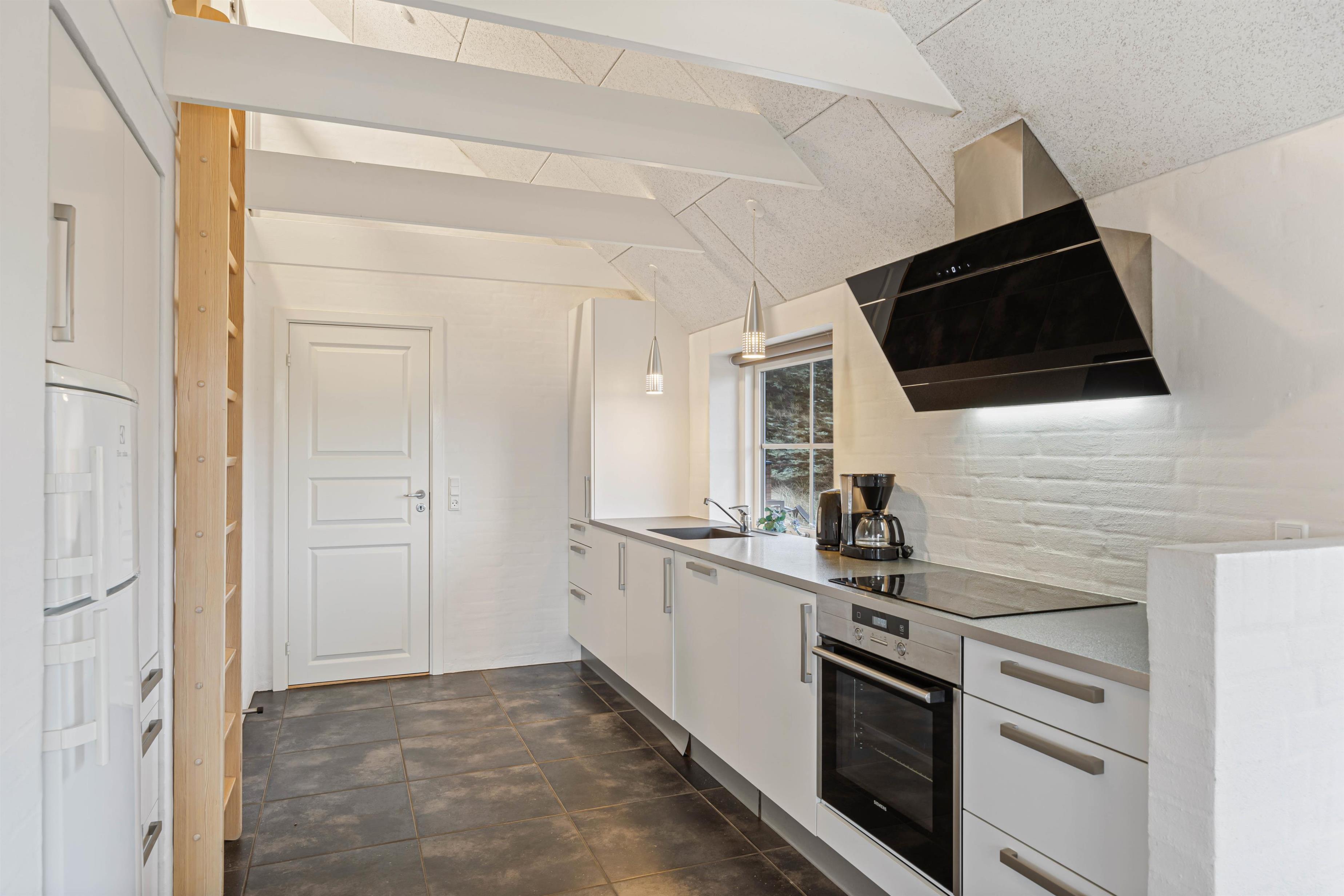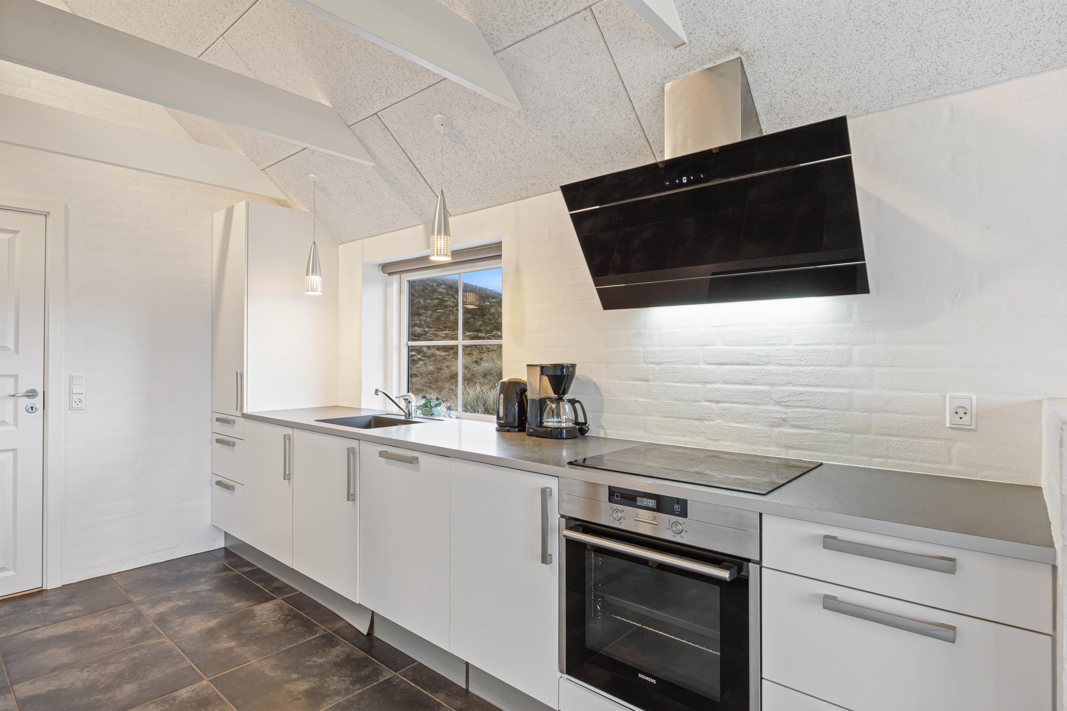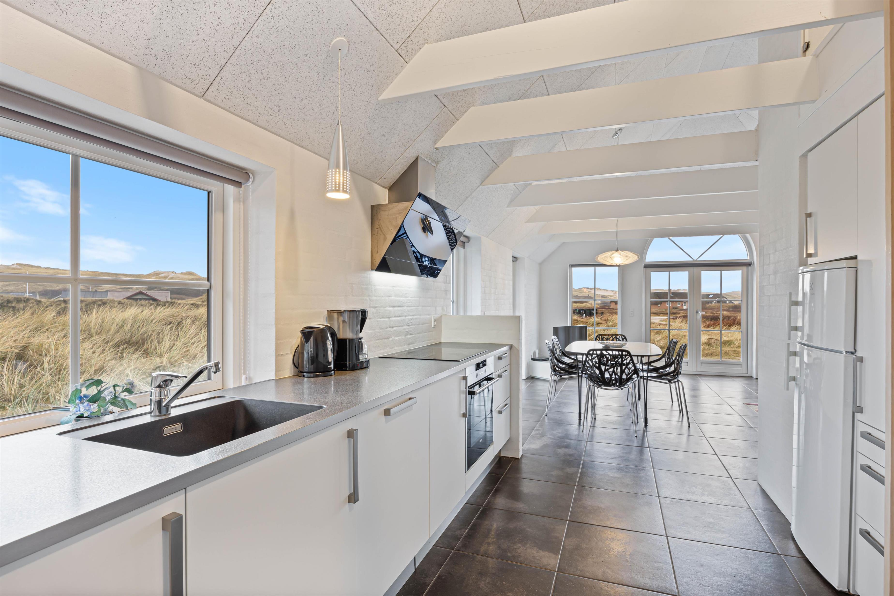 Når I kommer indenfor, vil I først komme ind i et fint bryggers, hvor der er plads til overtøj samt en vaskesøjle med vaskemaskine og tørretumbler – superpraktisk for børnefamilien og giver mulighed for at friske håndklæderne op undervejs. fra bryggerset fører en dør jer videre til feriehusets hjerte; det store opholdsrum. Her kombineres stue og køkken i ét rum, hvor der er plads til nærvær, hyggelige stunder og afslapning. Saml familien omkring spisebordet til en lækker middag eller spilleaften, mens brændeovnens varme breder sig.