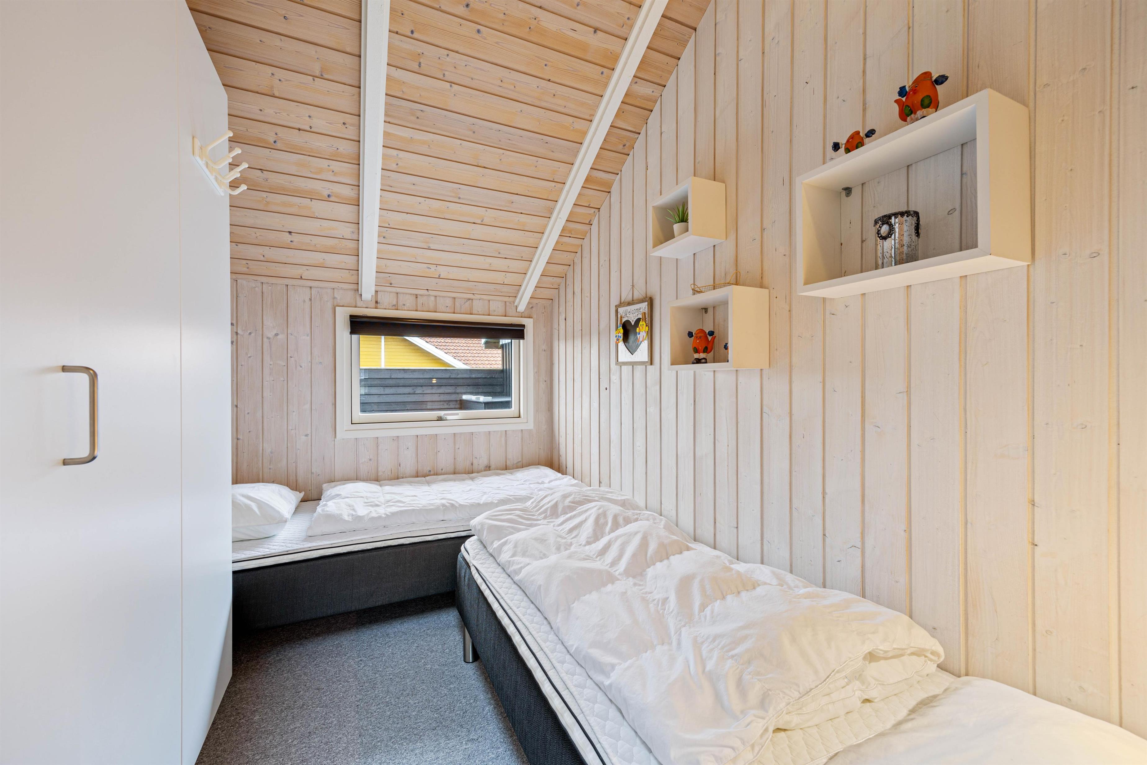 Det åbne og stilfulde køkken giver plads til, at store og små feriegæster kan lave mad sammen med udsigt til opholdsrummet. På de hyggelige værelser sørger de skrå vægge for den klassiske sommerhusstemning med et moderne strejf.