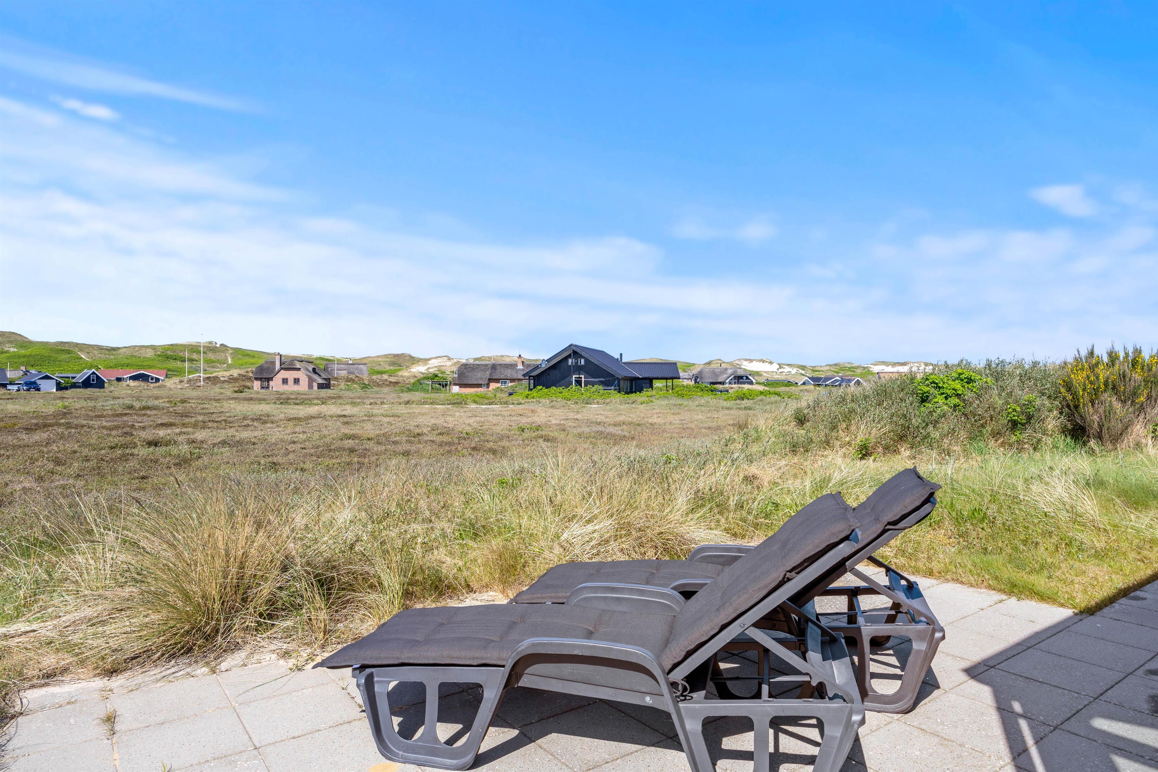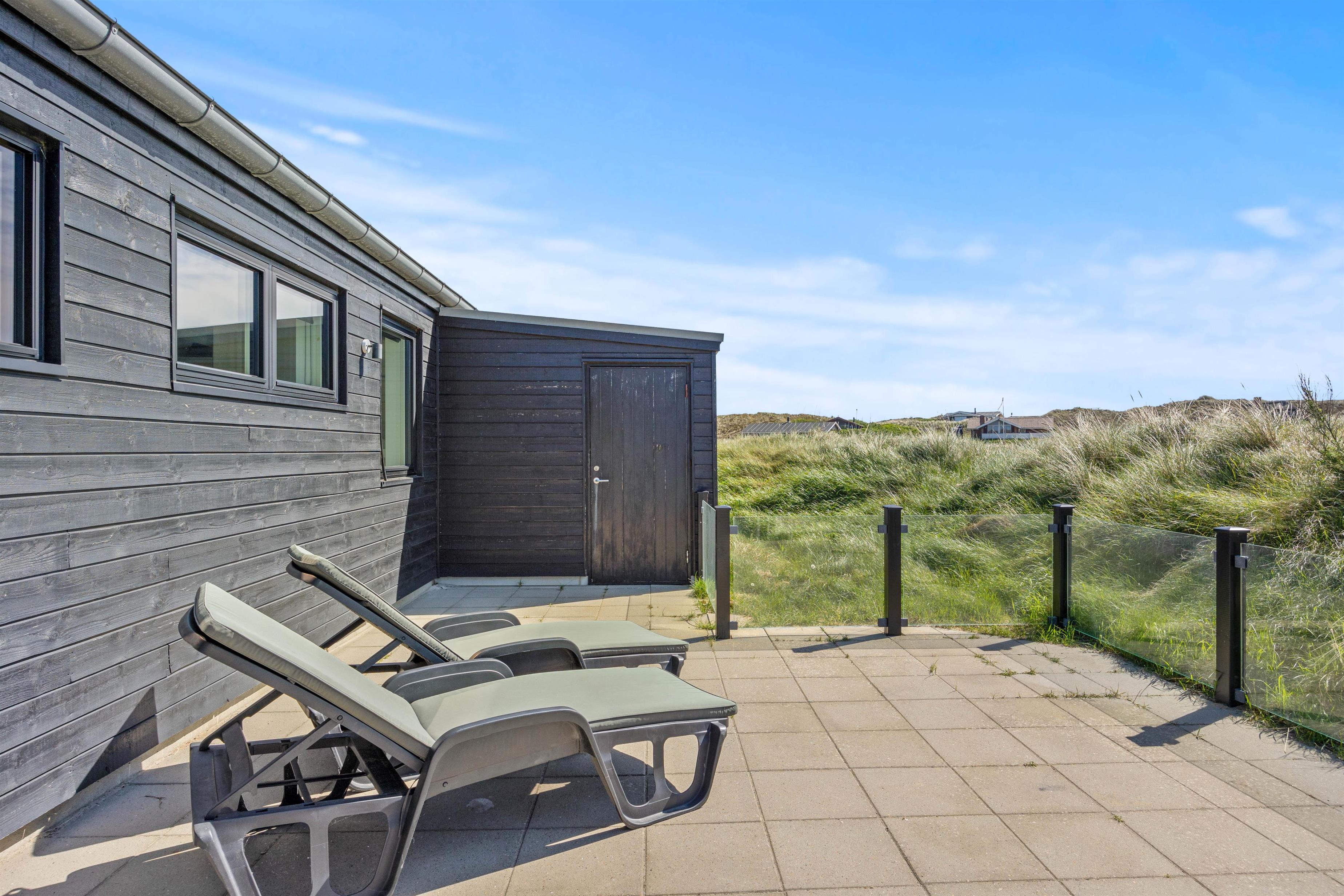 Udenfor finder I den skønne terrasse, som både er lukket, delvist overdækket og godt afskærmet med store glaspartier. Under halvtaget kan I søge ly og læ for vinden og regnen, og på de varme solskinsdage kan I rykke ud på det åbne stykke, hvor liggestolene står klar, så I kan slappe af og måske tage en lille middagslur i solen.