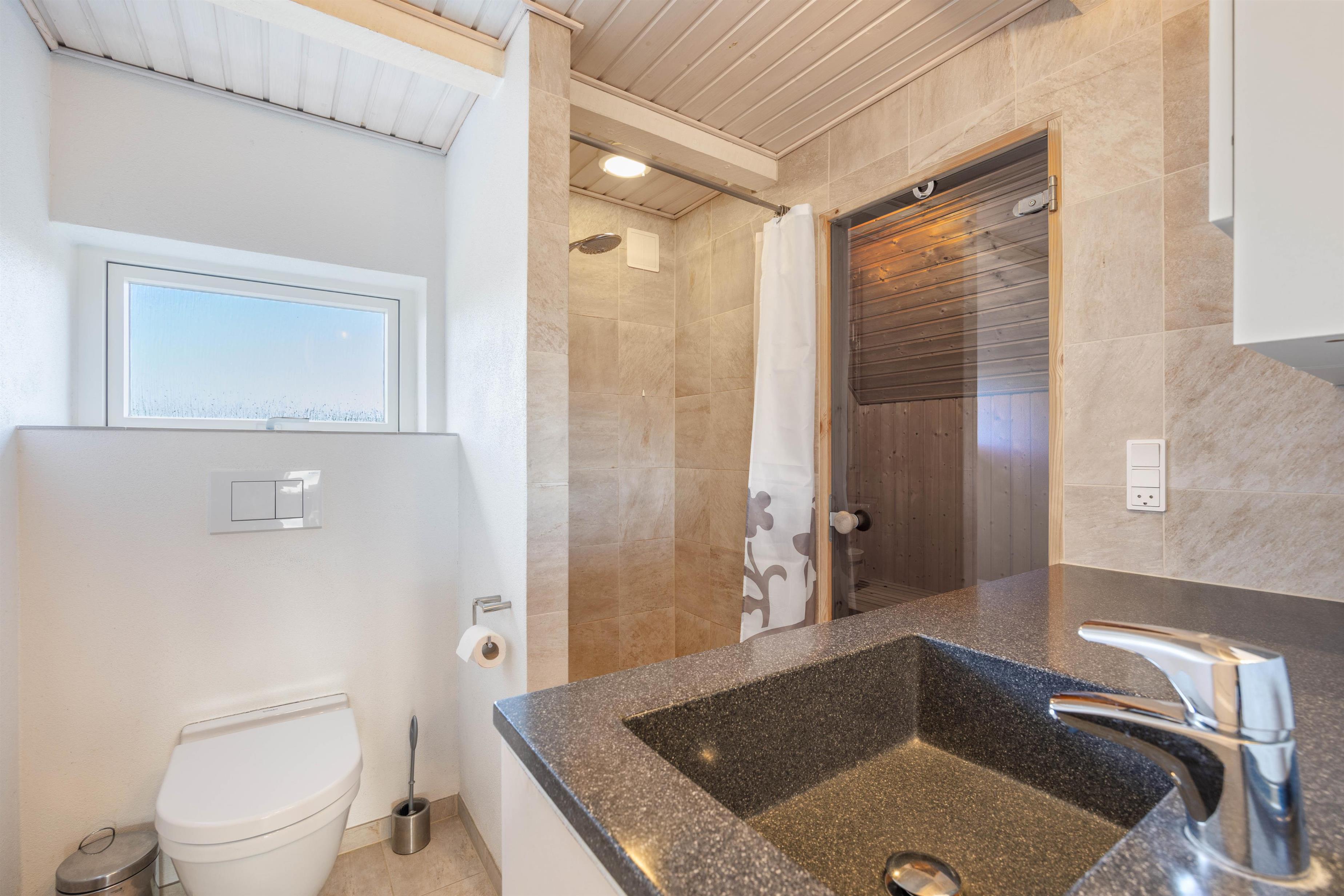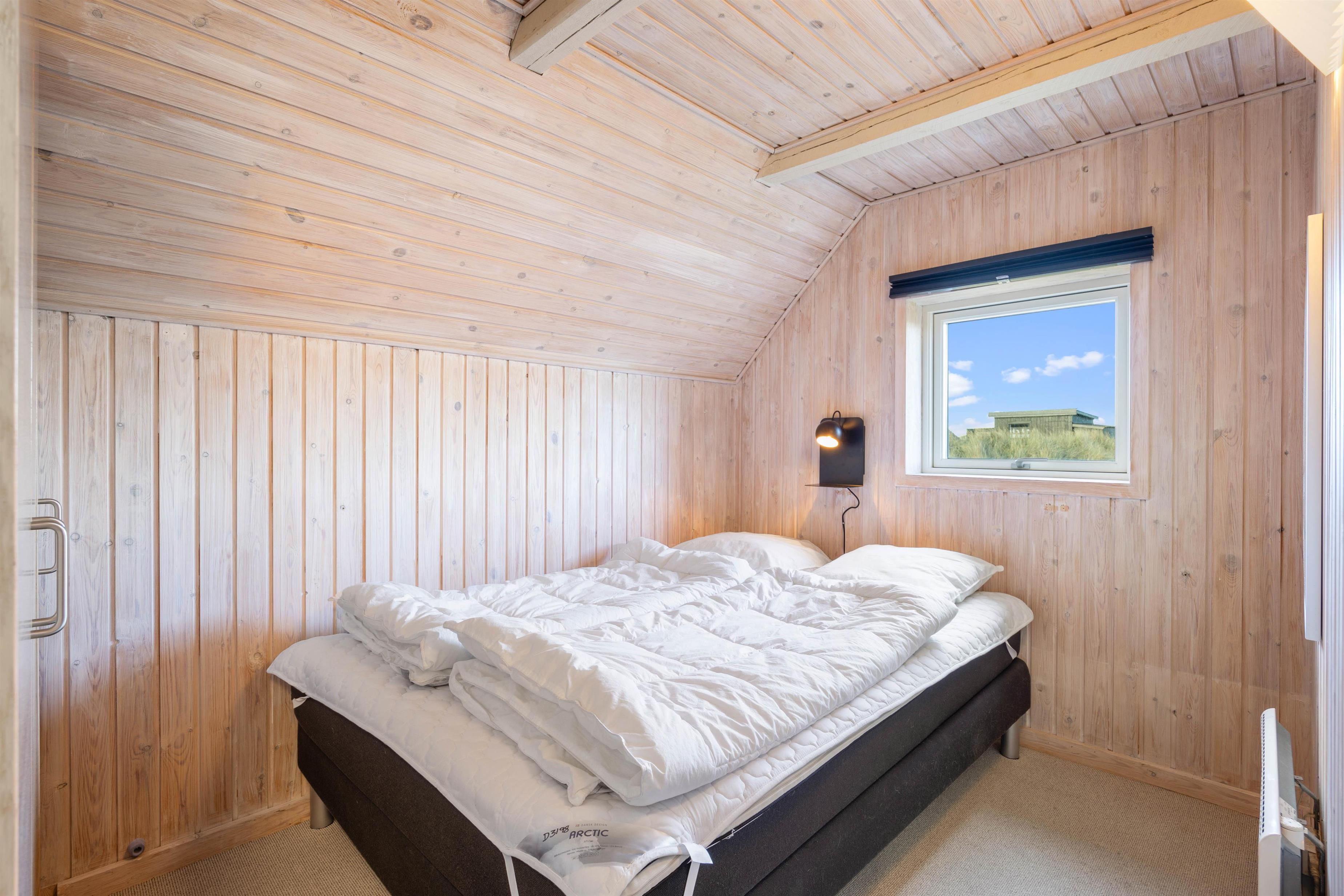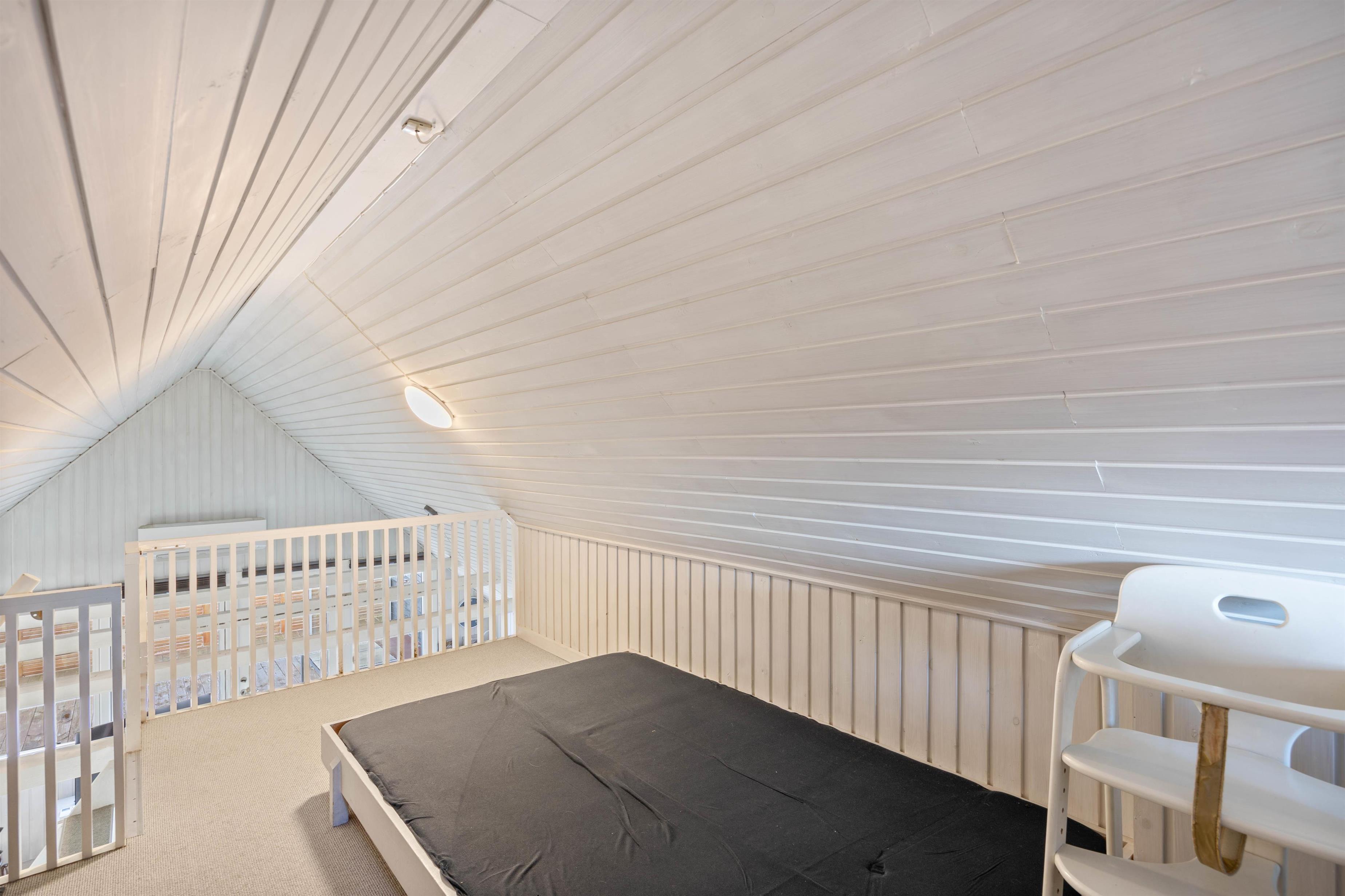 Der er 2 soveværelser i sommerhuset, som begge er indrettet dobbeltsenge. Ovenpå er der en stor hems, hvor der er 2 enkeltsenge. På badeværelset er der gulvvarme samt en sauna, som er rigtig dejlig efter en lang gåtur ved vandet. Her er desuden bruseniche og vaskemaskine samt tørretumbler.
