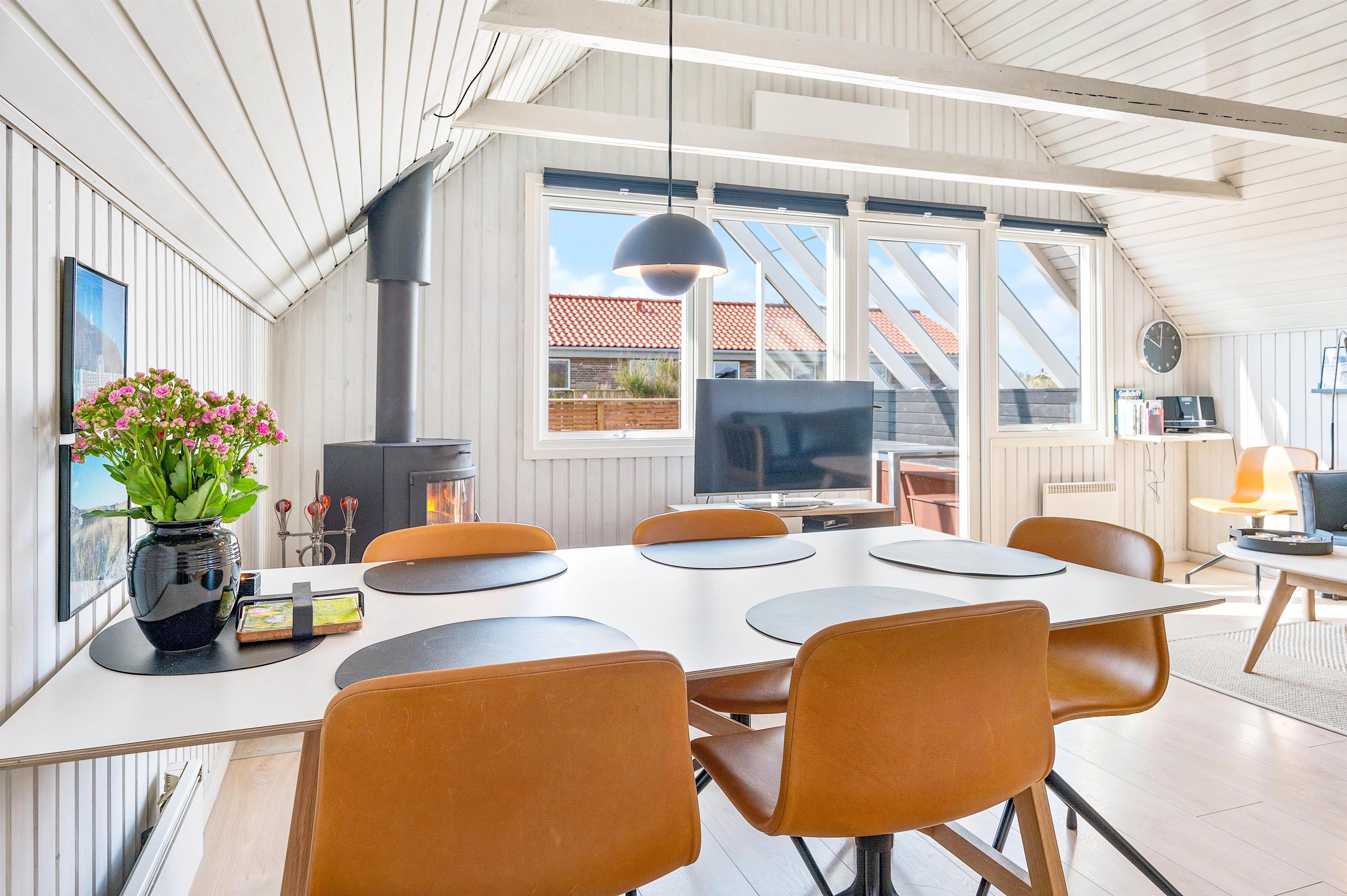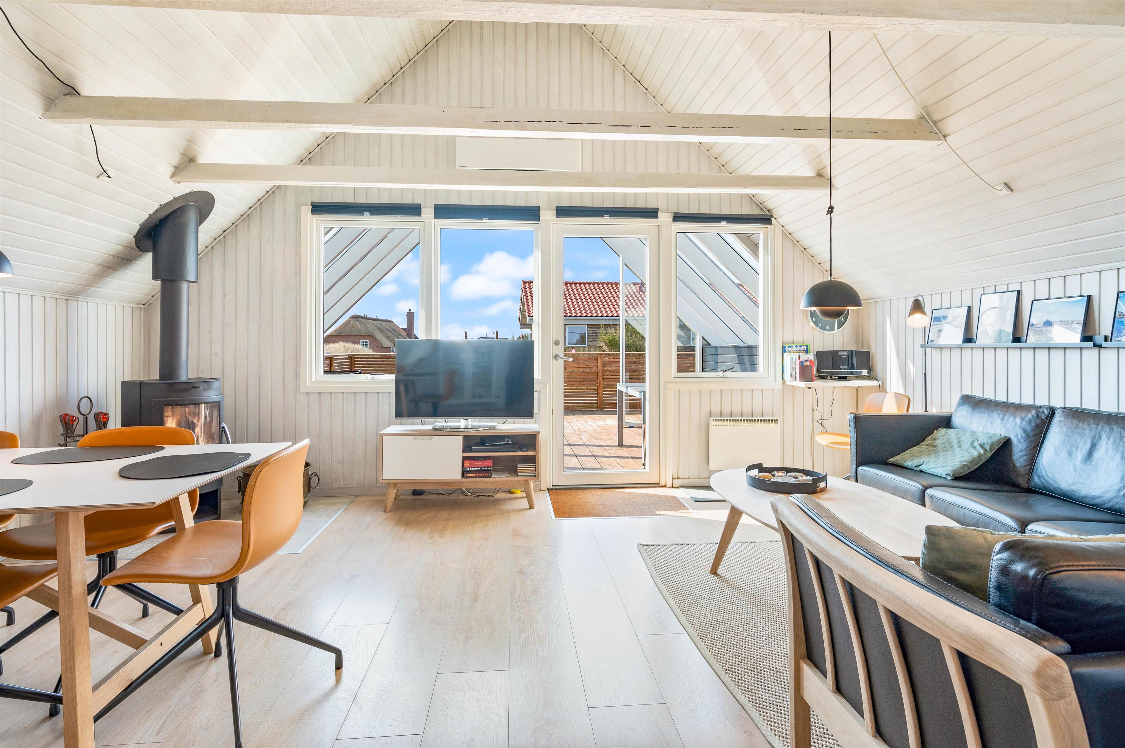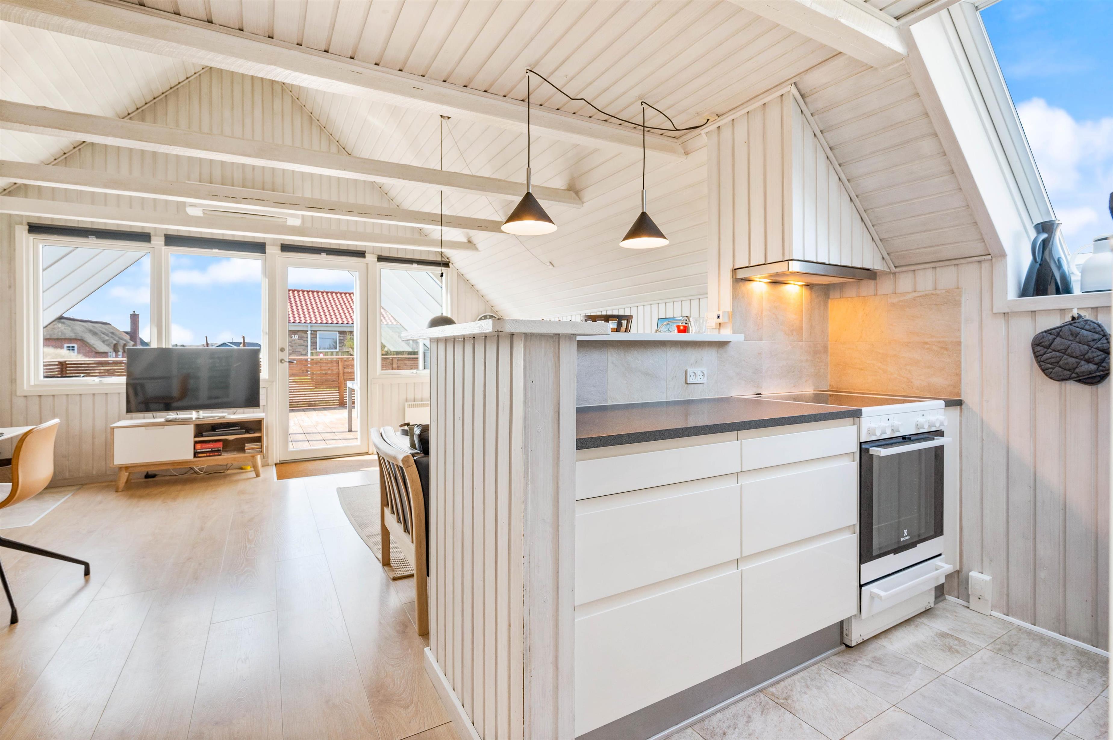 Køkkenet har en fryser på 35 L, en mikroovn og en opvaskemaskine. Stuen har loft til kip med hyggelige synlige bjælker samt en flot brændeovn, som skaber både hygge og varme. Der er desuden fladskærms-TV, DVD og gratis trådløst internet.
