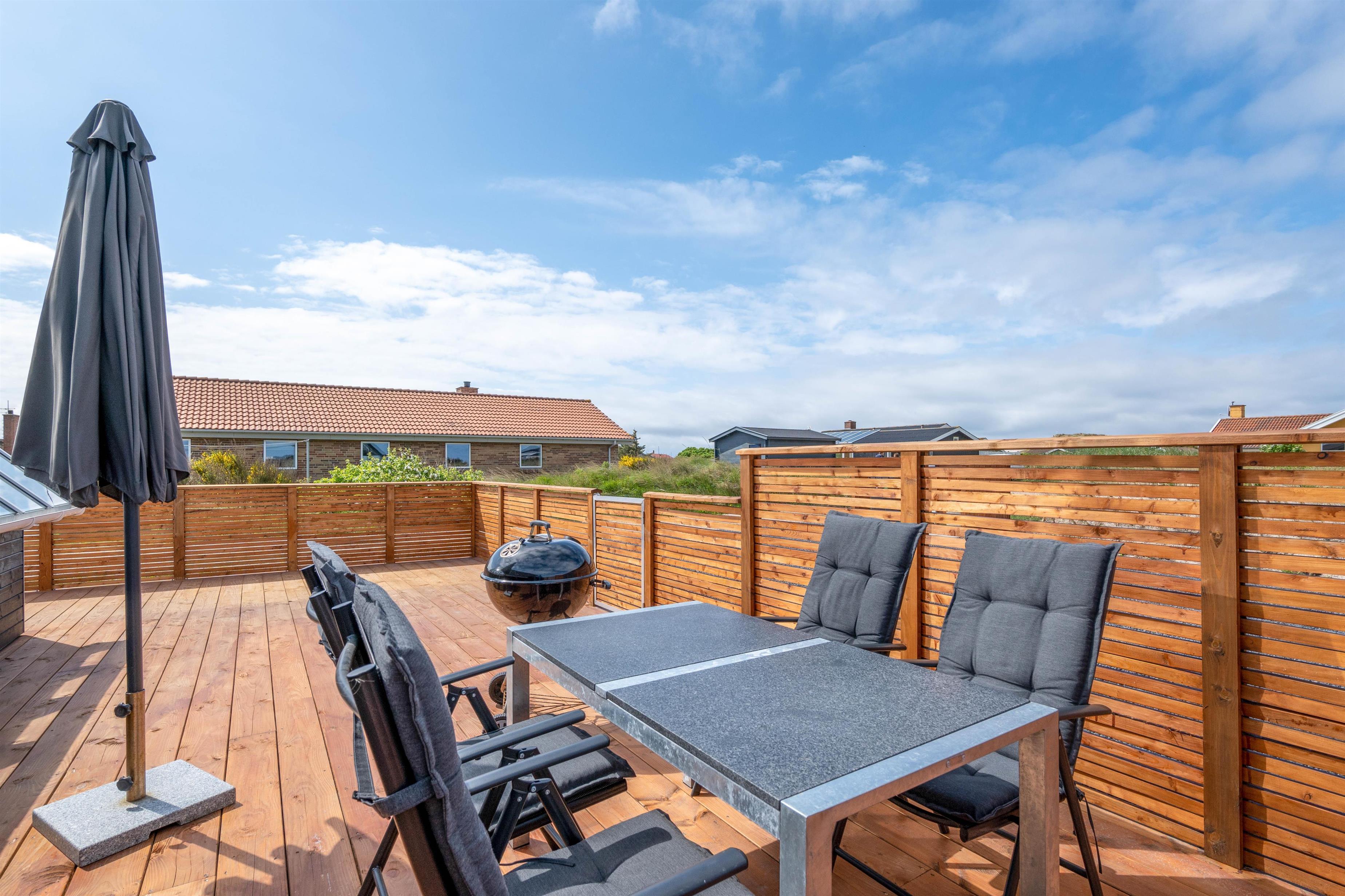 Der er en skøn sydvendt og helt lukket terrasse, som også strækker sig om huset mod vest. Den er derfor ideel for familier med børn og/eller hunde. Desuden er 24 kvm af terrassen overdækket, så I kan sidde i ly for lidt regn.