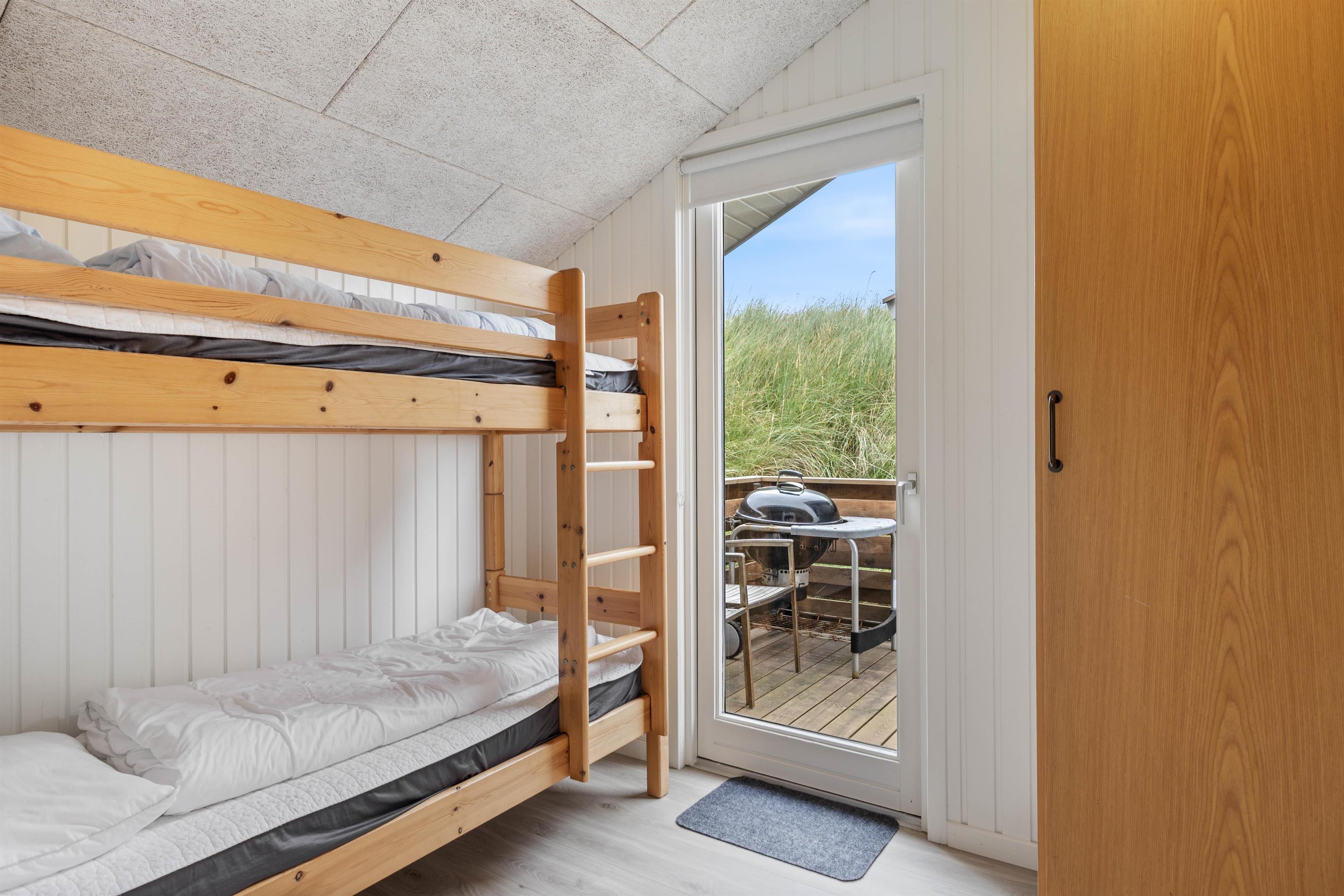 Forhøjet på en kuperede naturgrund ligger dette feriehus. Når I har parkeret bilen, vil trappen føre jer op til det træbeklædte feriehus. Indvendigt er feriehuset dejligt lyst og gedigent indrettet. Et badeværelse med gulvvarme samt tre gode soveværelser. Alle med indbyggende skabe og fine senge, der sikrer jer en god nattesøvn. Det ene værelse har en køjeseng – helt sikkert et hit blandt børnene.