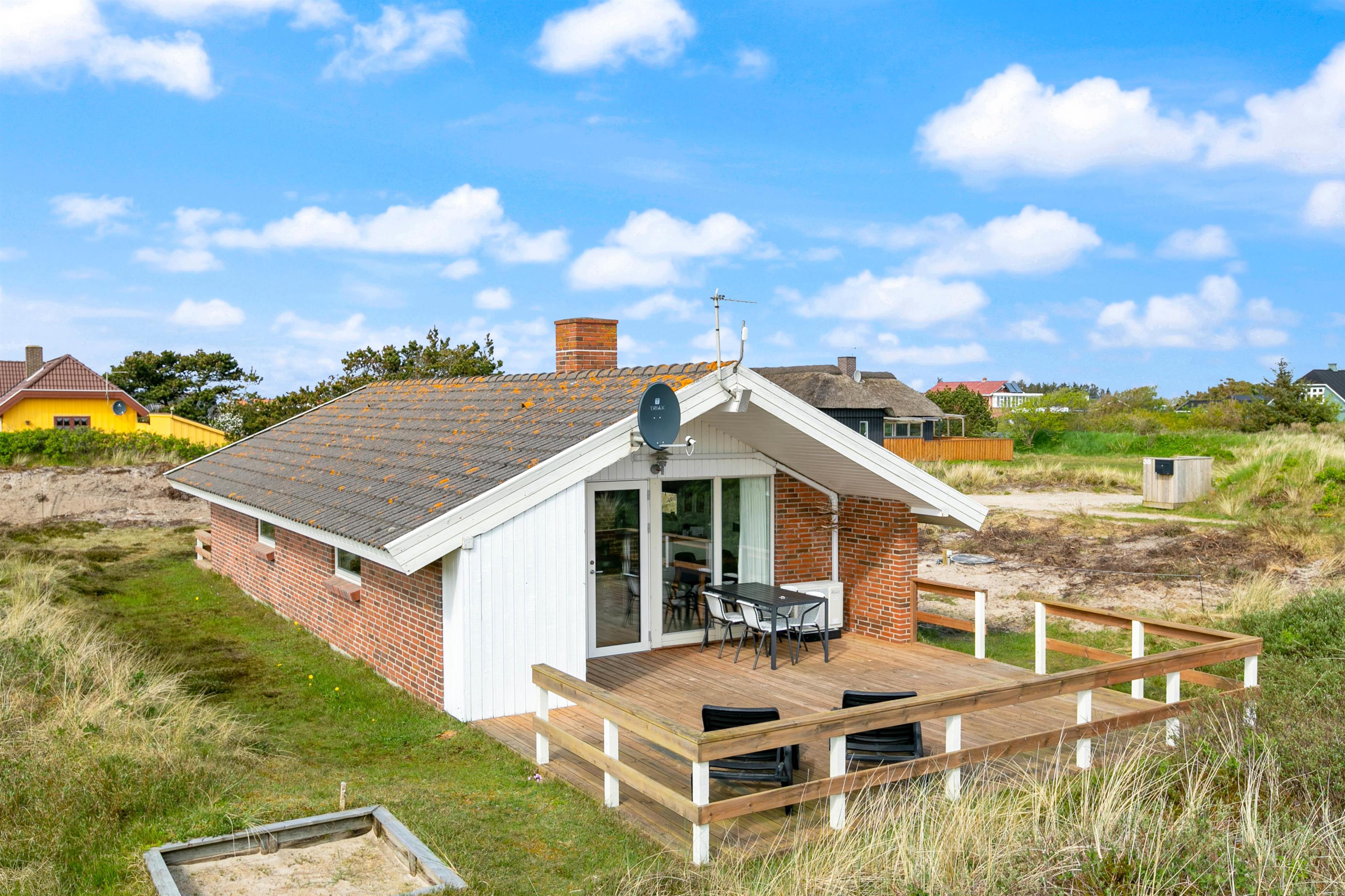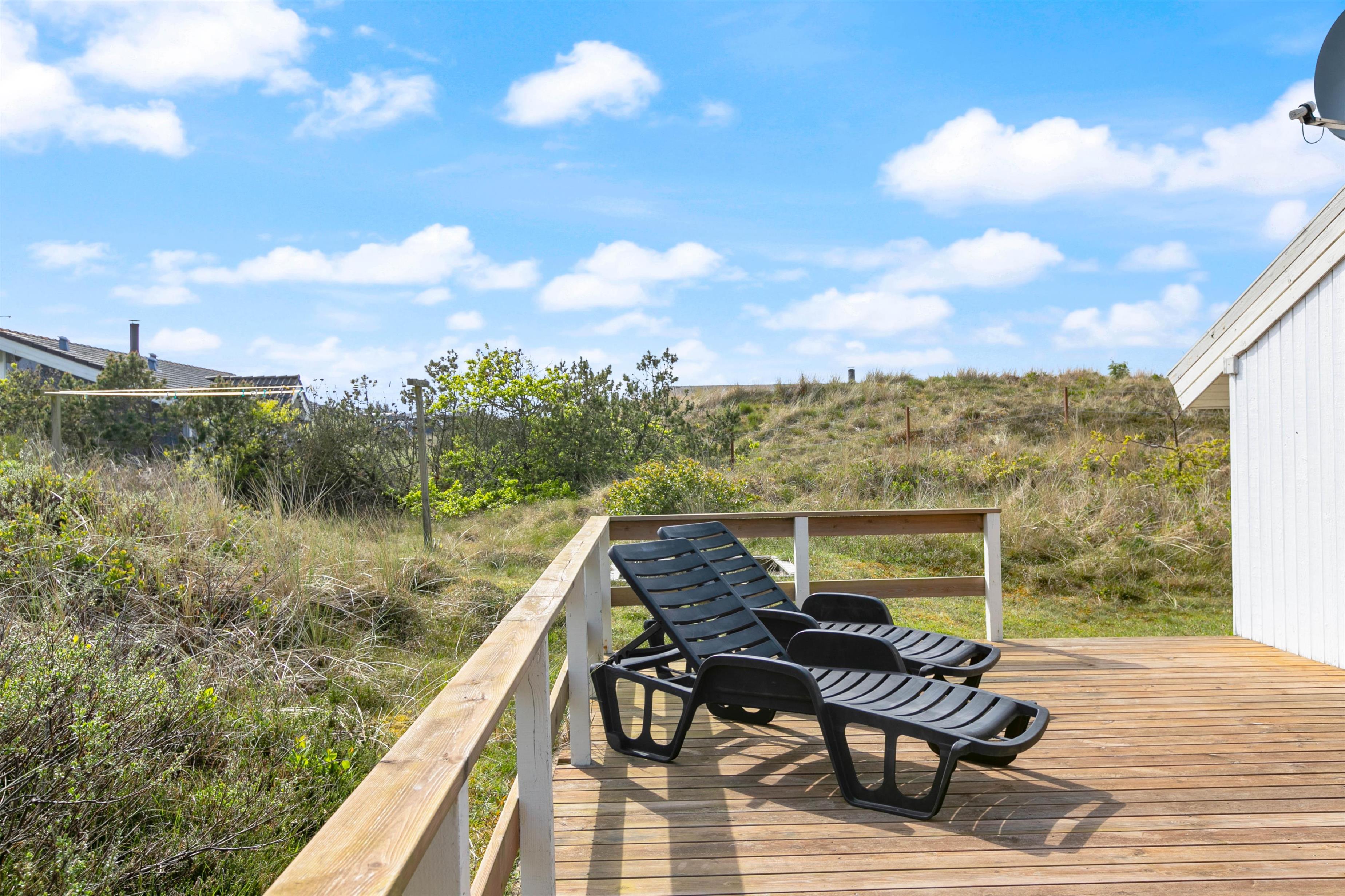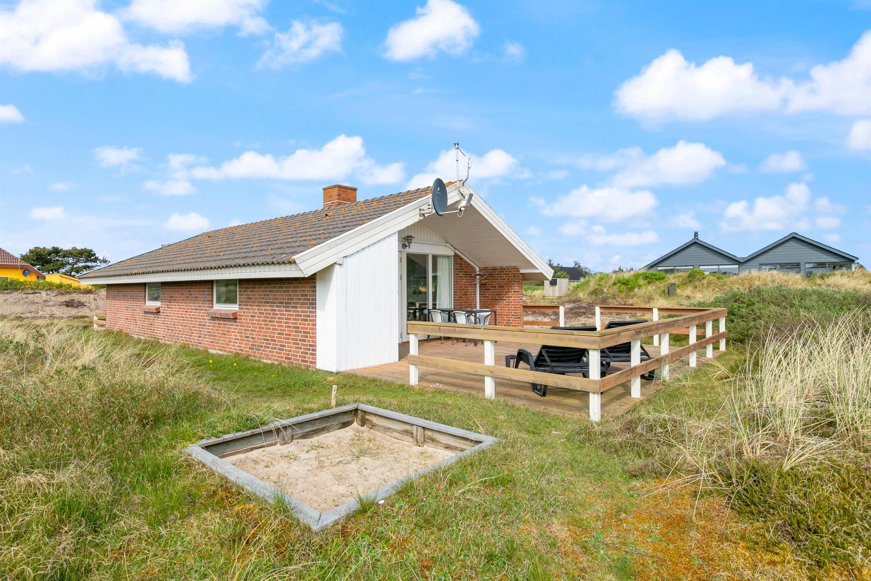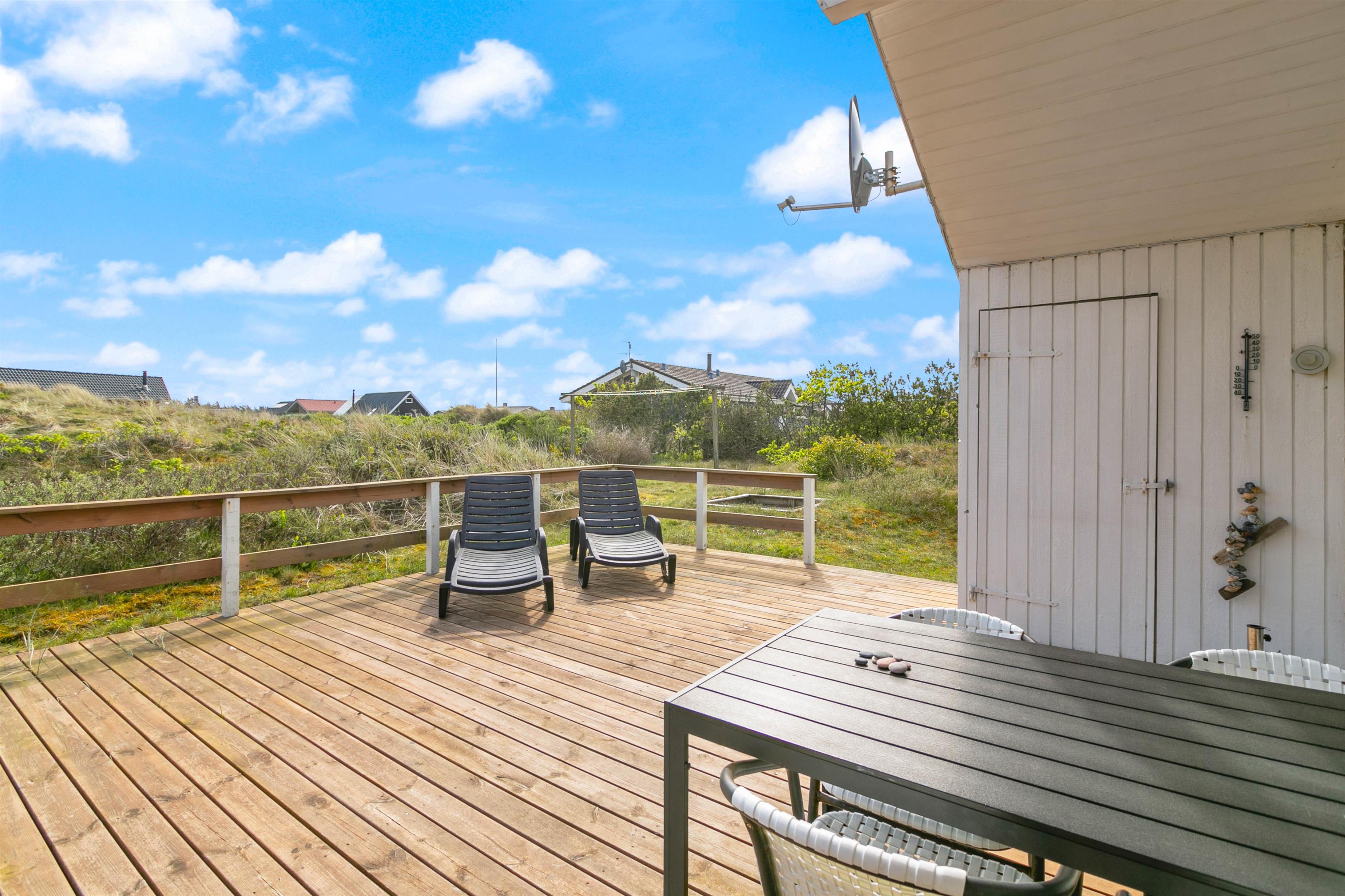 Dette sommerhus har en rigtig dejlig og delvis overdækket terrasse med gode møbler til de dejlige sommerdage. Tag en lur på liggestolen eller hvad med en hyggelig grillaften sammen med familie og venner? Til de mindste feriegæster er der en sandkasse.