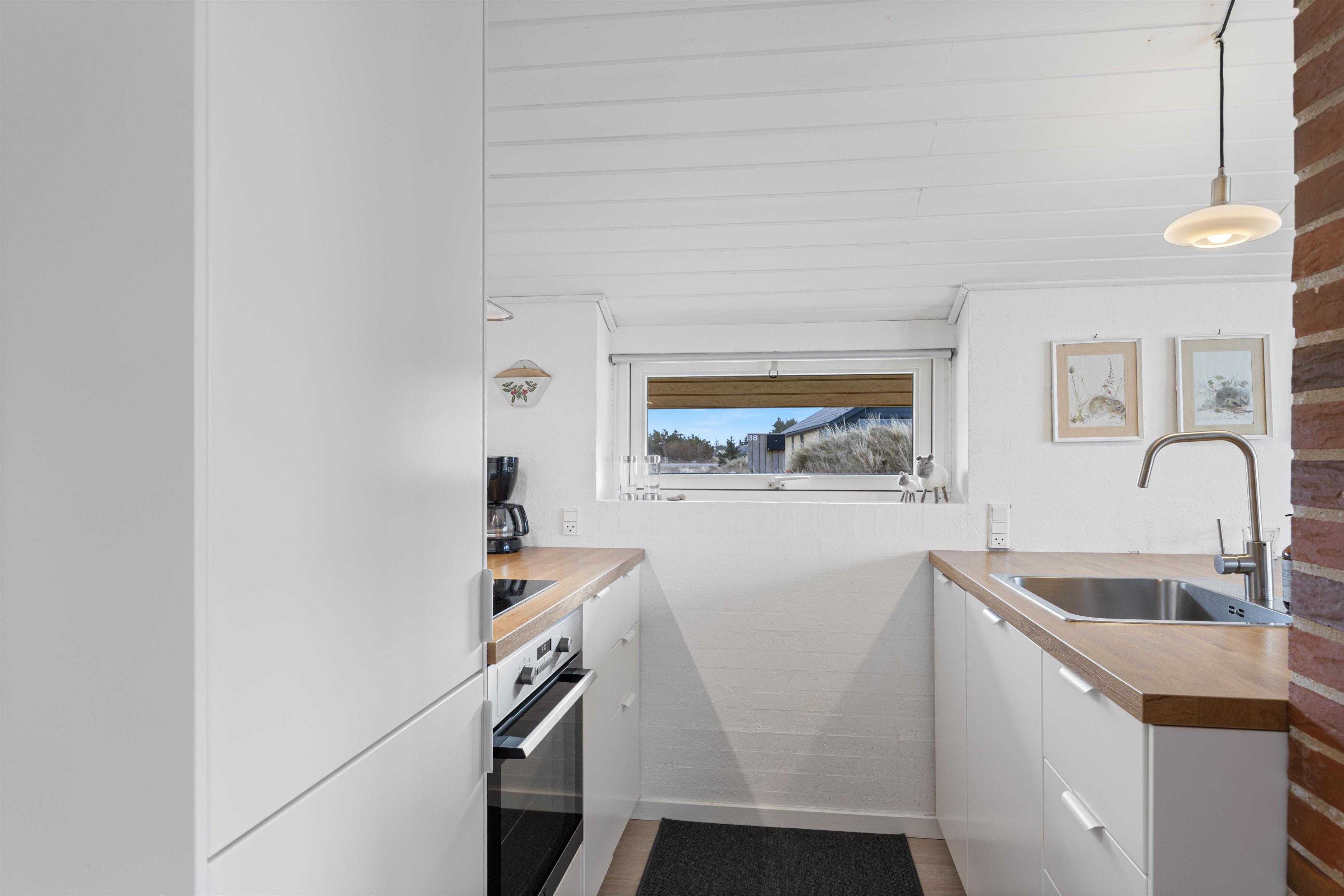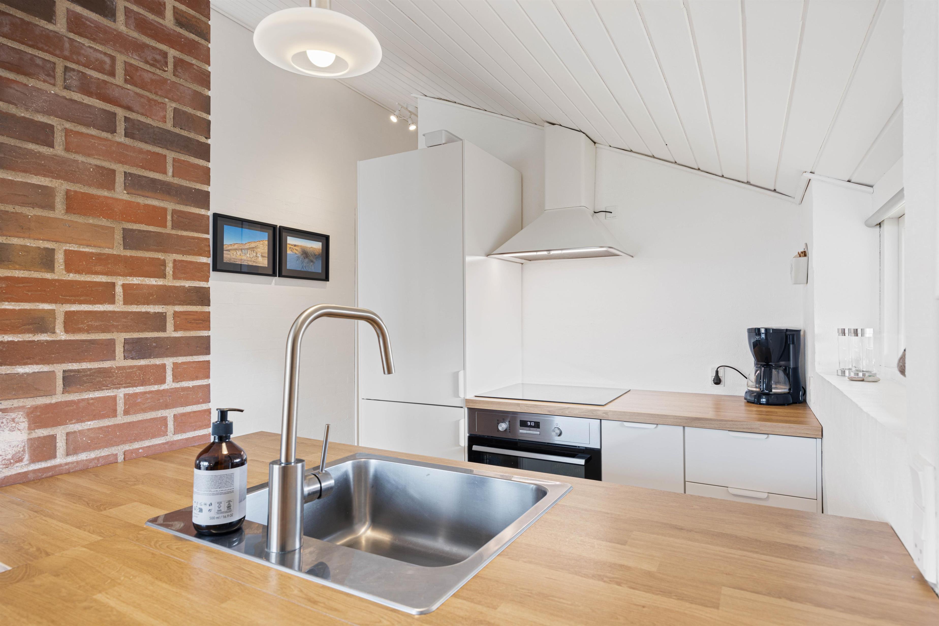 Køkkenet står i åben forbindelse med stuen. Her kan maden forberedes alt, imens snakken går med familien eller vennerne i stuen. I køkkenet er der køleskab, opvaskemaskine samt mikroovn.