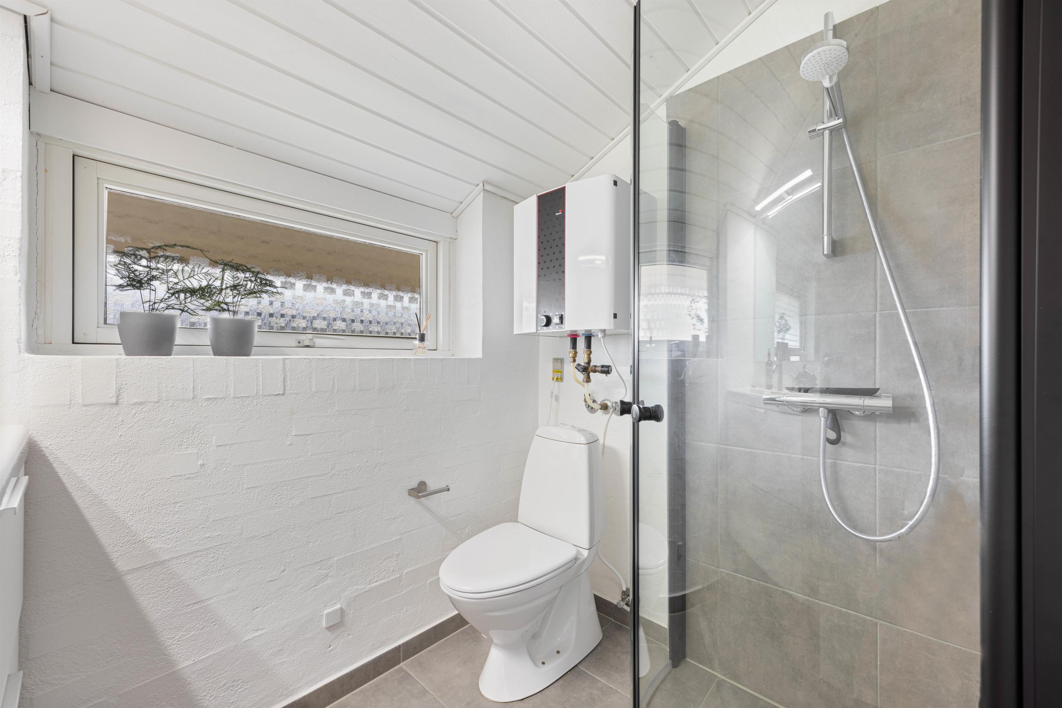 Badeværelset er med fliser på væggene og i brusenichen. Her er lyst med rustikt klinkegulv.