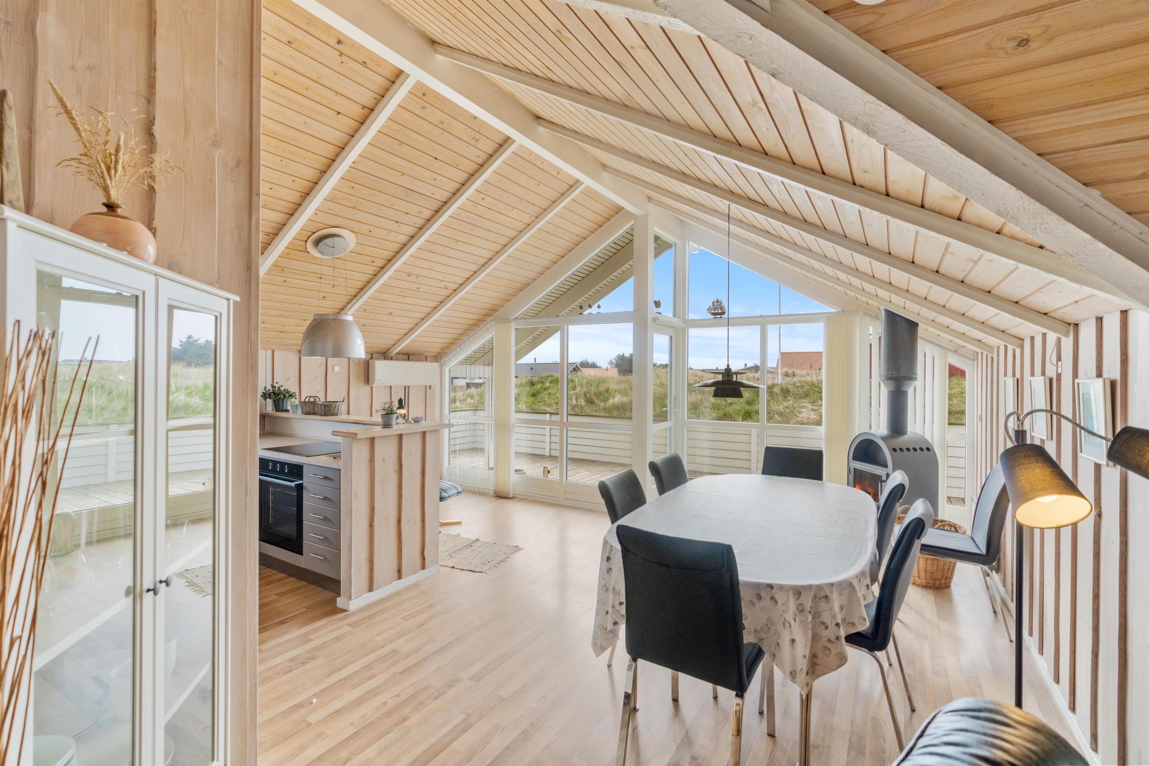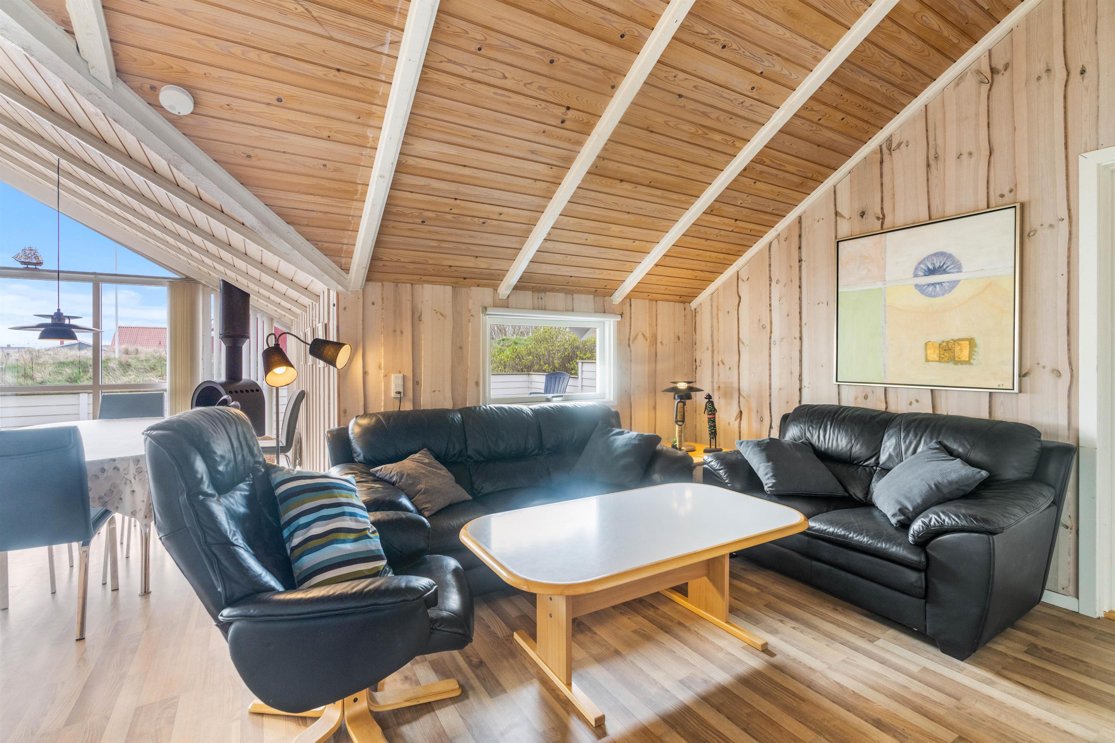 Indretningen i det flotte sommerhus er lys og indbydende, og de mange vinduer sikrer et smukt kig til landskabet udenfor. Vægge og lofter er beklædte med træ, hvilket er med til at skabe en dejlig varm og hyggelig atmosfære i indretningen. I sommerhuset er der en brændeovn samt en varmepumpe.