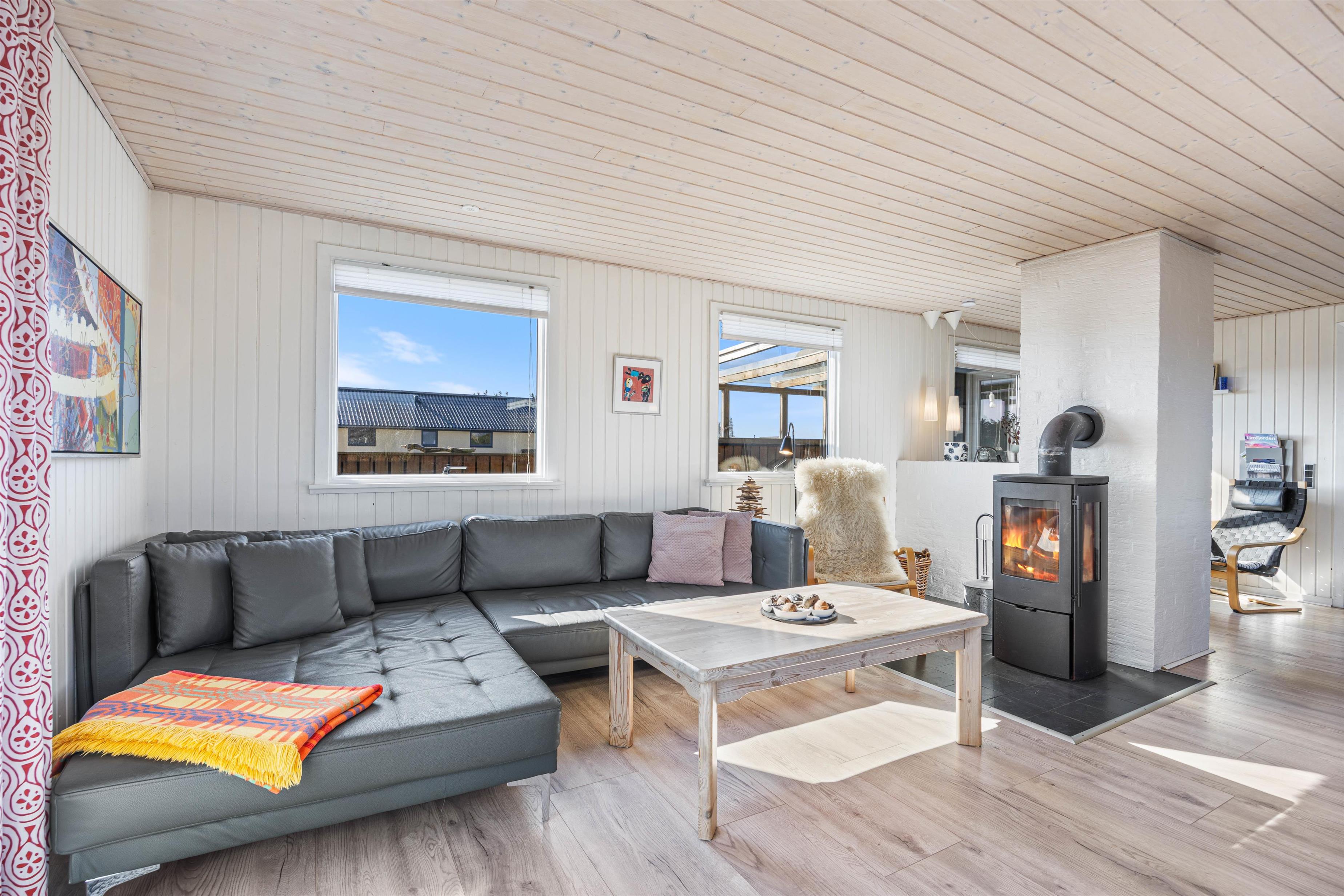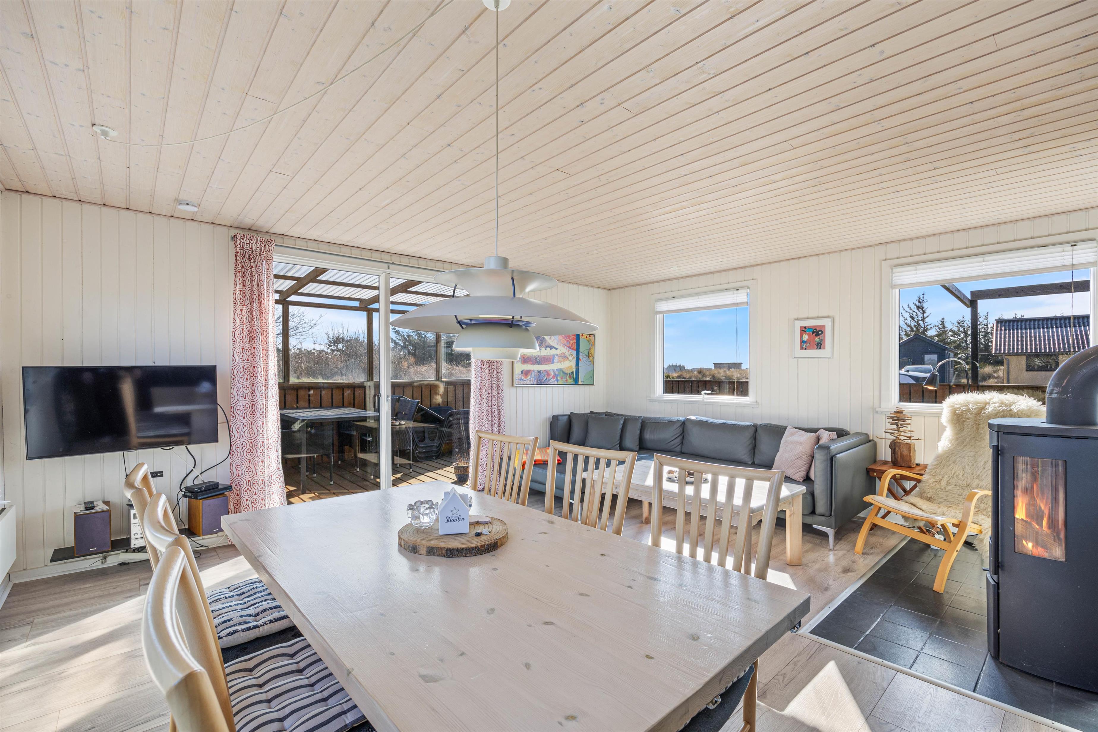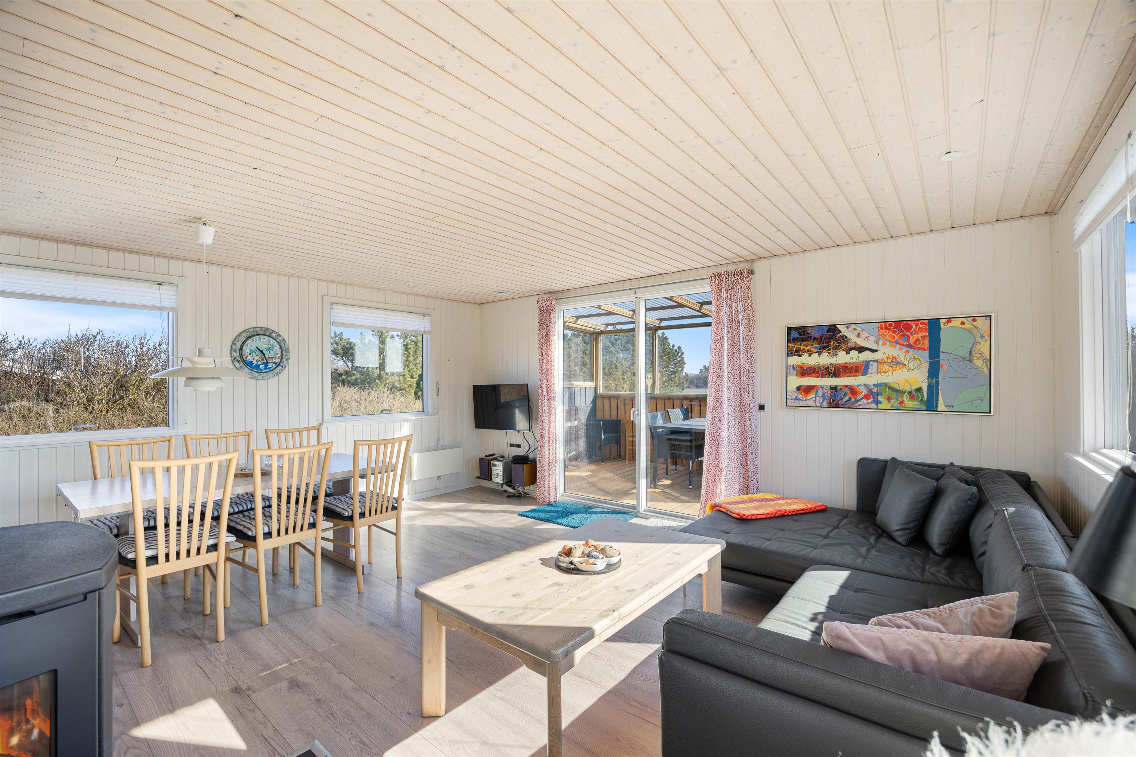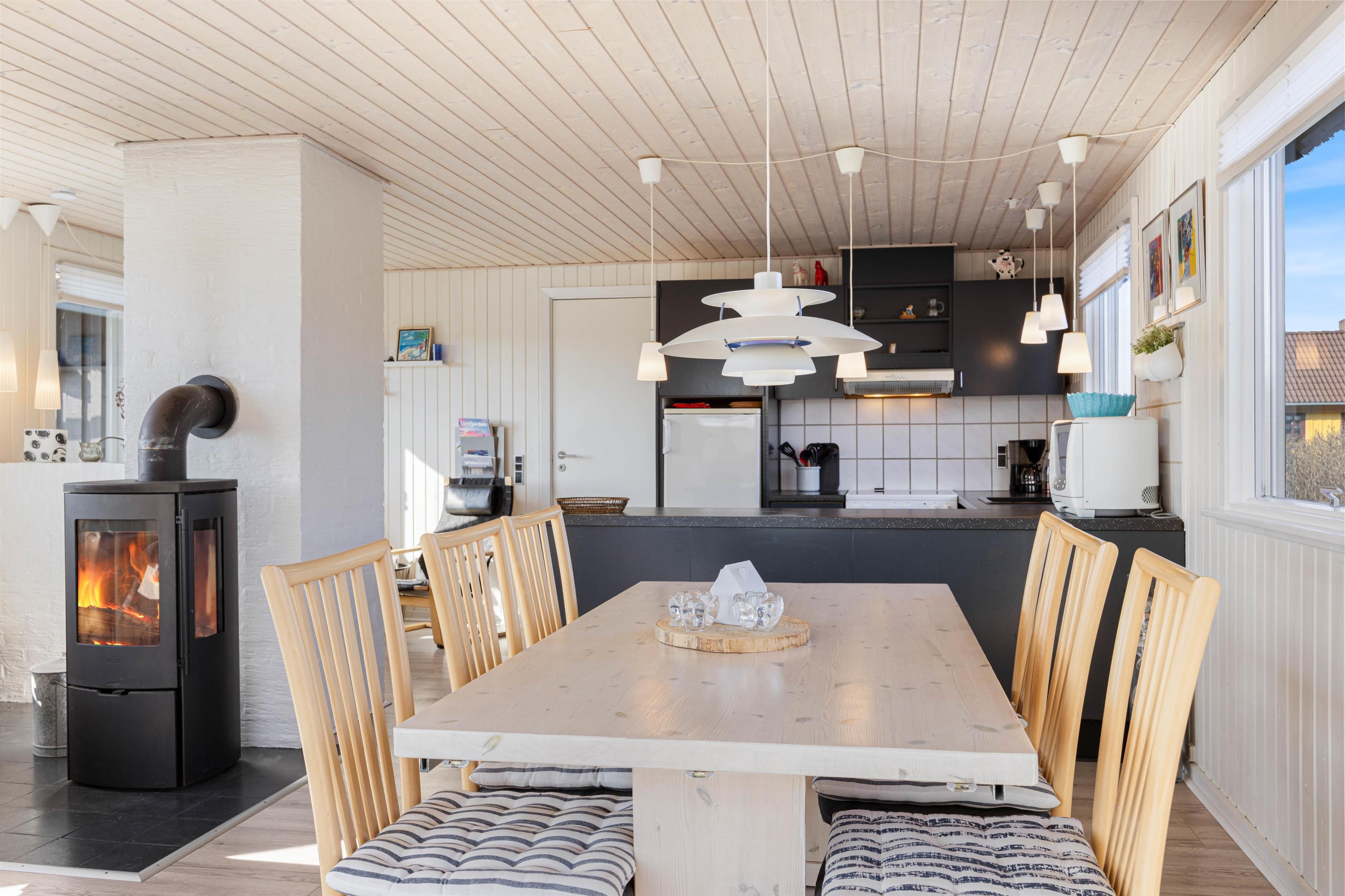 Her føler man sig hjemme straks, man træder ind ad døren. Det fine lysindfald og de hvidmalede, træbeklædte vægge sætter straks feriestemningen i gang. Med ild i brændeovnen kan I her nyde opholdet ved Vesterhavet, selv på stormfulde dage. Stue og køkken er indrettet i åbent plan, så I kan samtale under madlavningen eller trække jer tilbage med en god bog ved varmen fra brændeovnen. Særligt om morgenen, når brændeovnen endnu ikke er tændt, fungerer den energibesparende varmepumpe som en omkostningseffektiv varmekilde.