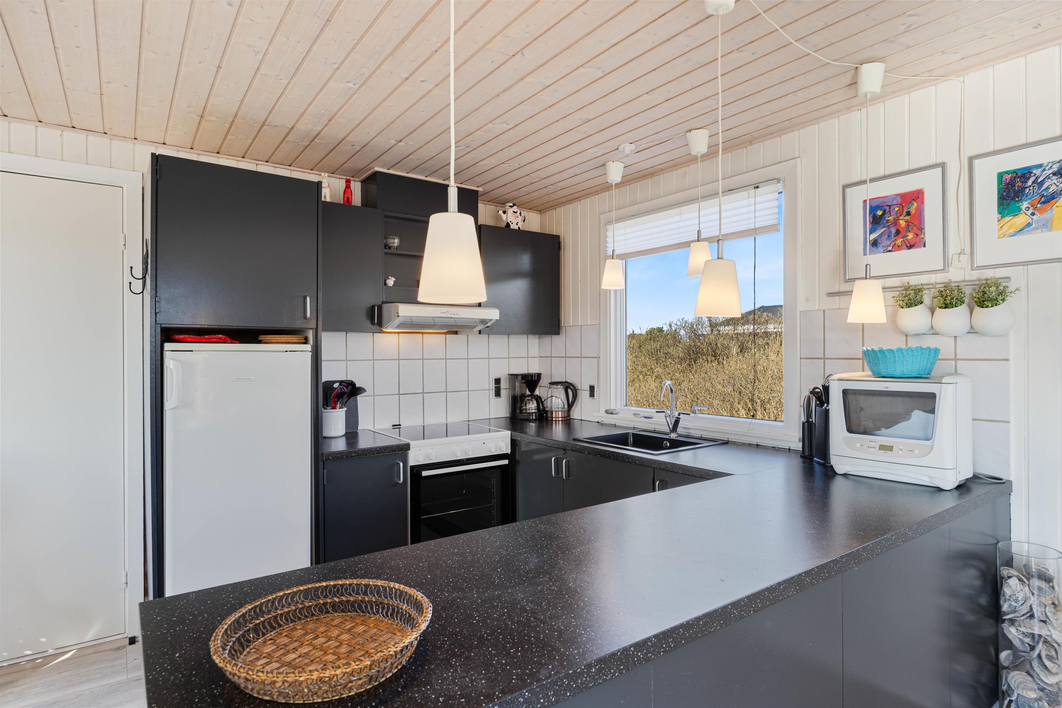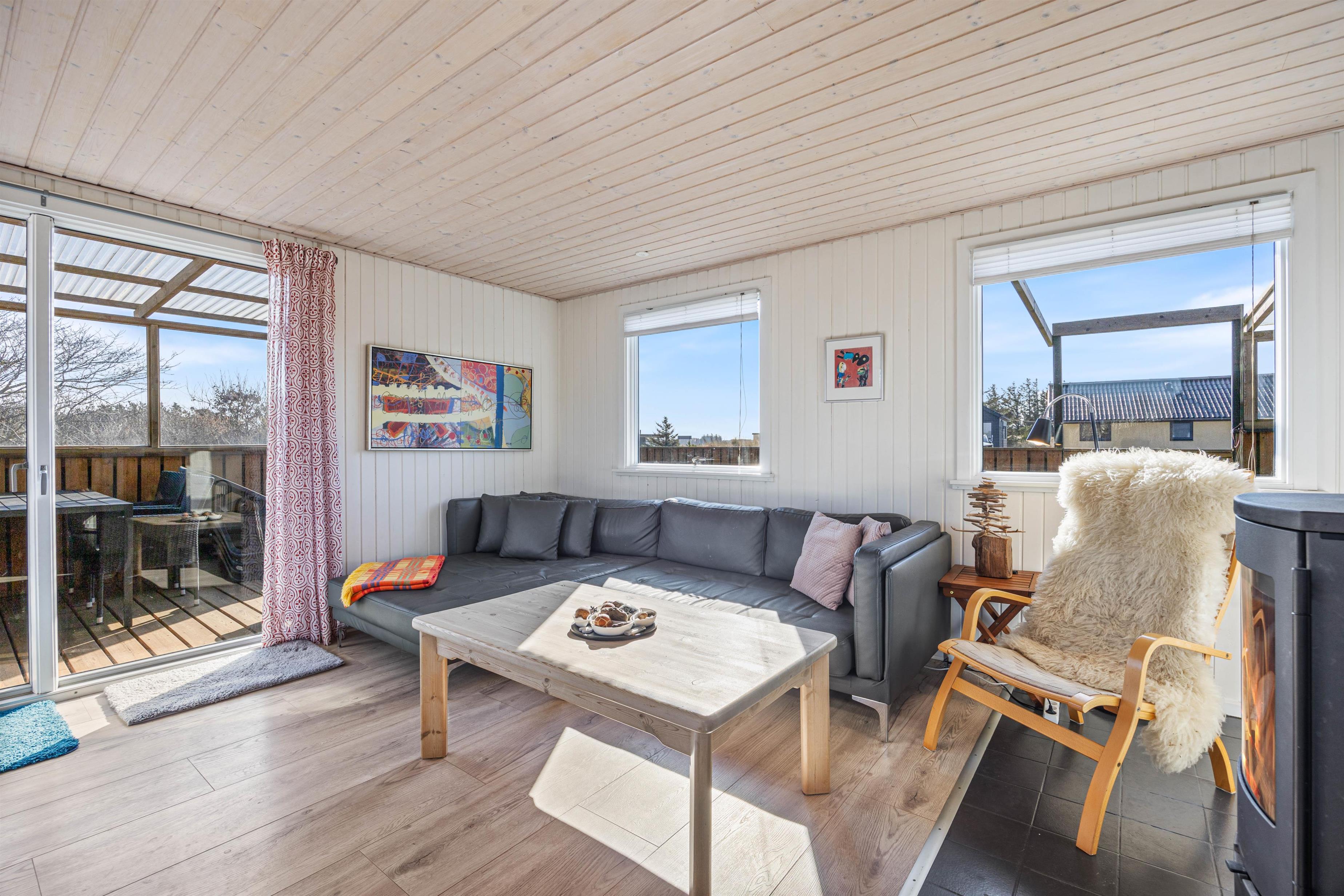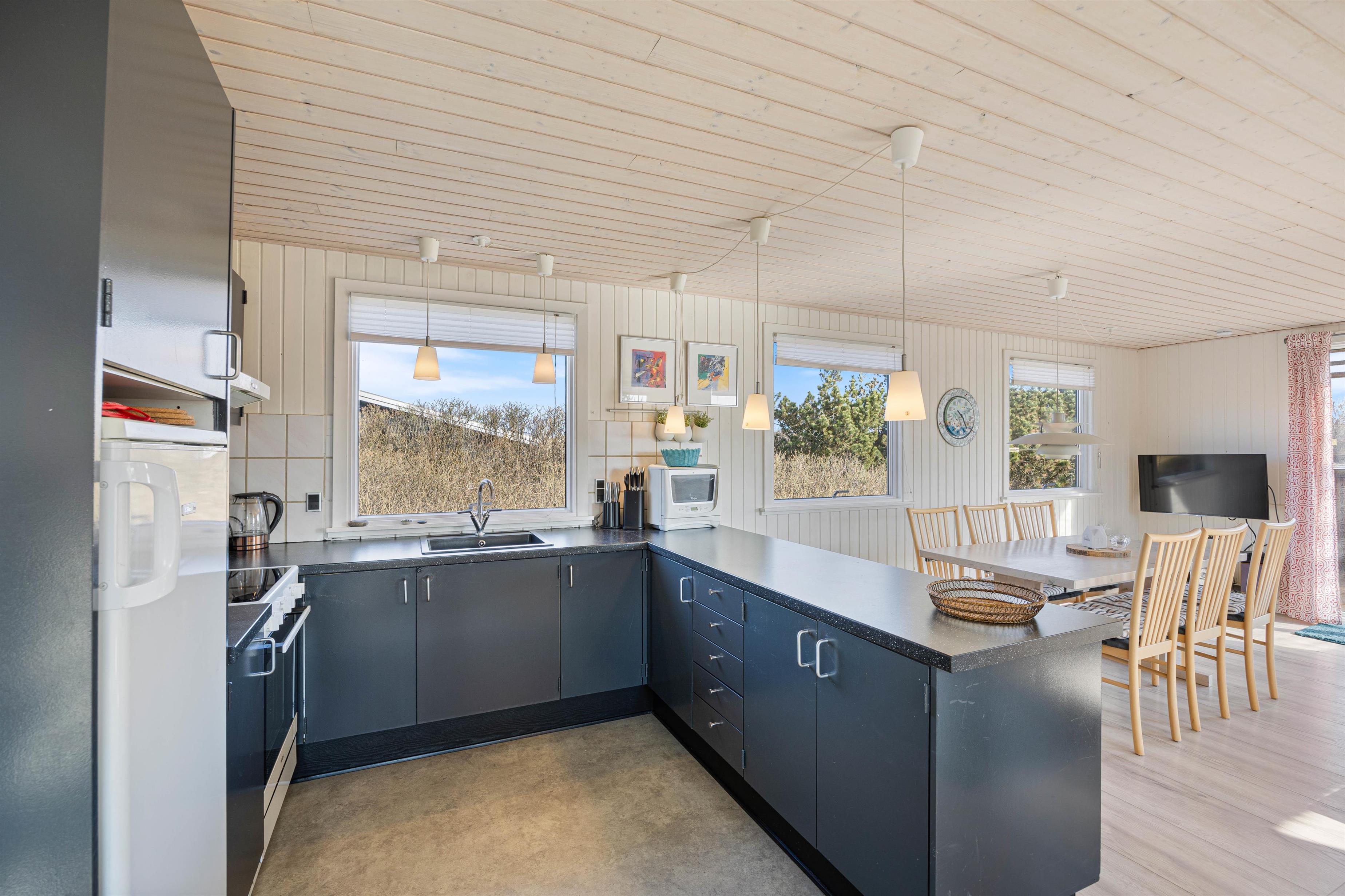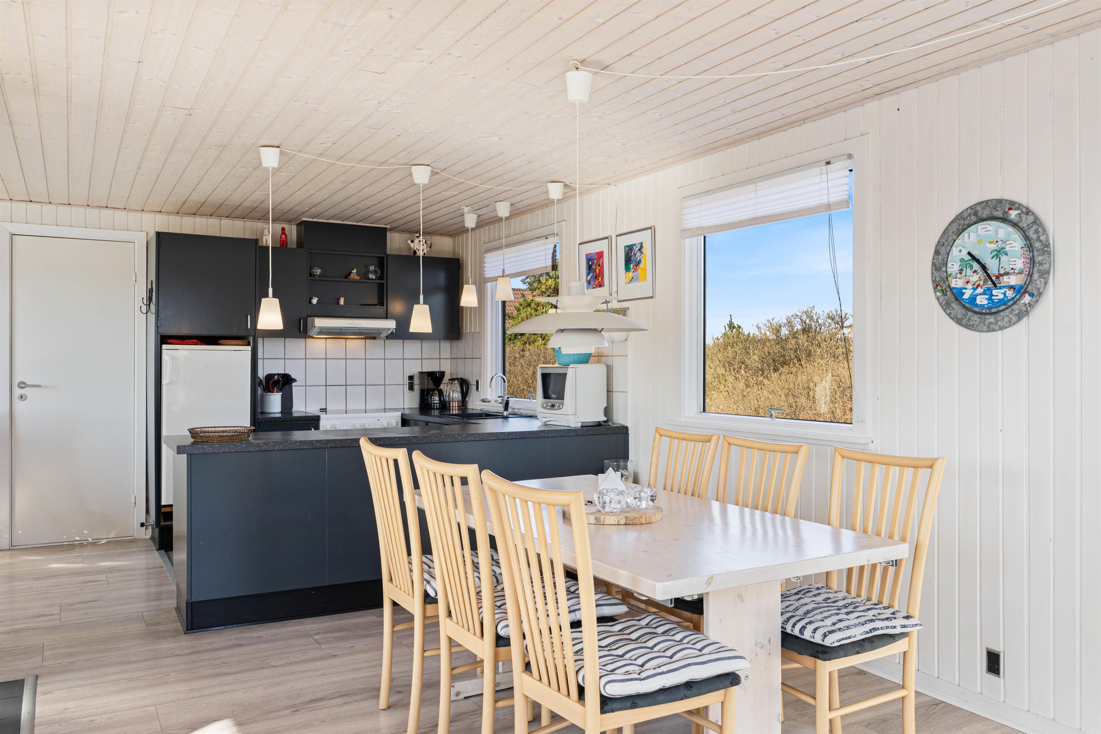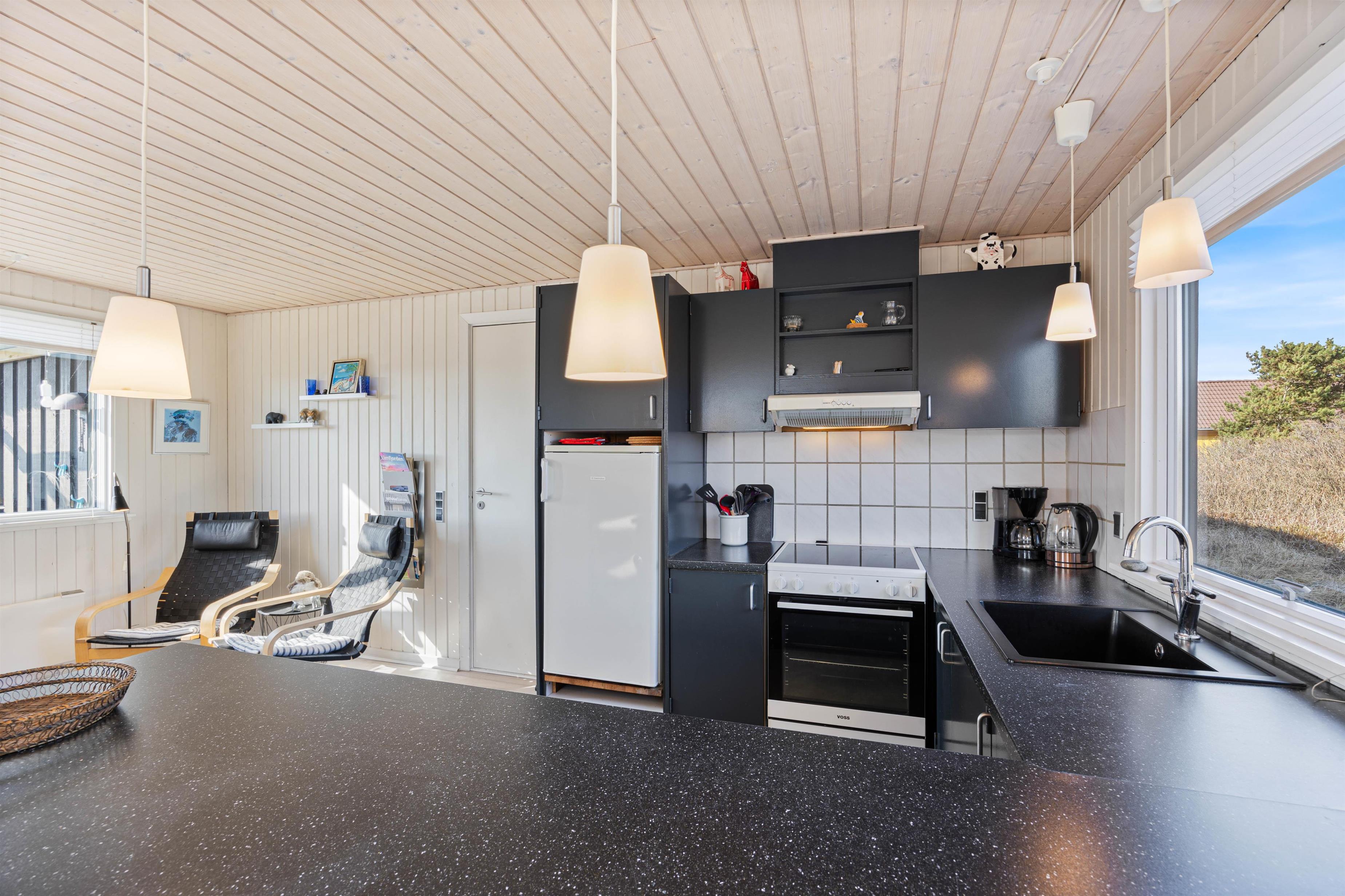 Her føler man sig hjemme straks, man træder ind ad døren. Det fine lysindfald og de hvidmalede, træbeklædte vægge sætter straks feriestemningen i gang. Med ild i brændeovnen kan I her nyde opholdet ved Vesterhavet, selv på stormfulde dage. Stue og køkken er indrettet i åbent plan, så I kan samtale under madlavningen eller trække jer tilbage med en god bog ved varmen fra brændeovnen. Særligt om morgenen, når brændeovnen endnu ikke er tændt, fungerer den energibesparende varmepumpe som en omkostningseffektiv varmekilde.