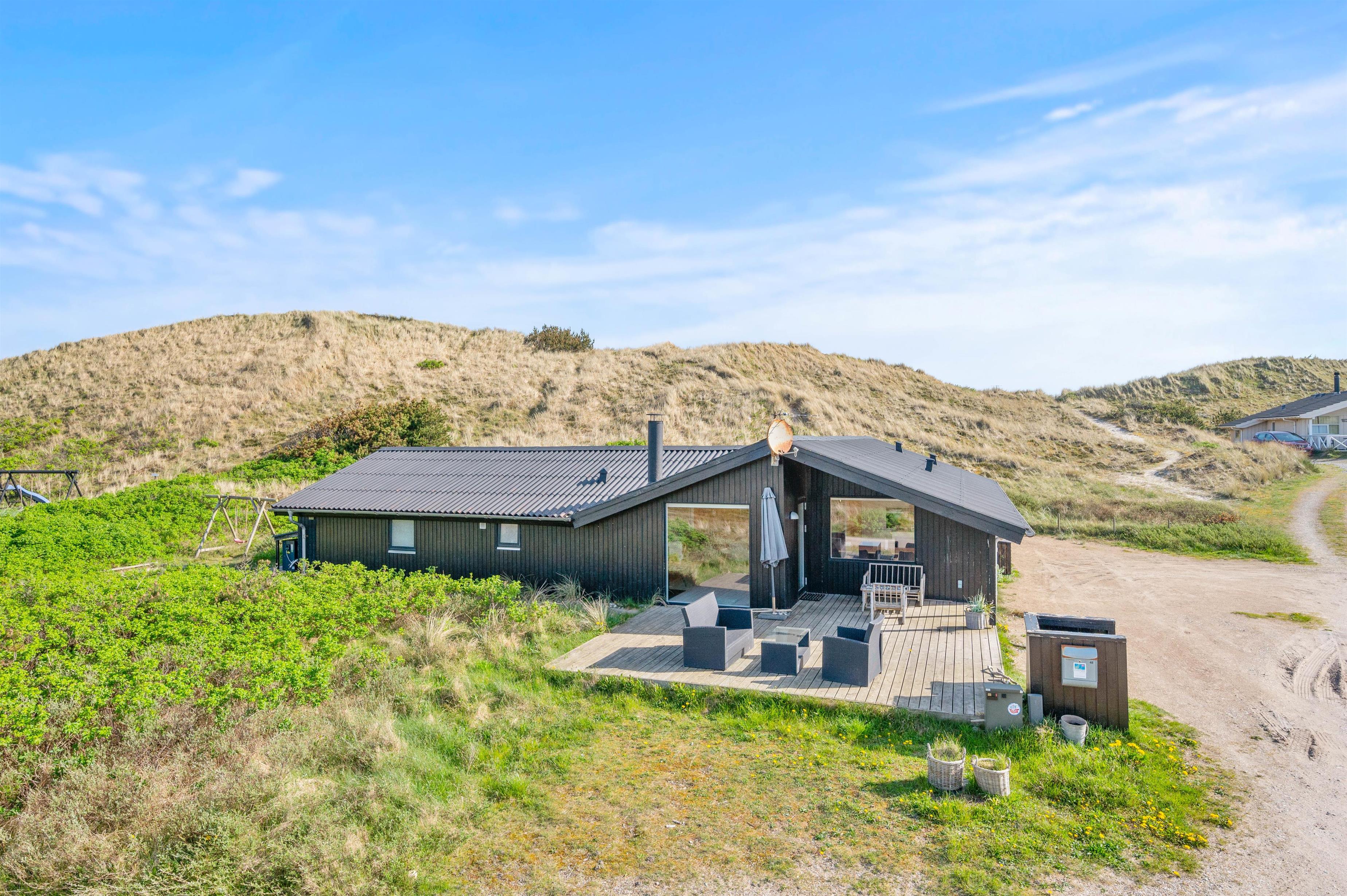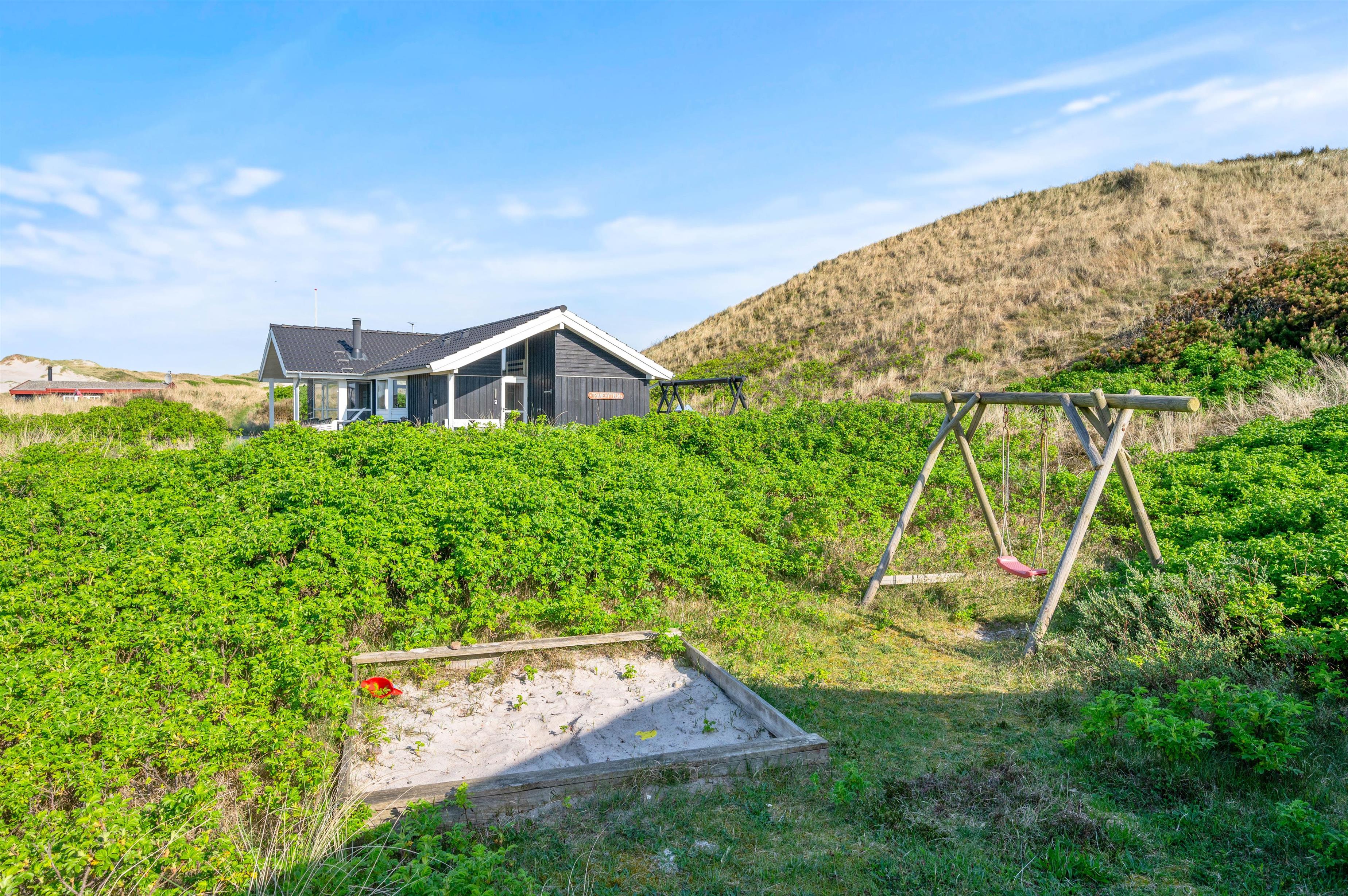 Ved feriehuset er 2 dejlige terrasser – én mod syd og én mod nord. På sydsiden er en fin træterrasse, der er delvist overdækket. Her kan I både nyde solen eller sidde i skyggen med en god bog og lidt koldt at drikke. På bagsiden af feriehuset er en mere privat terrasse, hvor aftensolen også kan nydes. Familiens grillmester sørger for lidt lækkert at spise, mens familiens mindste kan lege på gyngestativet eller bygge sandslotte i sandkassen – det er ægte feriehygge.