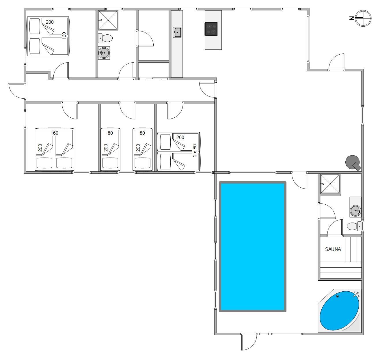 I kan nemt dele jer op på de 4 soveværelser, hvoraf 2 er indrettet med dobbeltseng og 2 med 2 enkeltsenge. Takket være de 2 badeværelser med gulvvarme undgår I kø om morgenen.