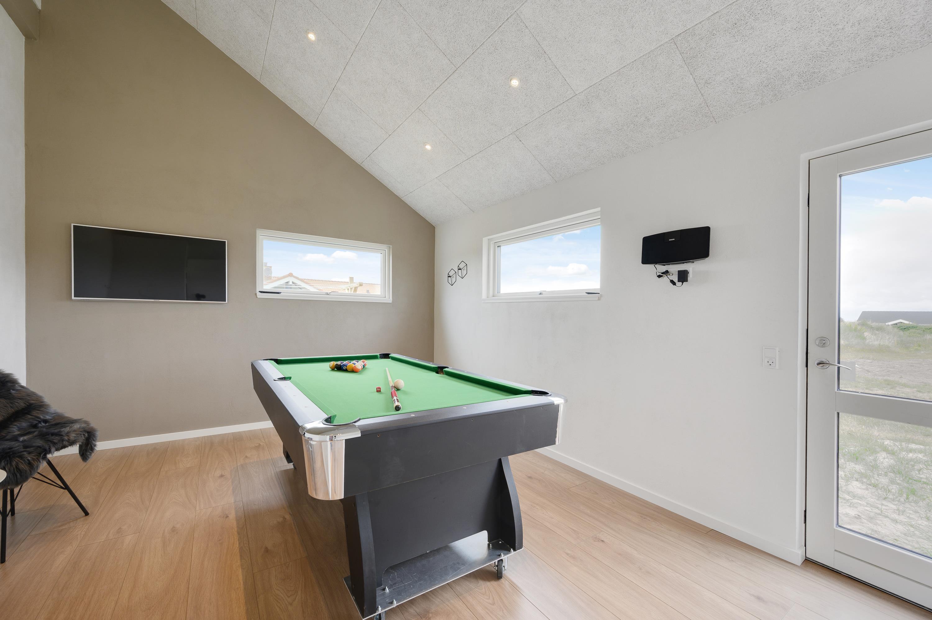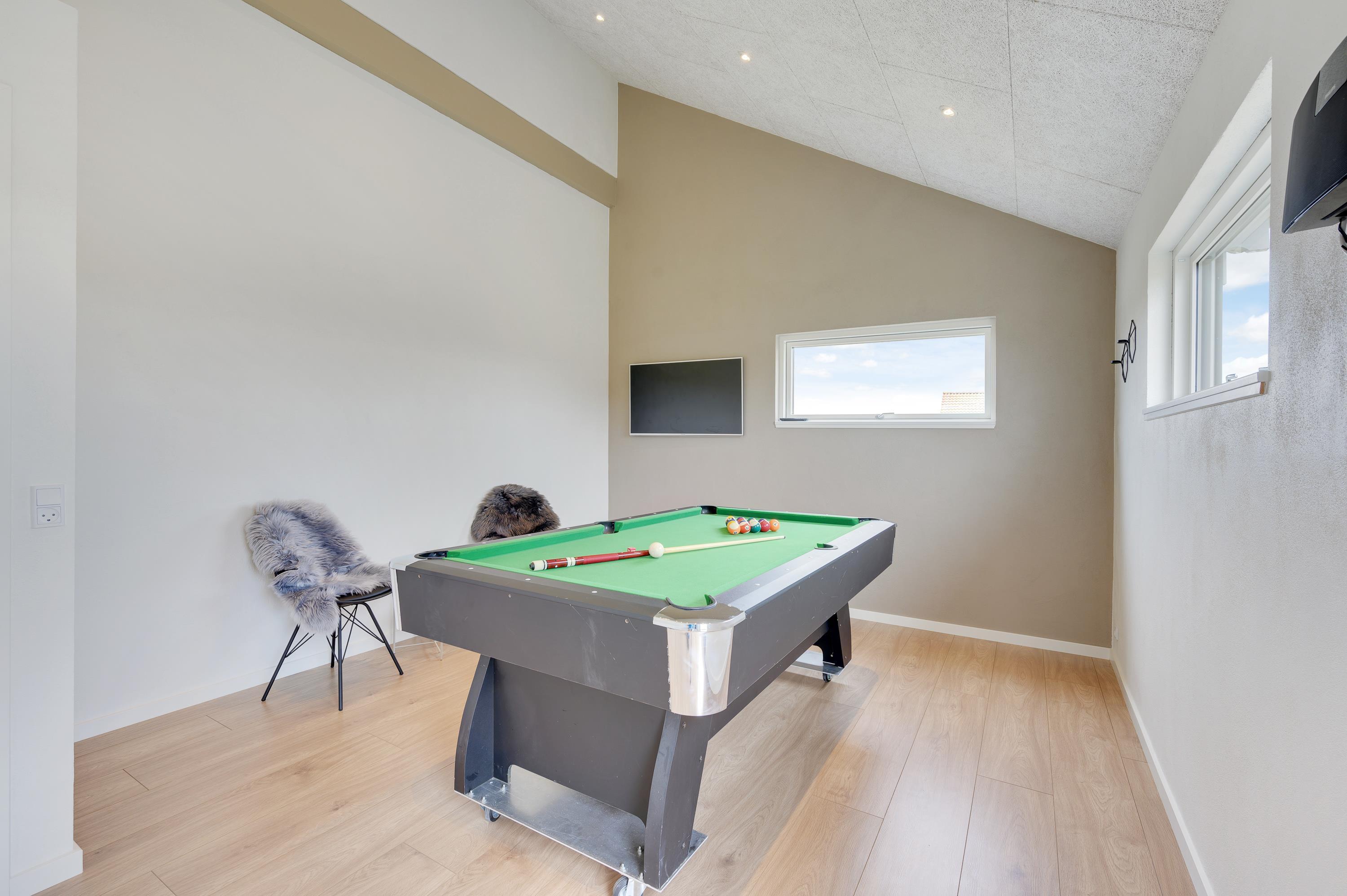 Et af sommerhusets highlights er det fine aktivitetsrum, hvor hele familien kan samles til en spændende turnering - her står nemlig et billardbord klar til jer.
