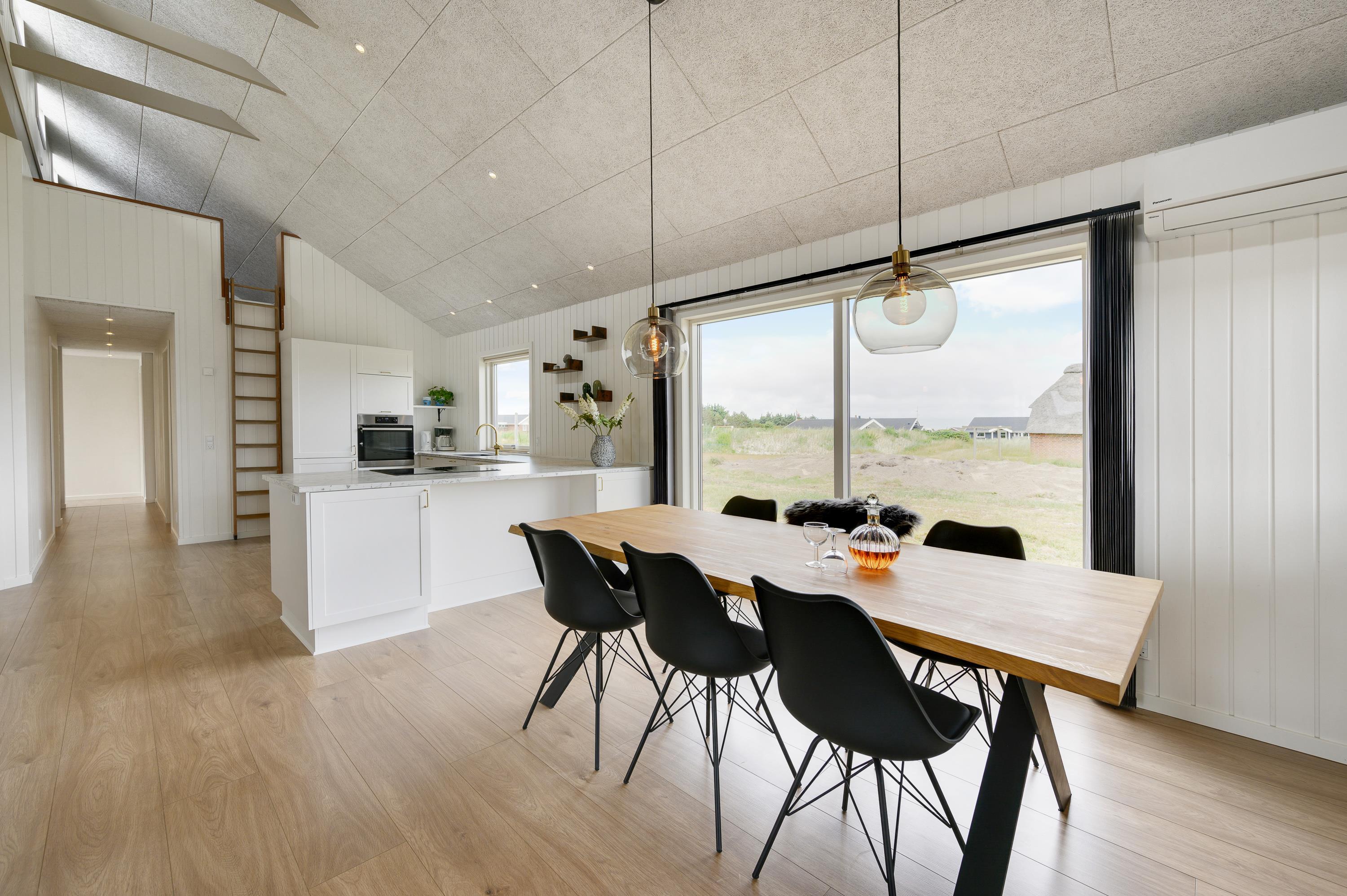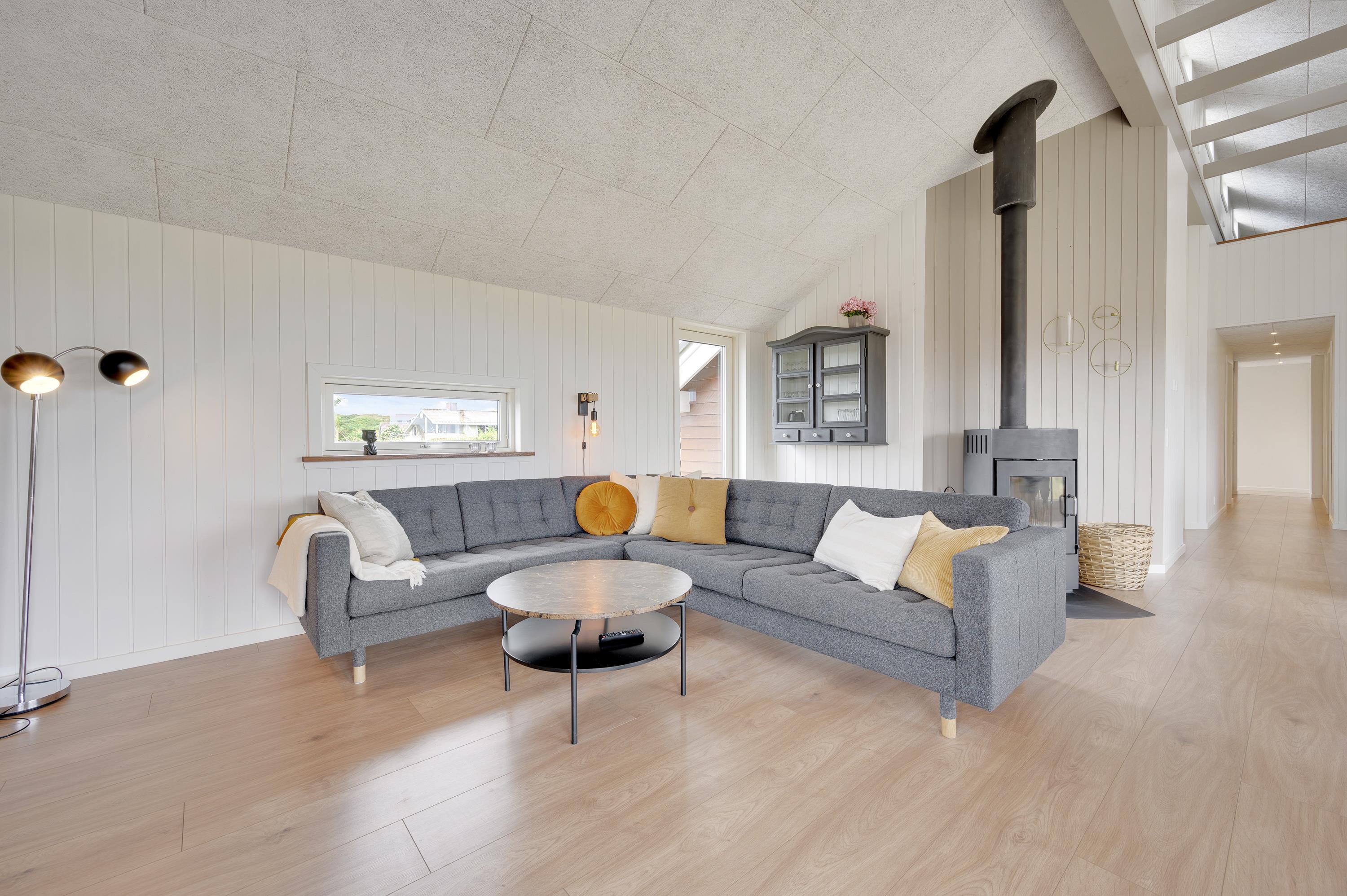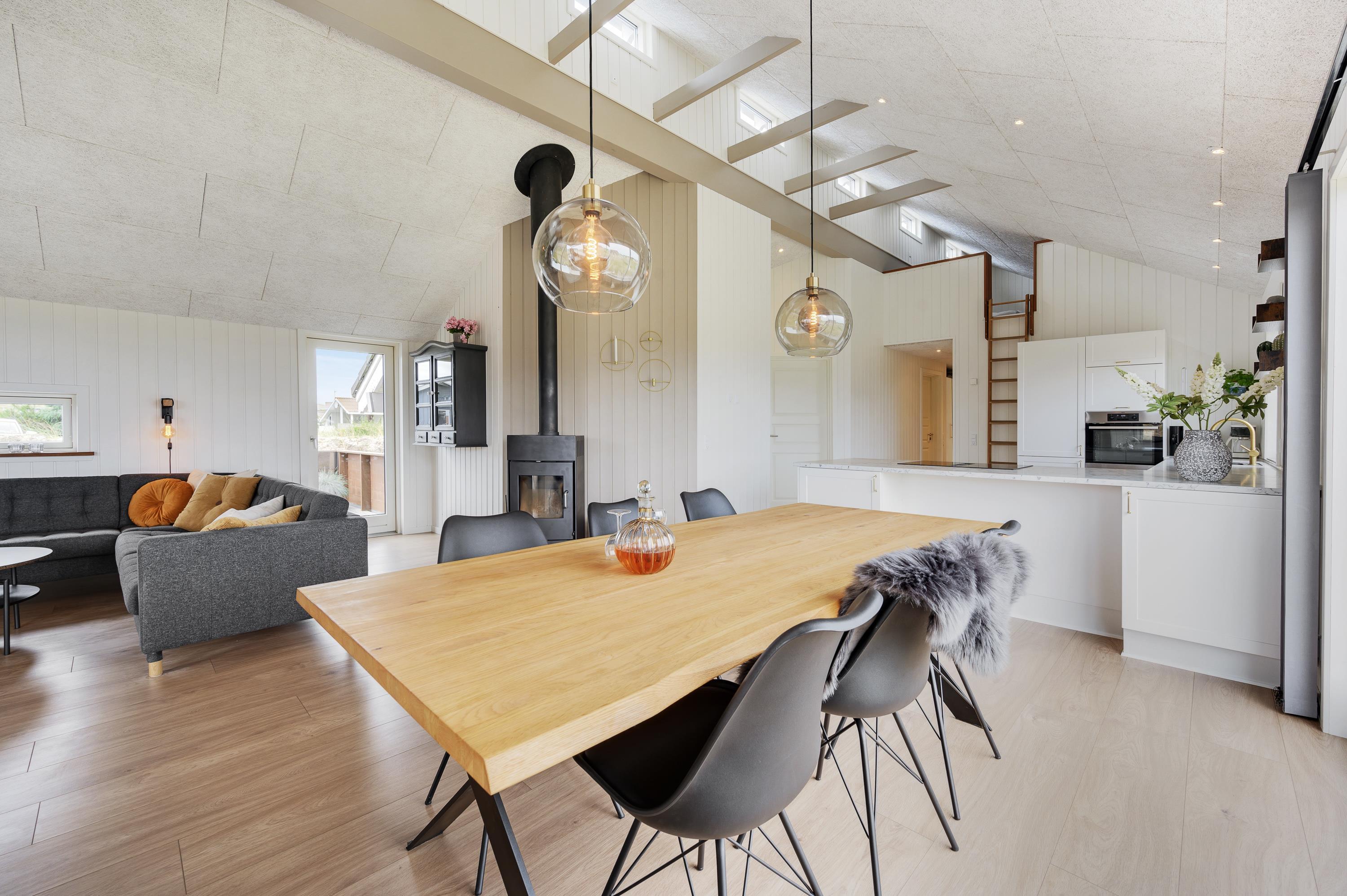 I sommerhusets opholdsrum, som består af stue, køkken og spiseplads i ét, er der mulighed for at slappe af i sofahjørnet, mens der laves mad i køkkenet. Rummet er særdeles indbydende, og de store vinduespartier skaber et fantastisk lysindfald. På en kold efterårsaften kan I tænde op i brændeovnen, som både spreder varme og hyggelig feriestemning. I kan også bruge den energibesparende varmepumpe til at holde en god temperatur i rummet.