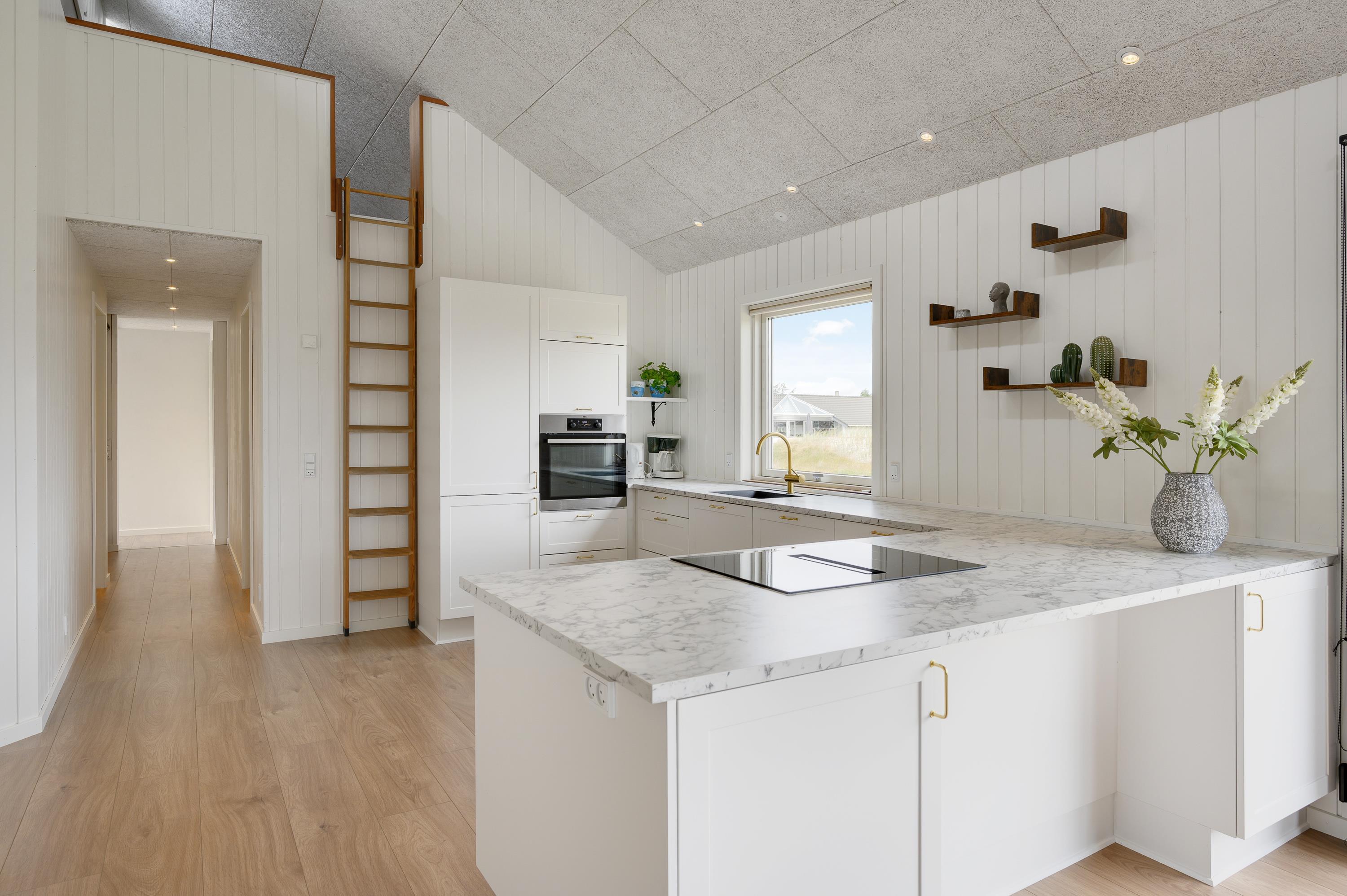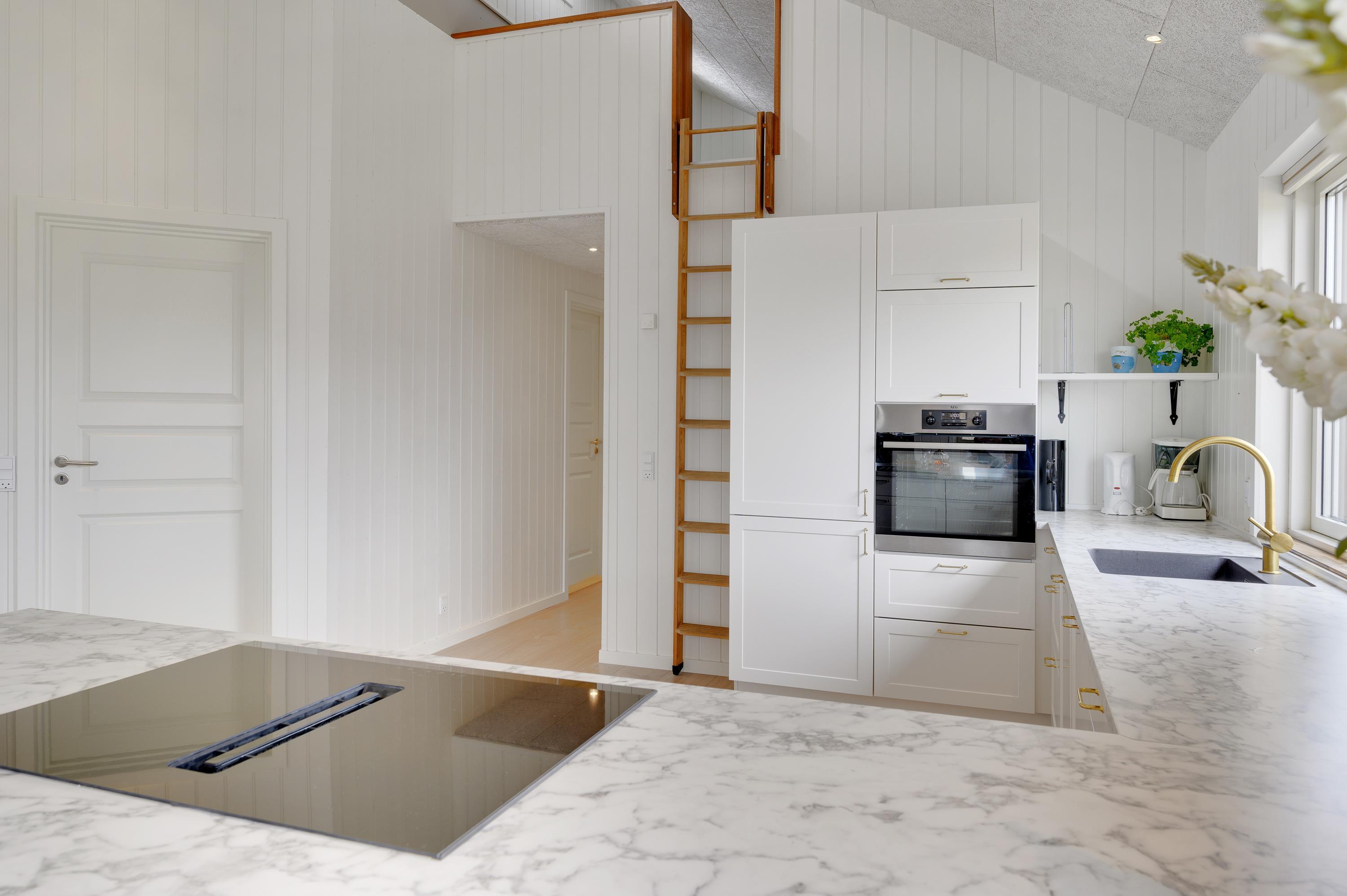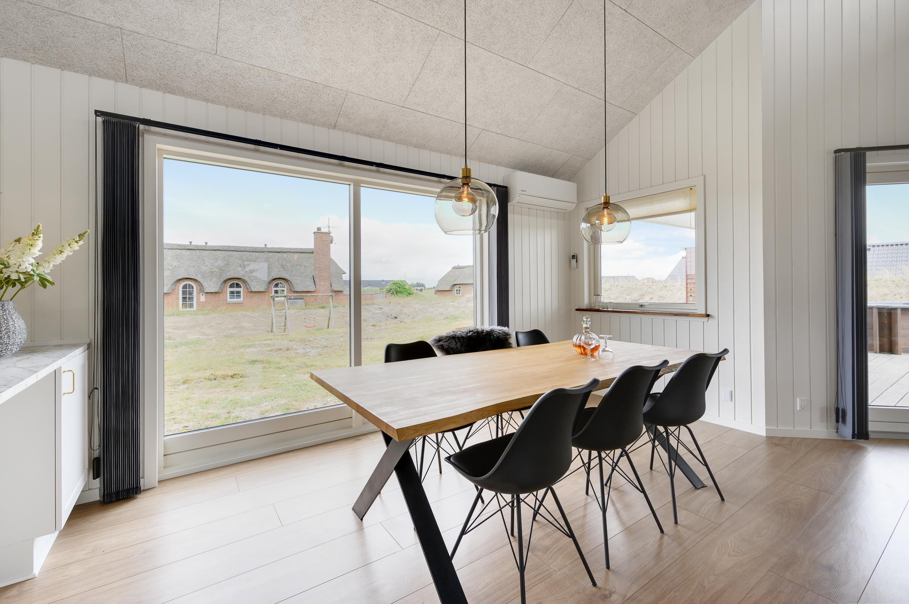 I sommerhusets opholdsrum, som består af stue, køkken og spiseplads i ét, er der mulighed for at slappe af i sofahjørnet, mens der laves mad i køkkenet. Rummet er særdeles indbydende, og de store vinduespartier skaber et fantastisk lysindfald. På en kold efterårsaften kan I tænde op i brændeovnen, som både spreder varme og hyggelig feriestemning. I kan også bruge den energibesparende varmepumpe til at holde en god temperatur i rummet.