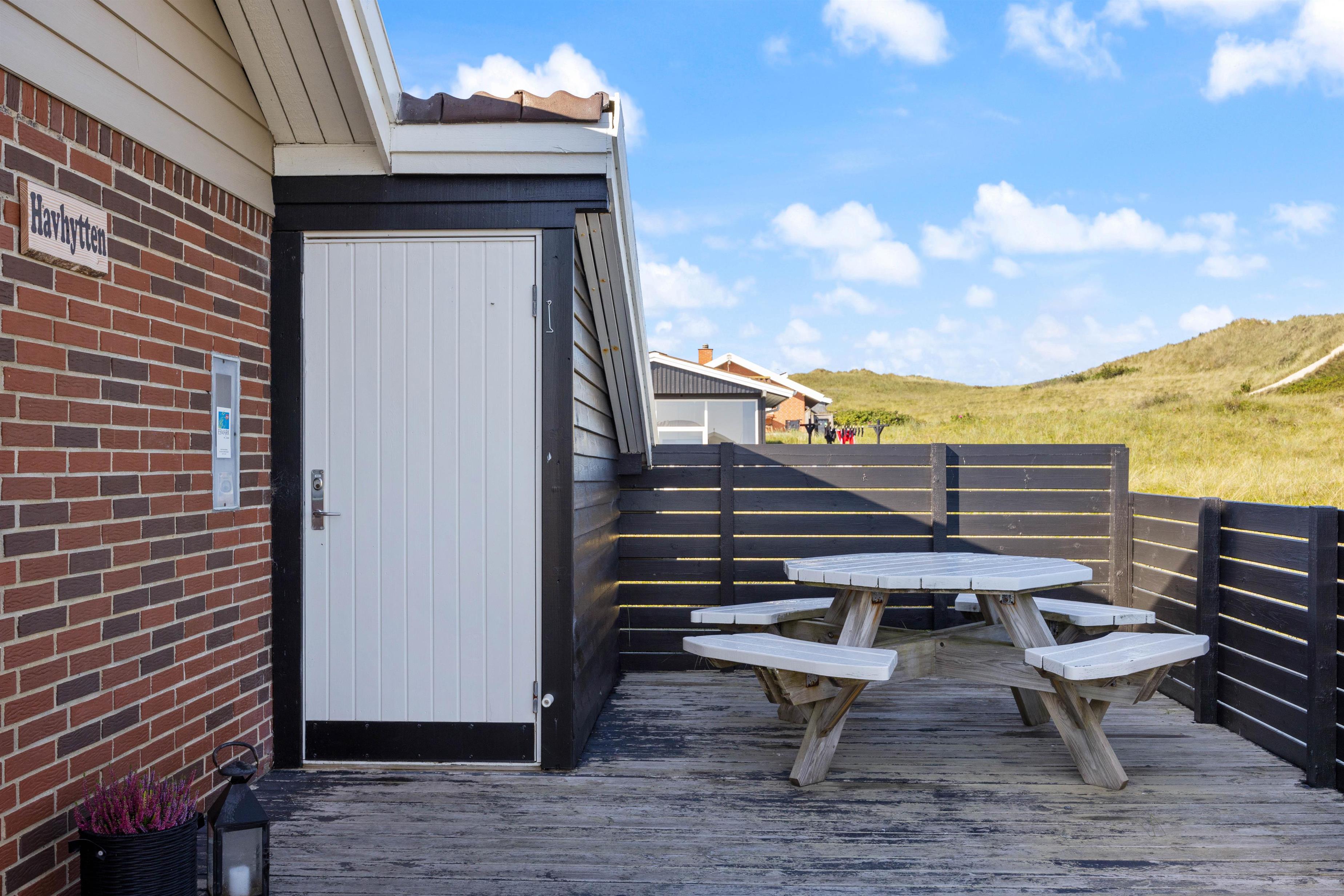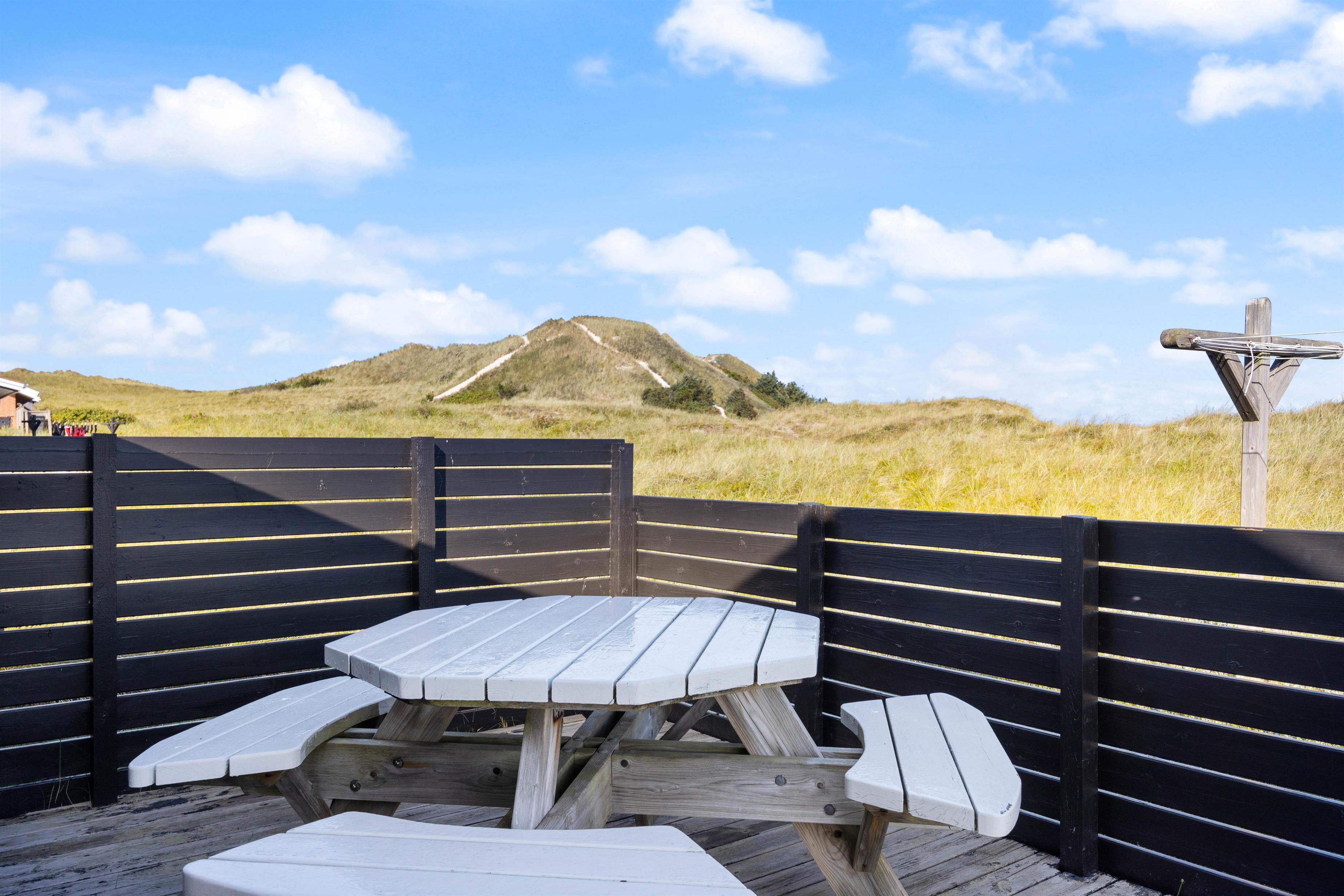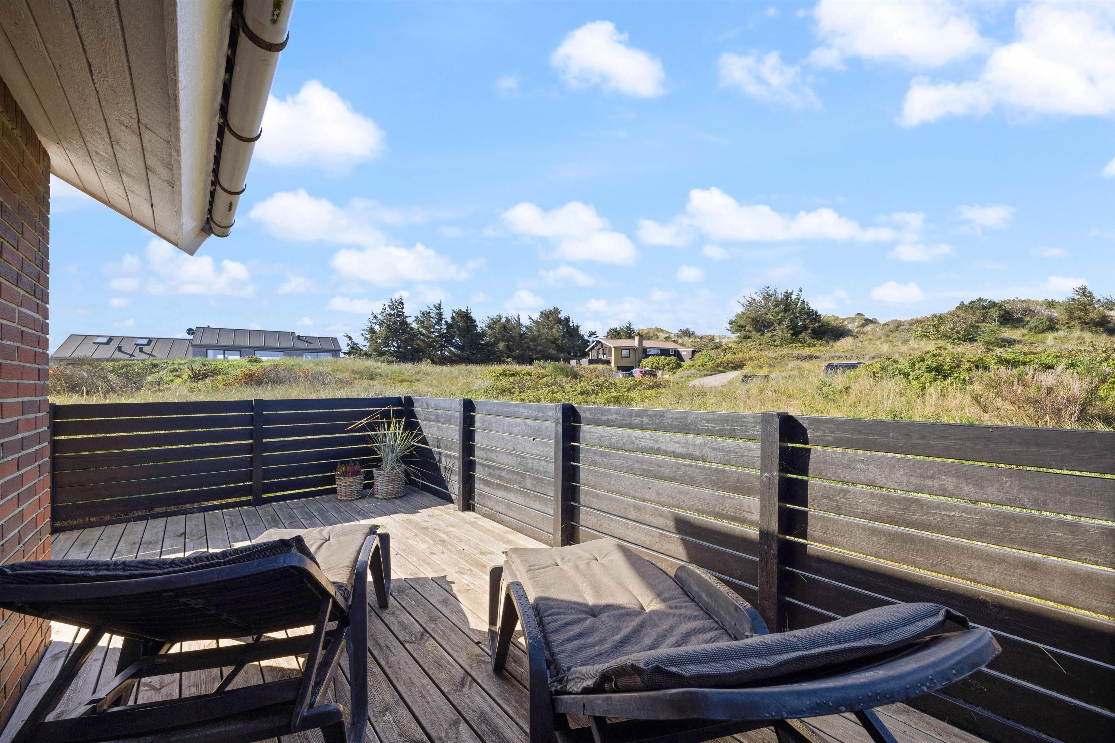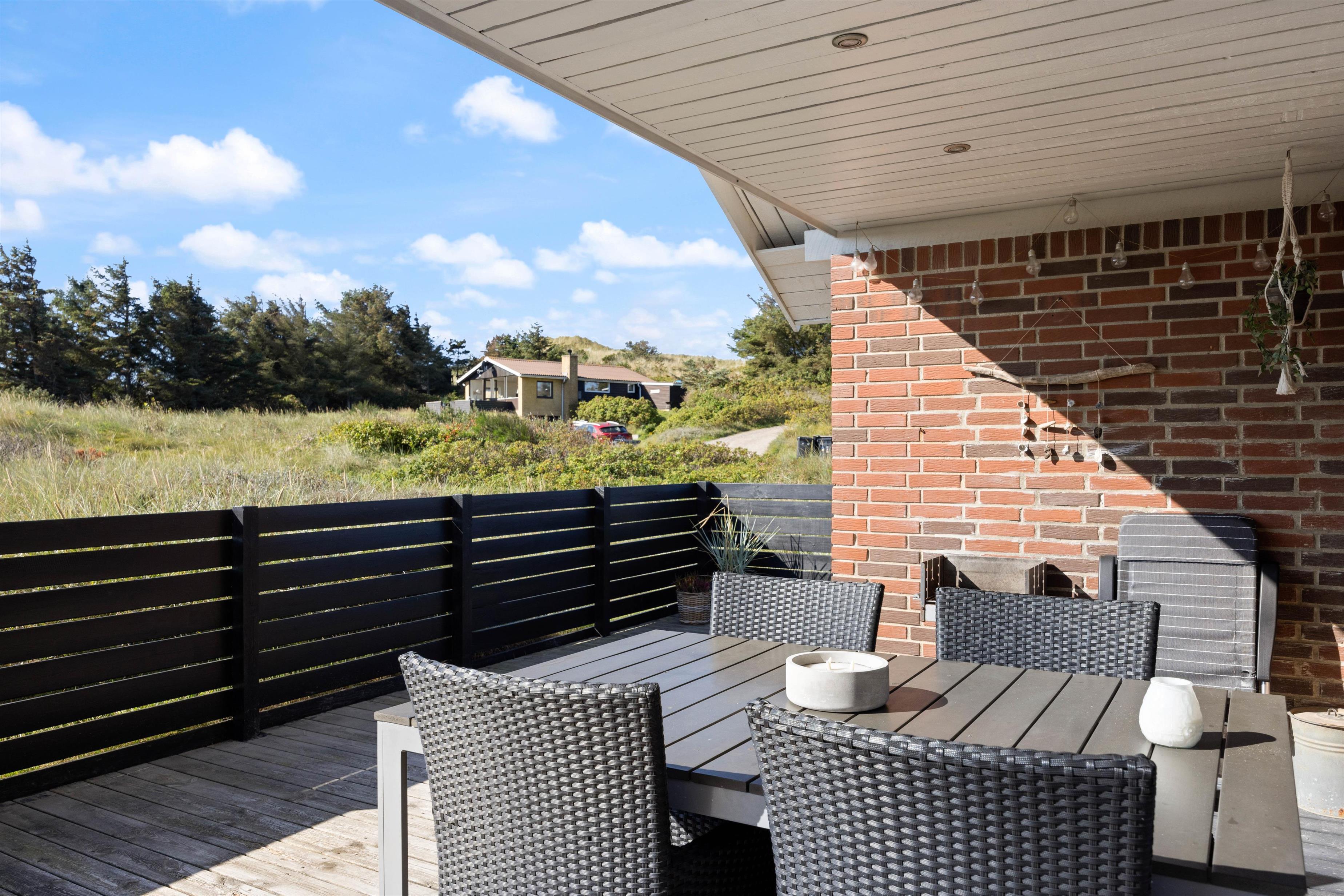 Sommerhuset har 2 gode terrasser, hvoraf den ene er overdækket og helt lukket. Den anden ligger lige ud til klitområdet. Udenfor kan I nyde sol og læ på terrassen, hvor der er gode havemøbler, liggestole samt grill og er perfekt til hyggelige aftener med lyden af havets brusen i baggrunden.