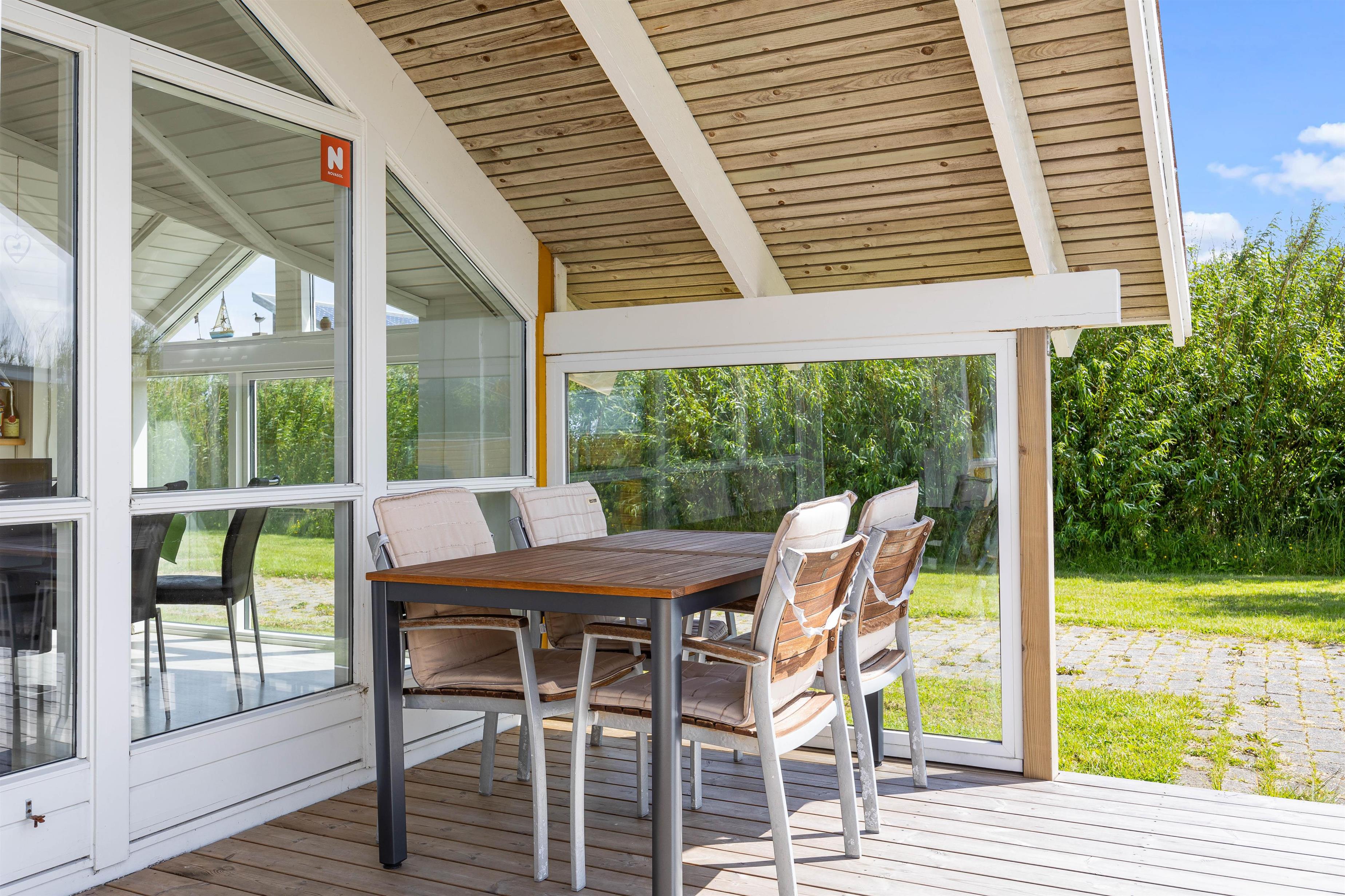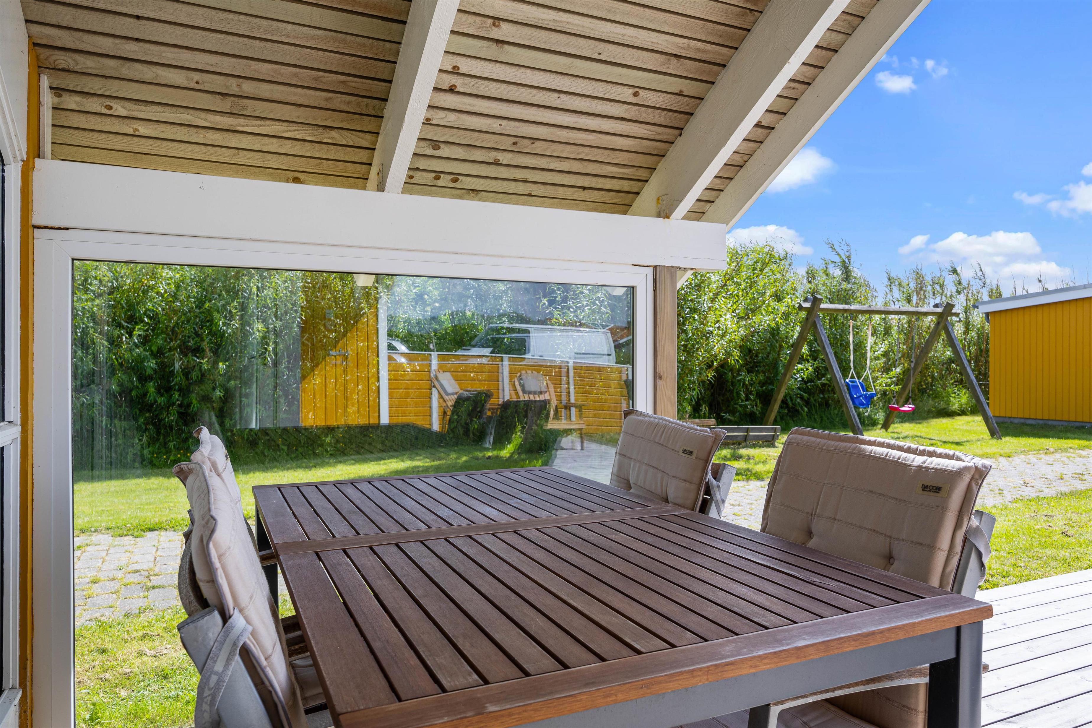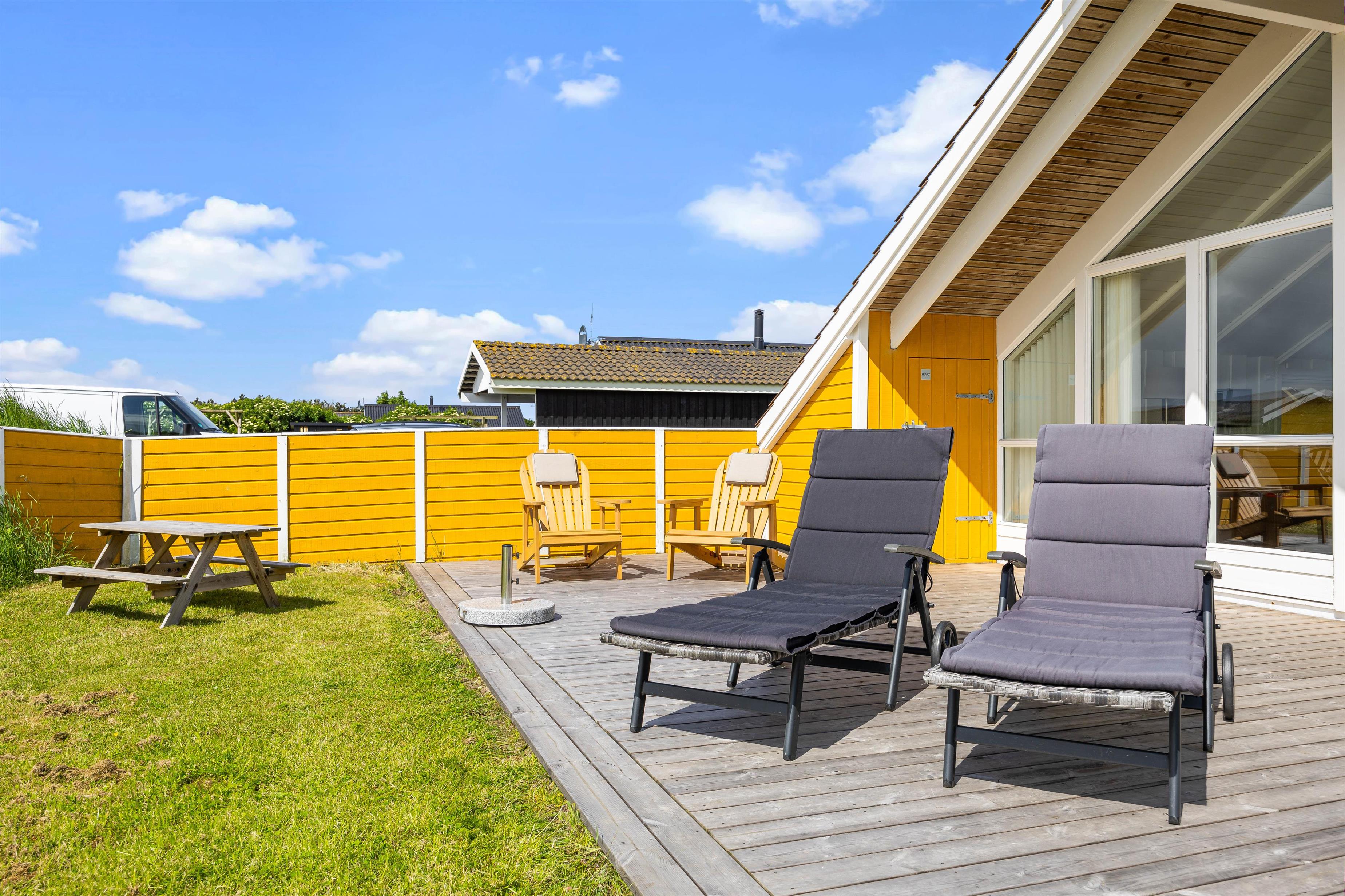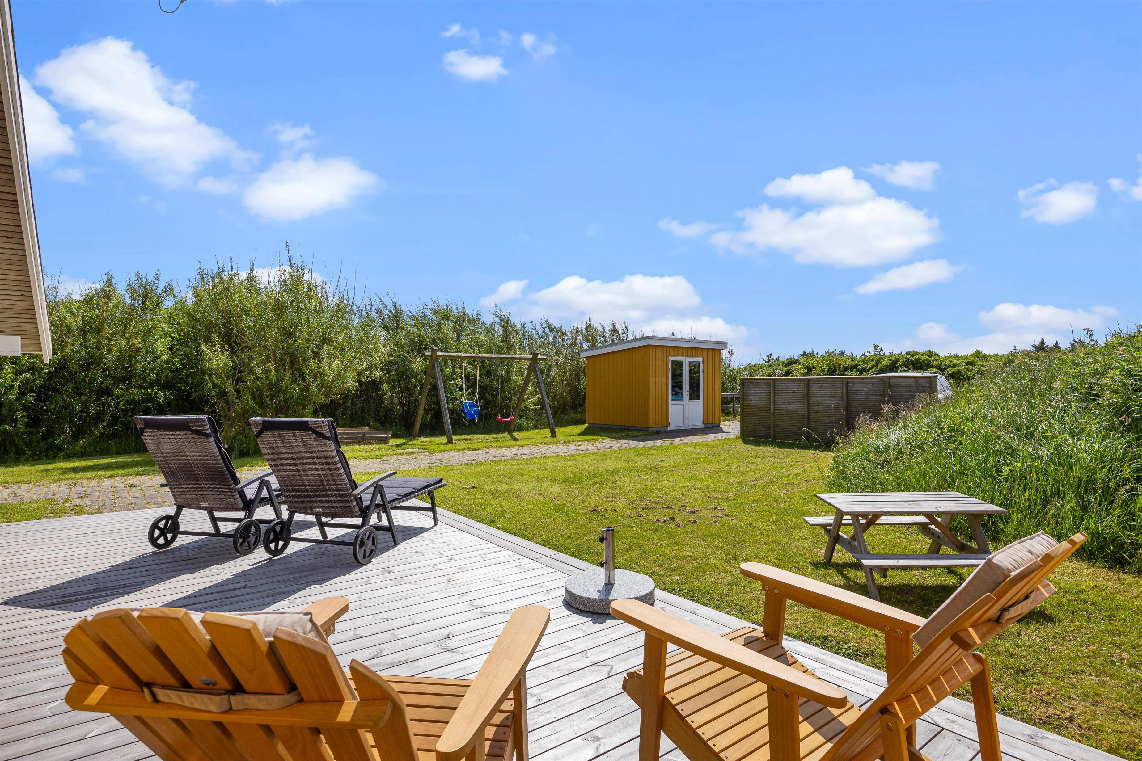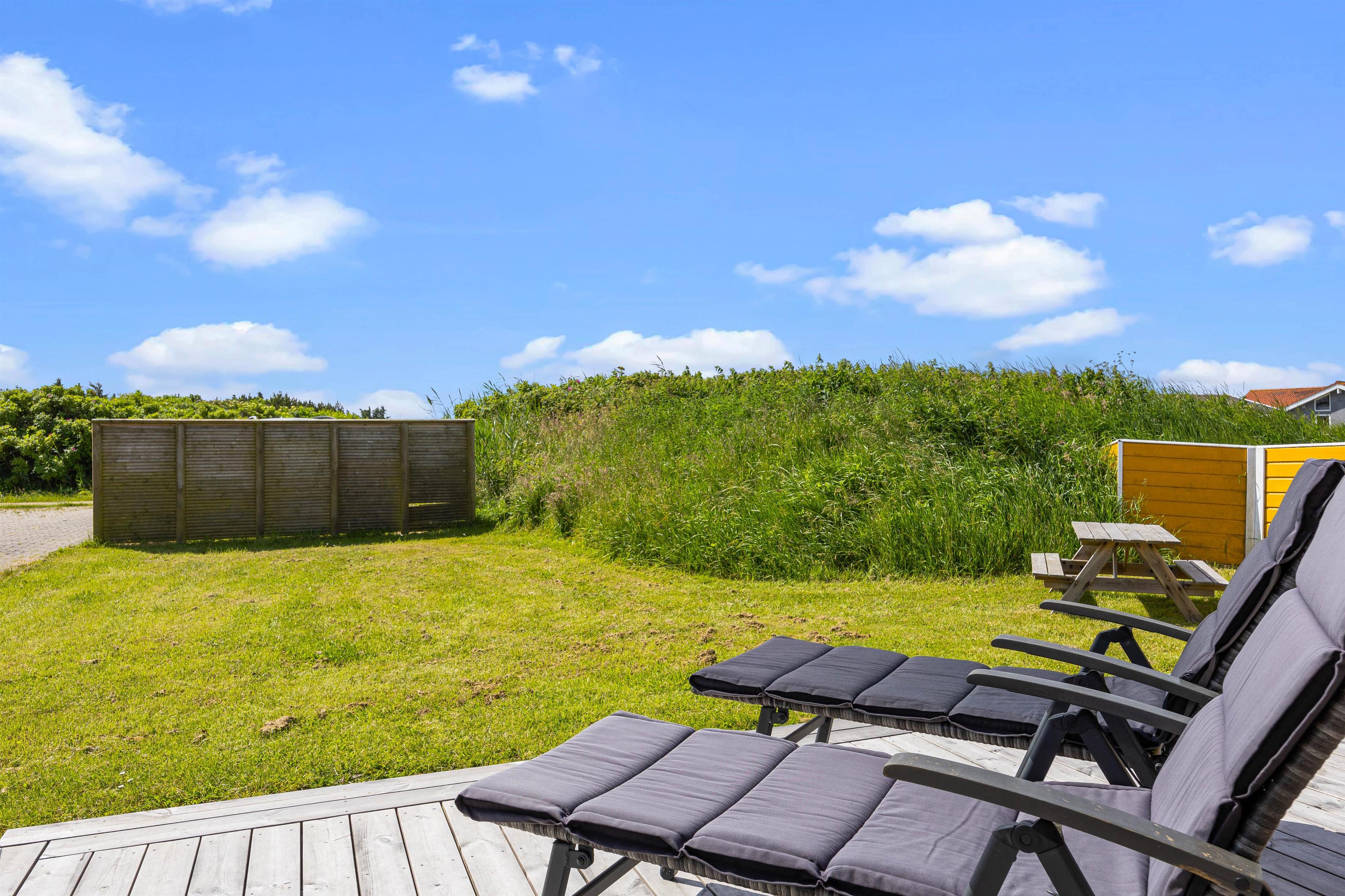 Udenfor kan I nyde roen på den fine terrasse. Her venter havemøbler og liggestole på jer – og der er både mulighed for at finde en plads i solen eller skyggen under overdækningen på terrassen. Nyd den salte vind og skønne udsigt over de brede enge til Haurvig Kirke og Ringkøbing Fjord.