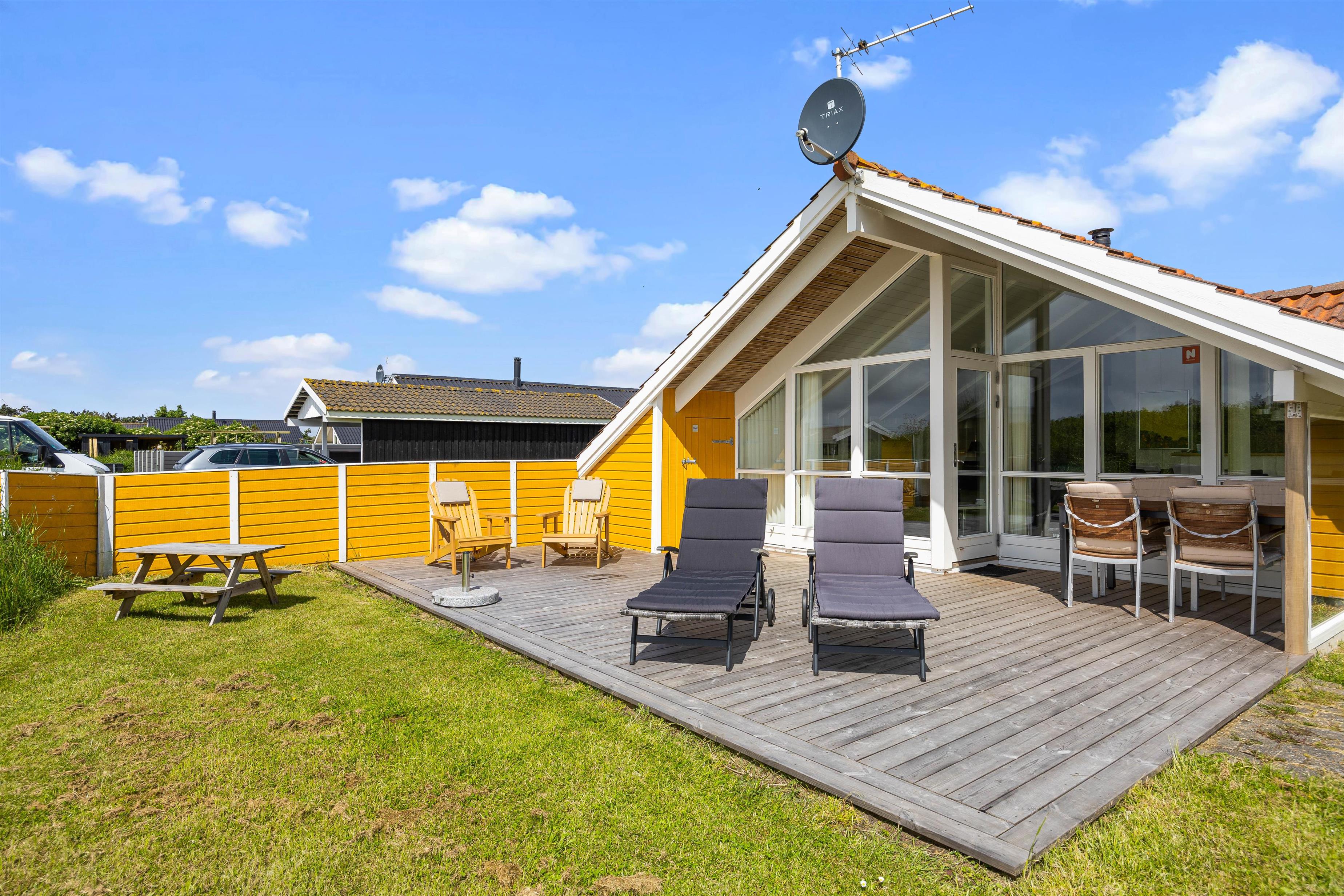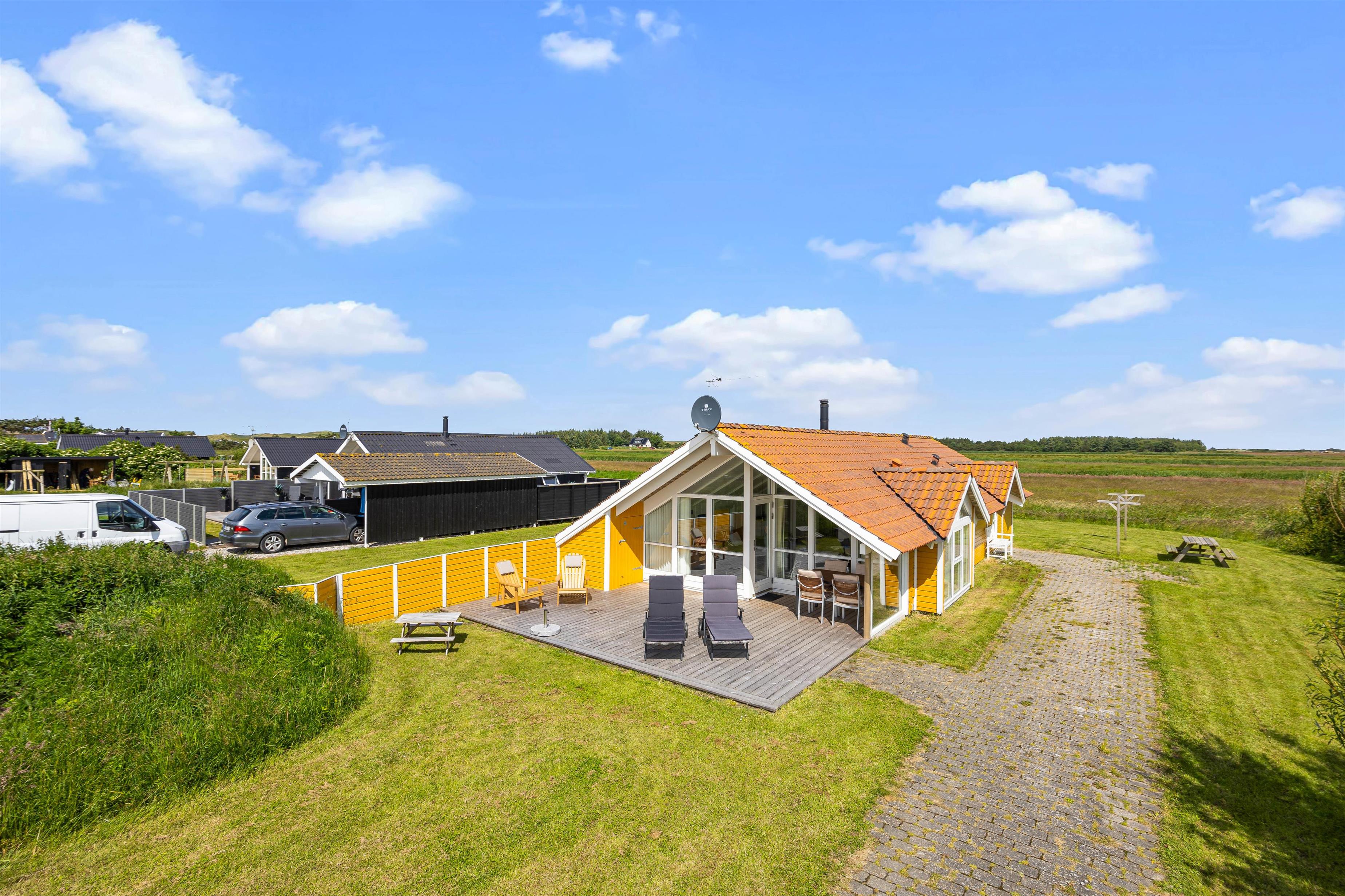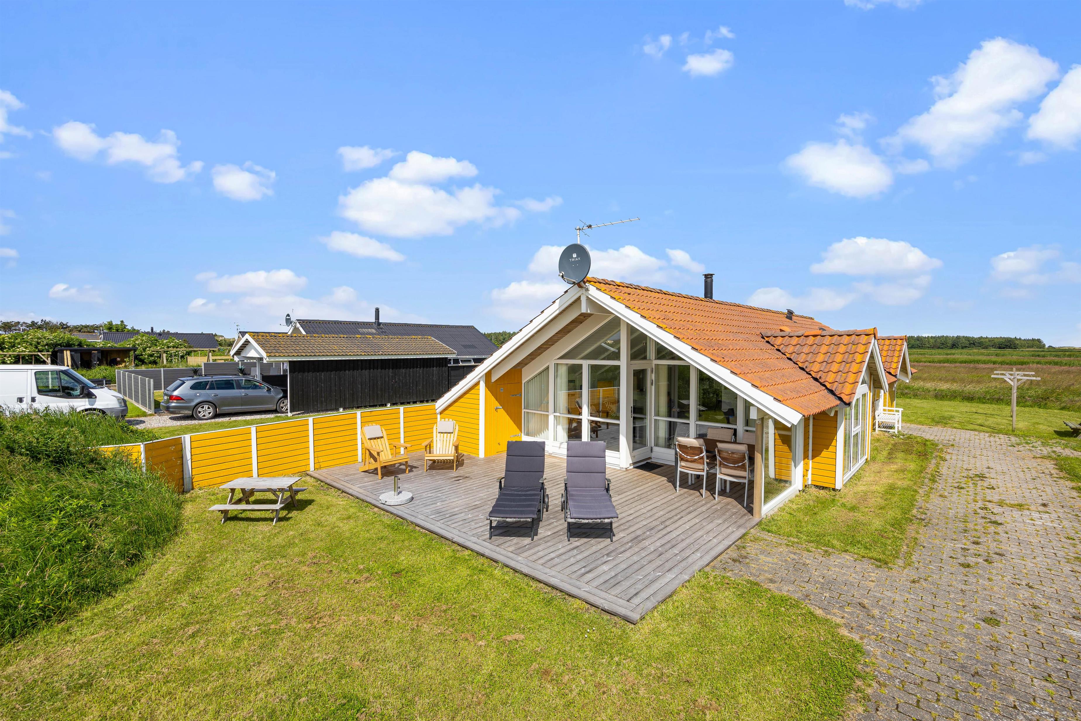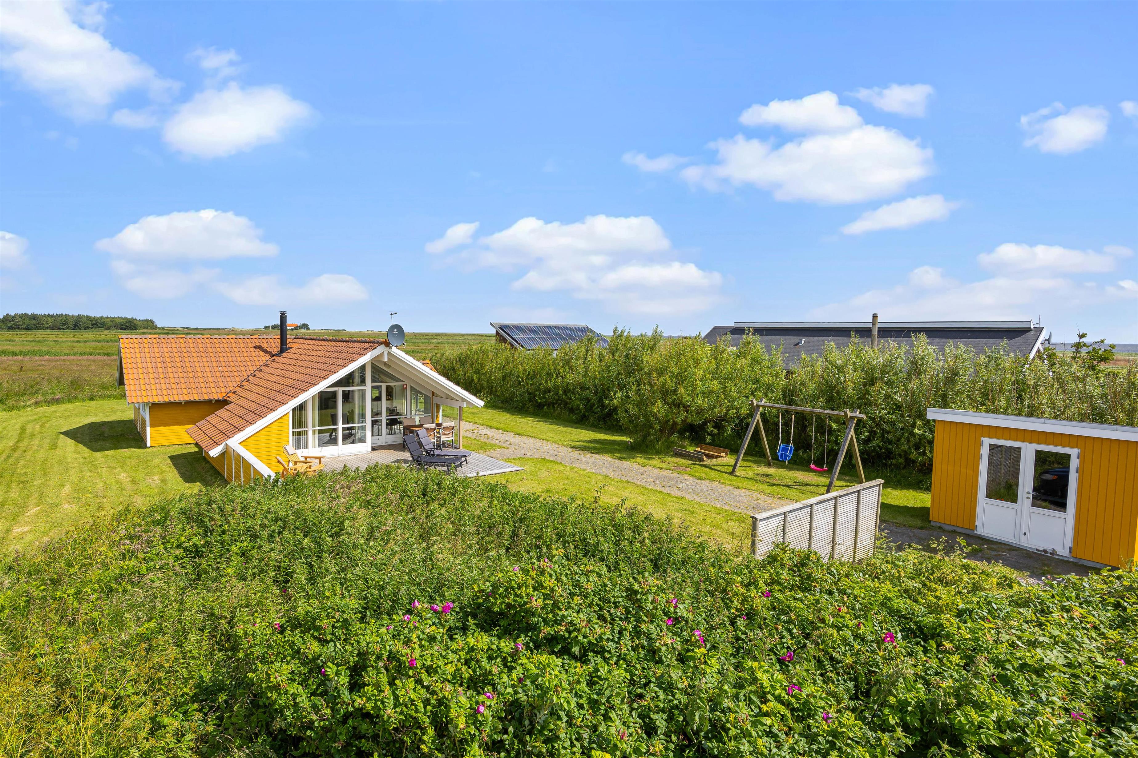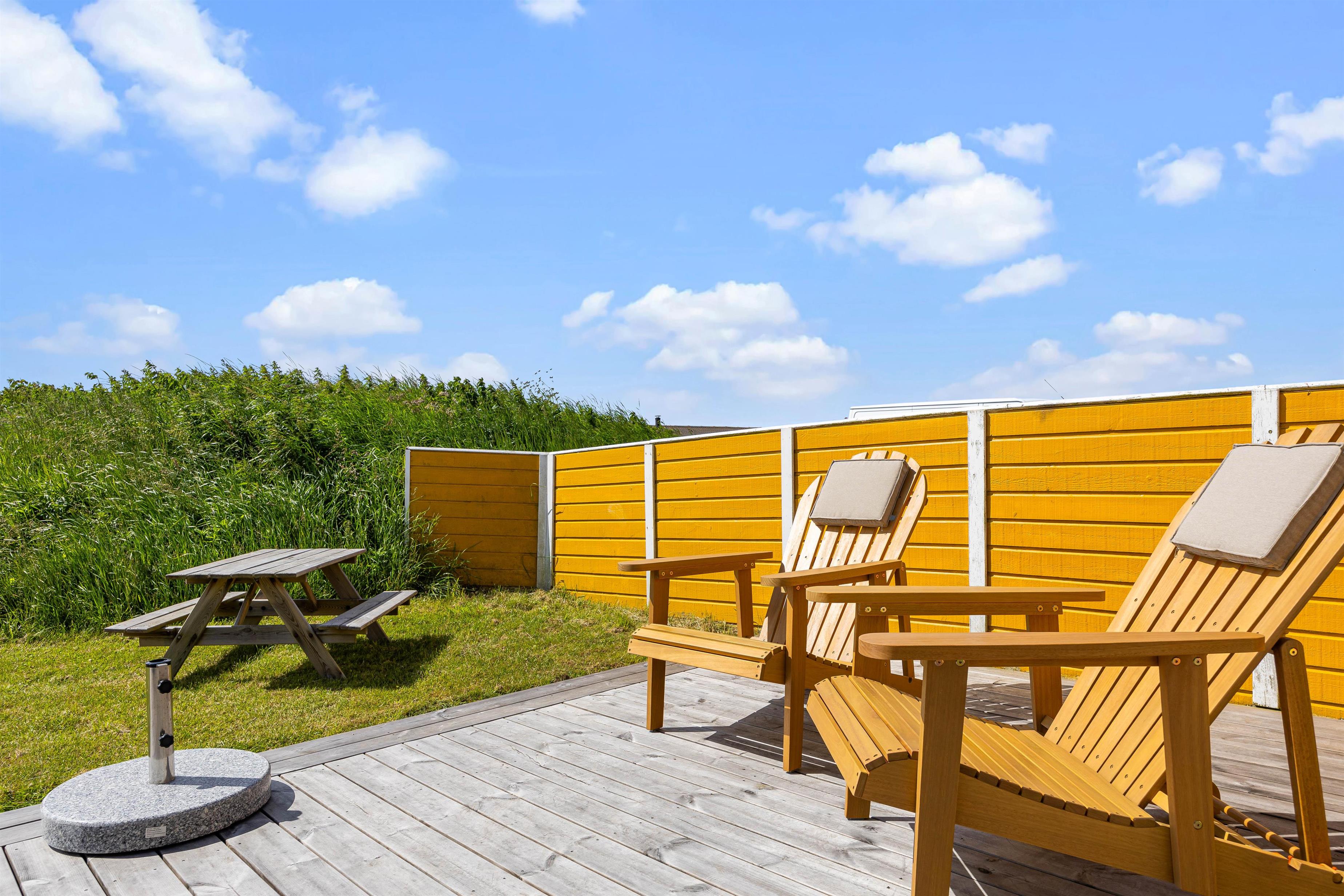 Udenfor kan I nyde roen på den fine terrasse. Her venter havemøbler og liggestole på jer – og der er både mulighed for at finde en plads i solen eller skyggen under overdækningen på terrassen. Nyd den salte vind og skønne udsigt over de brede enge til Haurvig Kirke og Ringkøbing Fjord.