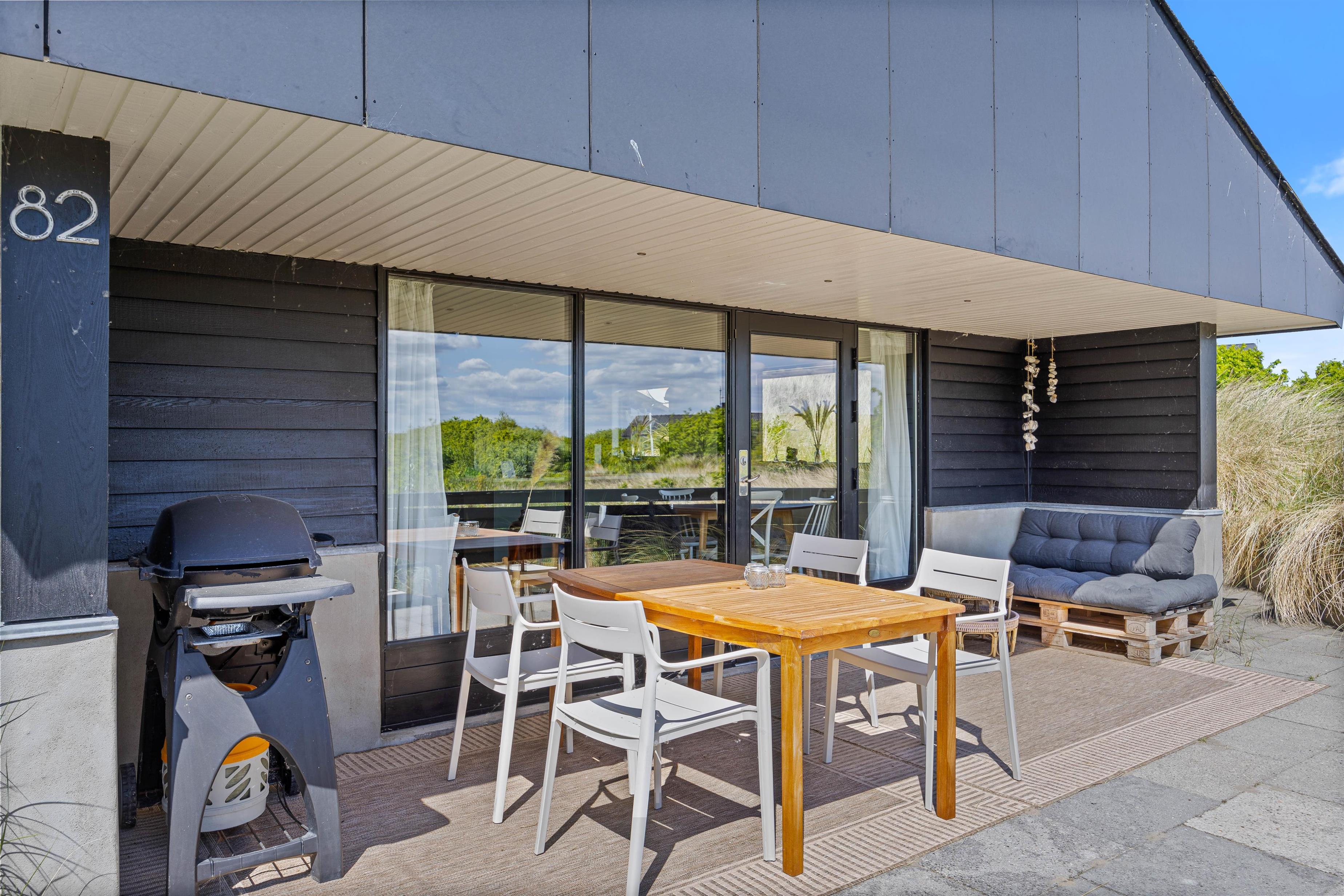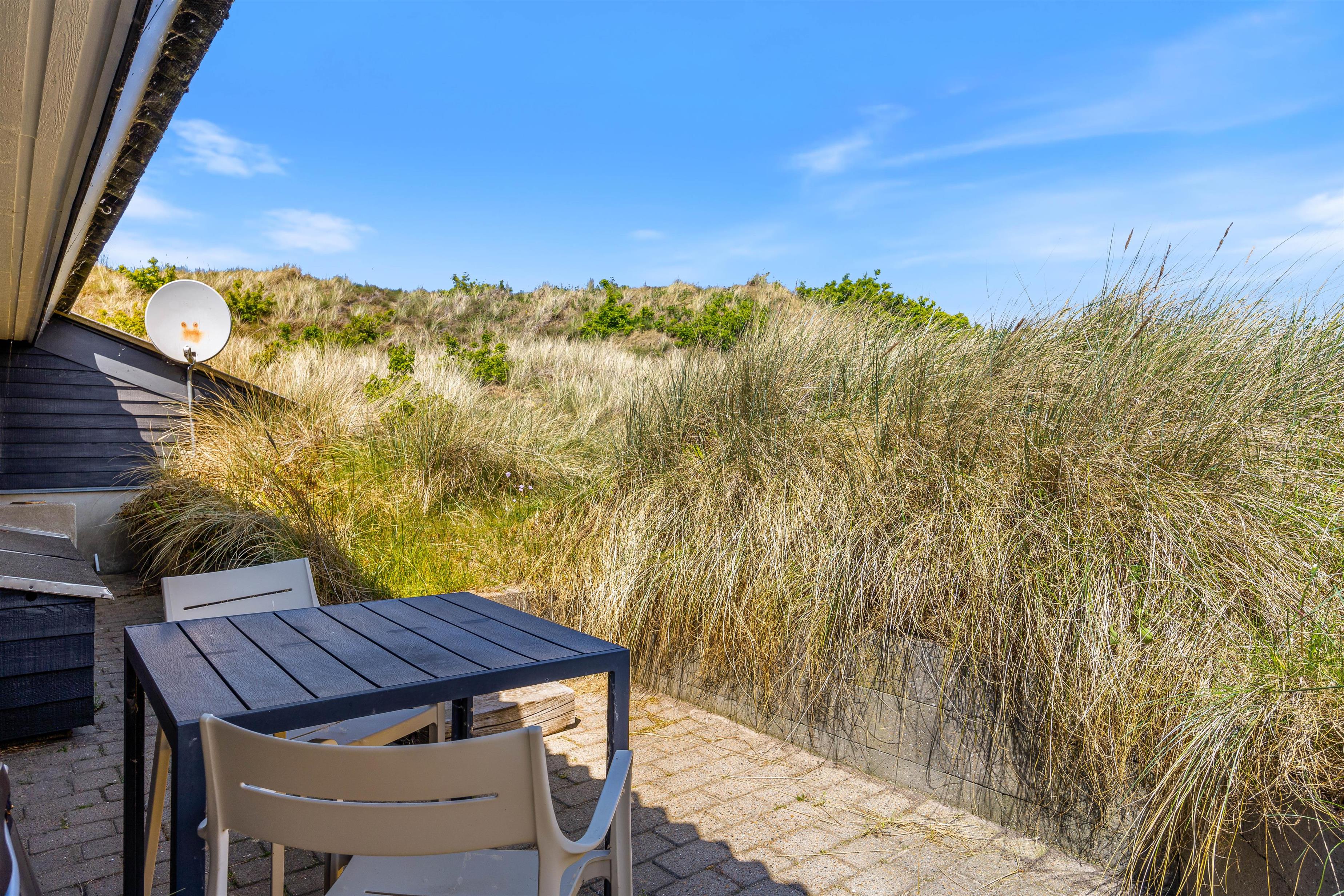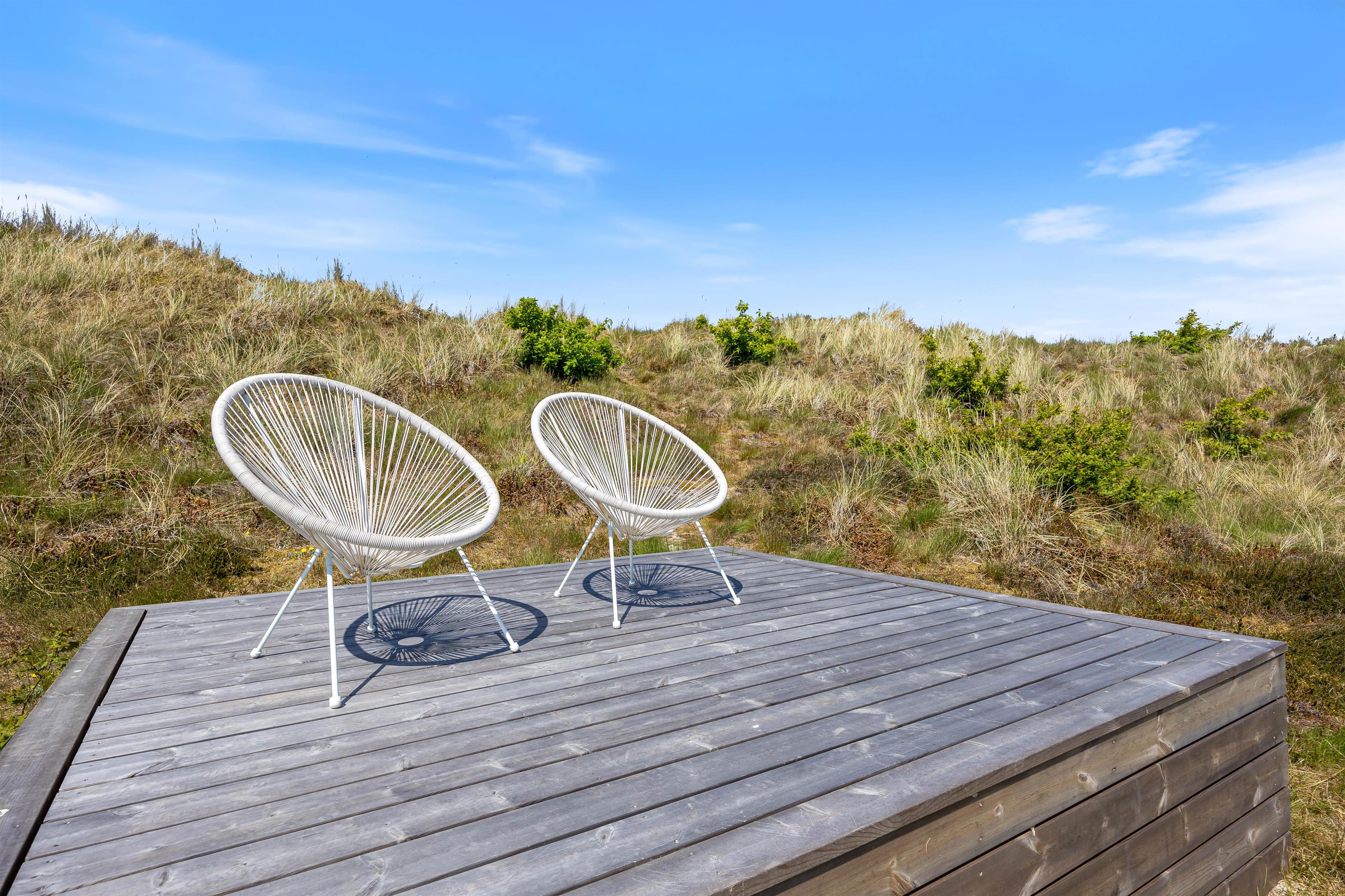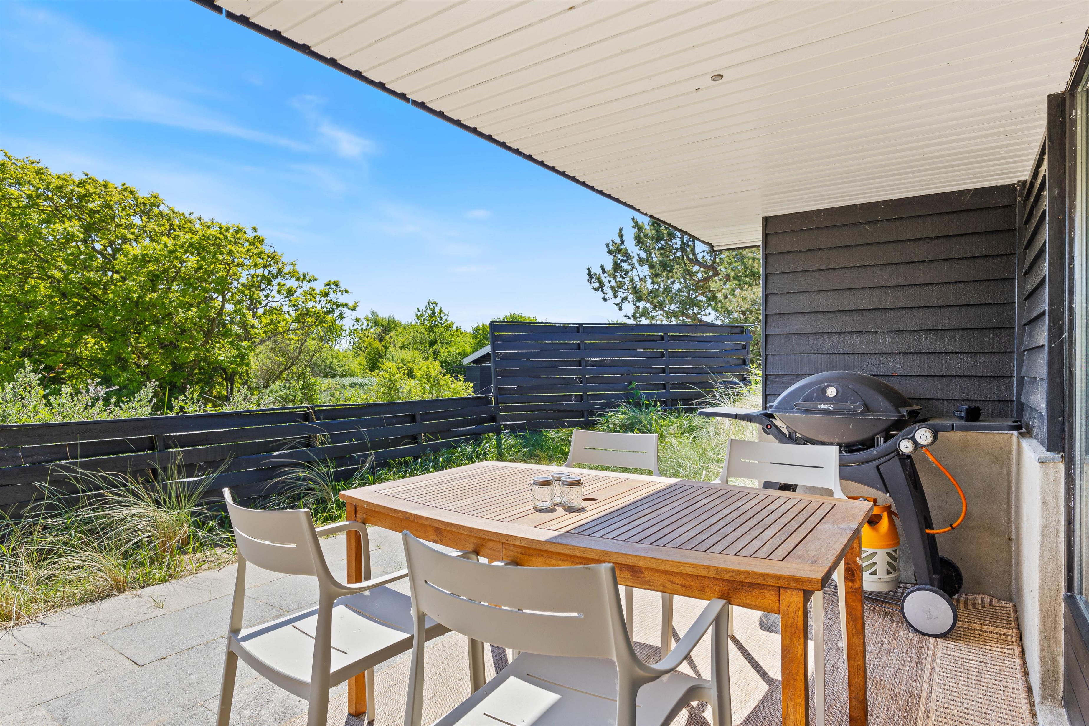 Terrassen ved feriehuset har både en åben, en afskærmet og en overdækket del, så I kan flytte rundt efter solens placering på himlen, og alligevel føle jer private. Tag solbad på liggestolene, eller slap af i de komfortable havemøbler. Du kan altid finde en rolig plet, hvor du kan trække dig tilbage med en god bog og en kop te. Lad børnene gå på opdagelse på naturgrunden og arrangér eventuelt et spil viking. Tænd op i gasgrillen til aften og nyd et lækkert grillmåltid sammen, imens skyggerne bliver lange. Efter maden kan I vandre en tur til Vesterhavet og opleve den imponerende solnedgang.