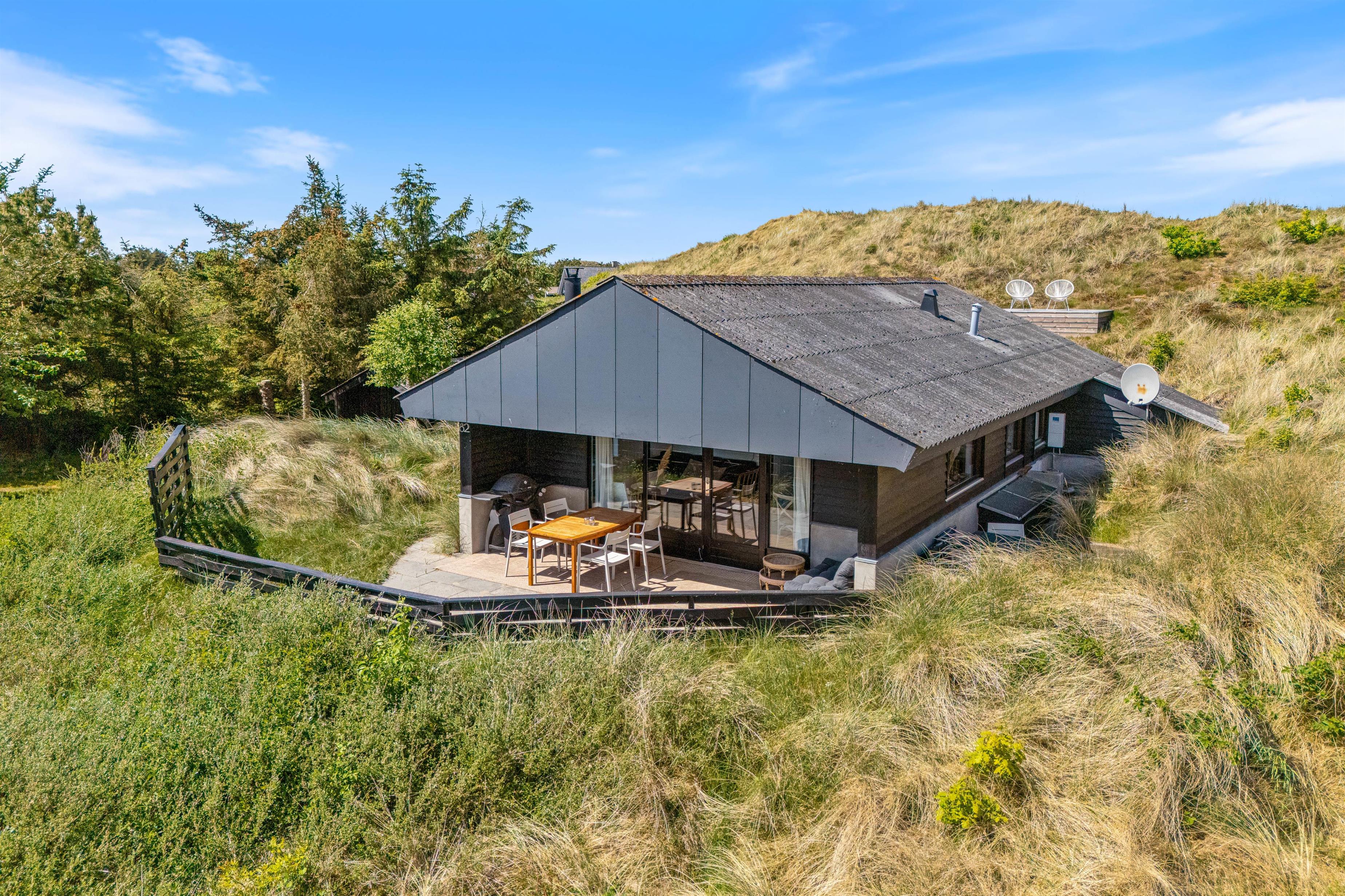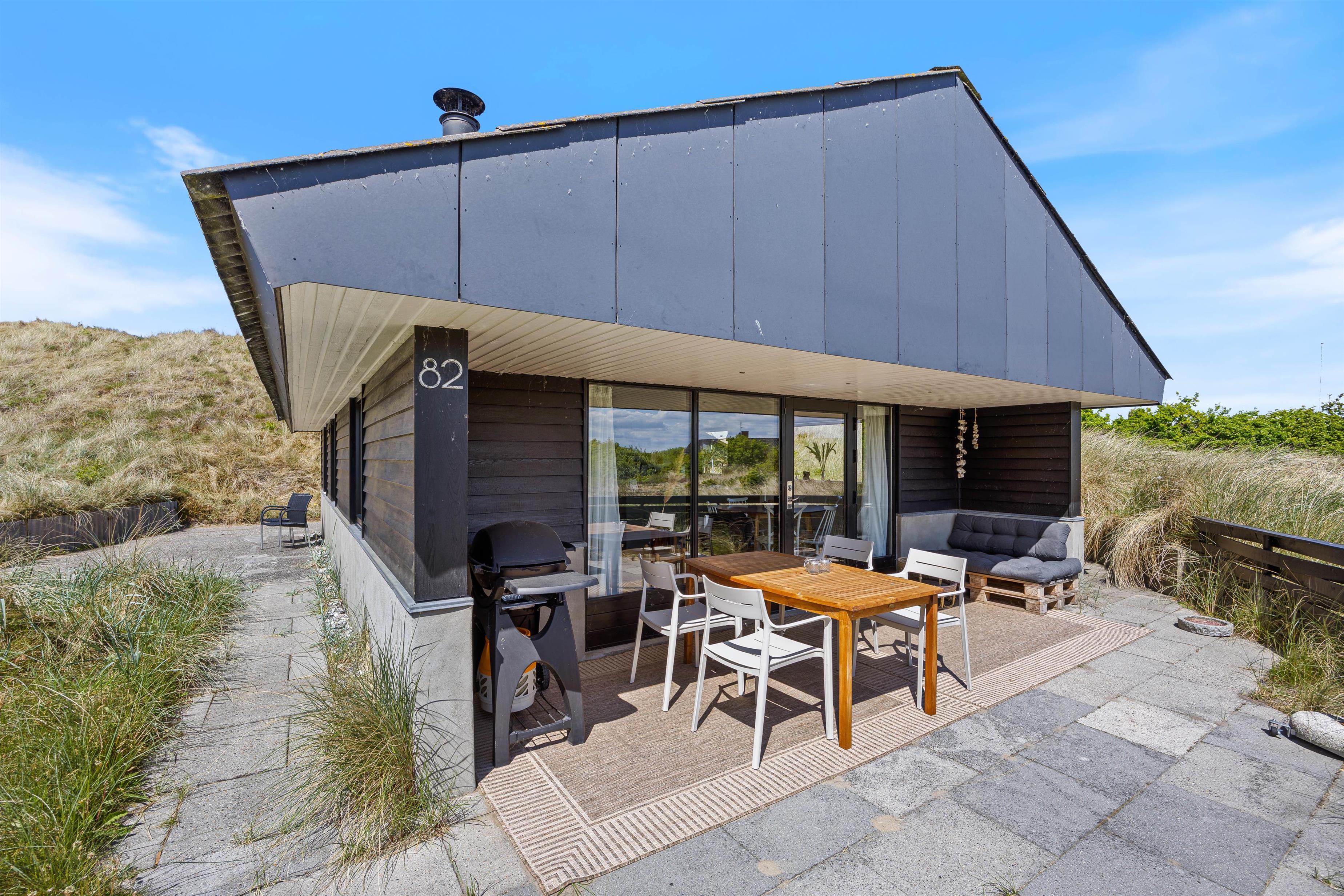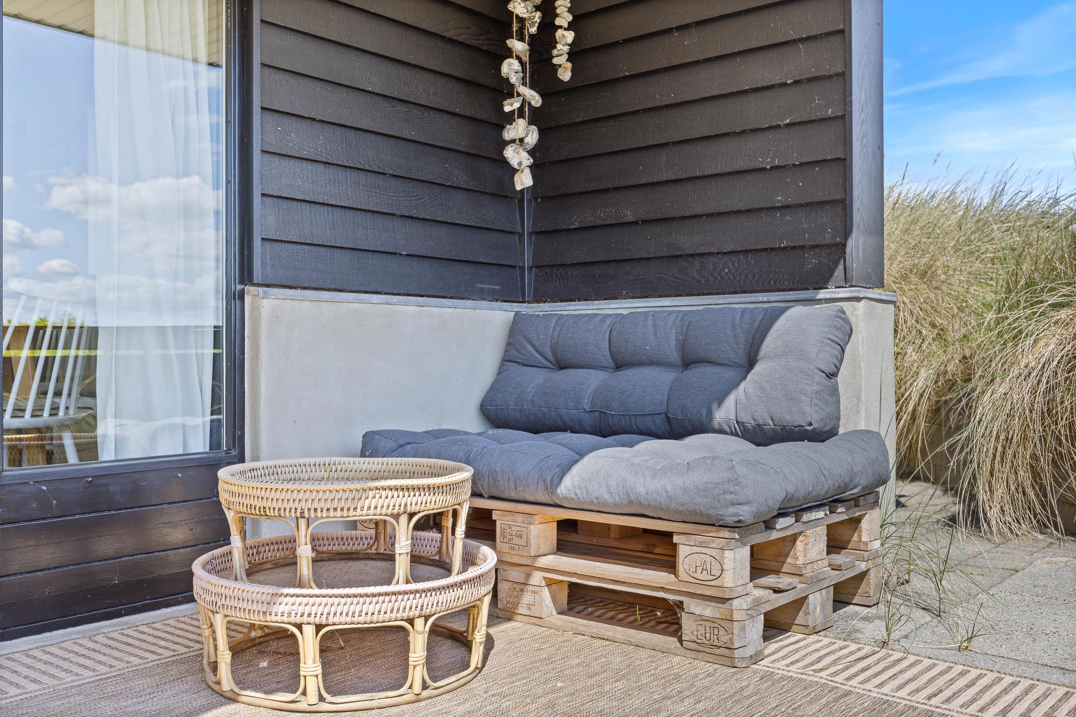 Terrassen ved feriehuset har både en åben, en afskærmet og en overdækket del, så I kan flytte rundt efter solens placering på himlen, og alligevel føle jer private. Tag solbad på liggestolene, eller slap af i de komfortable havemøbler. Du kan altid finde en rolig plet, hvor du kan trække dig tilbage med en god bog og en kop te. Lad børnene gå på opdagelse på naturgrunden og arrangér eventuelt et spil viking. Tænd op i gasgrillen til aften og nyd et lækkert grillmåltid sammen, imens skyggerne bliver lange. Efter maden kan I vandre en tur til Vesterhavet og opleve den imponerende solnedgang.