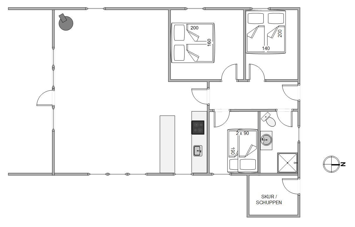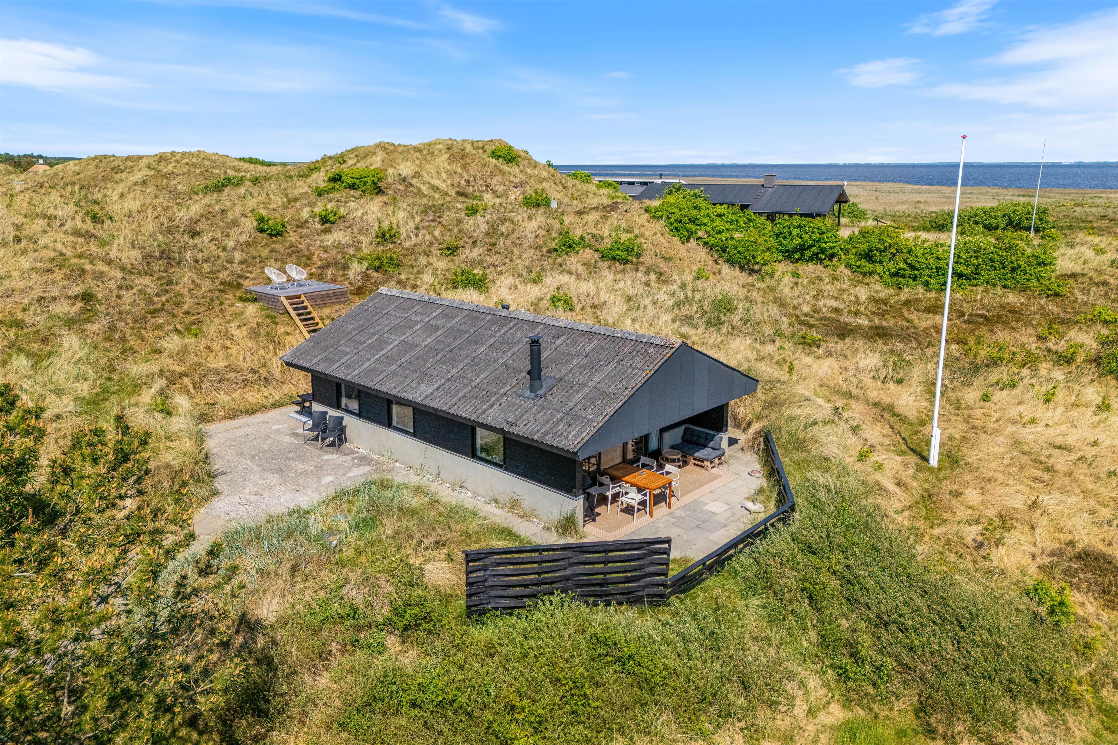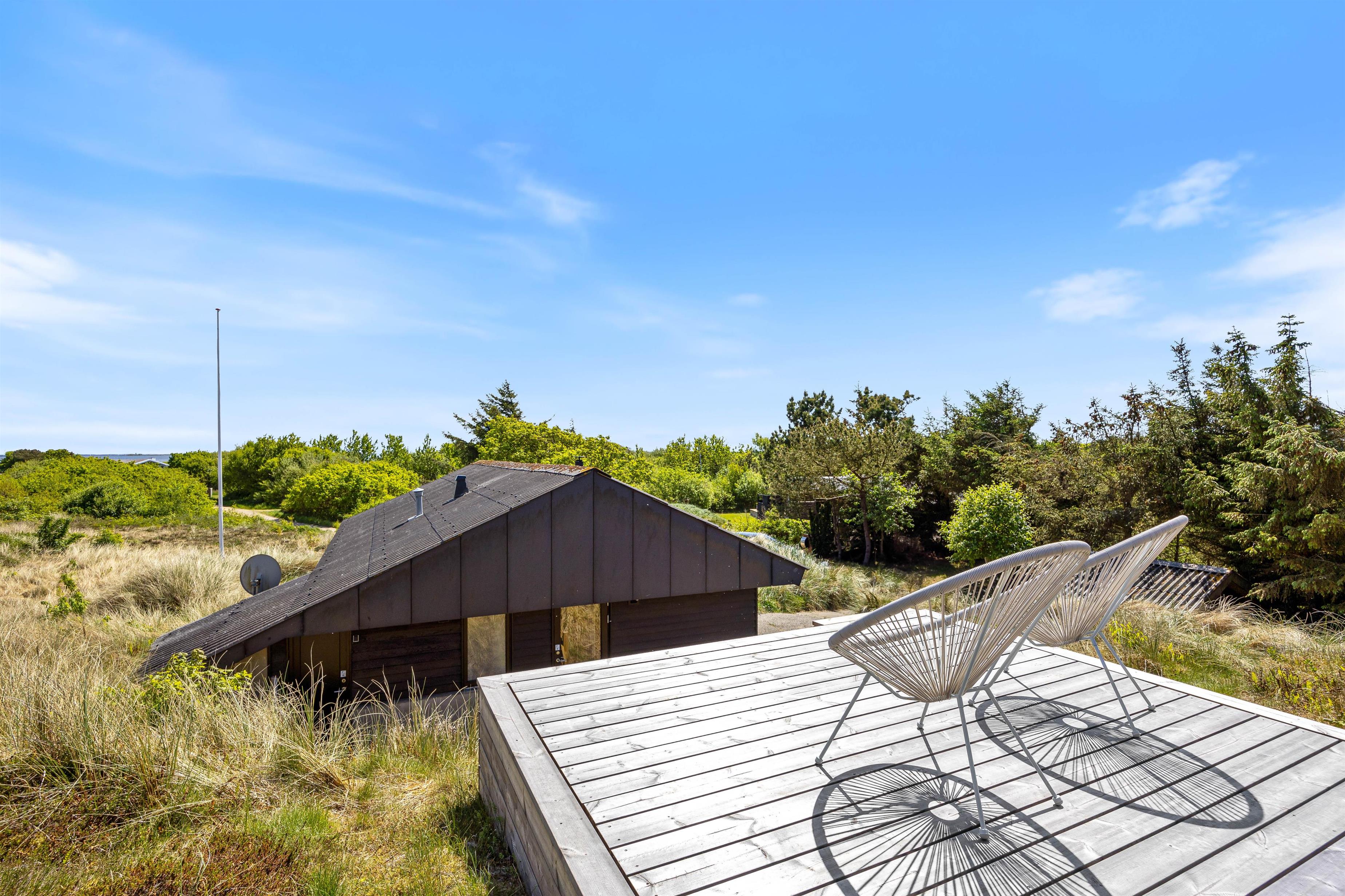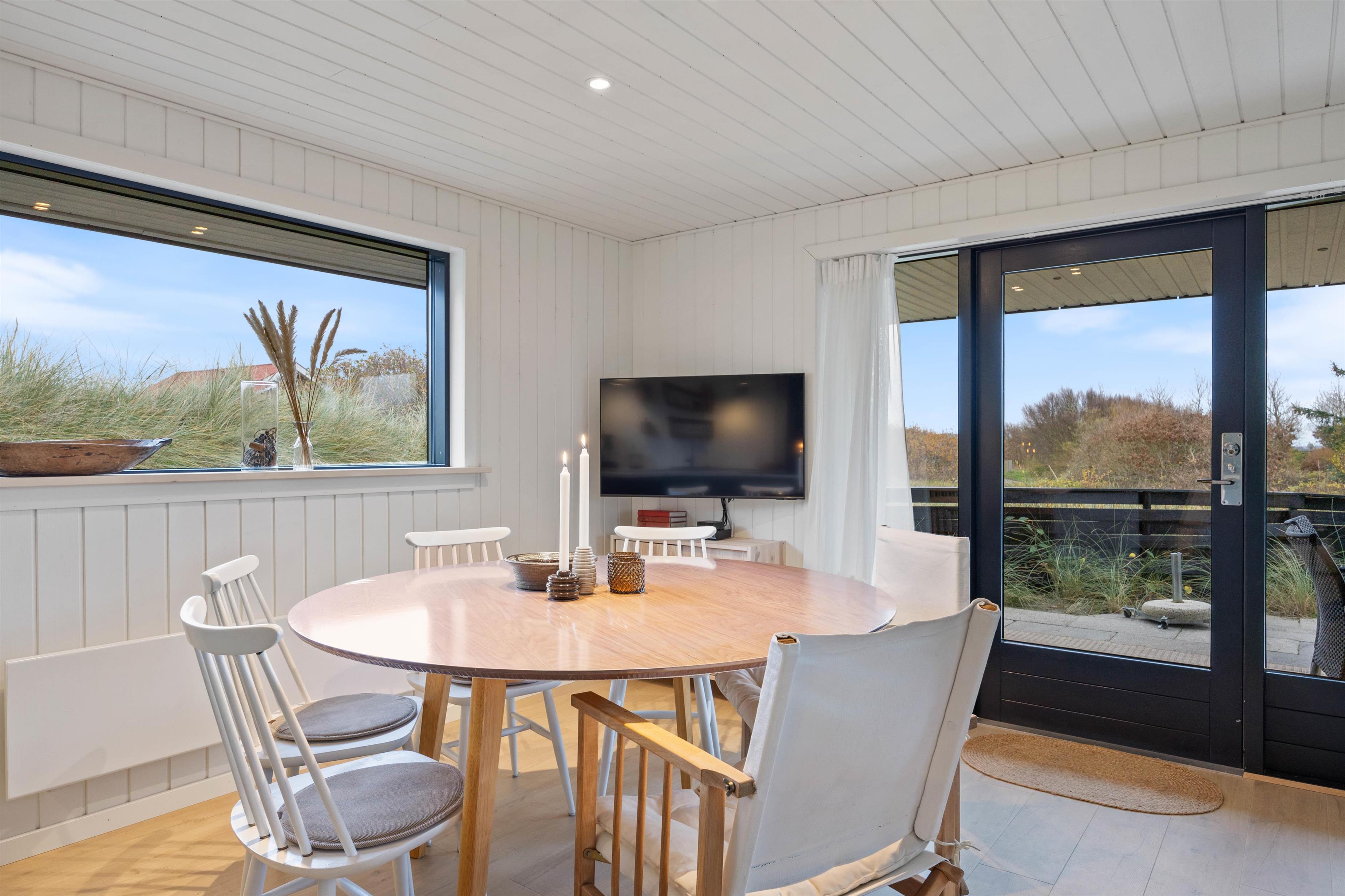 Terrassen ved feriehuset har både en åben, en afskærmet og en overdækket del, så I kan flytte rundt efter solens placering på himlen, og alligevel føle jer private. Tag solbad på liggestolene, eller slap af i de komfortable havemøbler. Du kan altid finde en rolig plet, hvor du kan trække dig tilbage med en god bog og en kop te. Lad børnene gå på opdagelse på naturgrunden og arrangér eventuelt et spil viking. Tænd op i gasgrillen til aften og nyd et lækkert grillmåltid sammen, imens skyggerne bliver lange. Efter maden kan I vandre en tur til Vesterhavet og opleve den imponerende solnedgang.