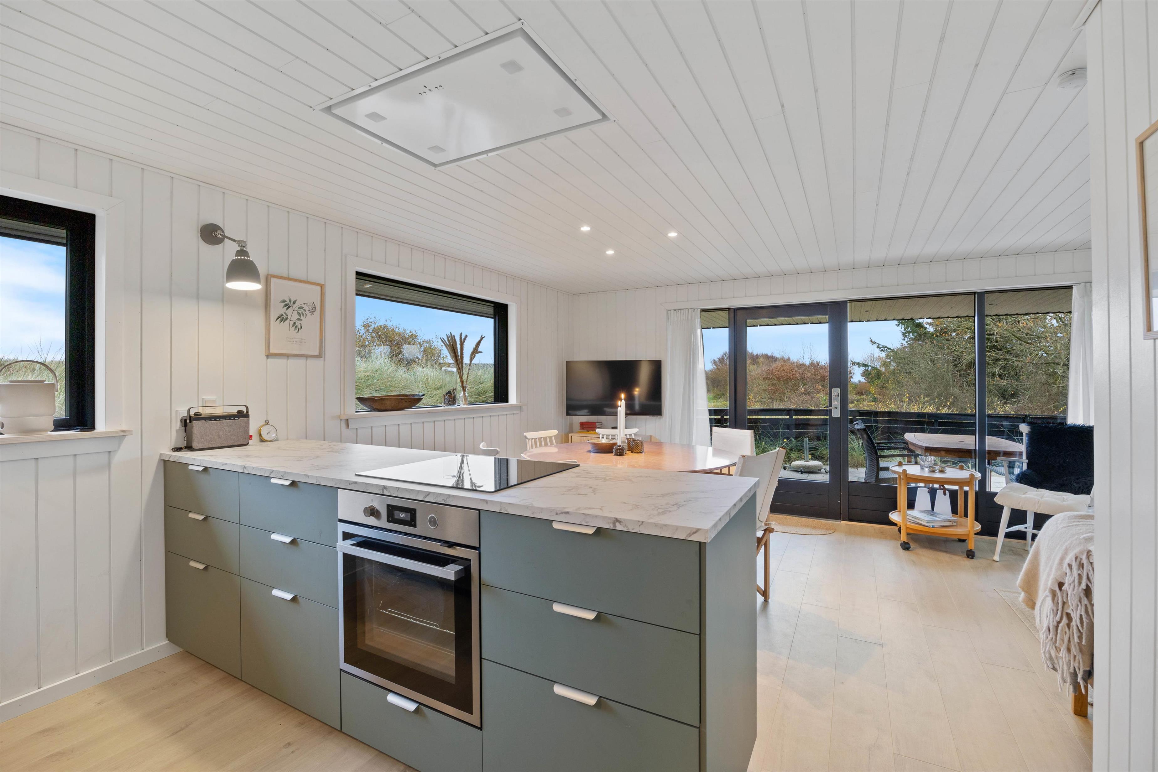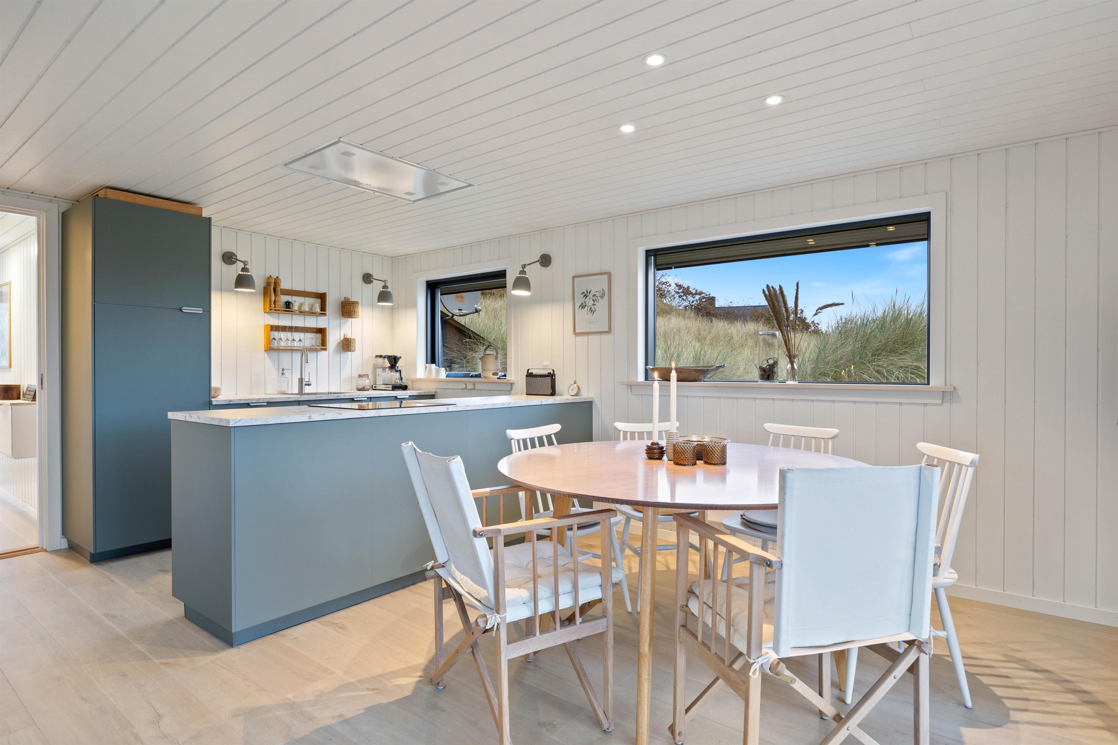 På Tornbjerrevej 82 føler man sig velkommen, straks man træder ind ad døren. Det åbne køkken/alrum og stue er hyggeligt indrettet med komfortable møbler. I sofaen kan I slappe af ved varmen fra ilden i brændeovnen og eventuelt benytte Apple-TV’et. Det moderne køkken indeholder alt, hvad I behøver for at tilberede lækre hjemmelavede måltider – prøv for eksempel én egnsret, som bakskuld, hvis ikke du kender den. Det er saltet, tørret og røget ising, som kan købes i delikatesser og fiskeforretninger på egnen.