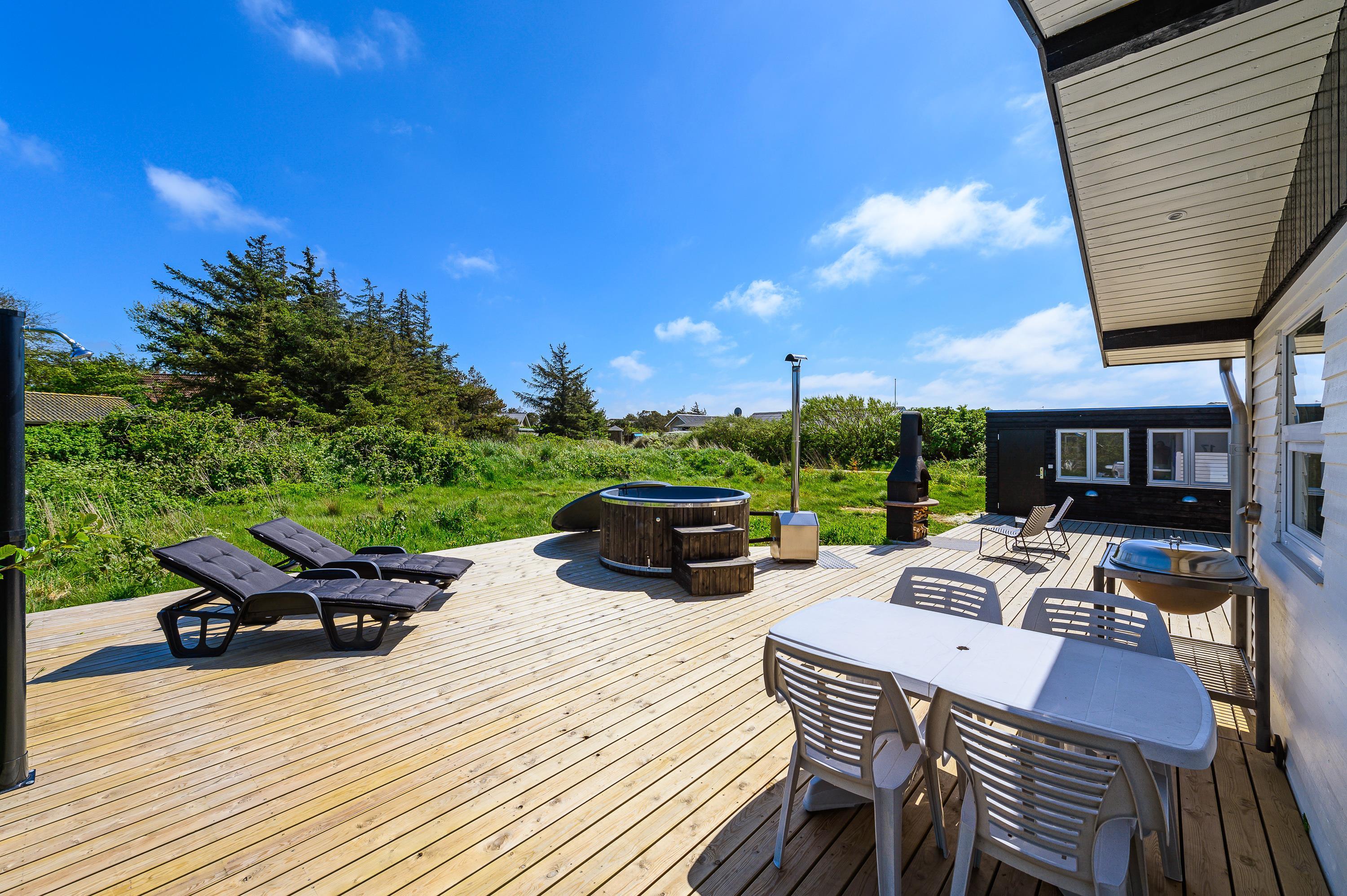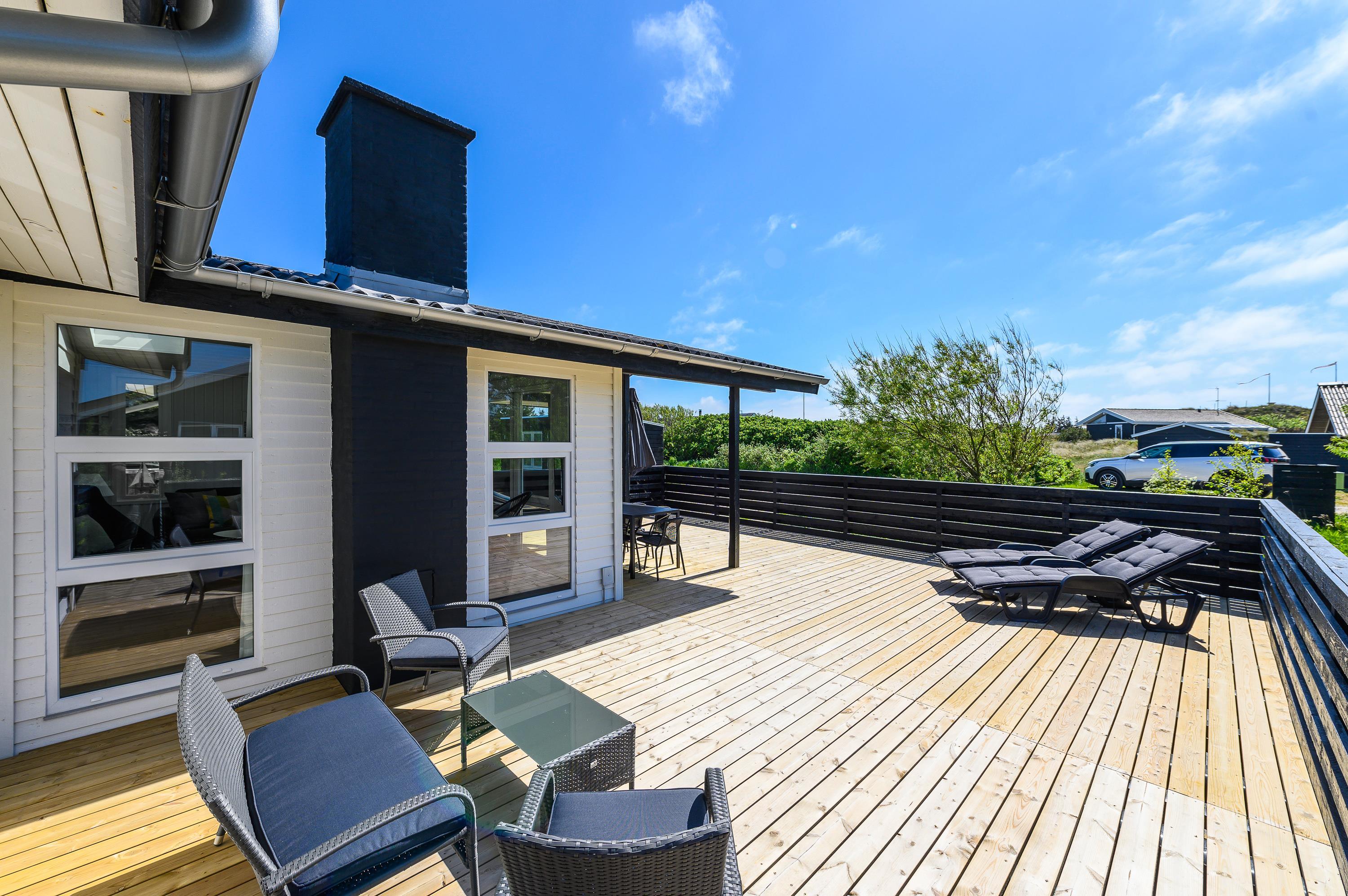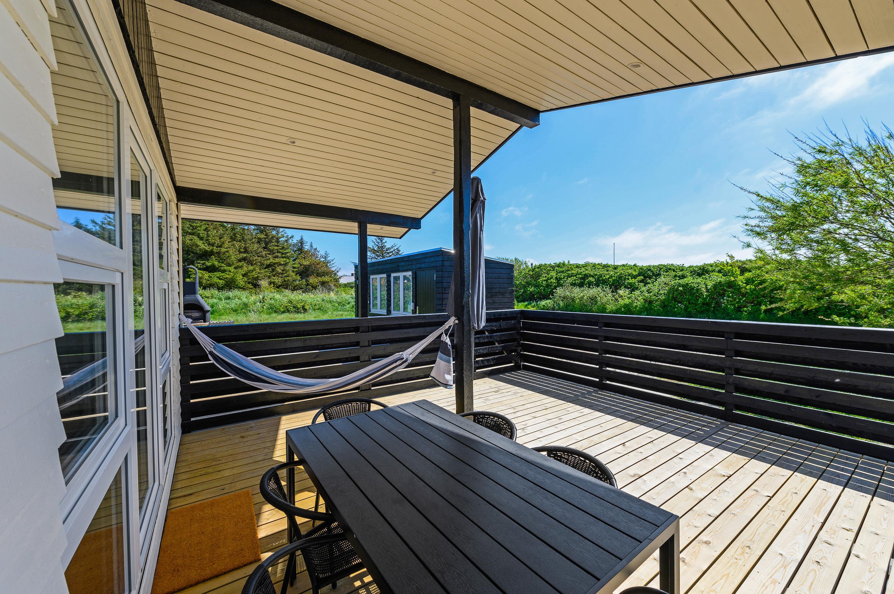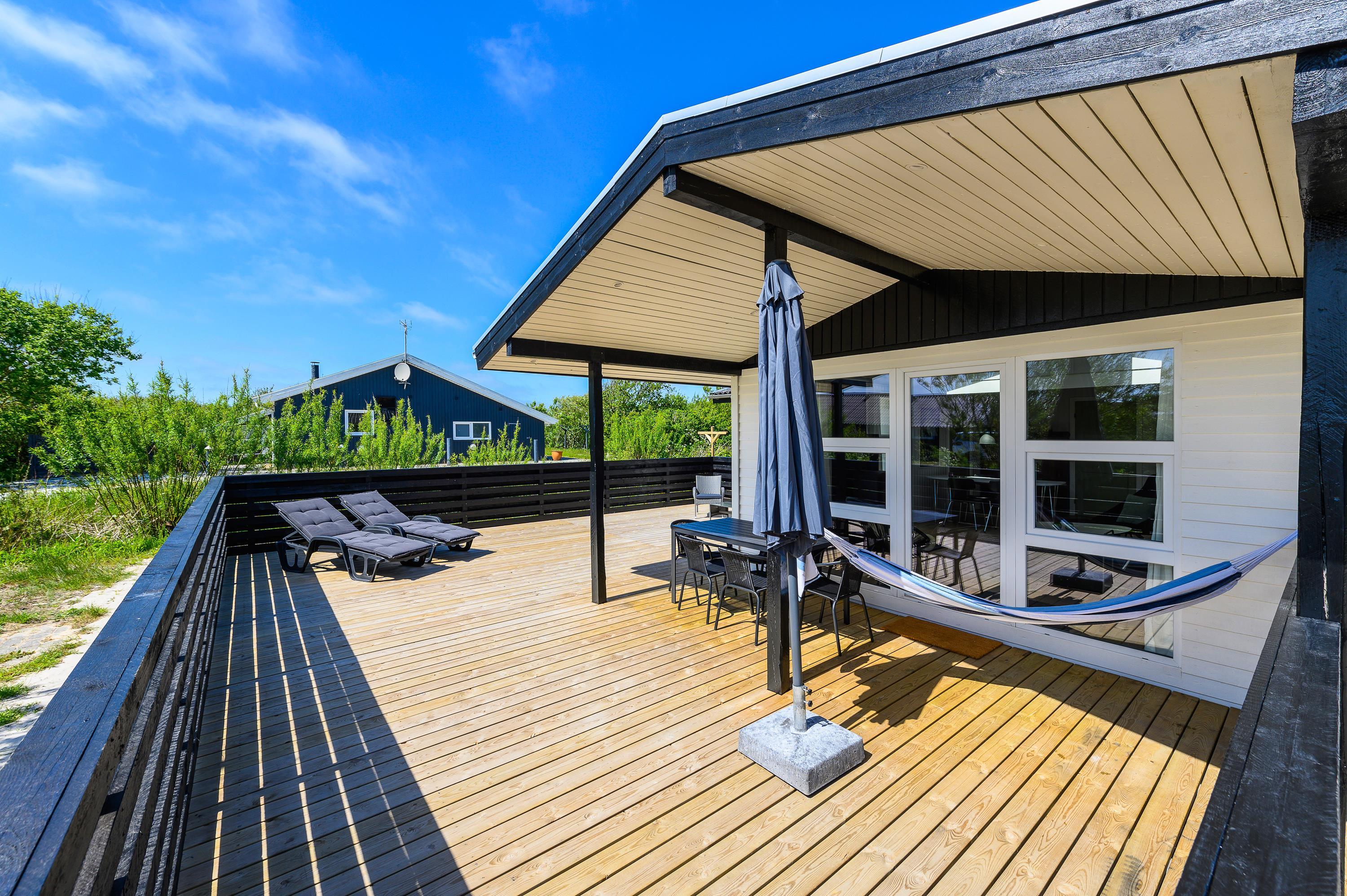 Fra den sydvendte, delvise overdækkede, lukkede - og temmelig store terrasse kan man nyde dagens rytme, først med solopgangen over fjorden mod øst. Dernæst kan man, måske over den veltilberedt grill-middag, nyde solnedgangen og himlens orangerøde skær over klitterne mod vest.