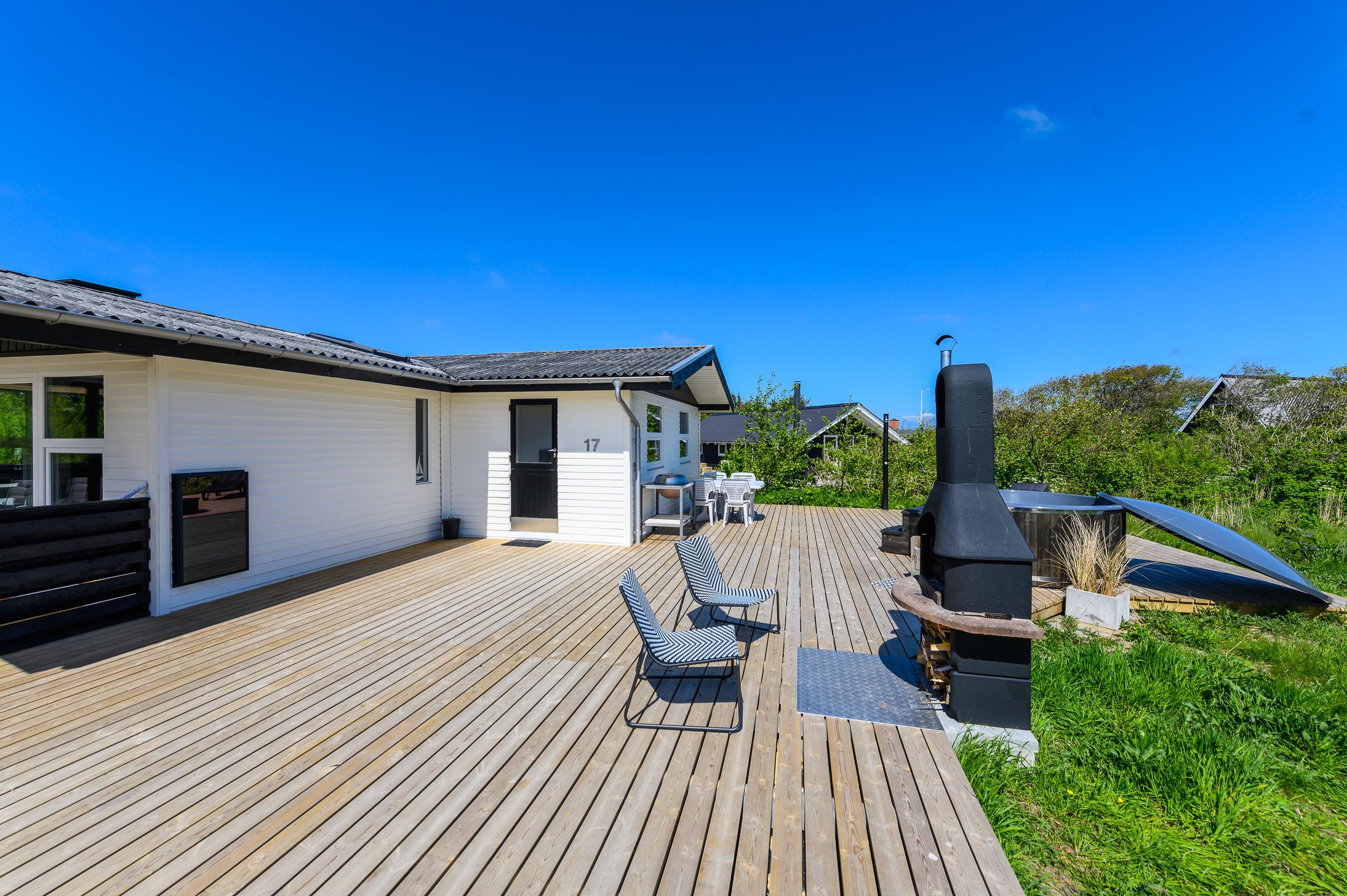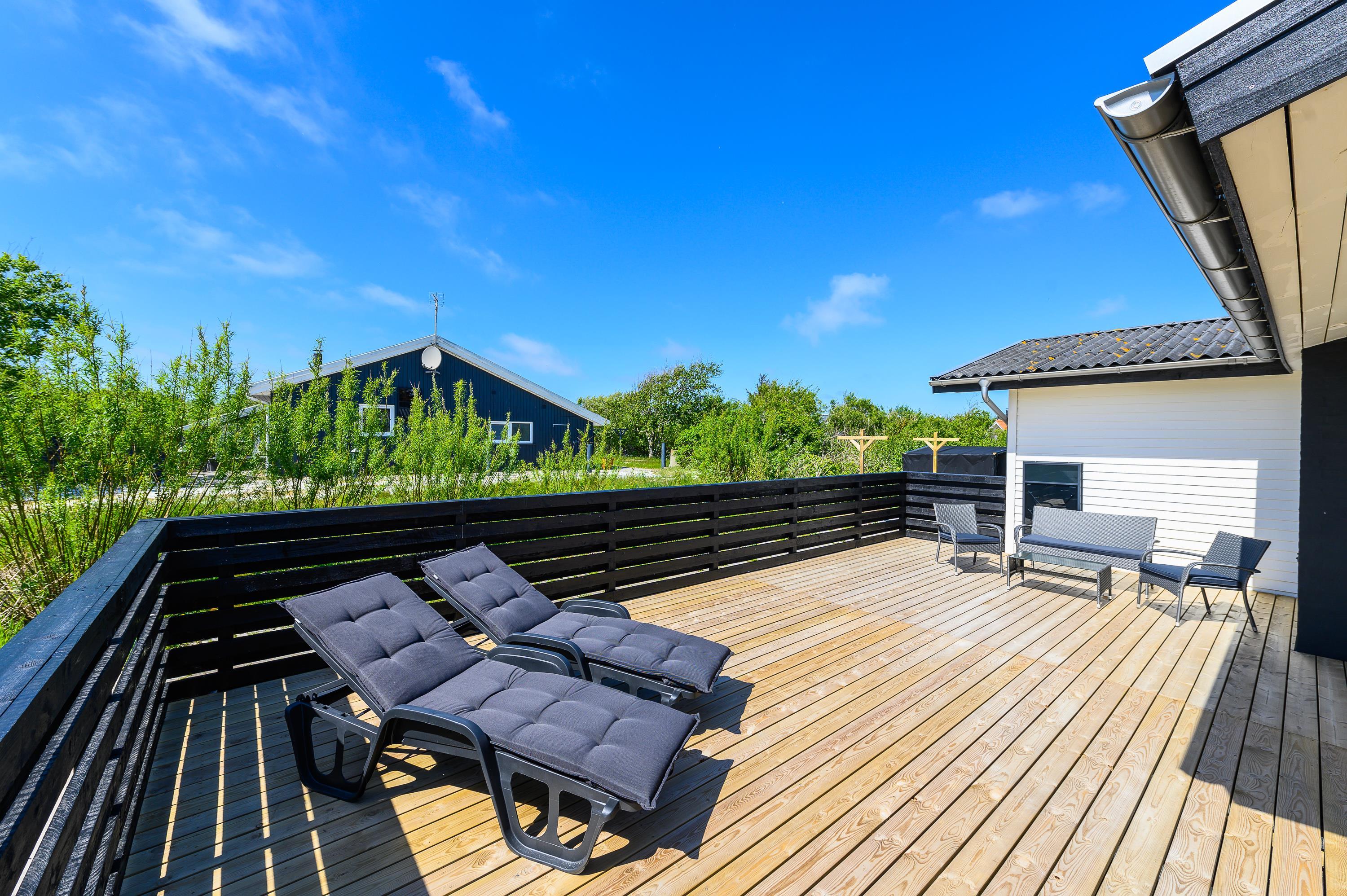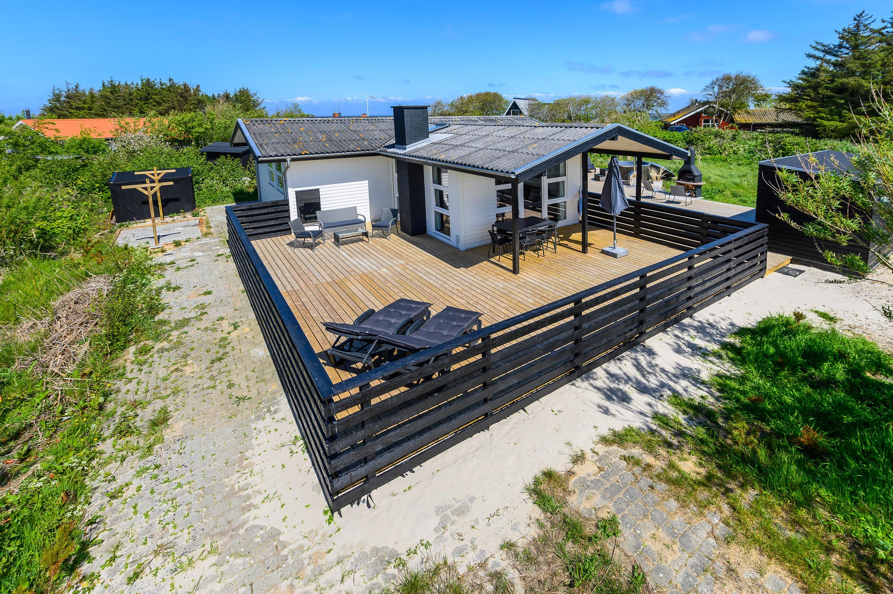 Fra den sydvendte, delvise overdækkede, lukkede - og temmelig store terrasse kan man nyde dagens rytme, først med solopgangen over fjorden mod øst. Dernæst kan man, måske over den veltilberedt grill-middag, nyde solnedgangen og himlens orangerøde skær over klitterne mod vest.