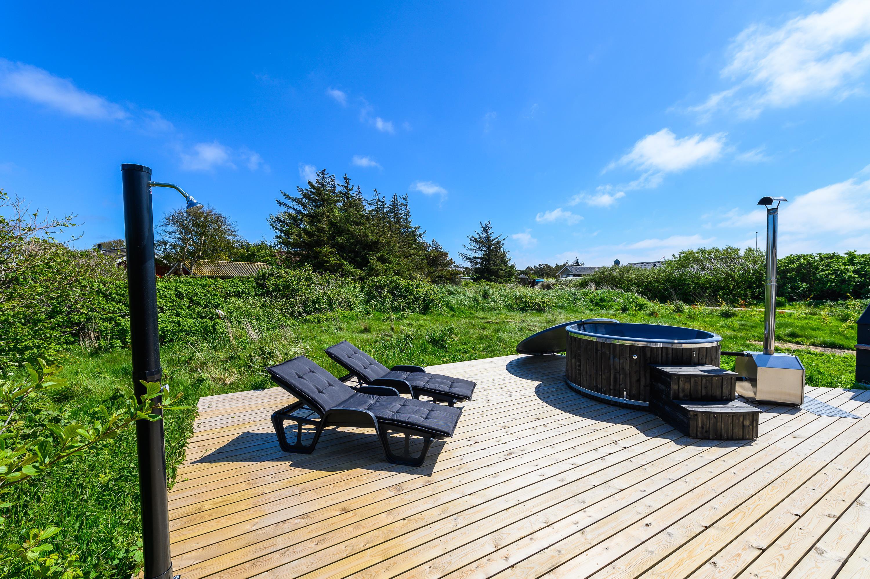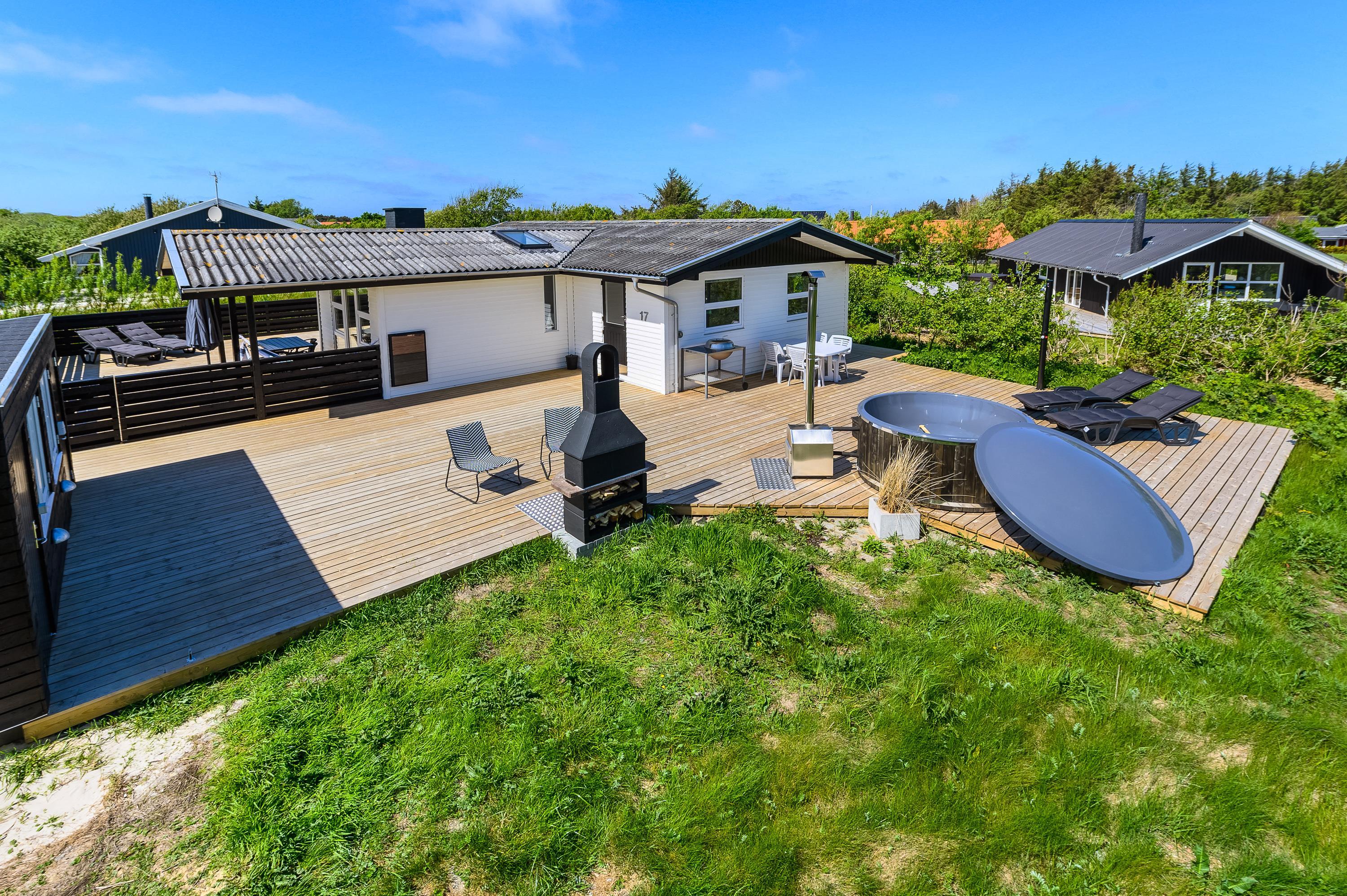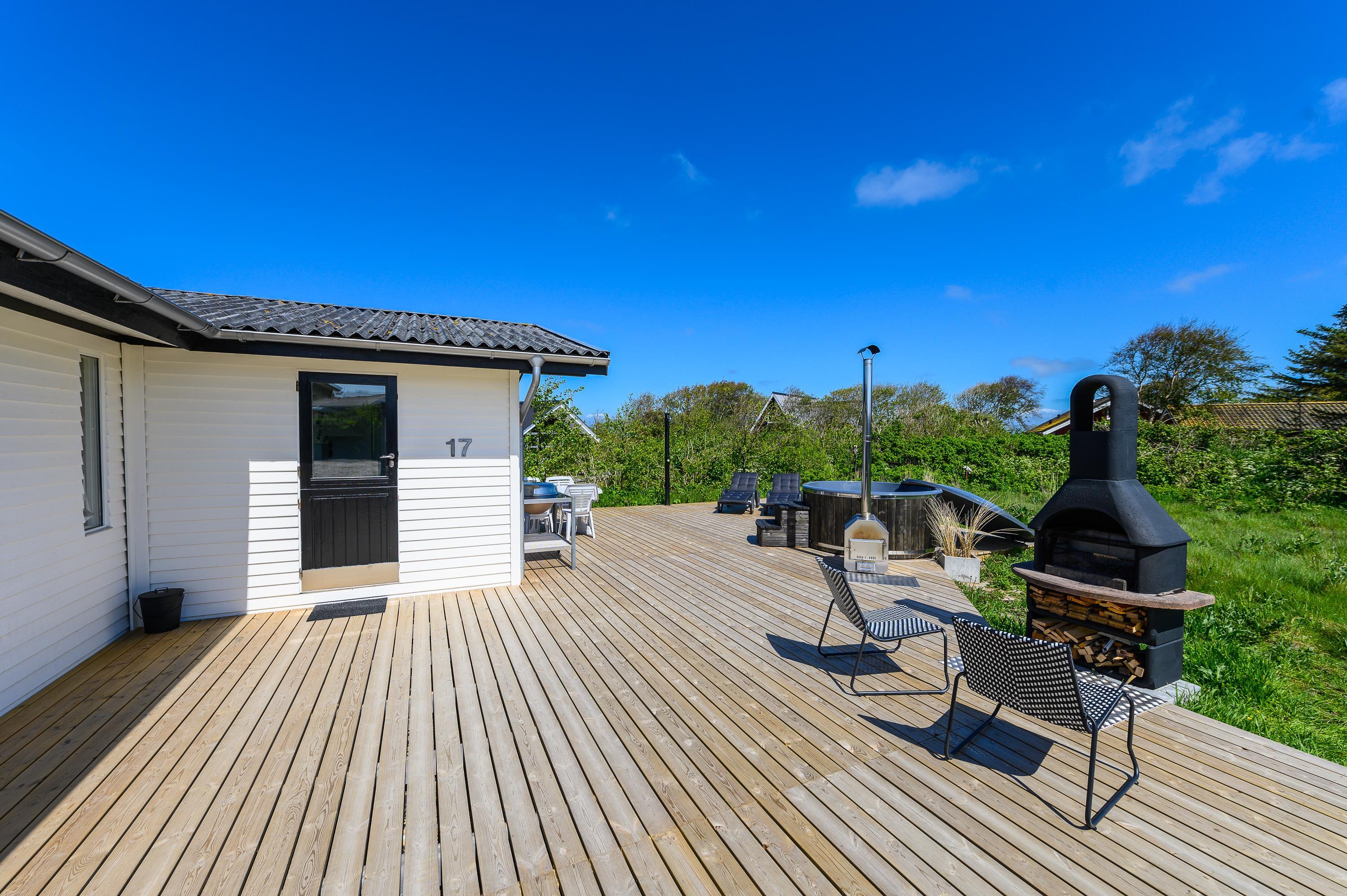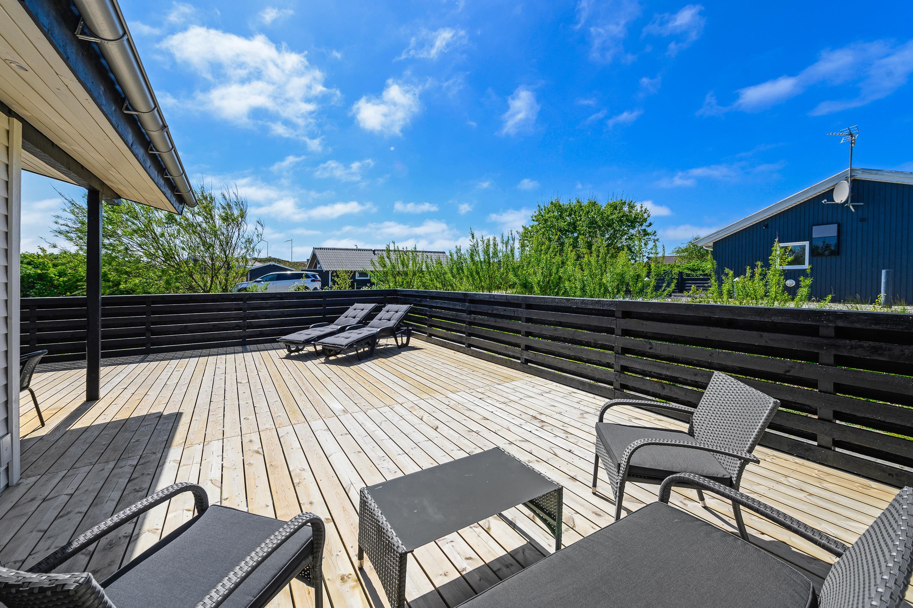 Fra den sydvendte, delvise overdækkede, lukkede - og temmelig store terrasse kan man nyde dagens rytme, først med solopgangen over fjorden mod øst. Dernæst kan man, måske over den veltilberedt grill-middag, nyde solnedgangen og himlens orangerøde skær over klitterne mod vest.