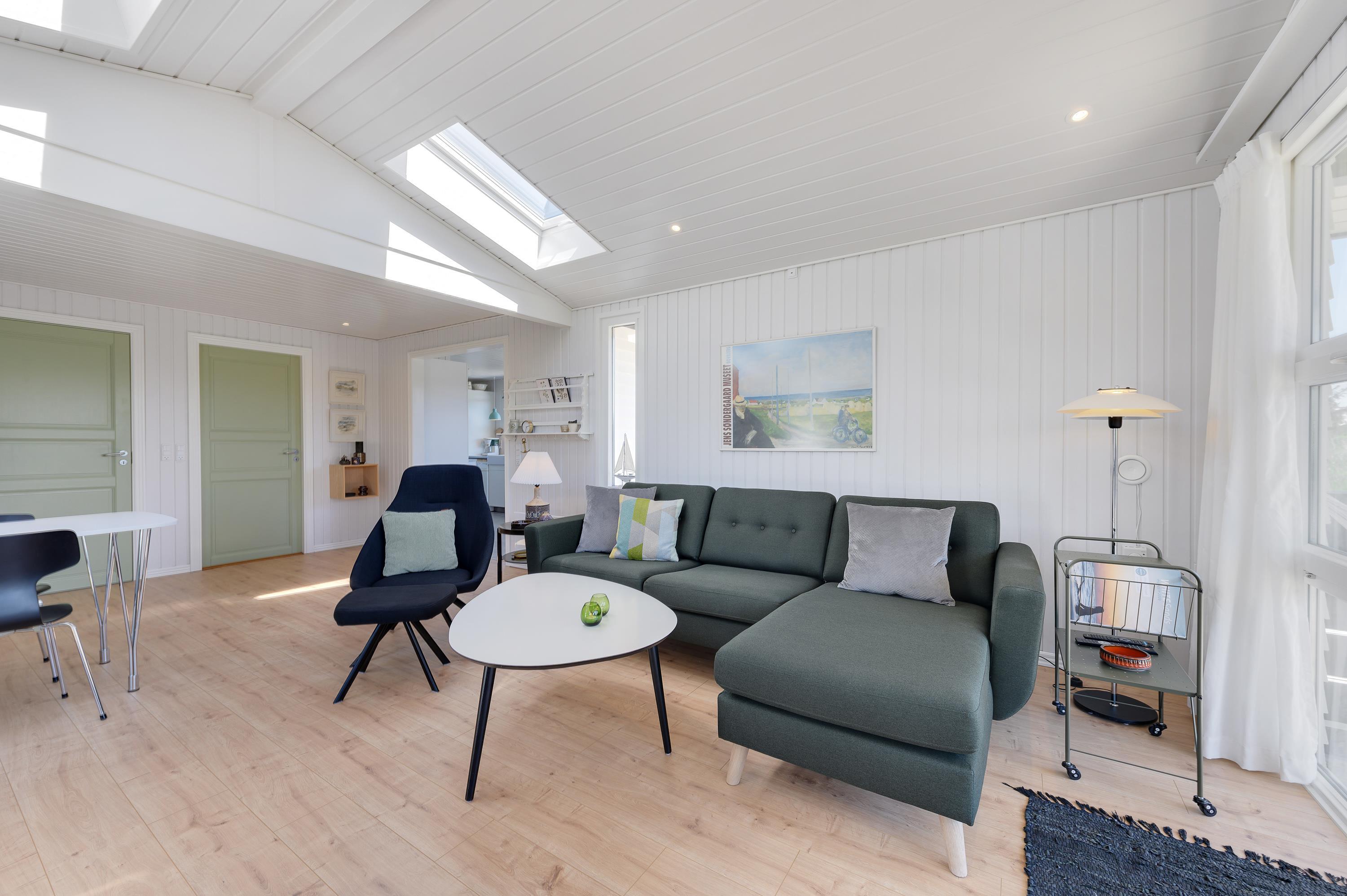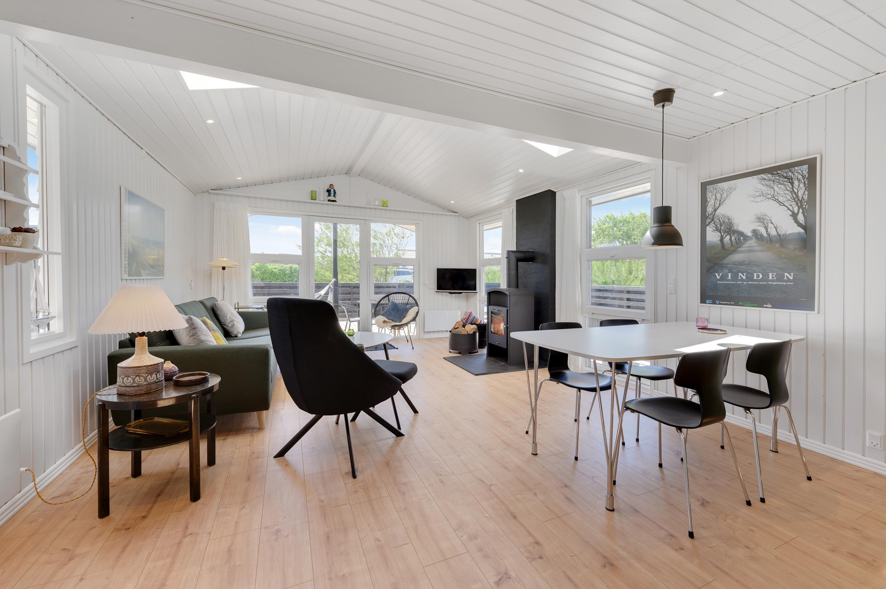 Dette praktisk indrettede træferiehus byder jer velkommen til en dejlig ferieoplevelse i den vestjyske natur. Her er et godt opholdsrum med veludrustet køkkenafdeling med bl.a. mikroovn og opvaskemaskine.