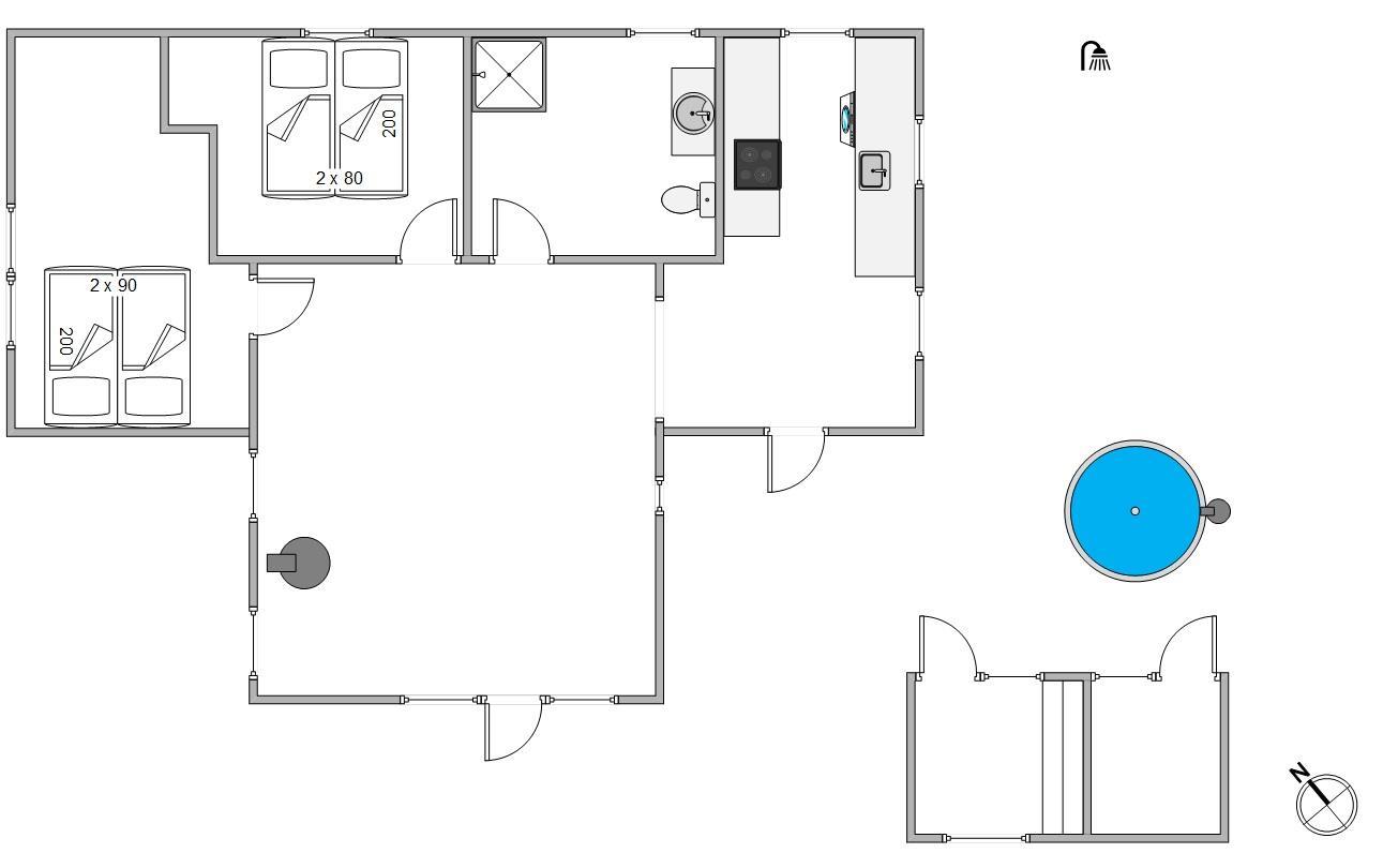 Huset har 2 gode soverum, hver med en dobbeltseng, samt et godt og praktisk badeværelse. En vaskemaskine i huset hjælper jer, hvis I ikke har fået pakket for meget af det helt rigtige tøj til ferien i det skiftende danske vejr.