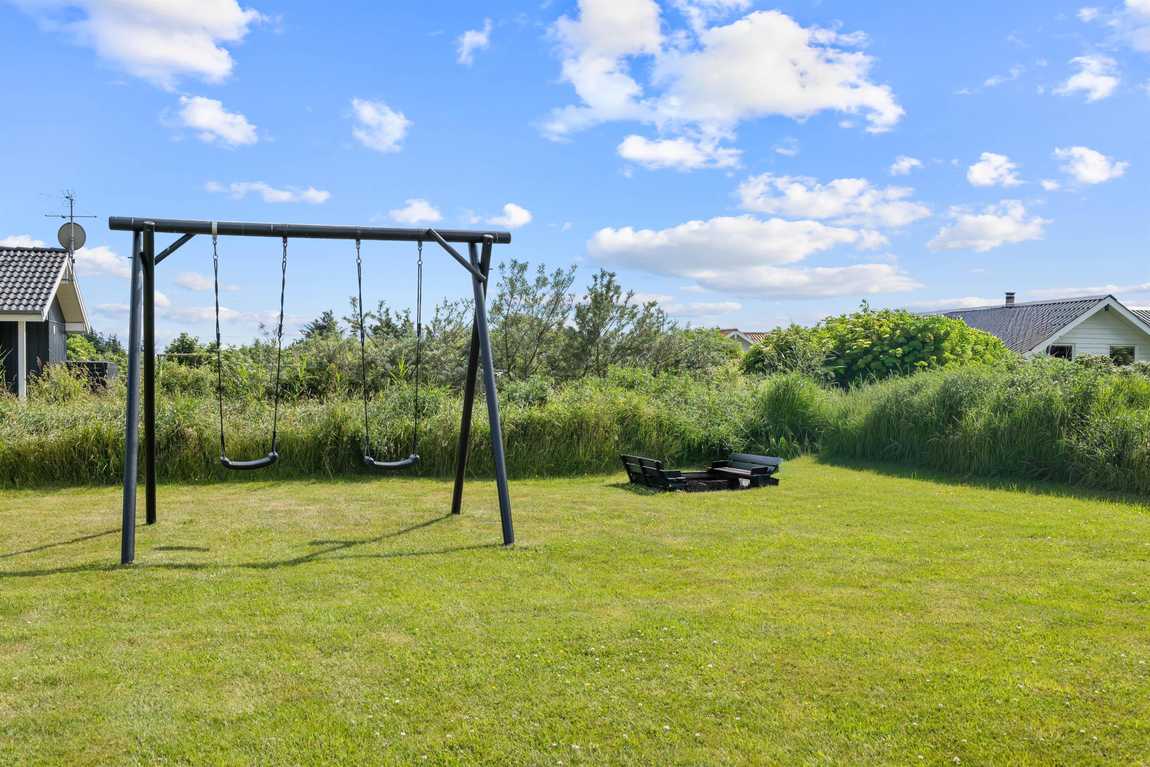 På sommerhusets store grund finder man gynger og sandkasse – et sandt mekka for børn.