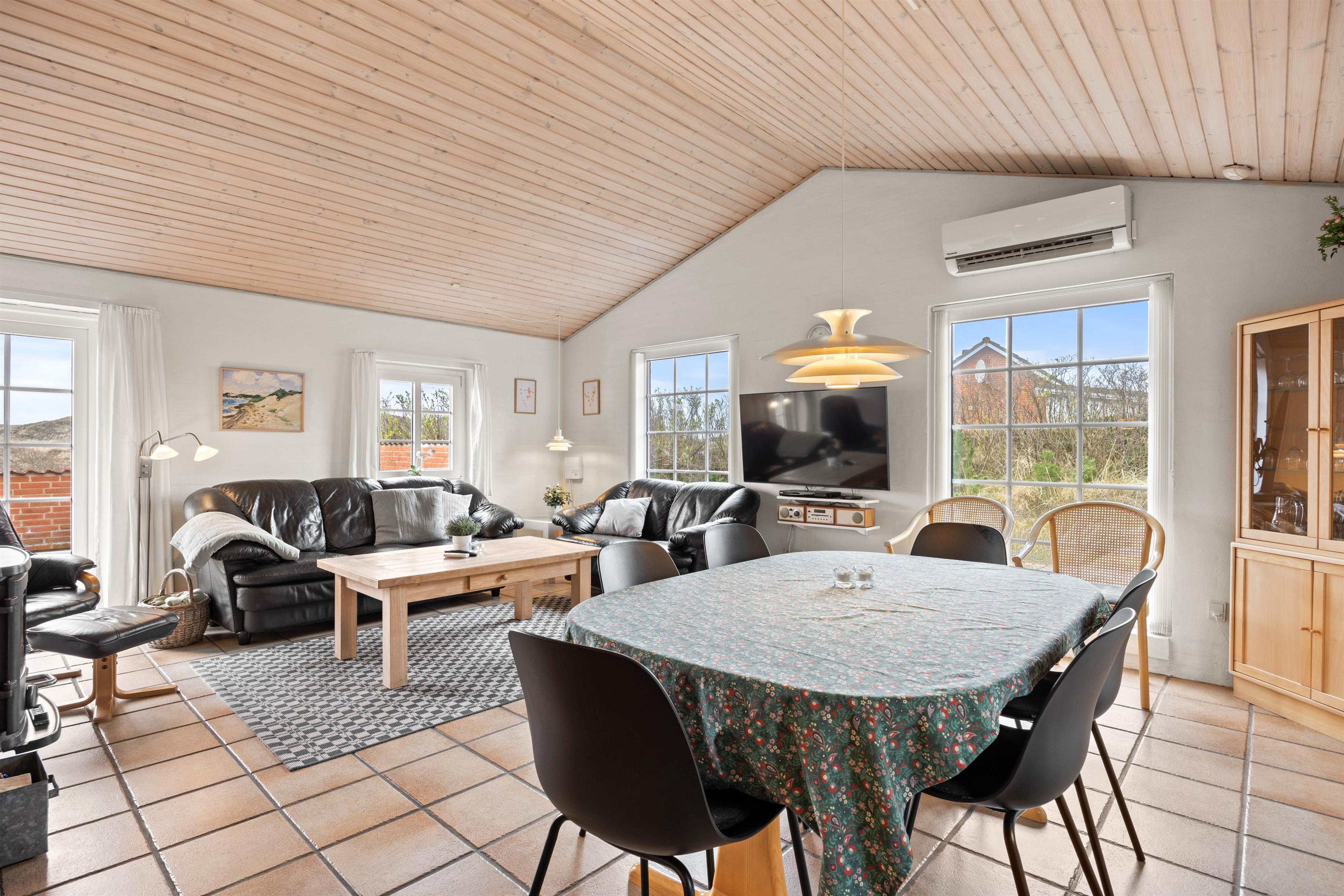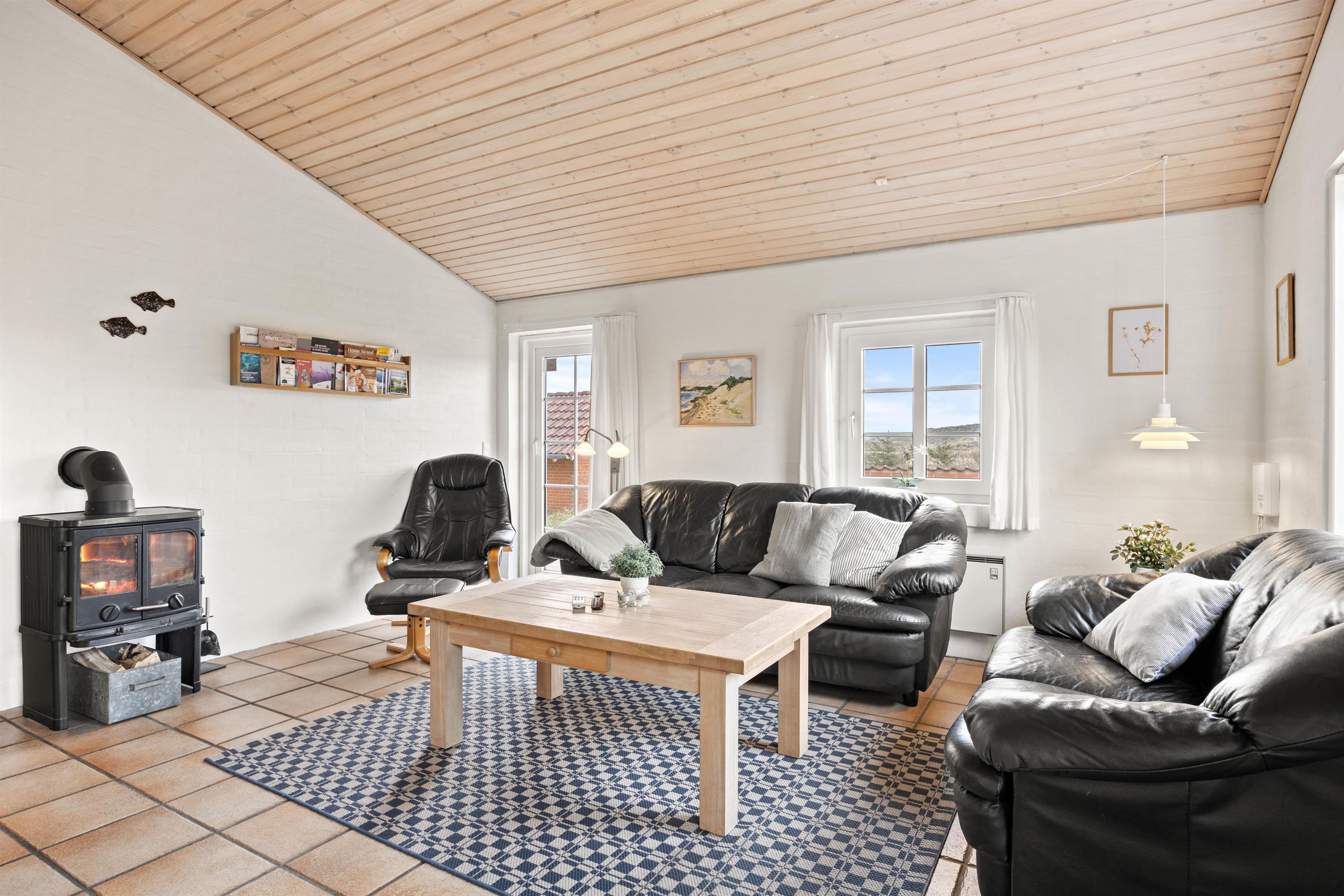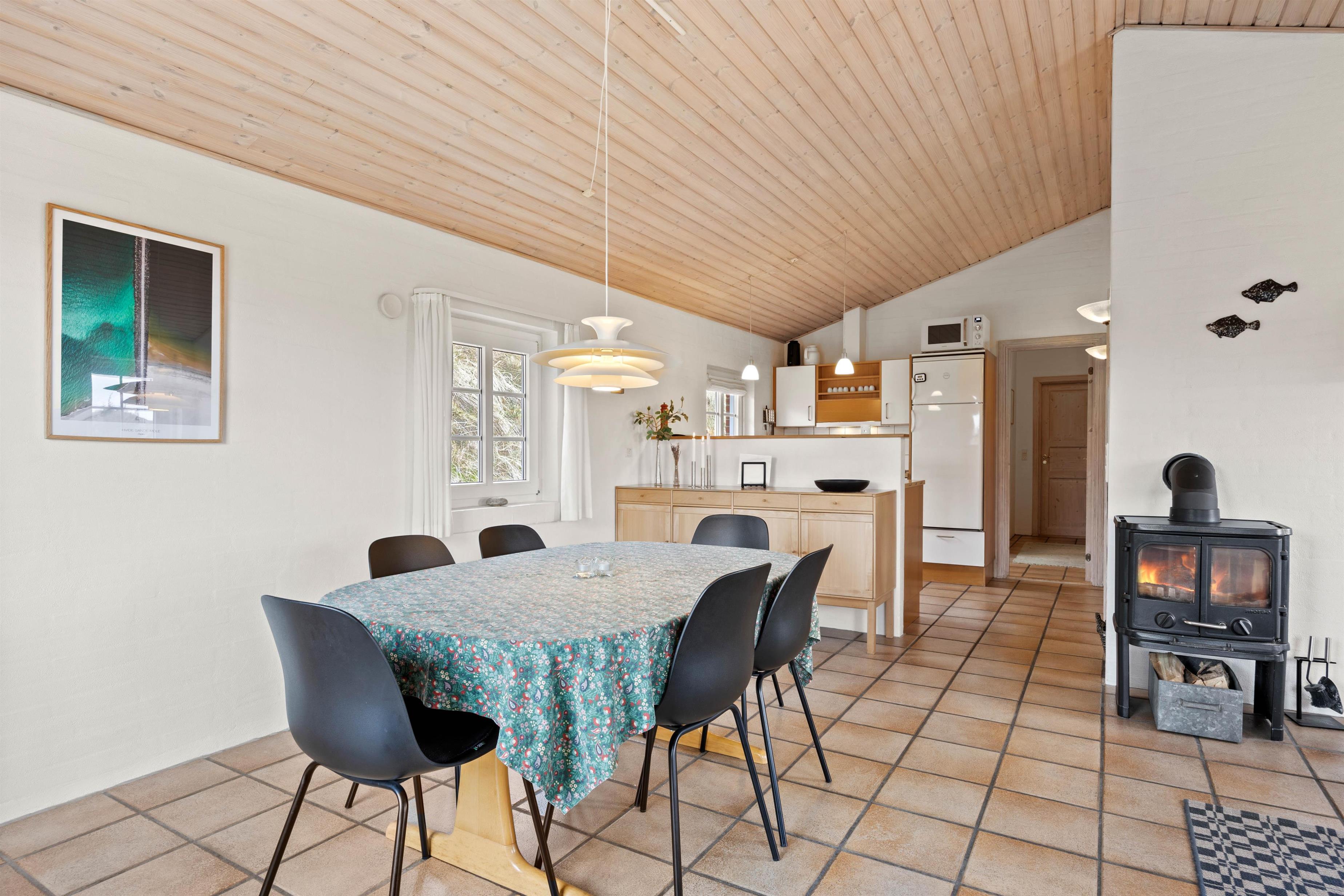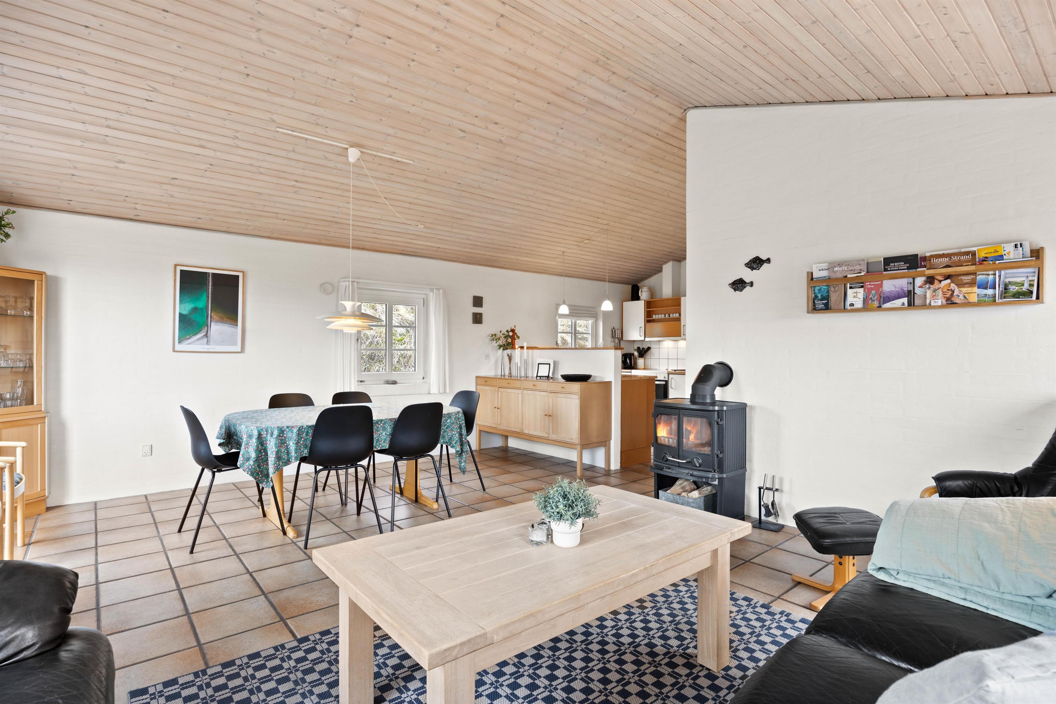 Hjerterummet er køkkenalrummet, der forener køkken, spiseafdeling samt stue. Her kan I sammen skabe nogle skønne ferieminder med fællesmiddage eller brætspilsaftner. Samtidig er det også her, at I kan koble fra og nyde ferien med en kop kaffe, en god bog eller film. Med et Chromecast har I nemlig mulighed for at streame alle jeres yndlingsfilm, mens brændeovnen knitrer i baggrunden. For et behageligt indeklima kan I gøre brug af den energibesparende varmepumpe.