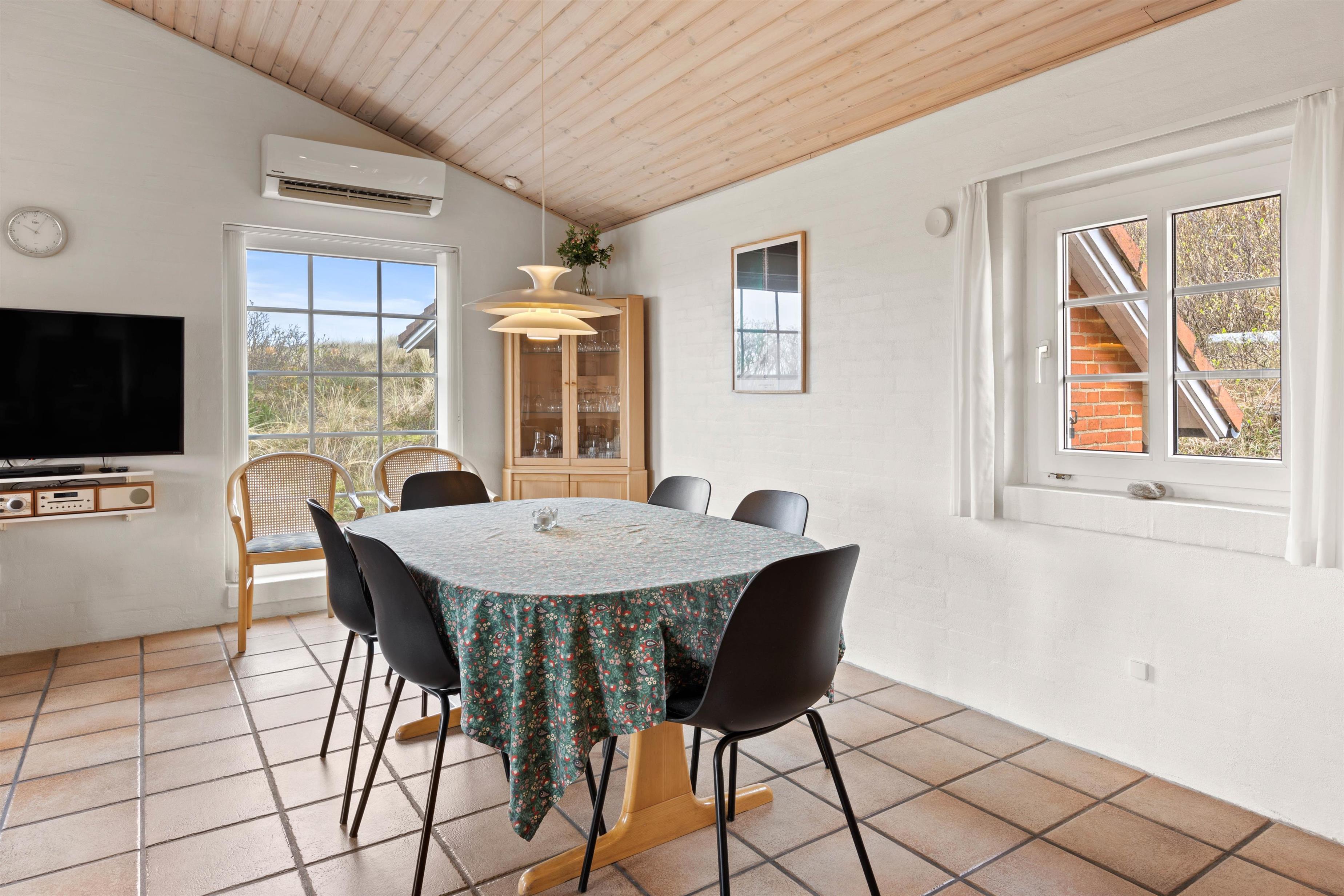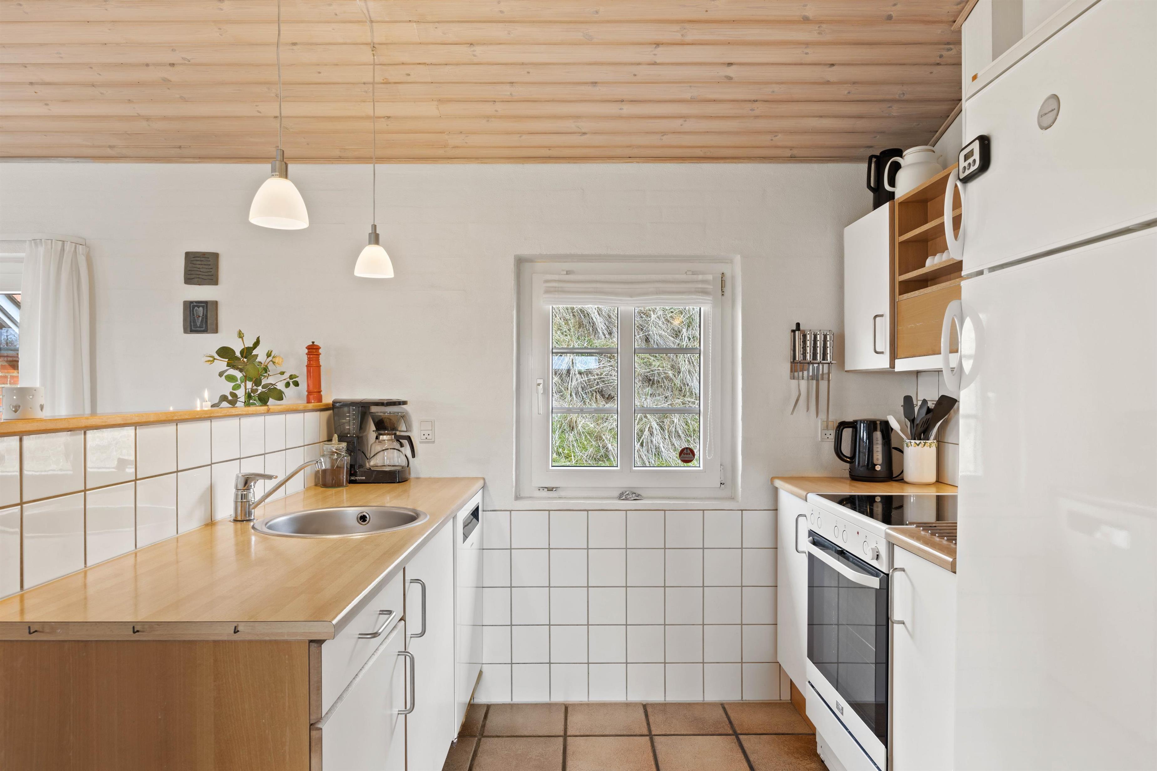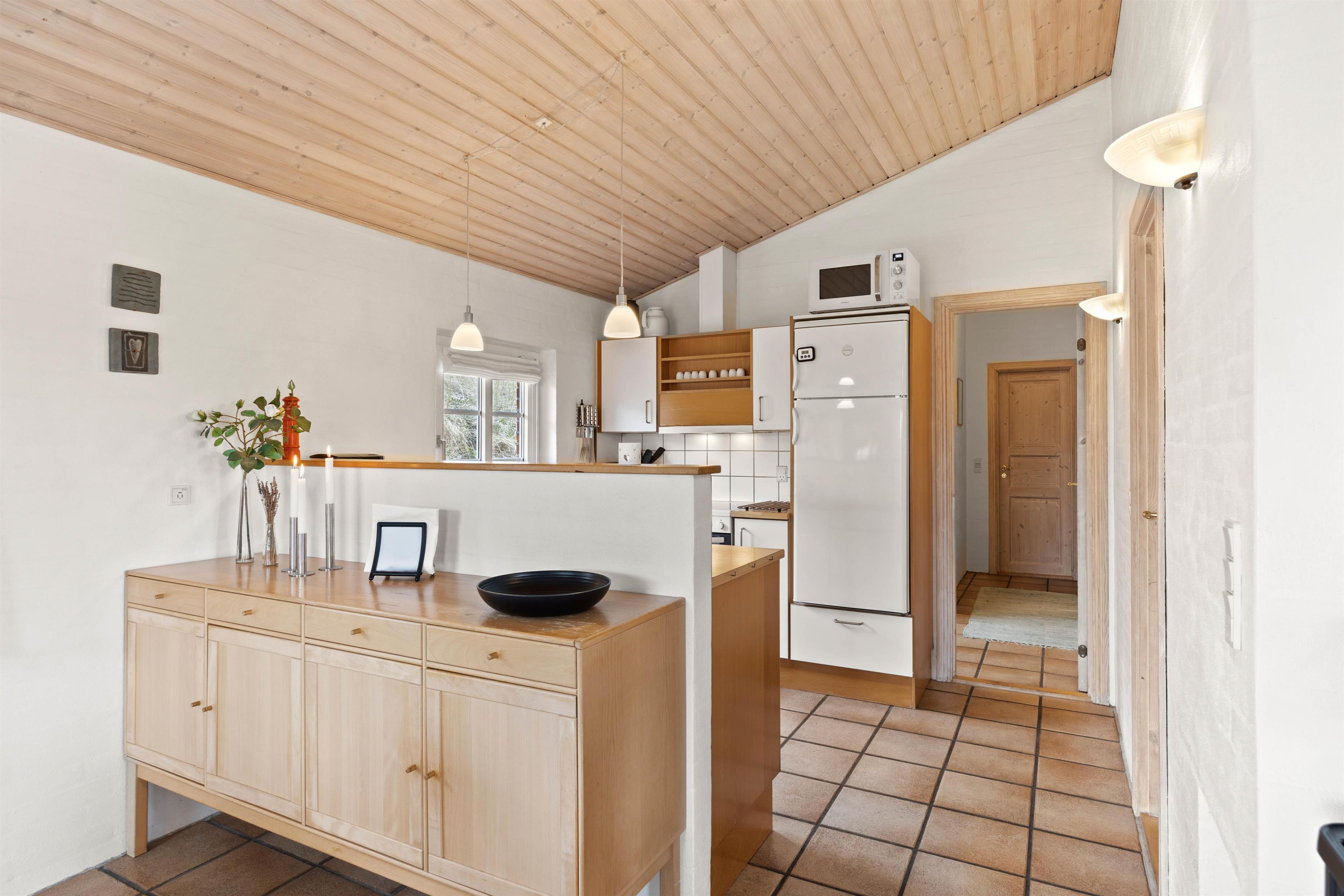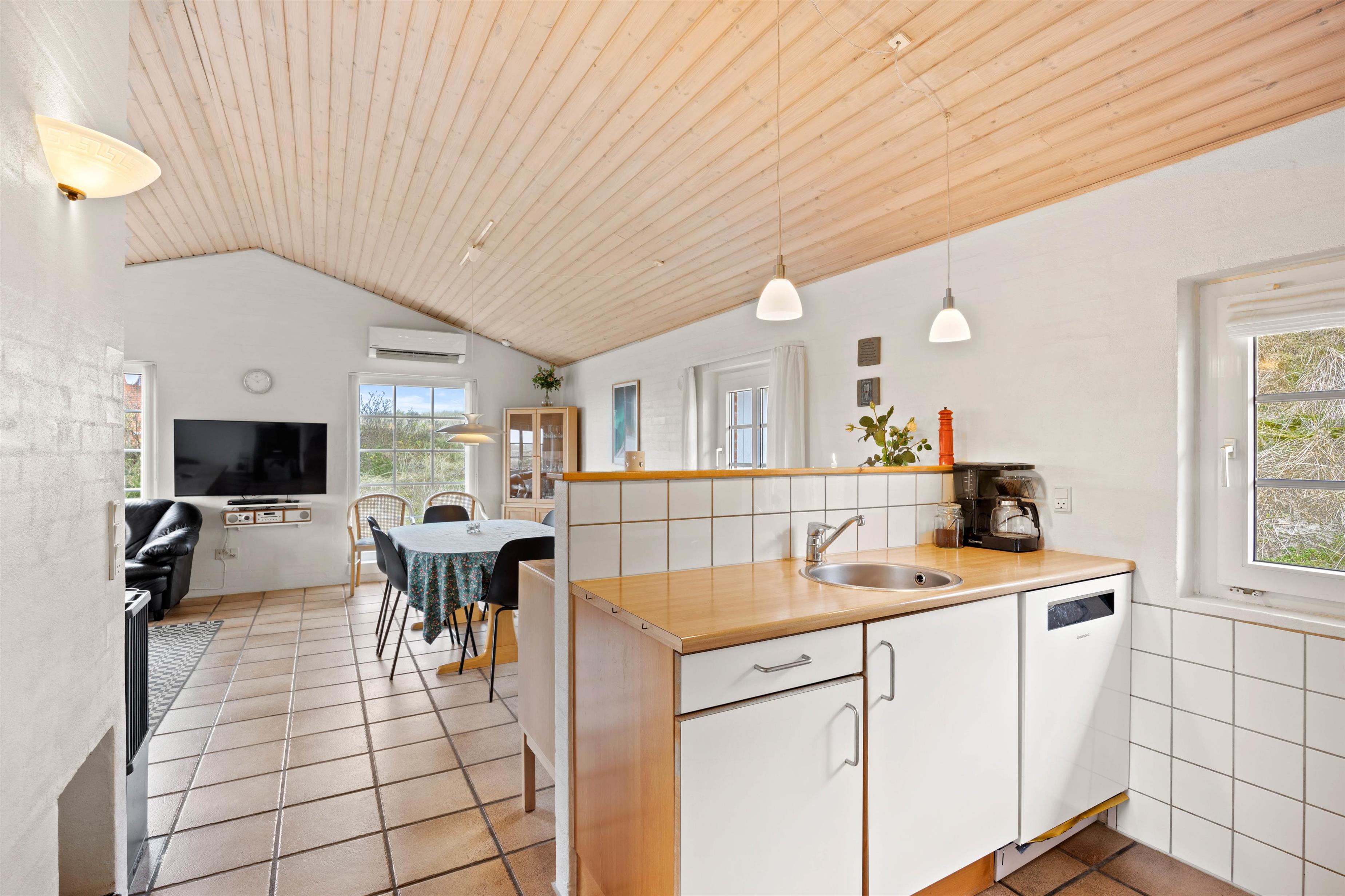 Hjerterummet er køkkenalrummet, der forener køkken, spiseafdeling samt stue. Her kan I sammen skabe nogle skønne ferieminder med fællesmiddage eller brætspilsaftner. Samtidig er det også her, at I kan koble fra og nyde ferien med en kop kaffe, en god bog eller film. Med et Chromecast har I nemlig mulighed for at streame alle jeres yndlingsfilm, mens brændeovnen knitrer i baggrunden. For et behageligt indeklima kan I gøre brug af den energibesparende varmepumpe.