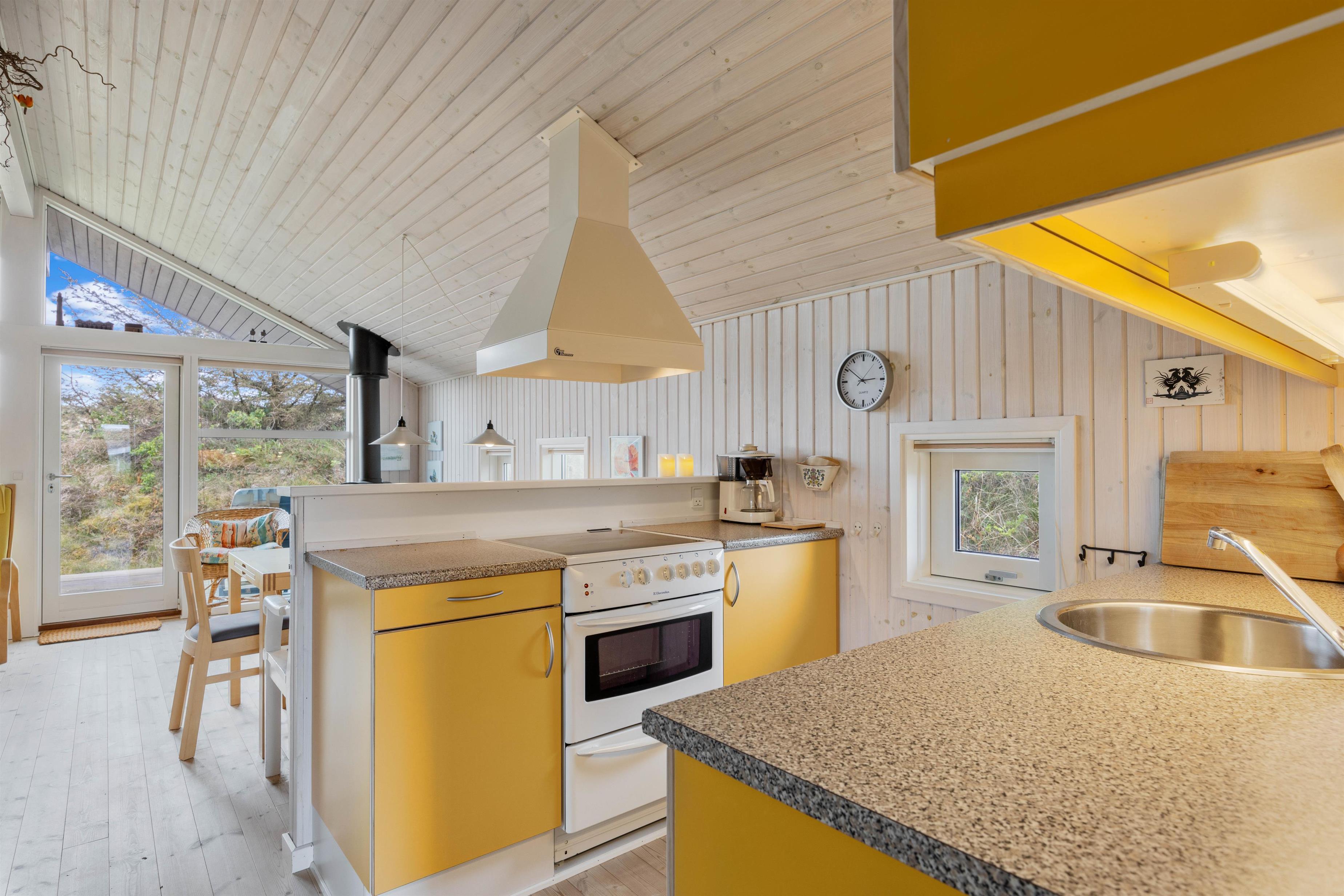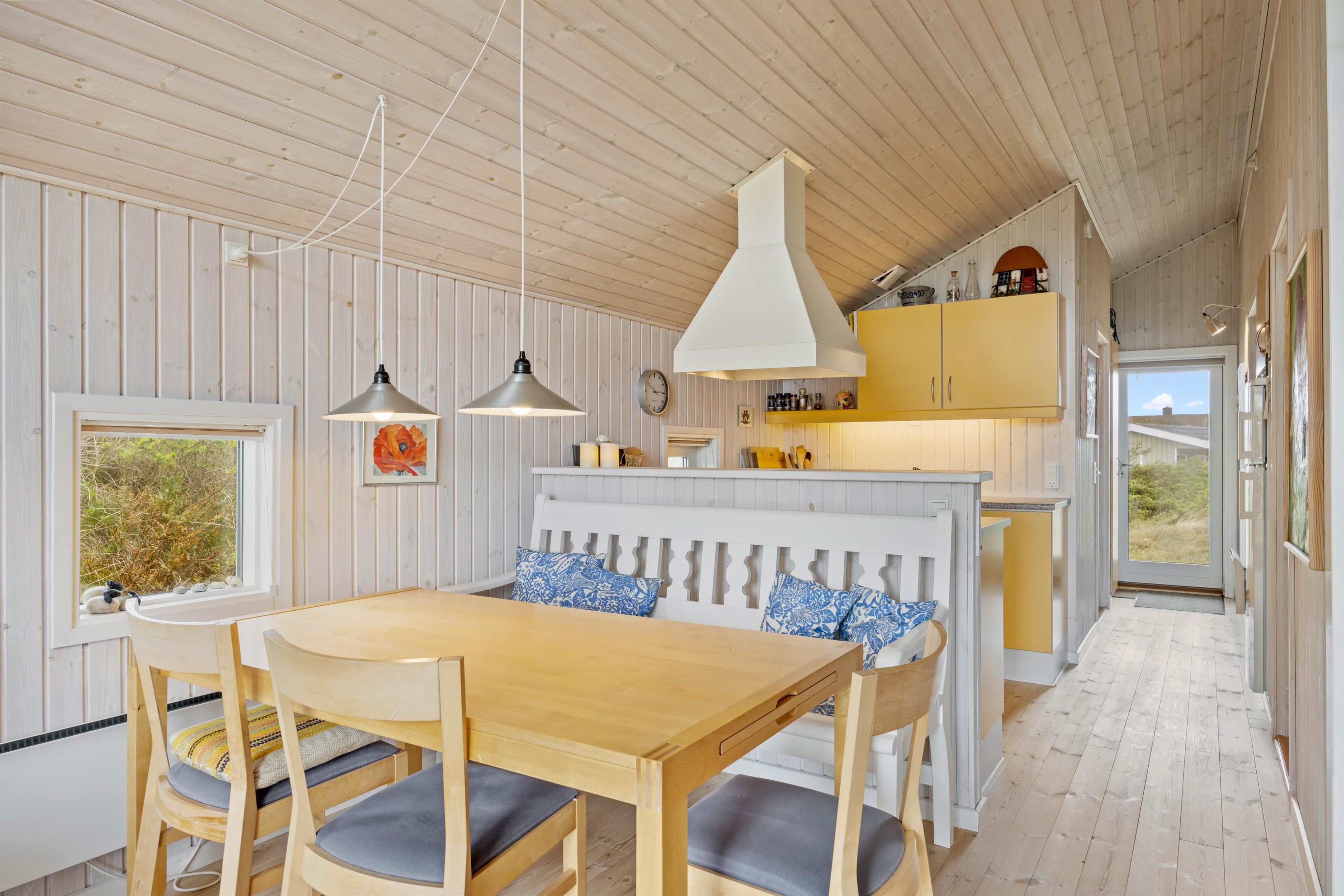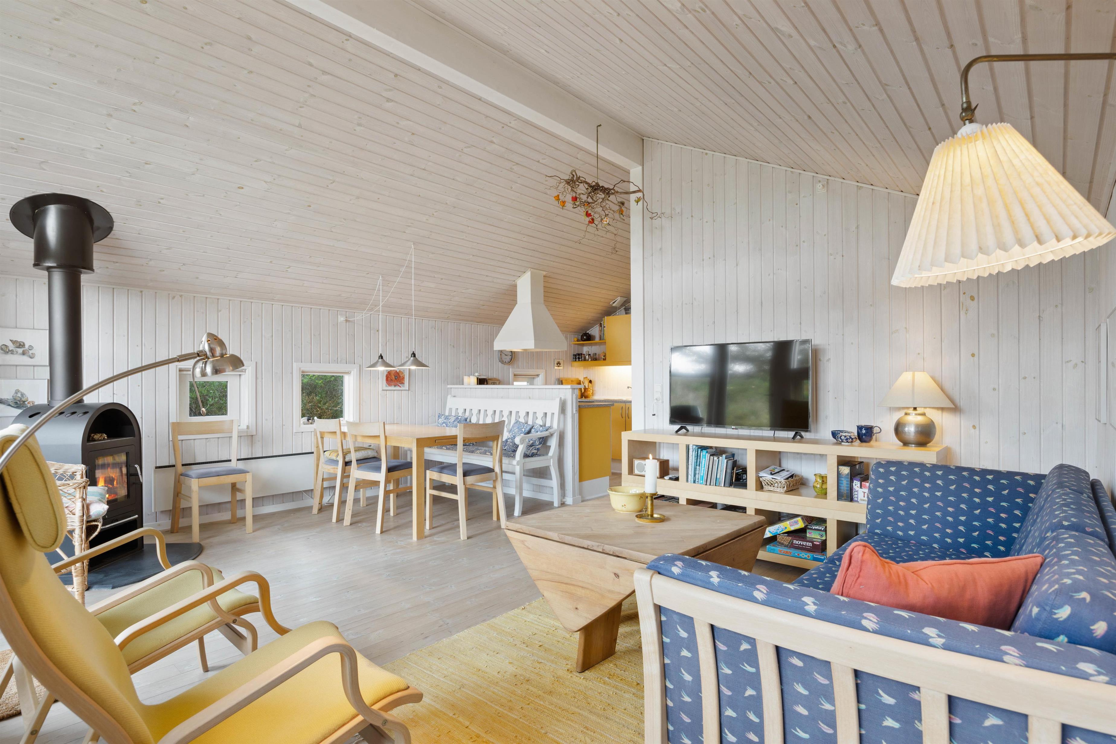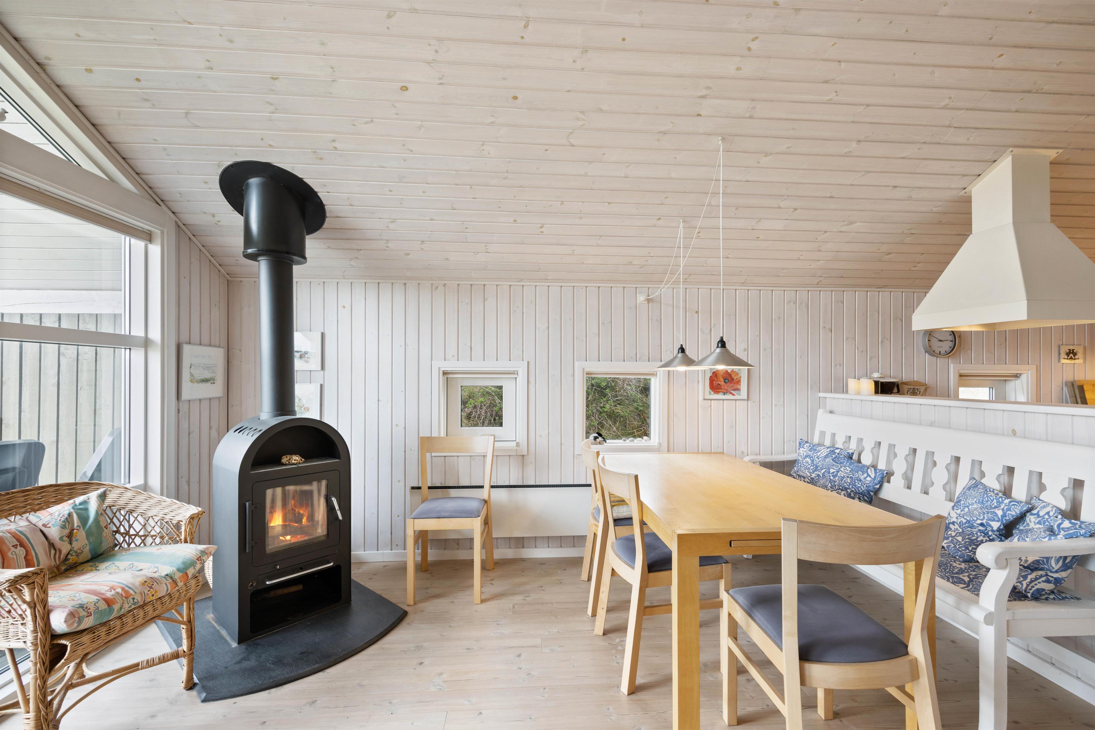 Sommerhuset er hyggeligt indrettet i klassisk sommerhusstil. Samlingsstedet i feriehuset er det hyggelige alrum, hvor køkken, spiseplads og stue ligger i åben forbindelse. Her kan I hygge jer med god mad eller en filmaften, mens brændeovnen knitrer i baggrunden.