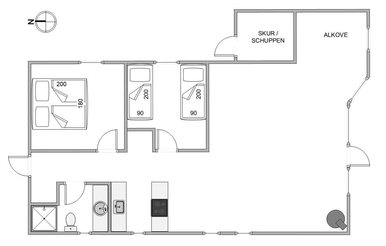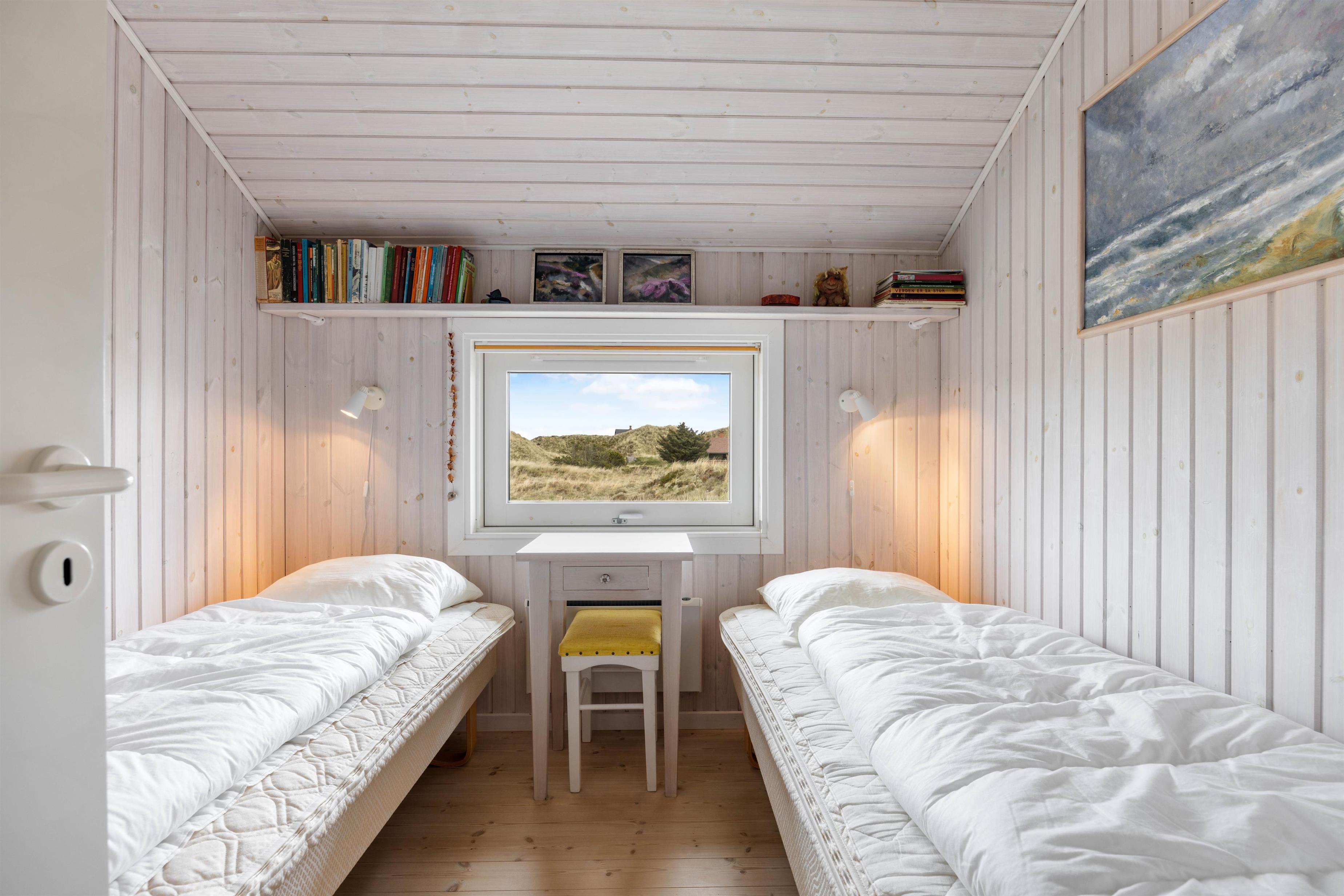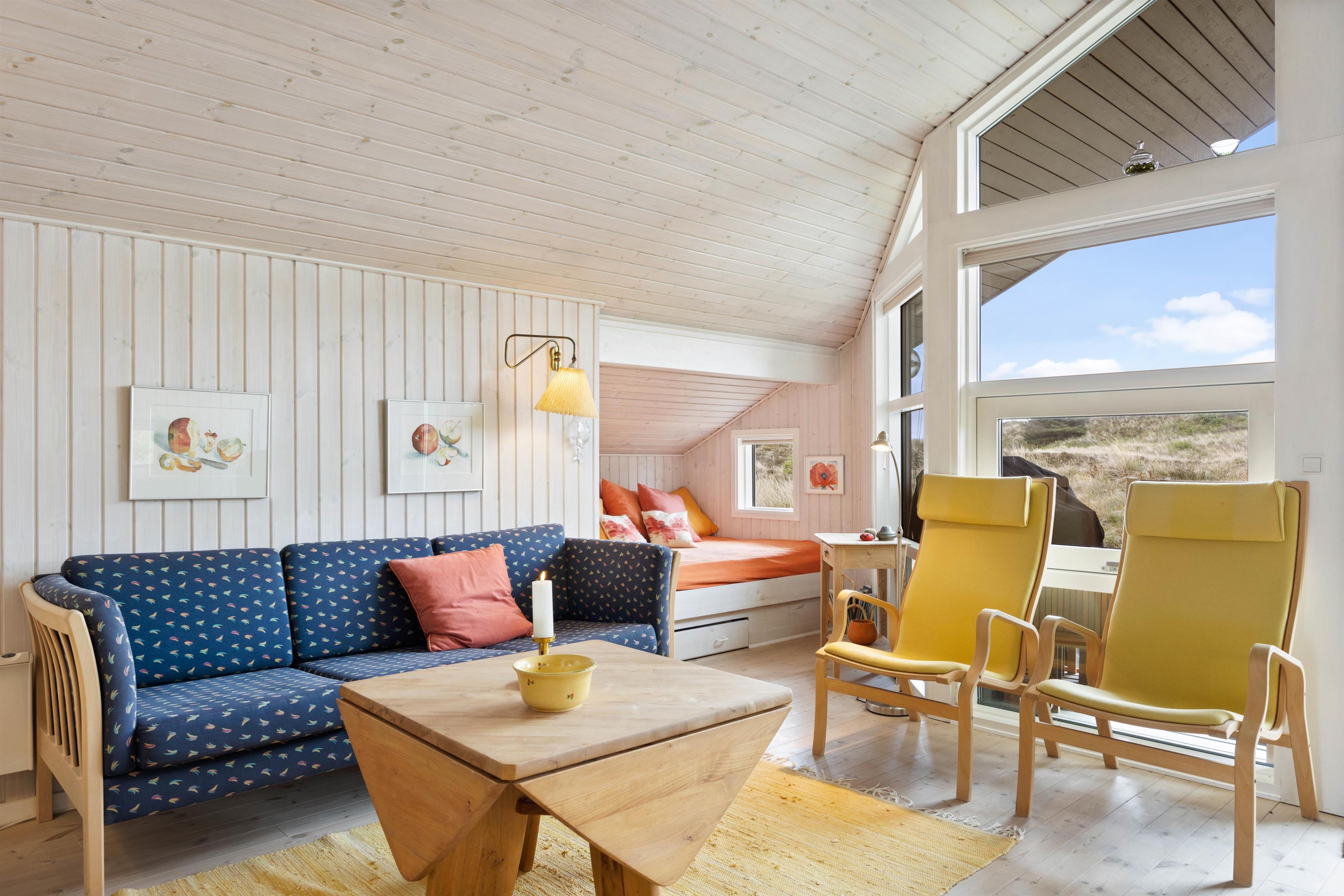 Sommerhuset har 2 gode soveværelser med komfortable senge. Der er 1 dobbeltseng samt et værelse med 2 enkeltsenge. Desuden er der en hyggelig alkove i stuen, hvor I både kan slappe af midt på dagen eller til aften.