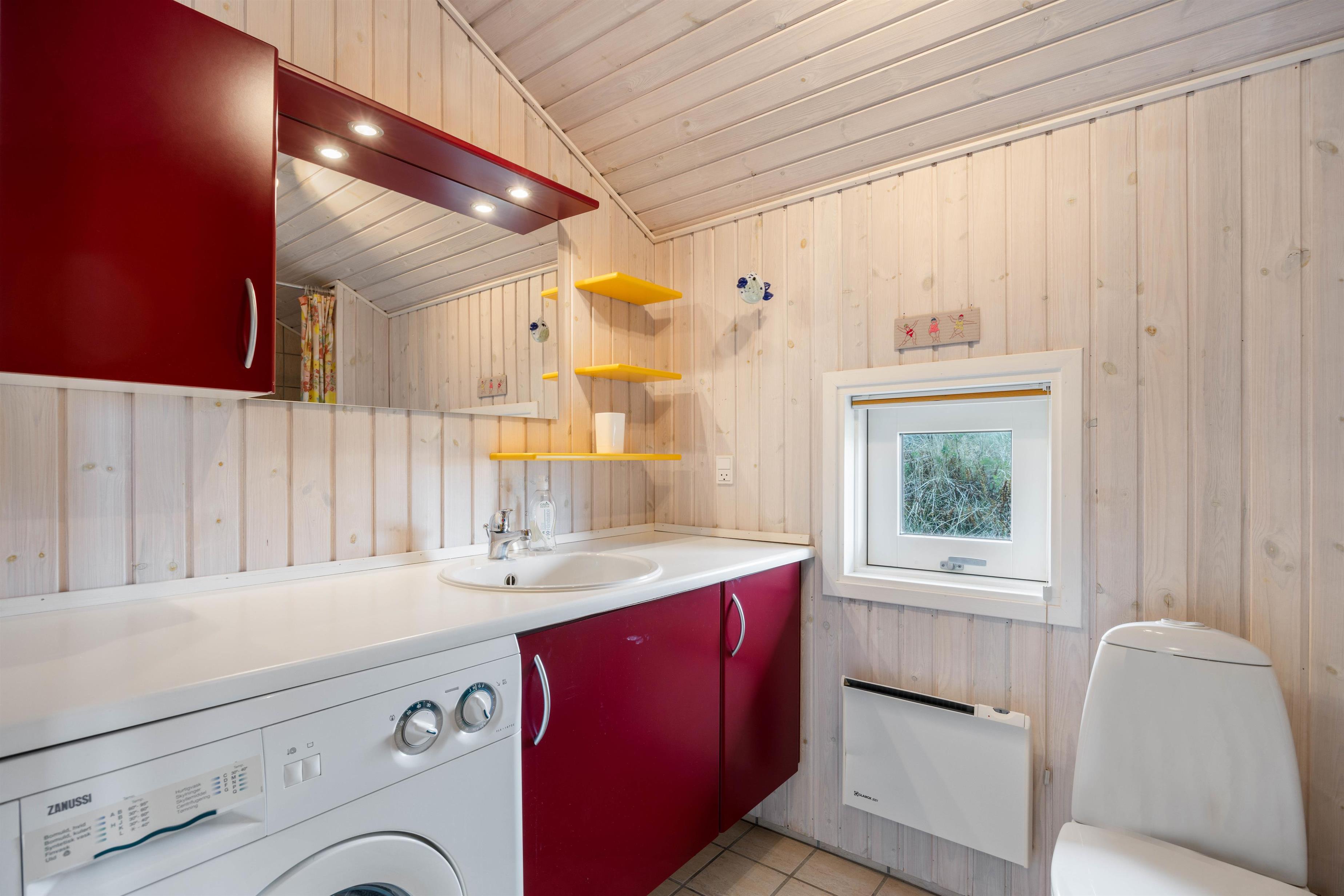 Der er et fint badeværelse med gulvvarme i sommerhuset, så I ikke kommer til at fryse om fødderne efter badet. Derudover er der en vaskemaskine i sommerhuset.