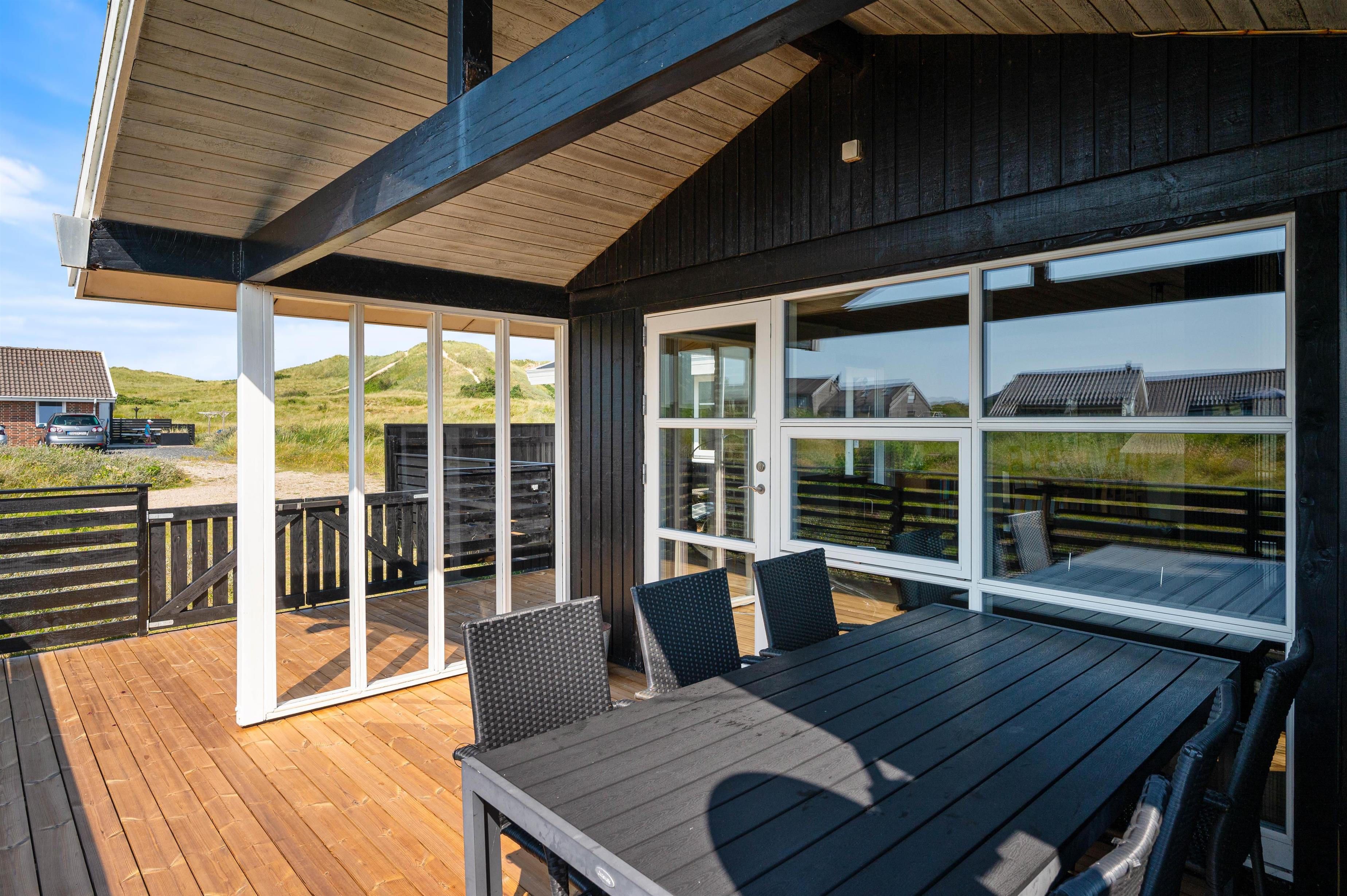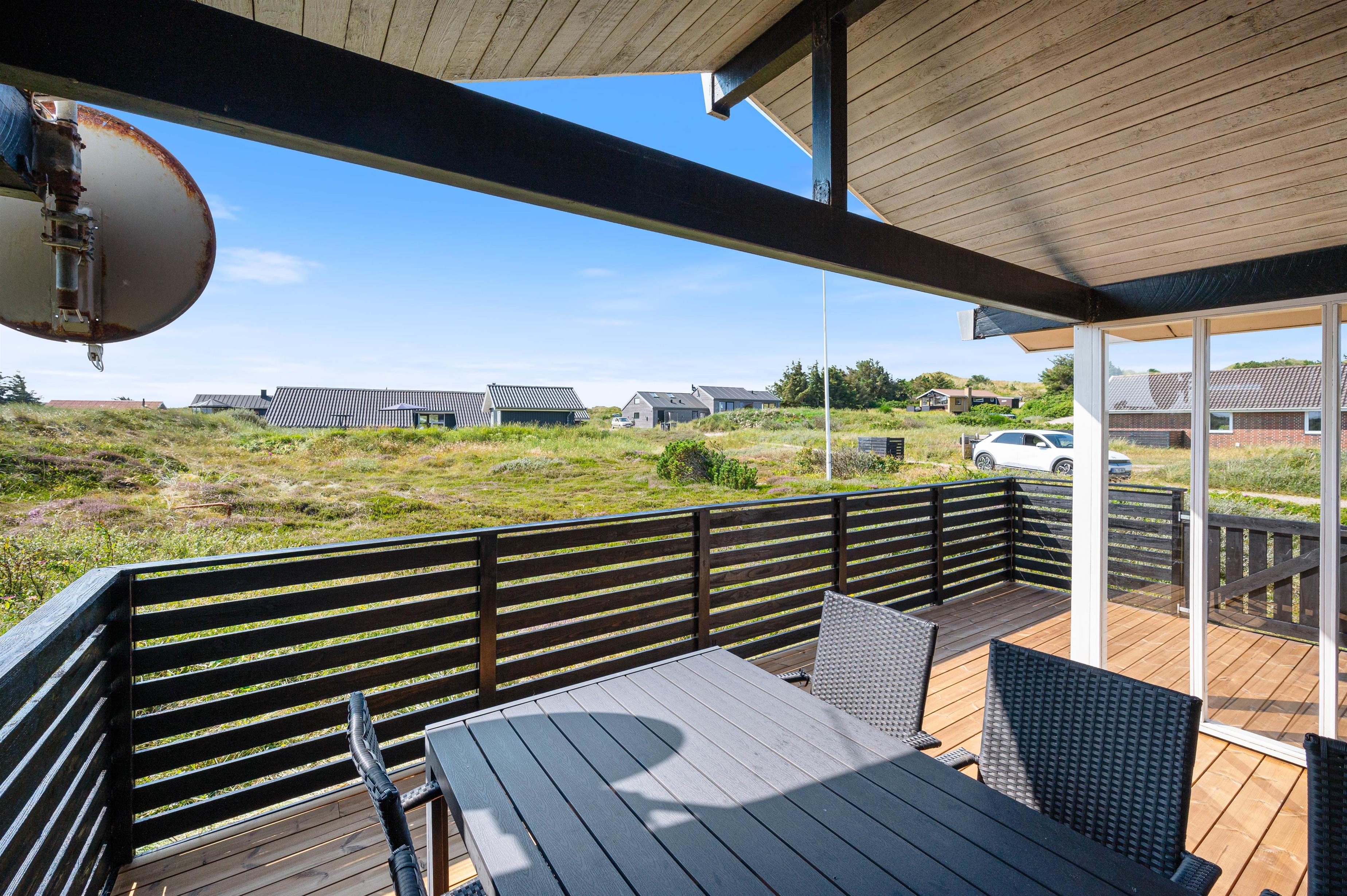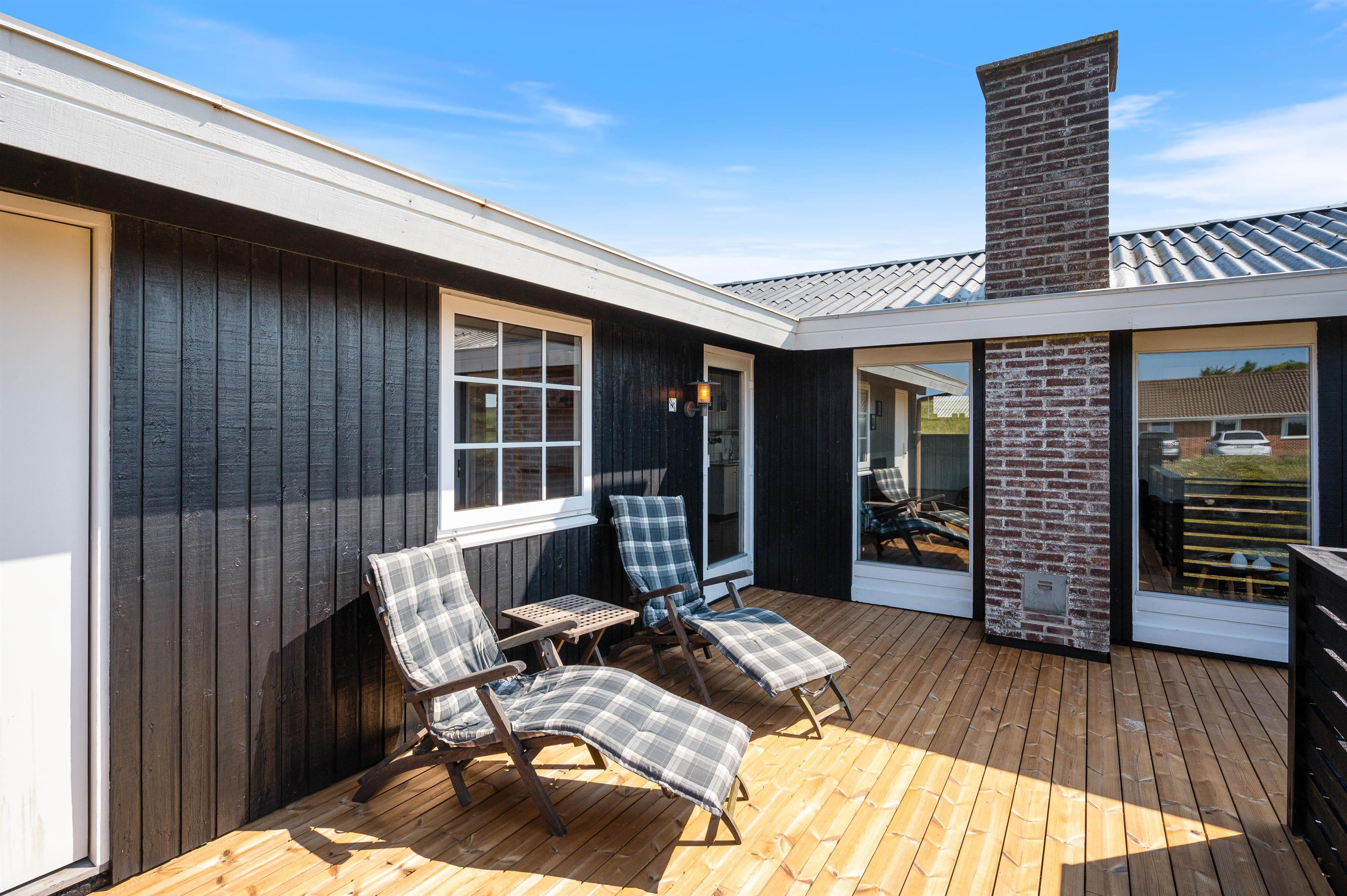 Mod syd er der en dejlig lukket og delvist overdækket terrasse, som egner sig rigtig godt til grillhygge og solbadning, når vejret tillader det. Og her er der naturligvis havemøbler og grill til rådighed, så I kan læne jer tilbage og nyde ferien – og her kan også hunden nyde friheden og bevæge sig frit. Til de mindste er der opstillet et gyngestativ.