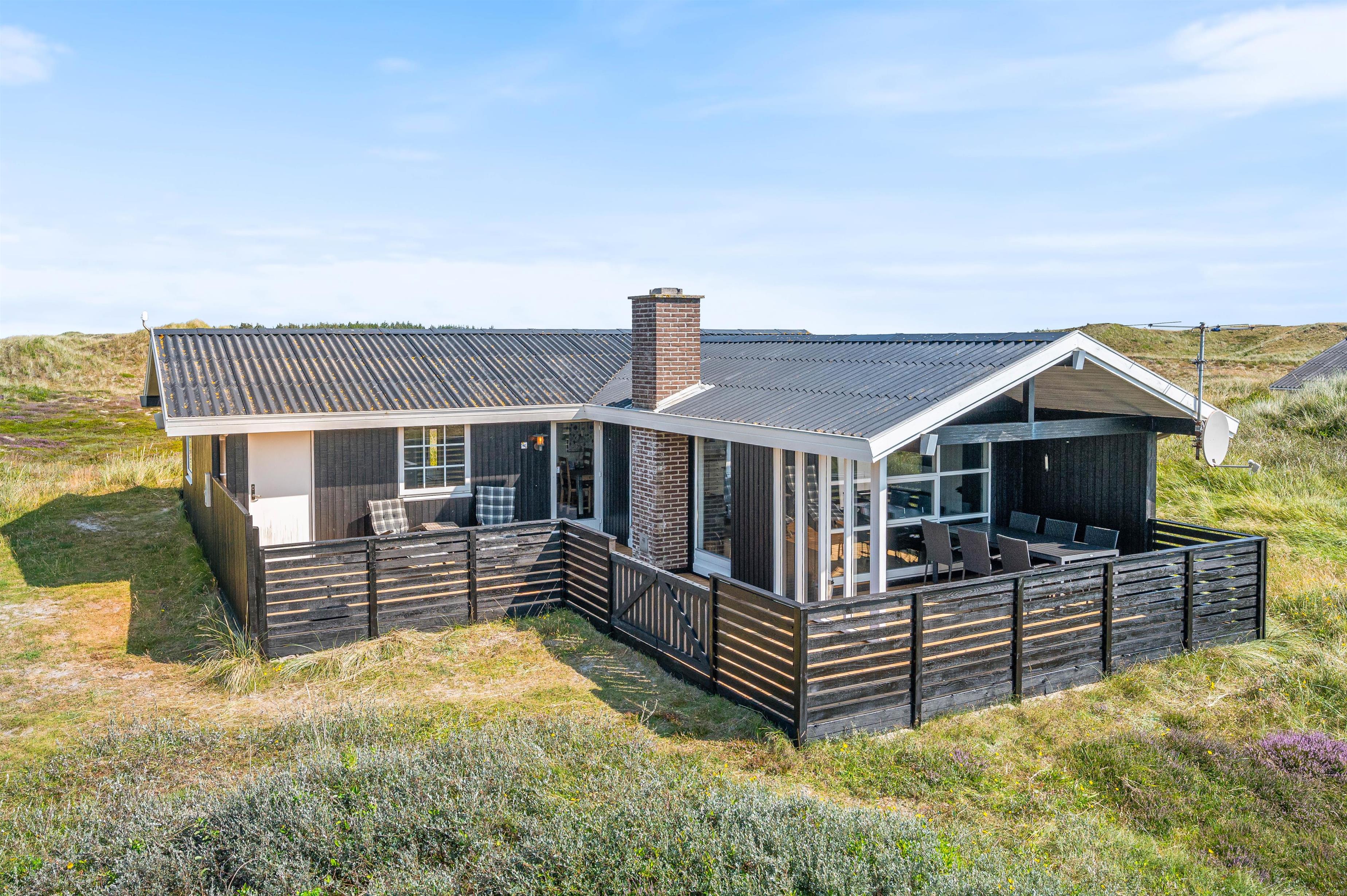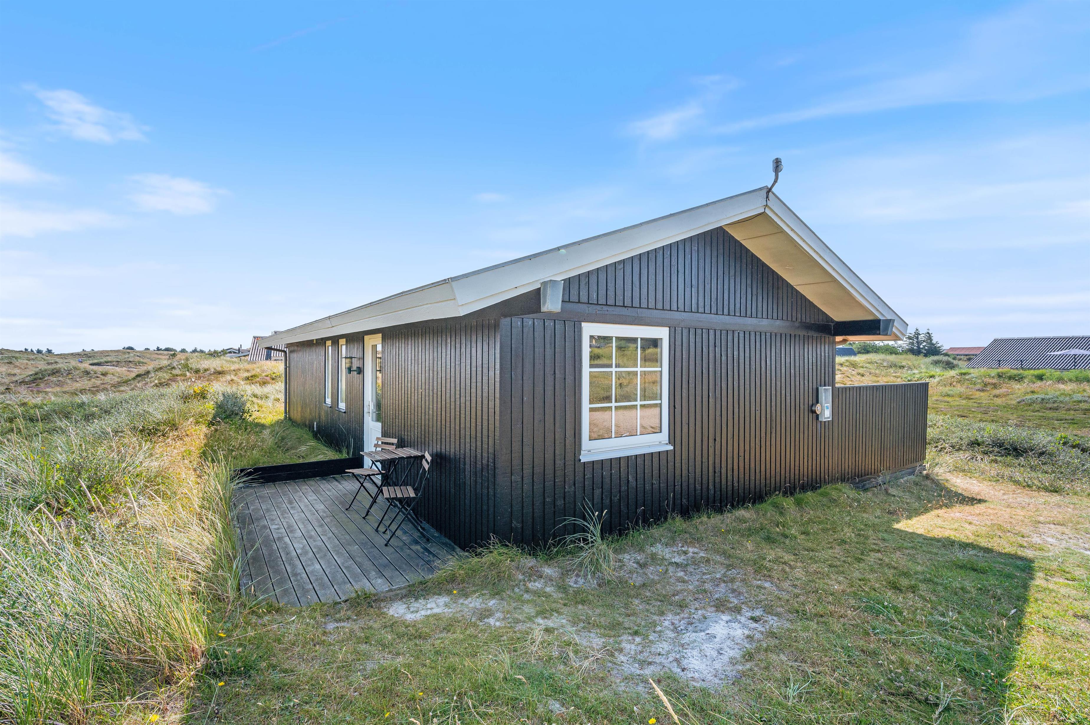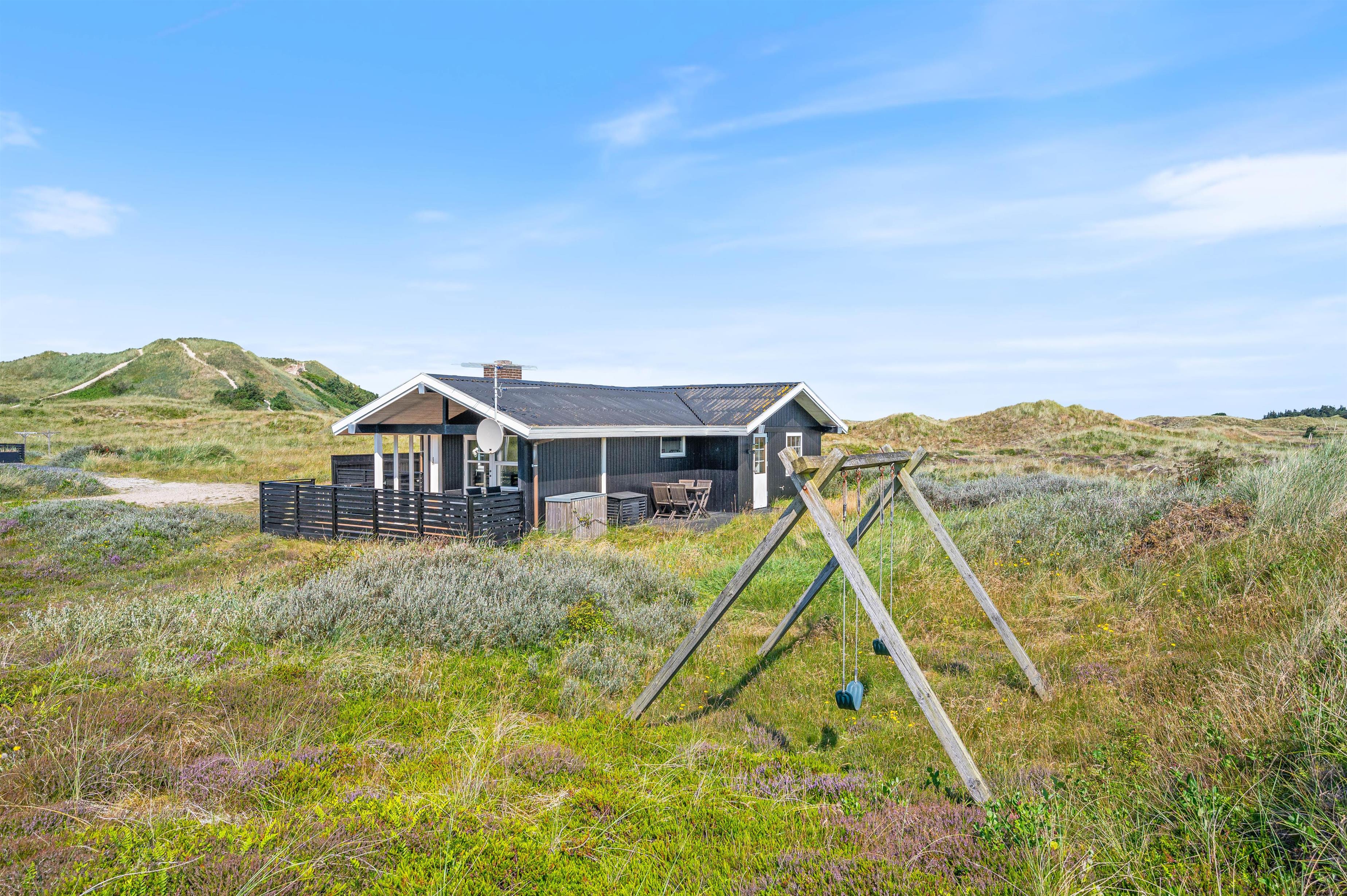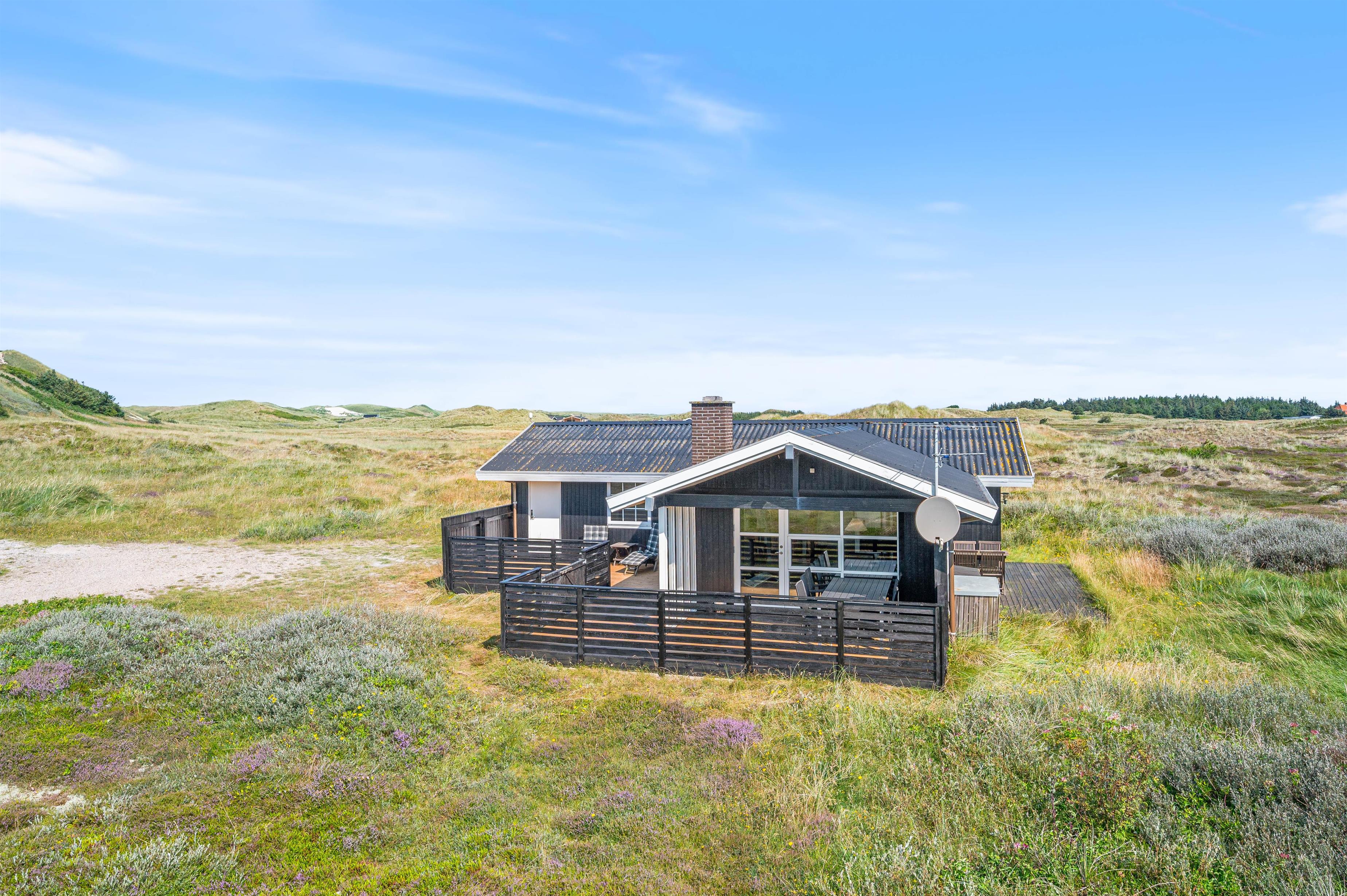 Området omkring feriehuset er et fredet hedeareal, der ikke alene giver en smuk udsigt. Her er du sikret fred og ro samt smukke lange gåture mellem de viftende marehalm og den lilla lyng. Vesterhavets brede sandstrande er også kun en lille gåtur herfra – uanset årstiden er den altid et besøg værd. Det samme gælder hyggelige Hvide Sande små 10 minutter væk. Her finder I gode indkøbsmuligheder, store softice og caféer langs havnen.