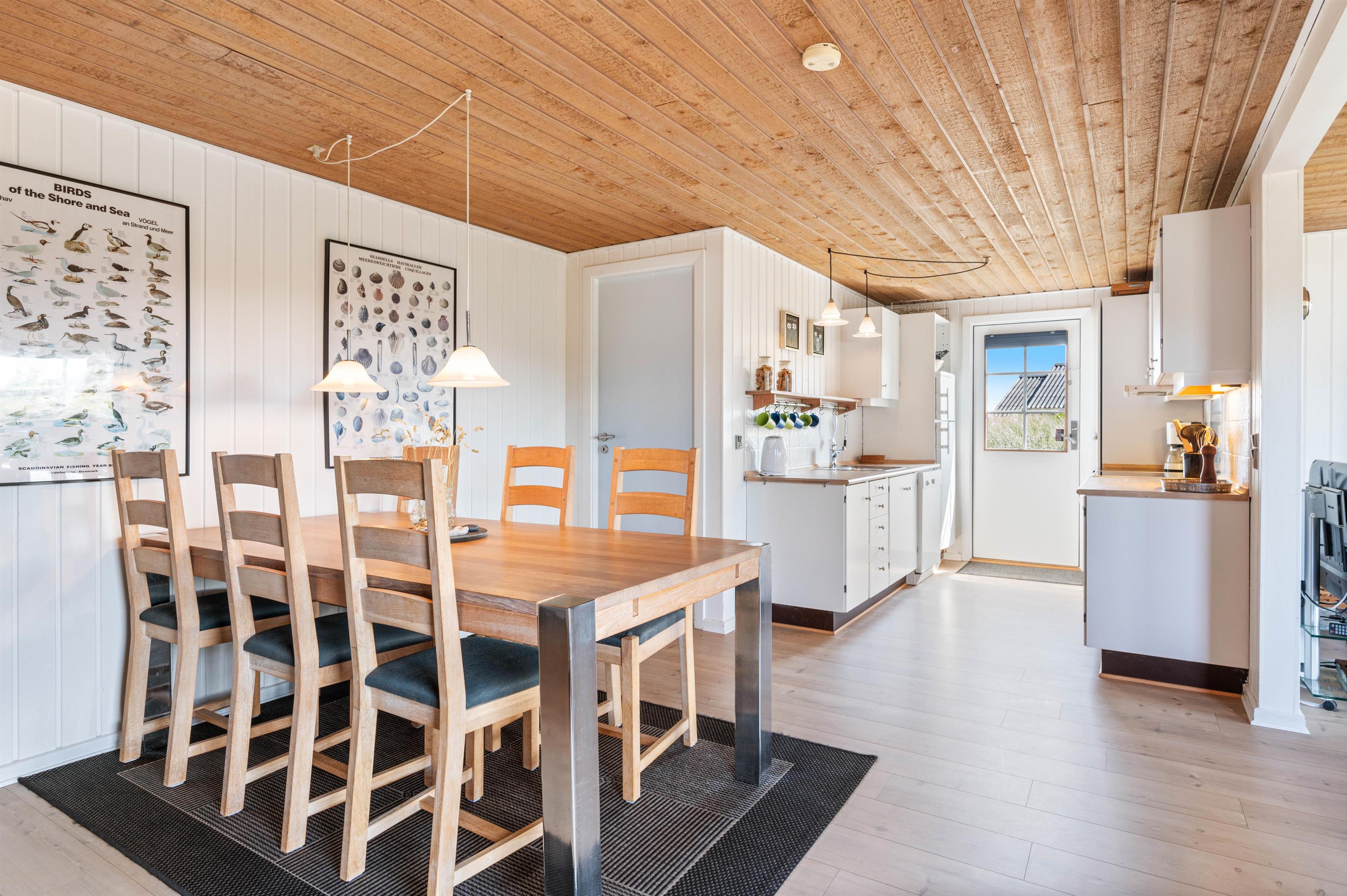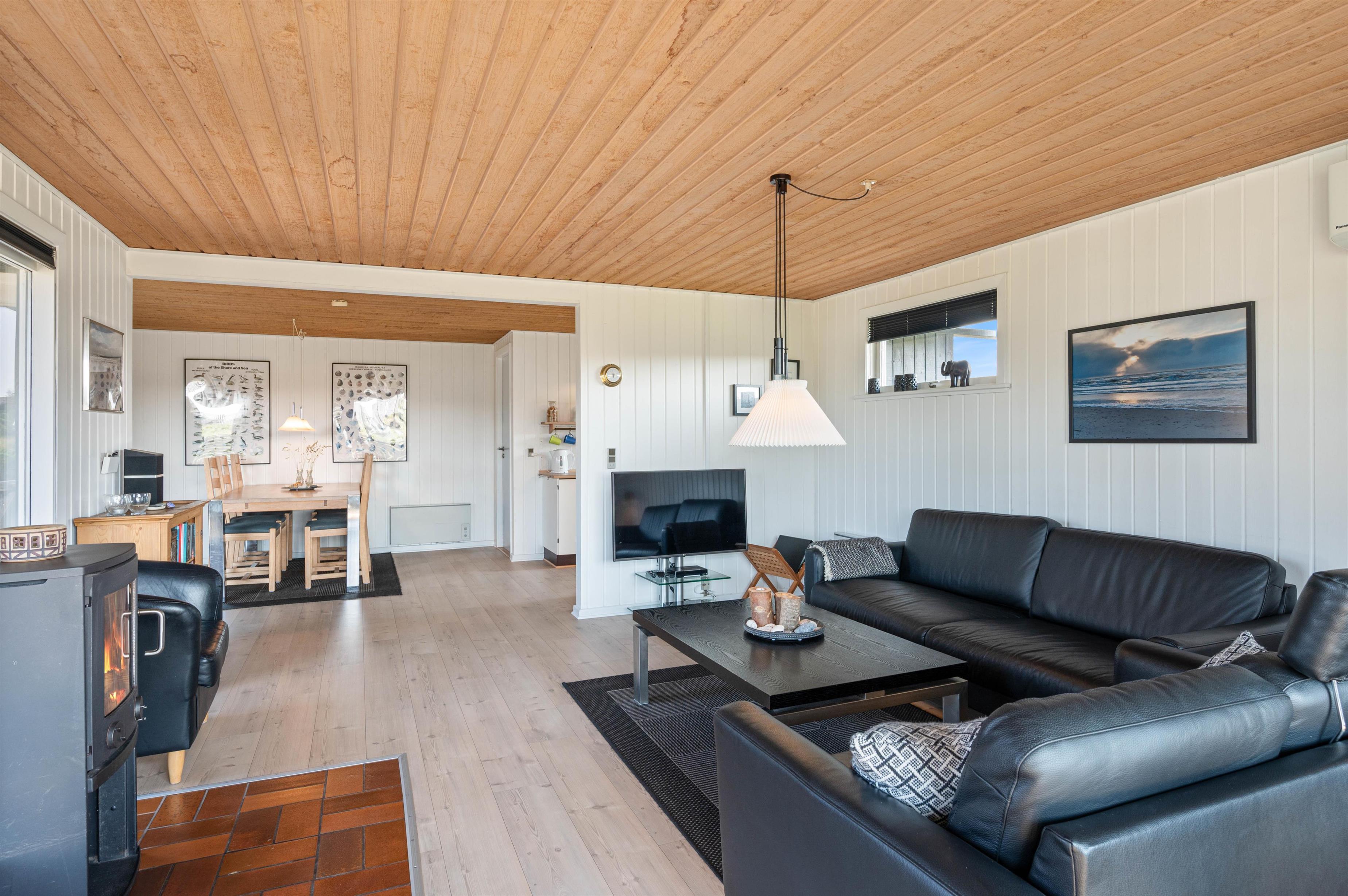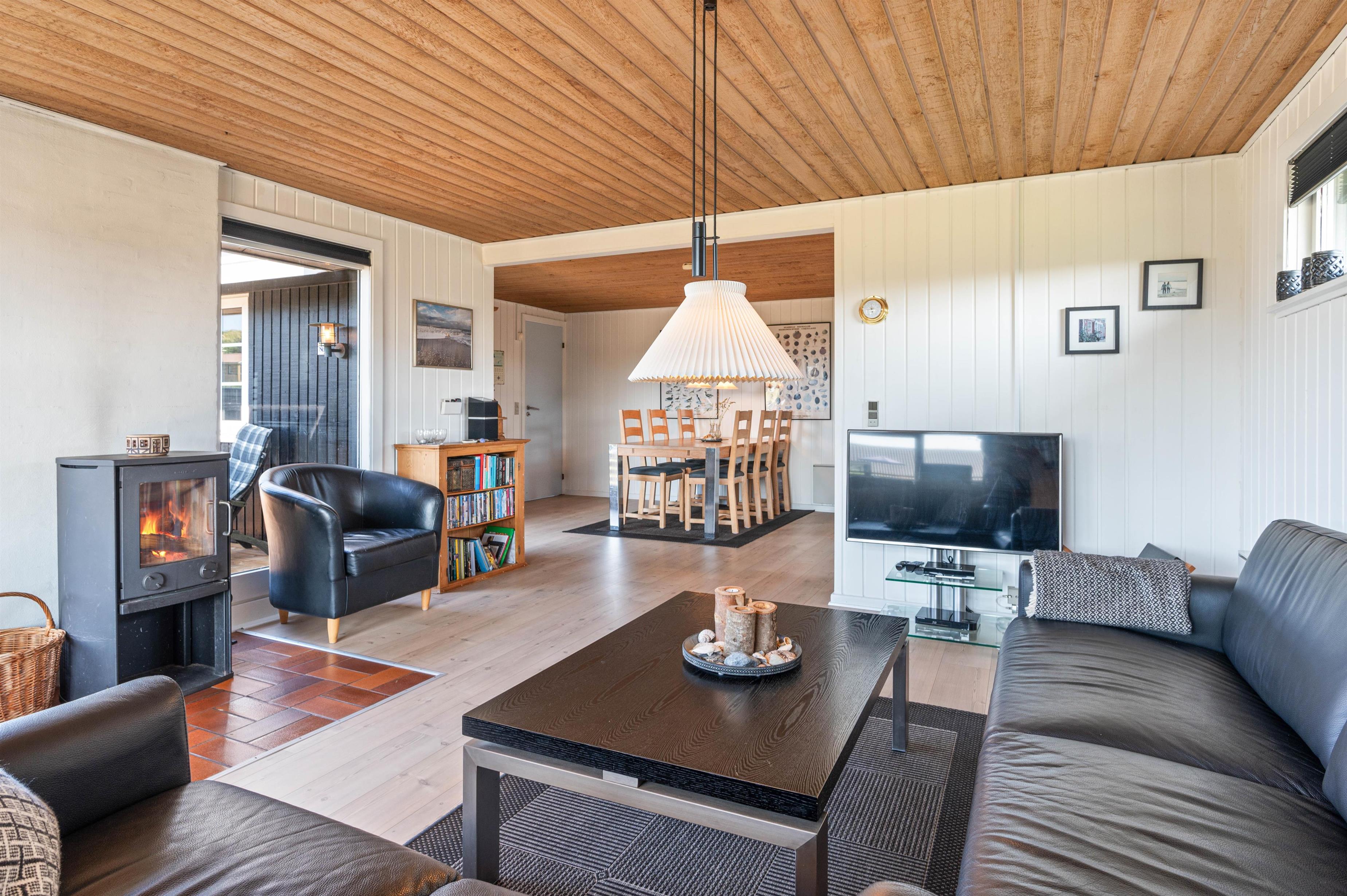 Et dejligt lyst og personligt indrettet sommerhus til 5 gæster og deres hund. Her er forudsætningerne for en afslappende ferie på Vestkysten i et ægte klassisk sommerhus. Der er lyse træbeklædte vægge, store vinduer og ét stort fællesrum, hvor I alle kan samles. Tænd op i brændeovnen og sæt jer godt til rette i sofaen med en god film eller nyd den fine udsigt – imens er børnene måske i gang med at bage en lækker kage til aftenkaffen.