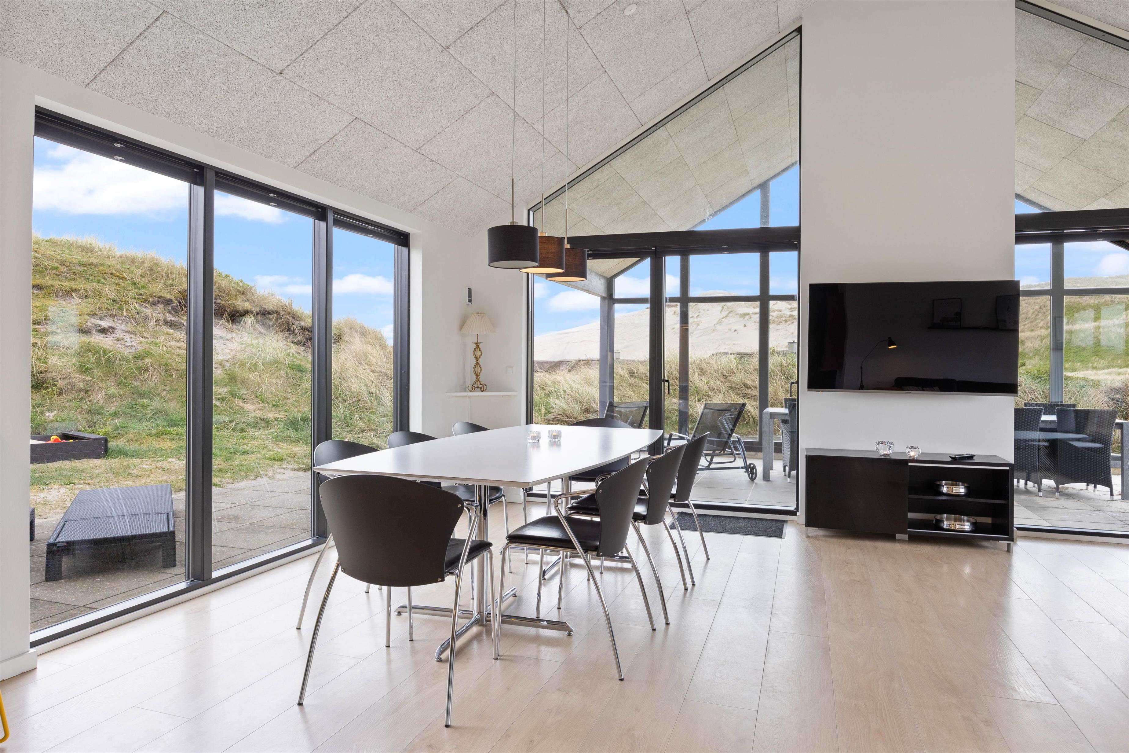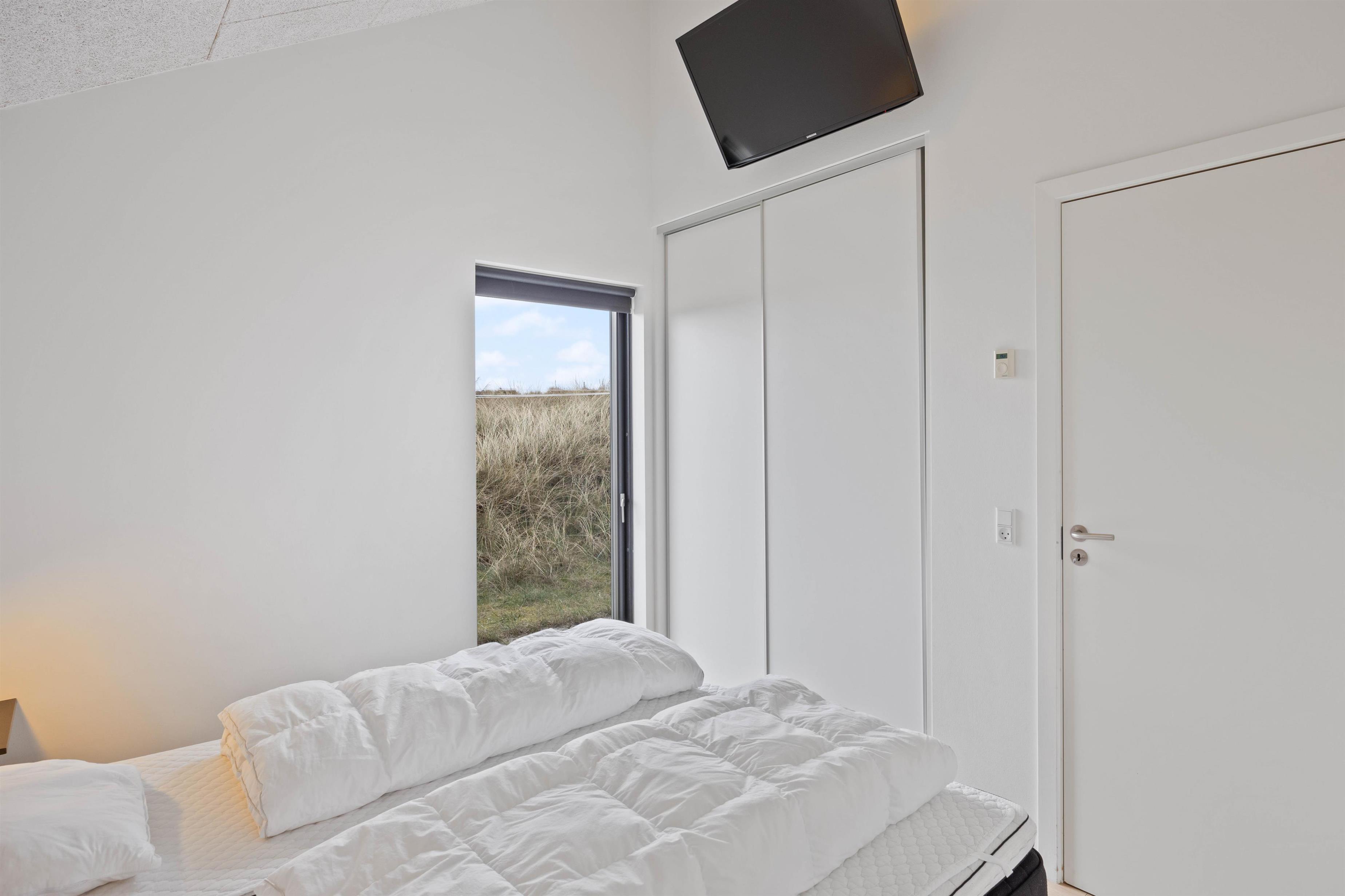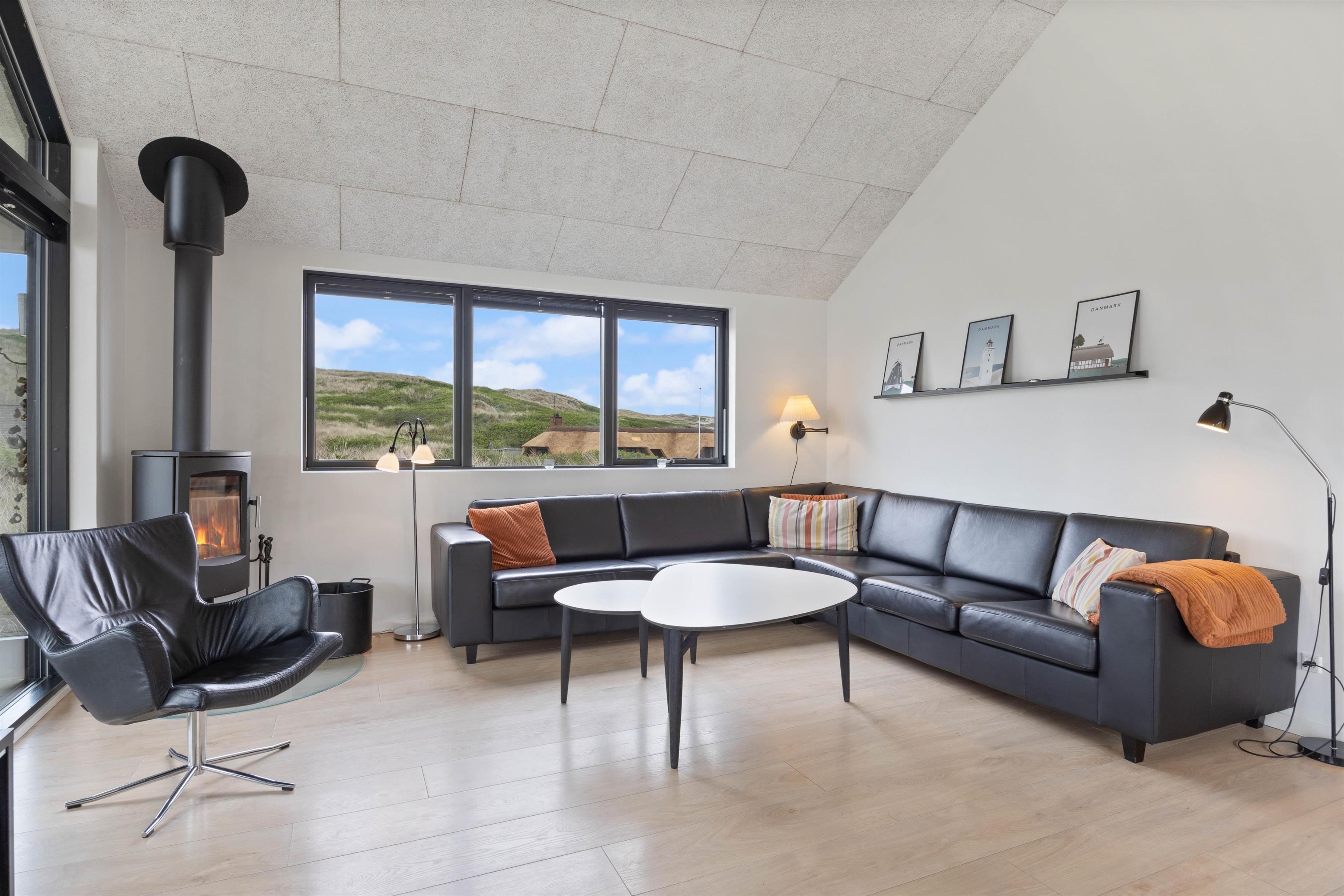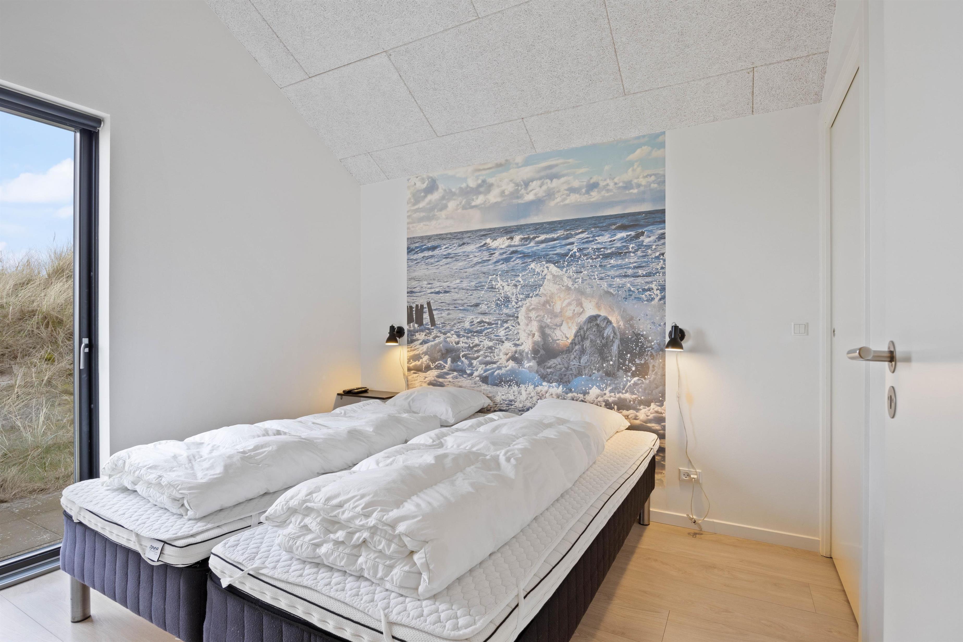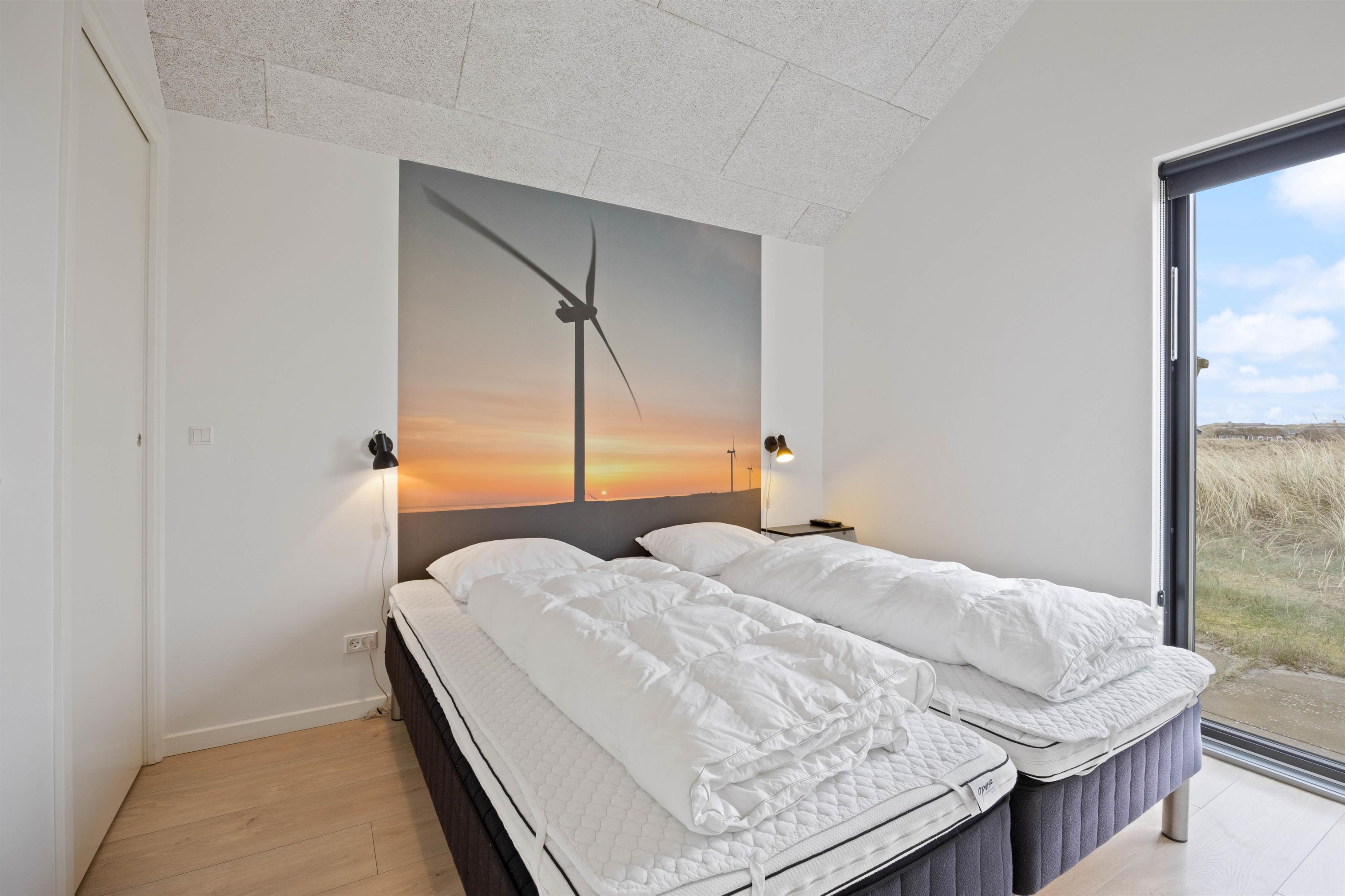 Feriehuset er lyst og lækkert med store vinduer med panoramaudsigt over den smukke natur, højt til loftet og velindrettet med enkle farver. Op mod syv feriegæster og deres to firebenede venner kan her få en skøn ferie, hvor der er plads til familien, store som små. Her er fire gode soveværelser, hvoraf to er med dobbeltseng, fladskærms-TV og med egne badeværelser, ét værelse har to enkeltsenge og det sidste værelse én enkeltseng. Alle værelser har trægulve med gulvvarme. Feriehuset byder også på et stort tredje badeværelse, hvor I for alvor kan koble af og komme ned i gear. Her venter spaens varme boblende vand og saunaen efter en gåtur ved det brusende Vesterhav. Her finder I også vaskemaskine og tørretumbler, som er praktisk og fleksibelt særligt for børnefamilien.