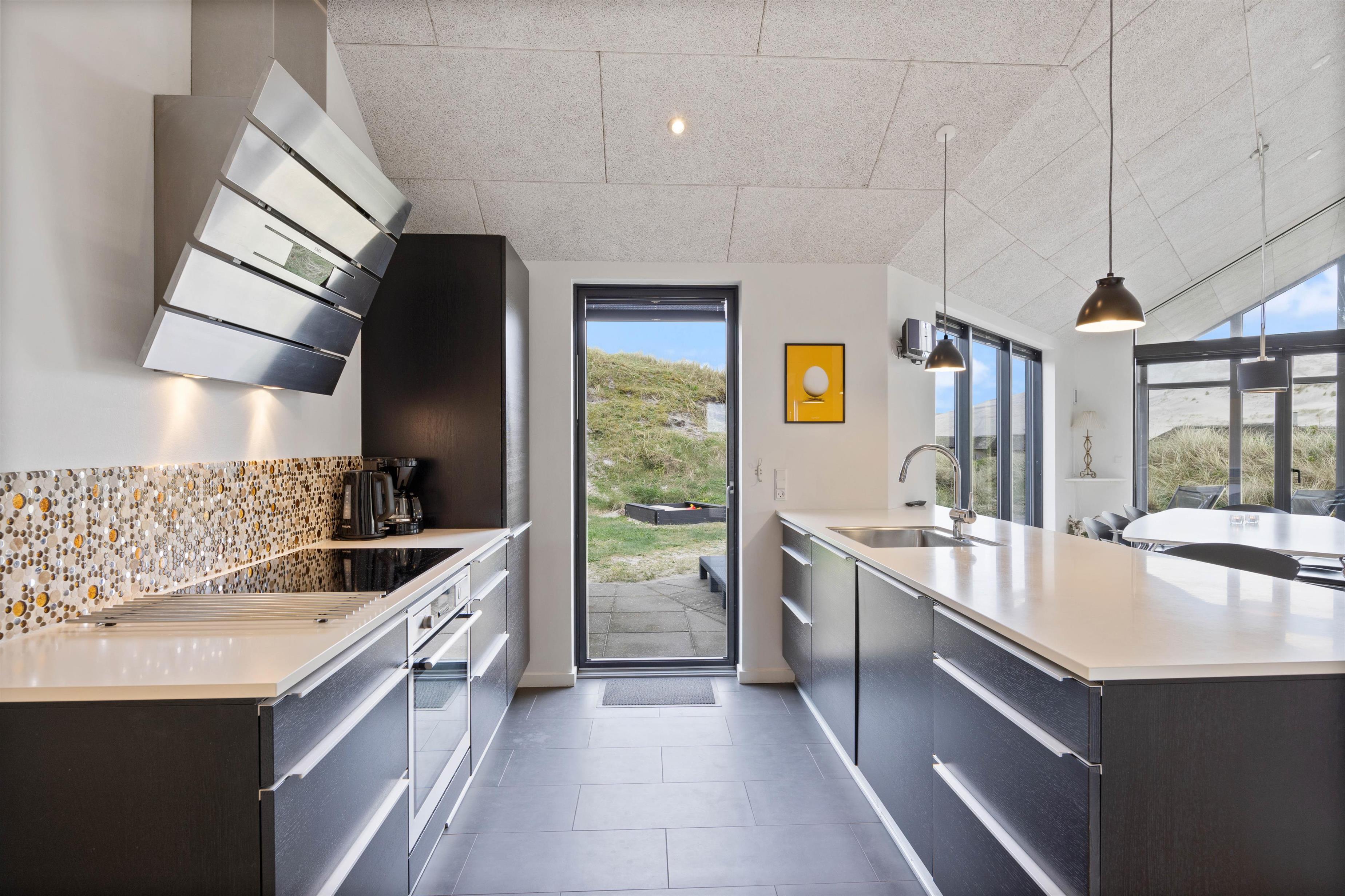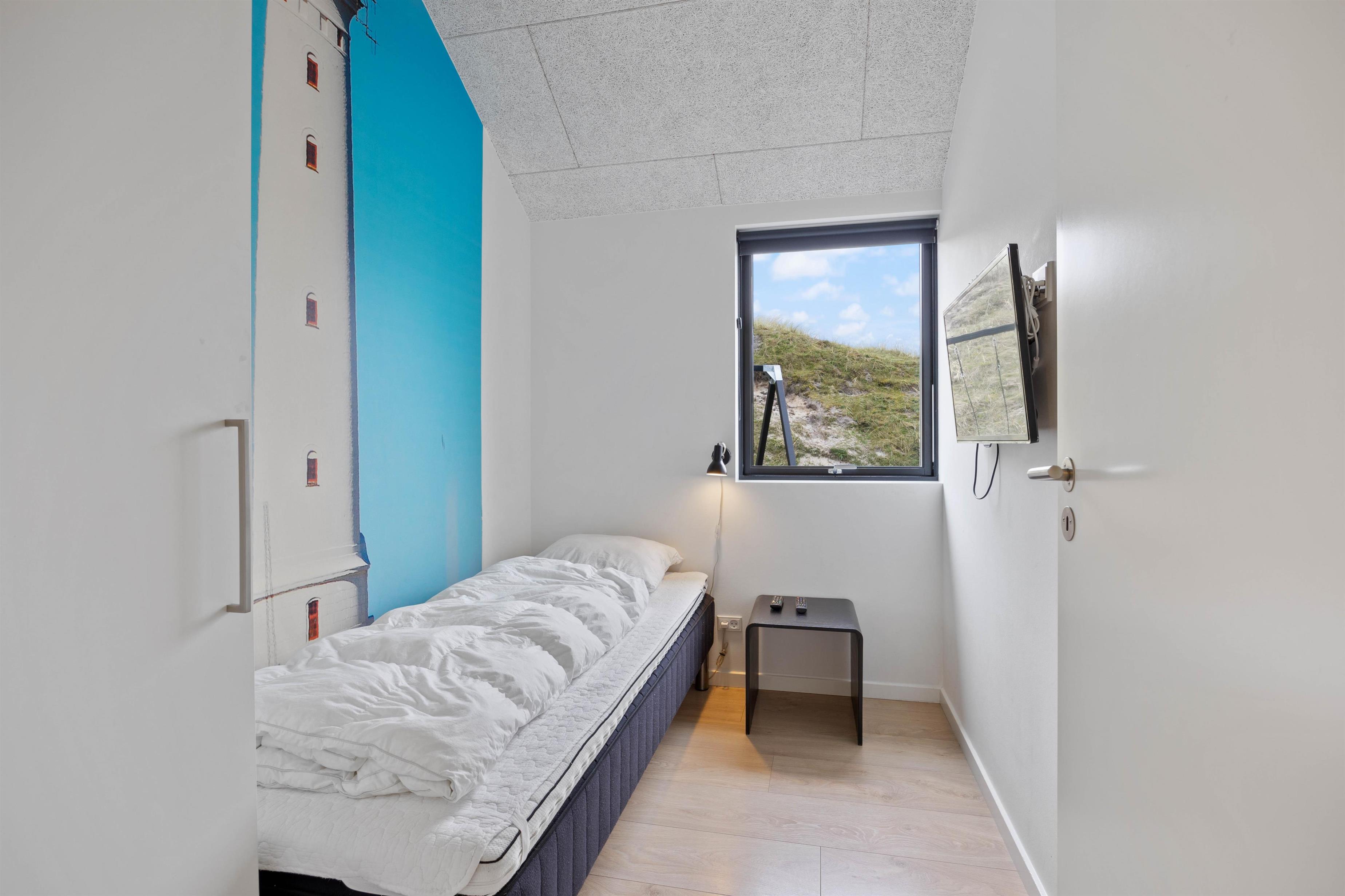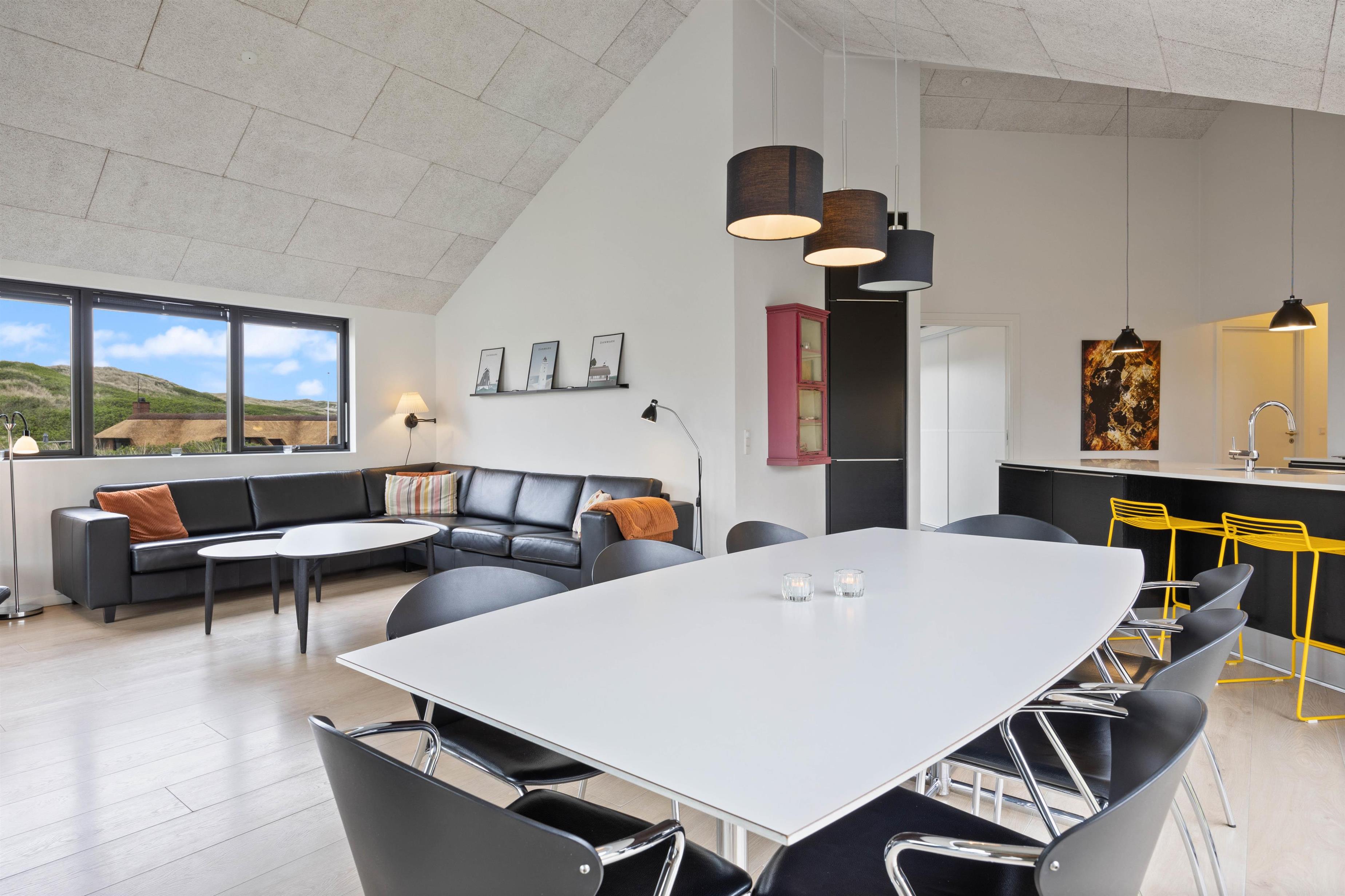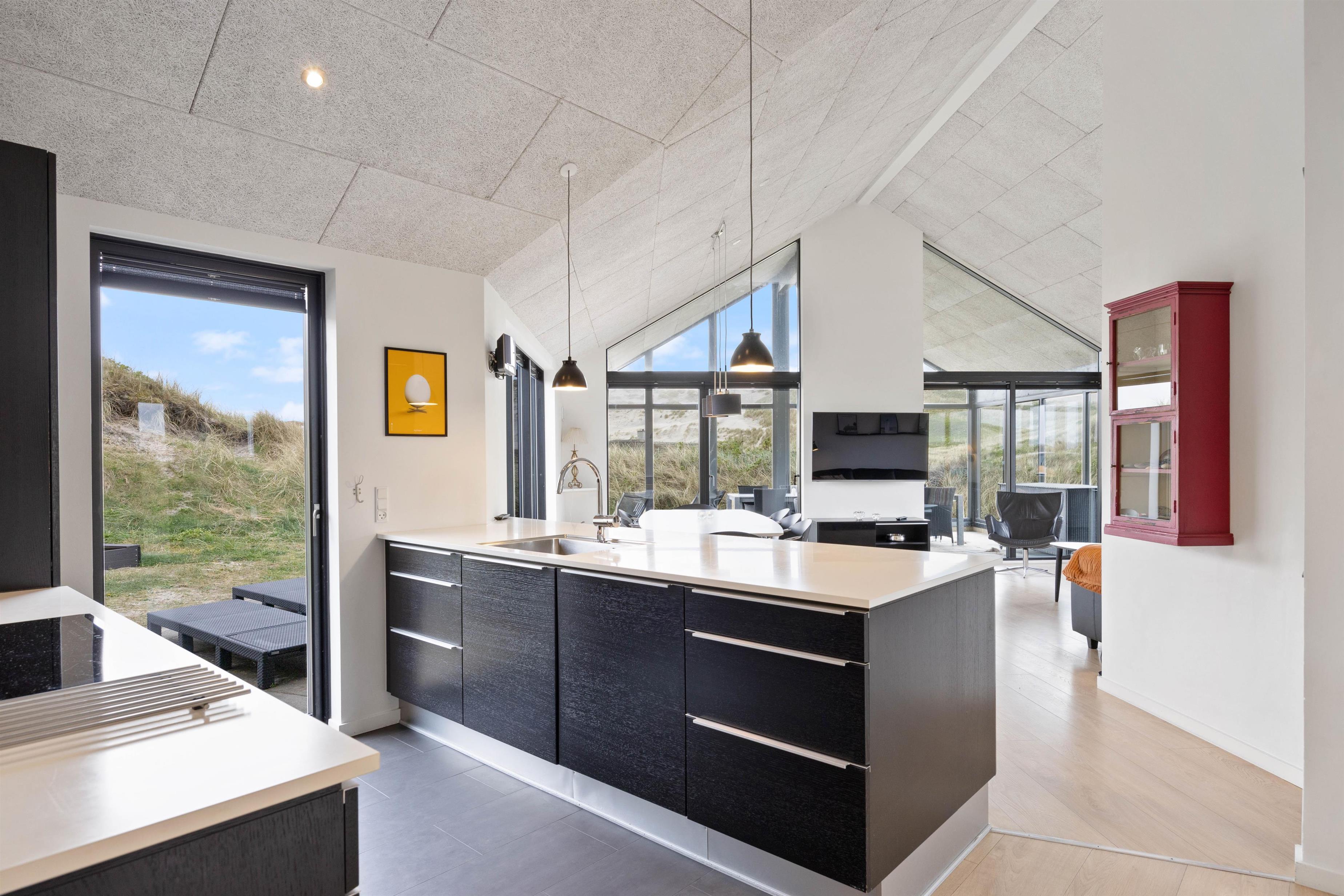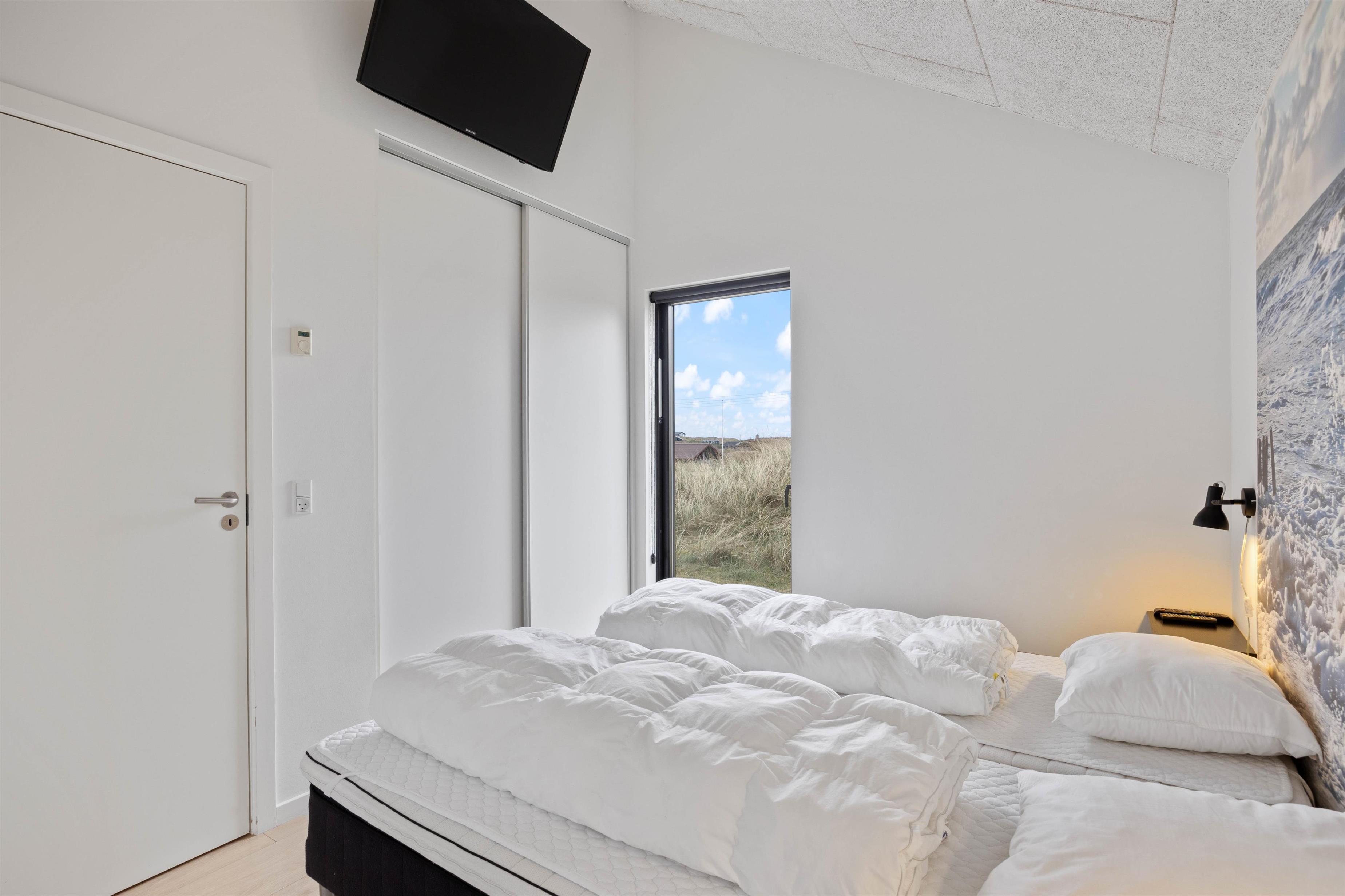 Feriehuset er lyst og lækkert med store vinduer med panoramaudsigt over den smukke natur, højt til loftet og velindrettet med enkle farver. Op mod syv feriegæster og deres to firebenede venner kan her få en skøn ferie, hvor der er plads til familien, store som små. Her er fire gode soveværelser, hvoraf to er med dobbeltseng, fladskærms-TV og med egne badeværelser, ét værelse har to enkeltsenge og det sidste værelse én enkeltseng. Alle værelser har trægulve med gulvvarme. Feriehuset byder også på et stort tredje badeværelse, hvor I for alvor kan koble af og komme ned i gear. Her venter spaens varme boblende vand og saunaen efter en gåtur ved det brusende Vesterhav. Her finder I også vaskemaskine og tørretumbler, som er praktisk og fleksibelt særligt for børnefamilien.
